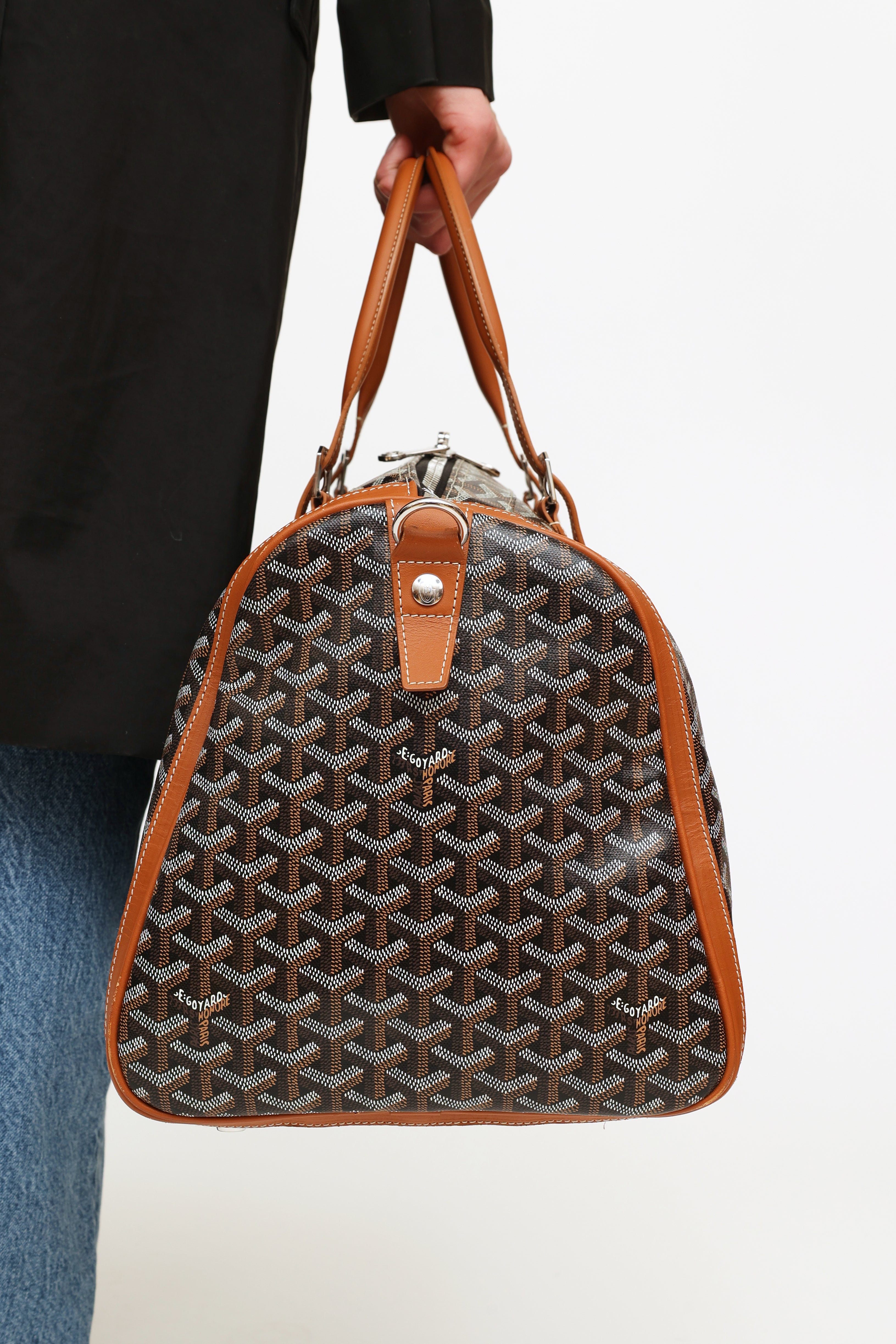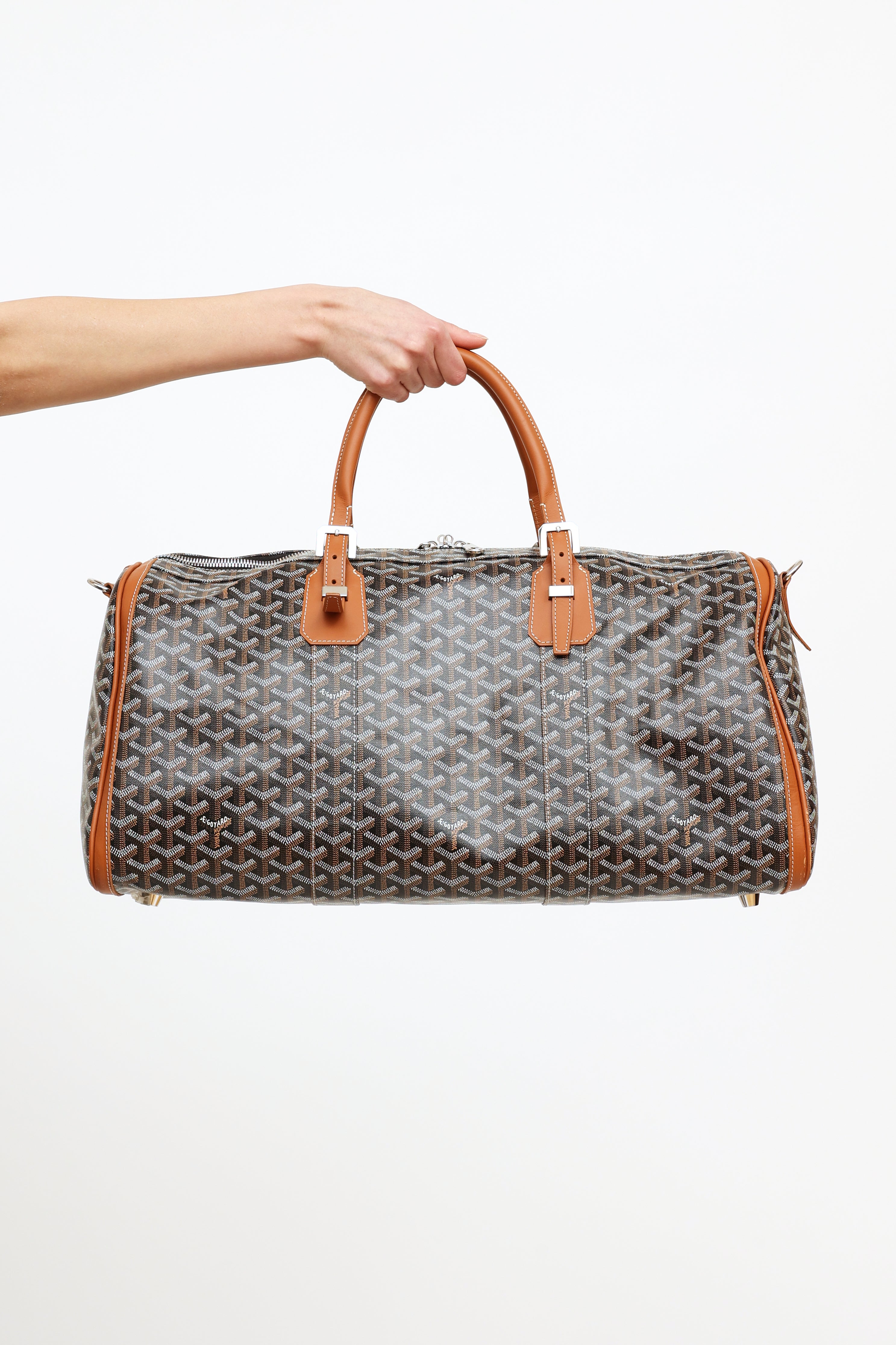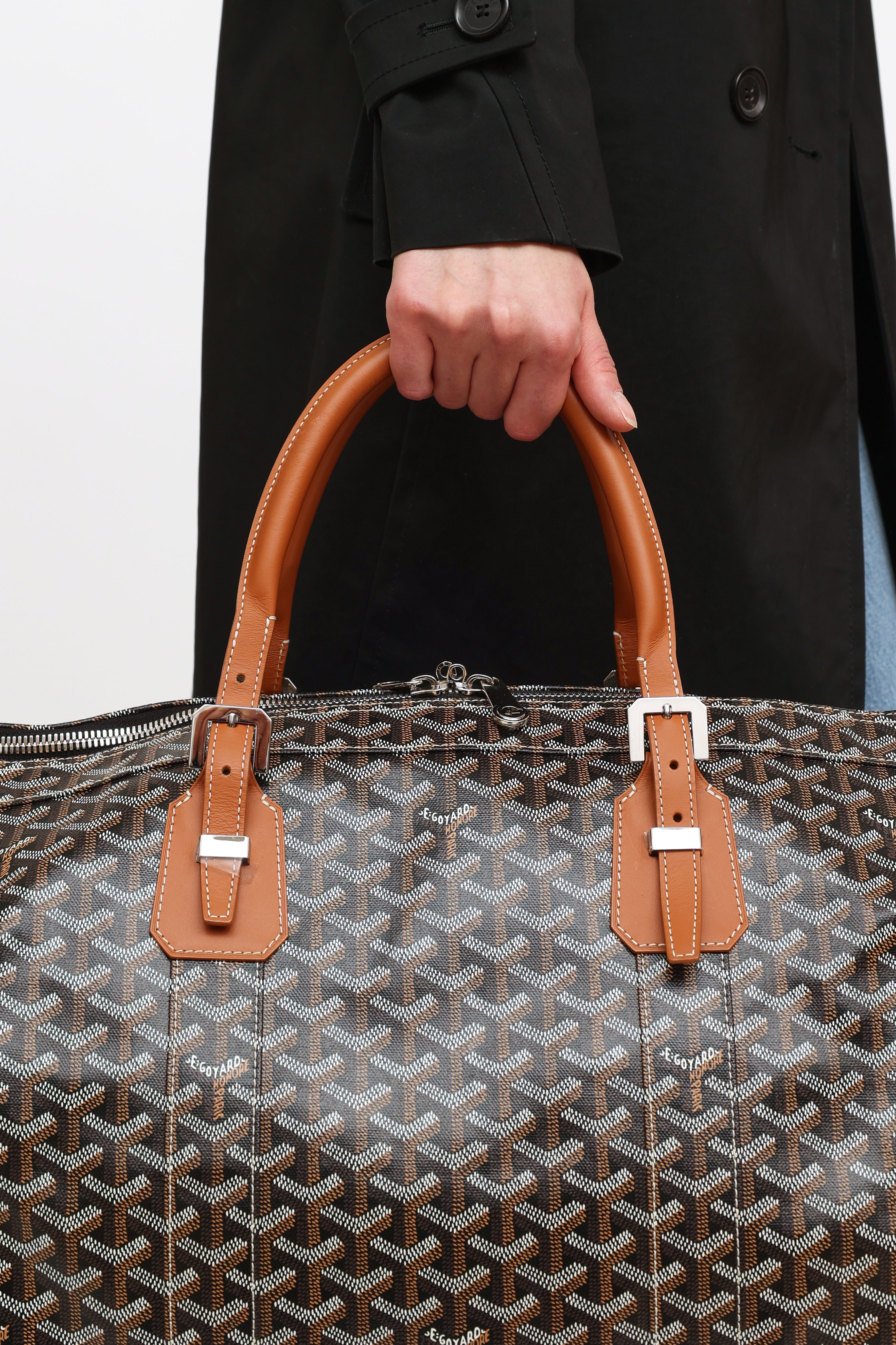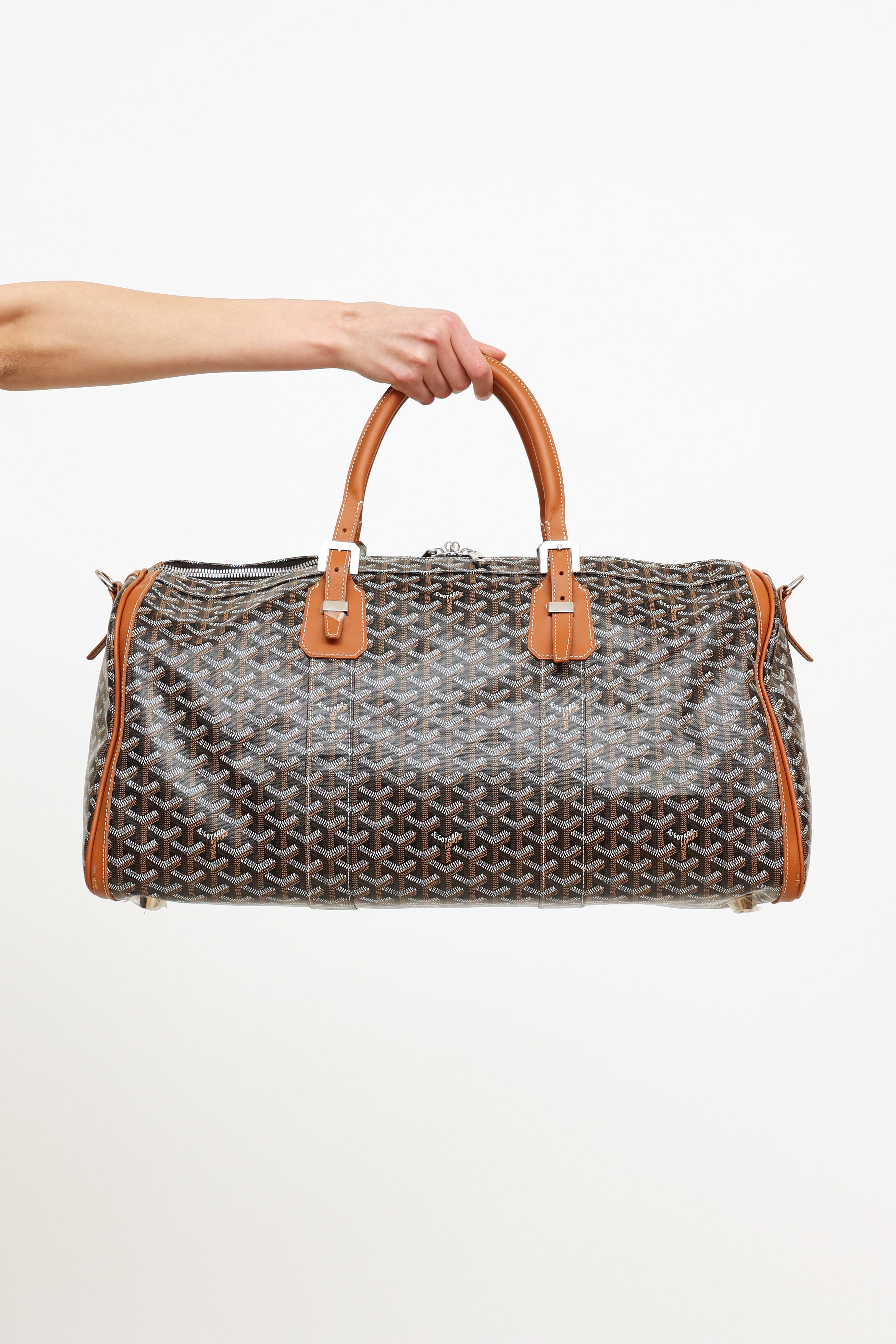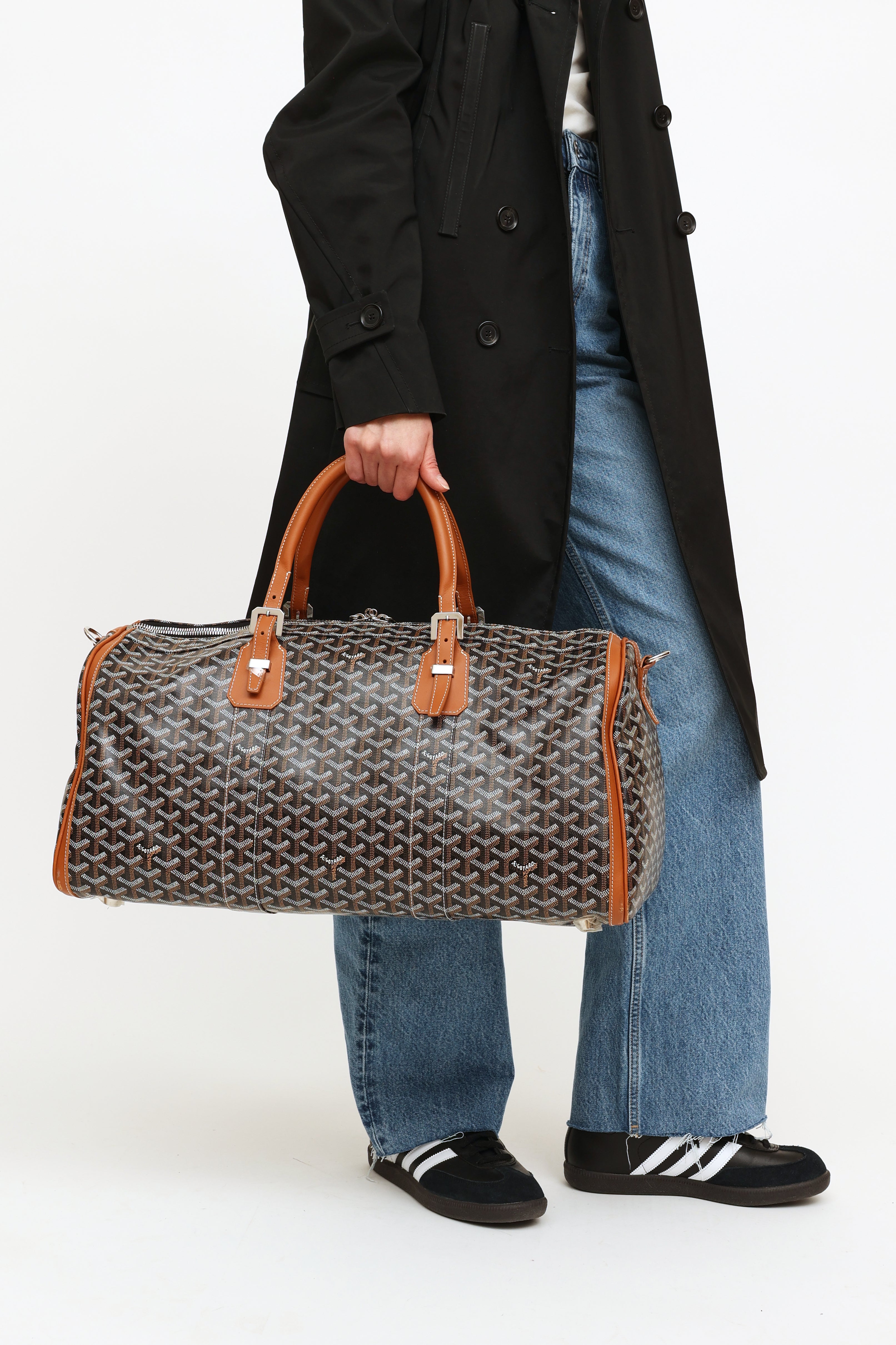 Pre-owned Goyard Croisiere 50 duffle bag in brown featuring monogram coated canvas, brown leather accents and trim, multiple embossed logos, two rolled top handles, detachable shoulder strap, two-way zip closure, metal feet and silver-tone hardware. Interior features one main compartment, yellow canvas lining, one internal zipped pocket, one slip pocket, one D ring and removable flat bottom.