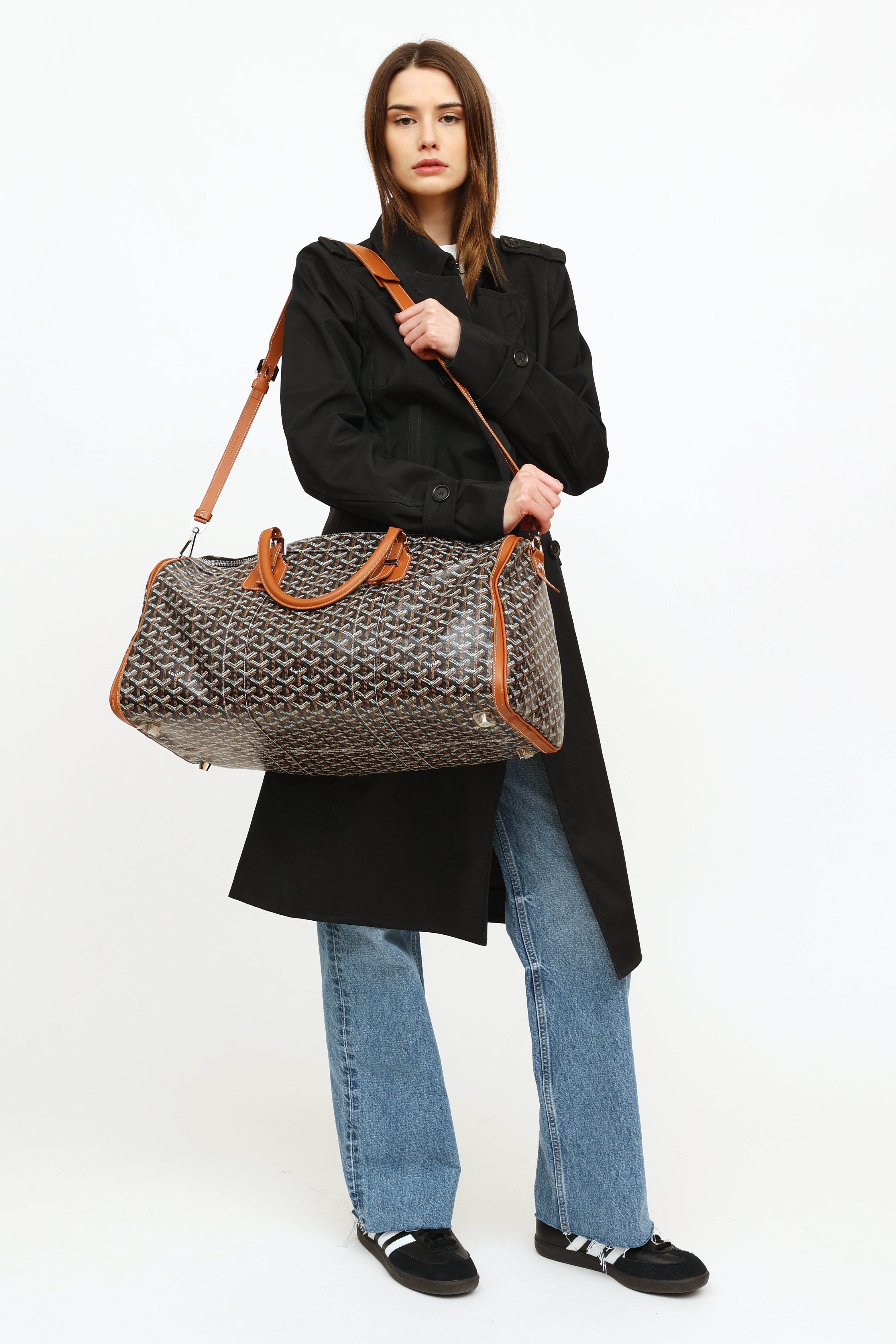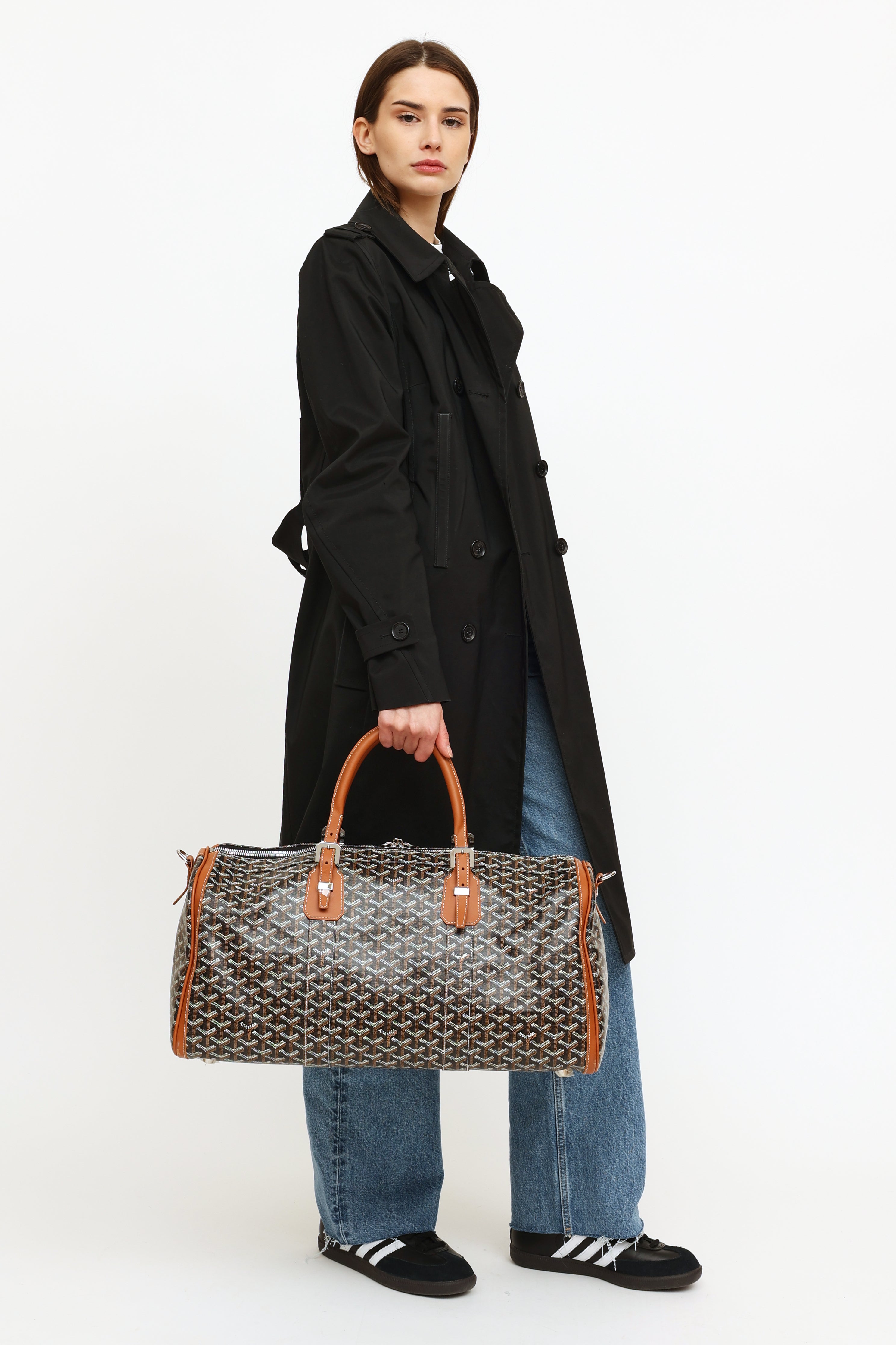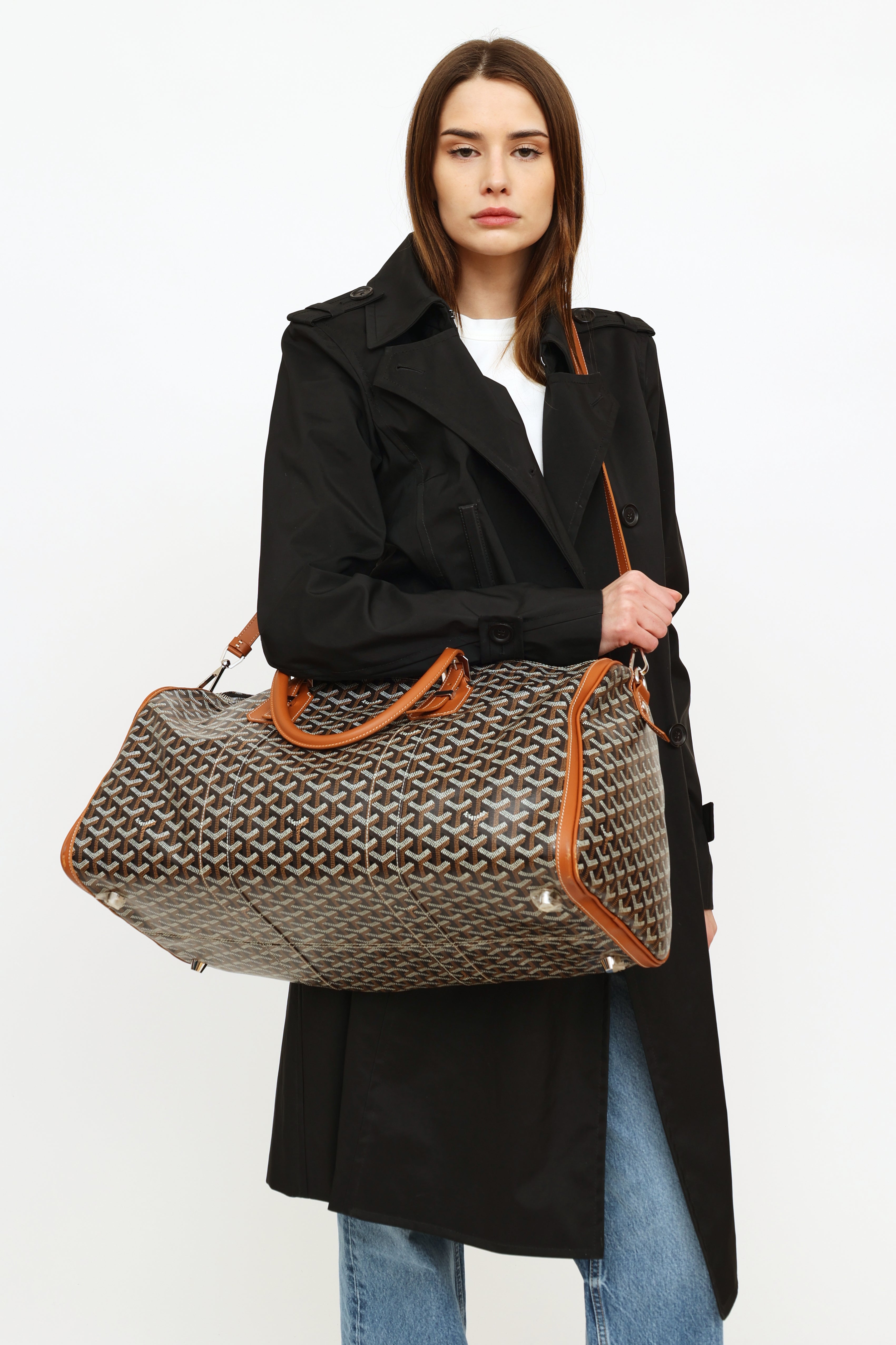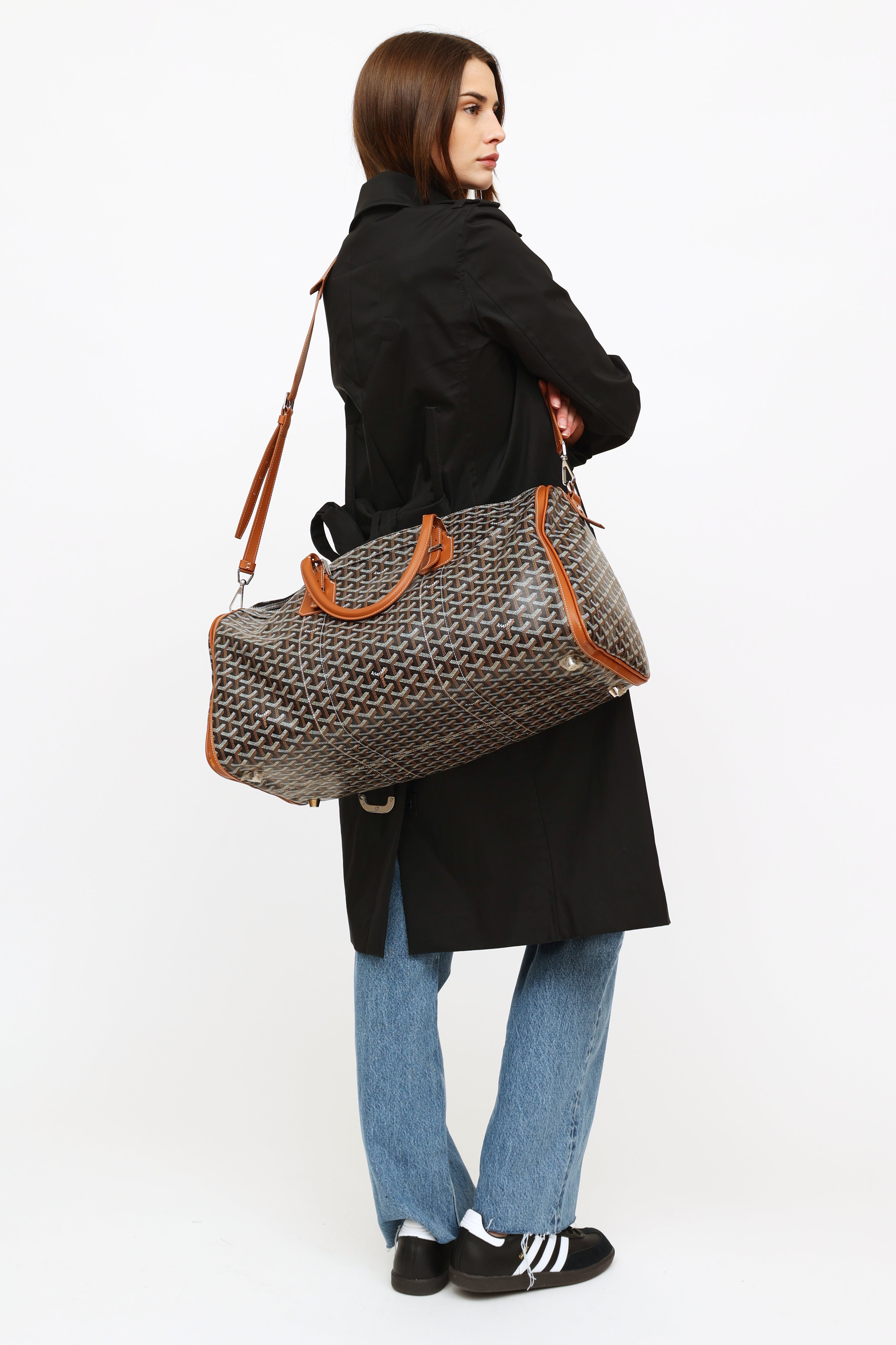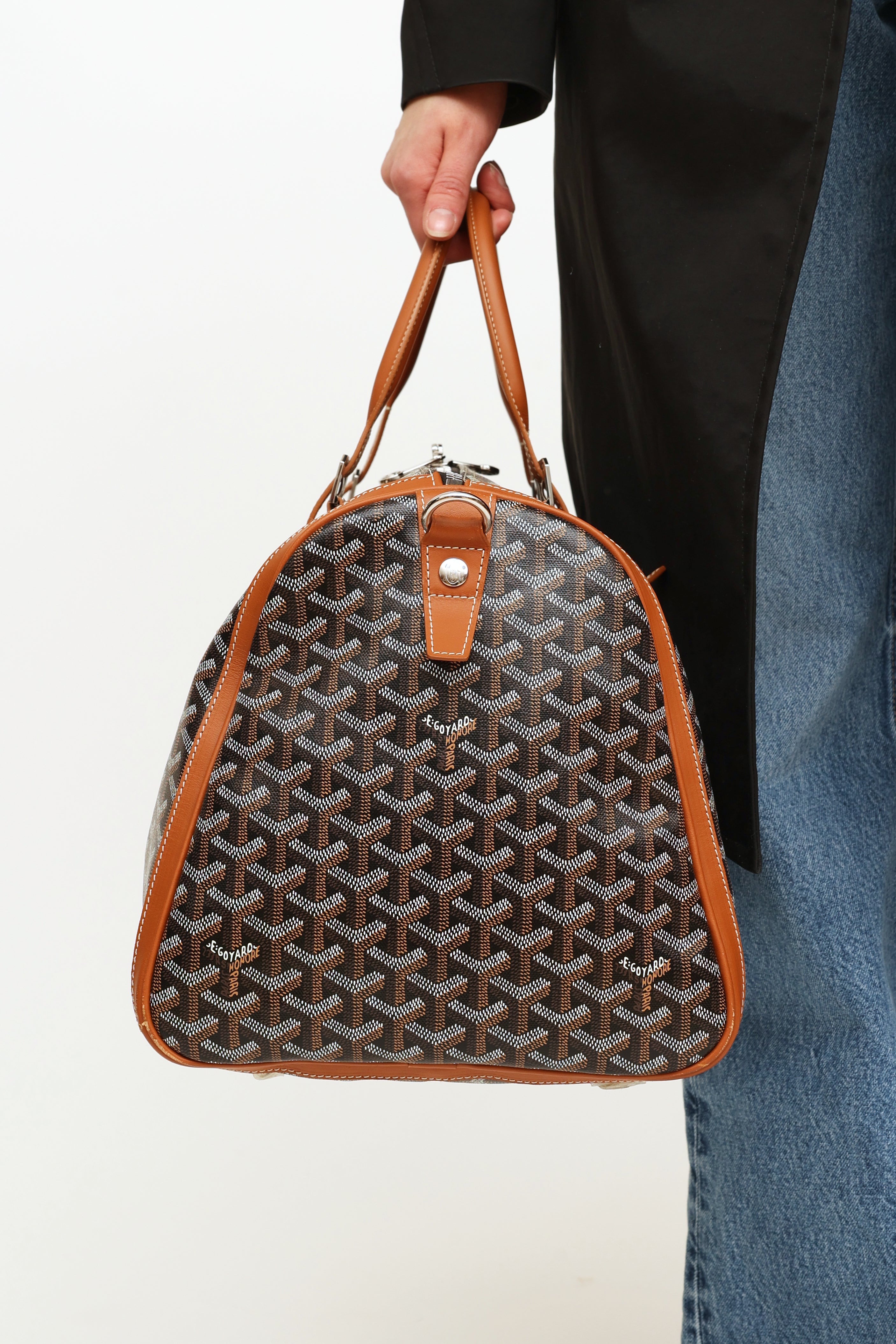 Pre-owned Goyard Croisiere 50 duffle bag in brown featuring monogram coated canvas, brown leather accents and trim, multiple embossed logos, two rolled top handles, detachable shoulder strap, two-way zip closure, metal feet and silver-tone hardware. Interior features one main compartment, yellow canvas lining, one internal zipped pocket, one slip pocket, one D ring and removable flat bottom.