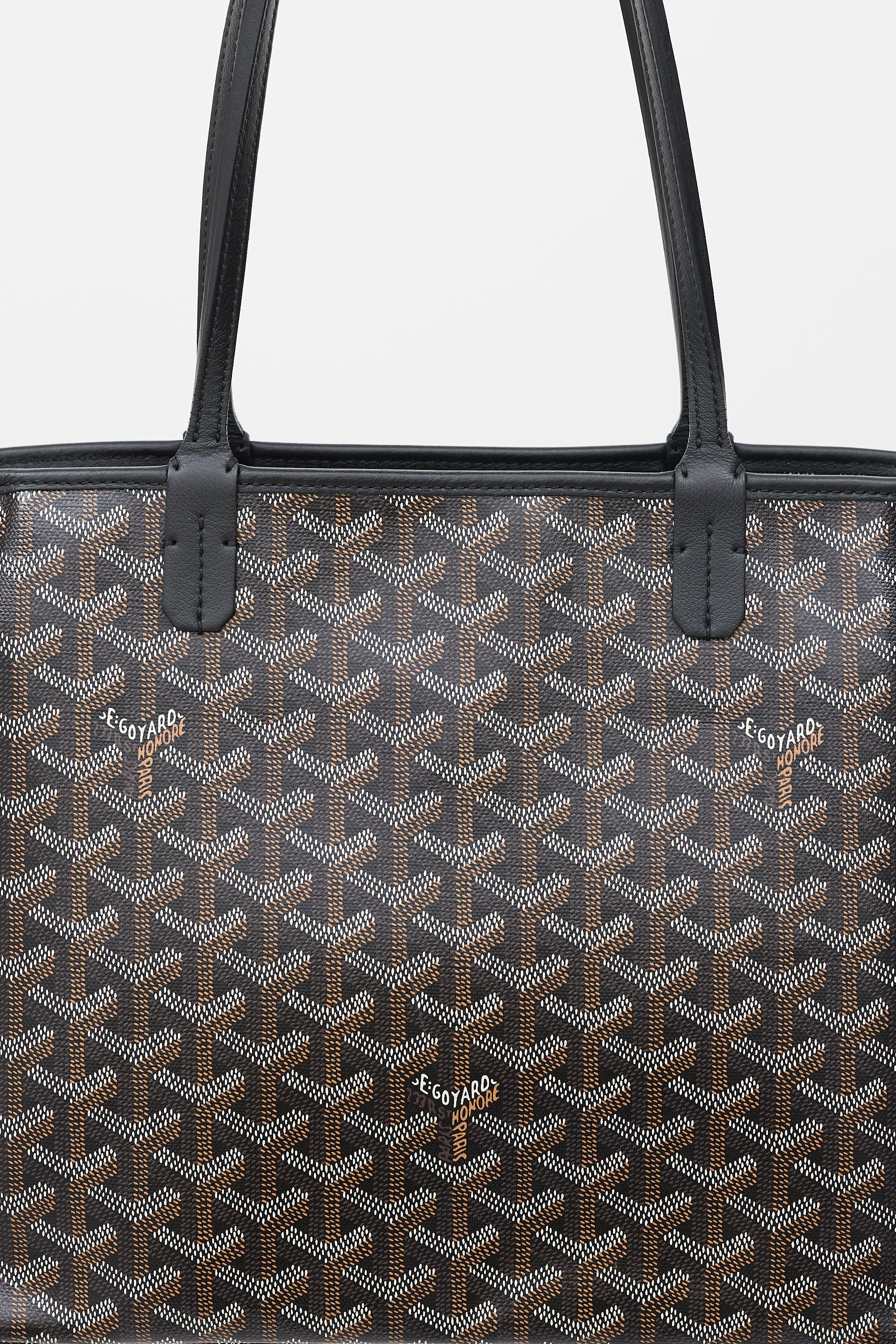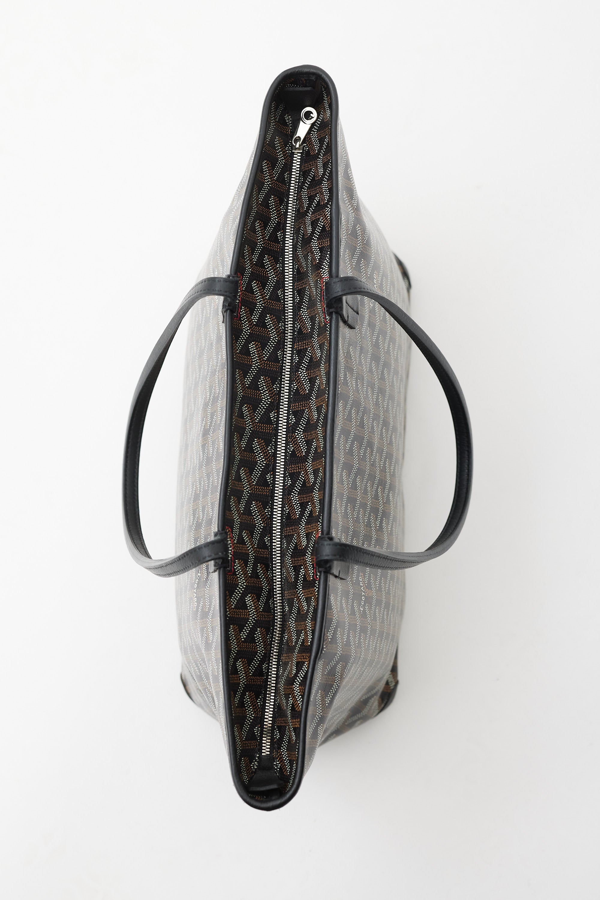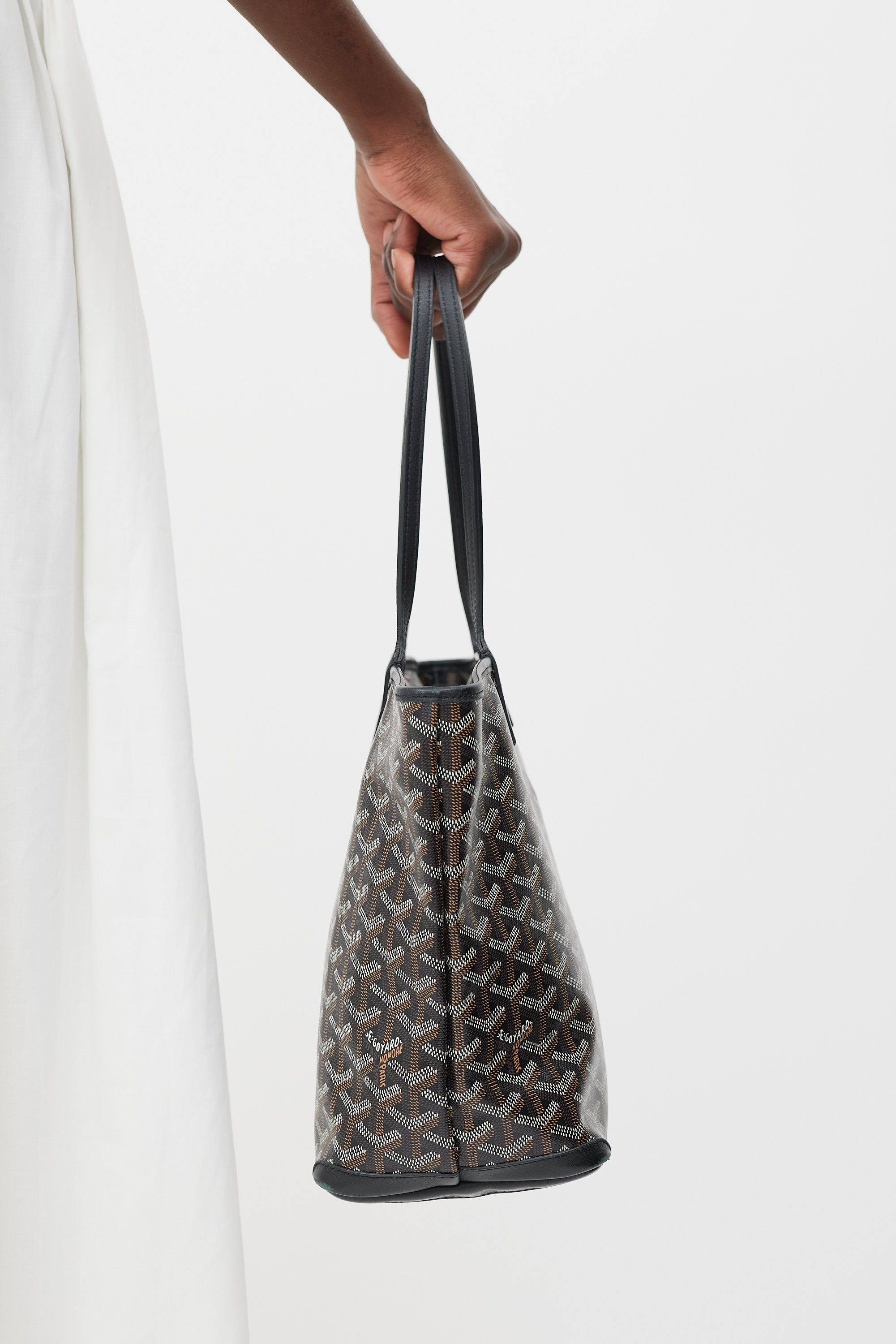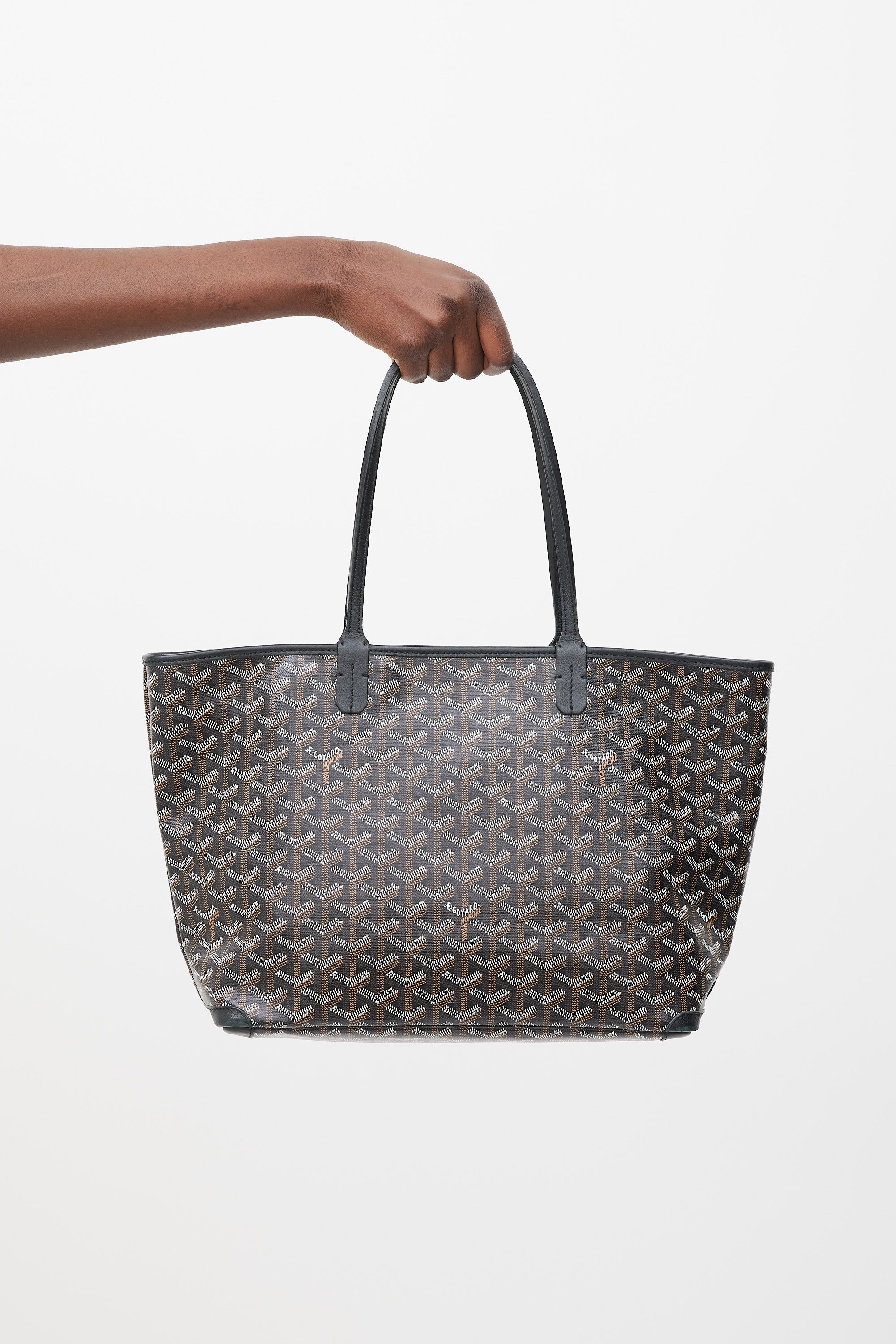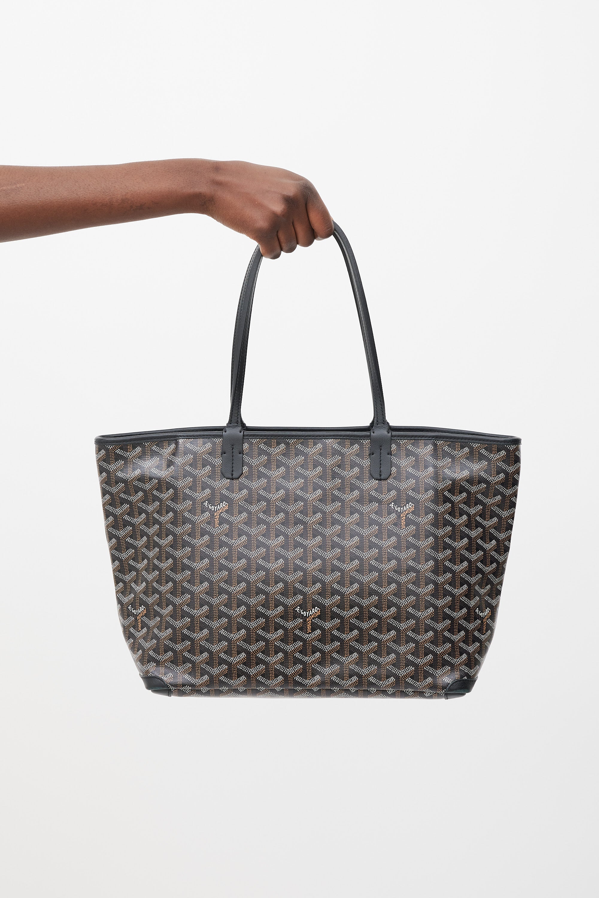 Pre-owned Goyard 2018 black Artois PM tote in Goyardine monogram coated canvas featuring two flat top handles, contrast stitching, one main compartment with one slip pocket, tonal leather trim, and top zip closure. Comes with original dust bag.
