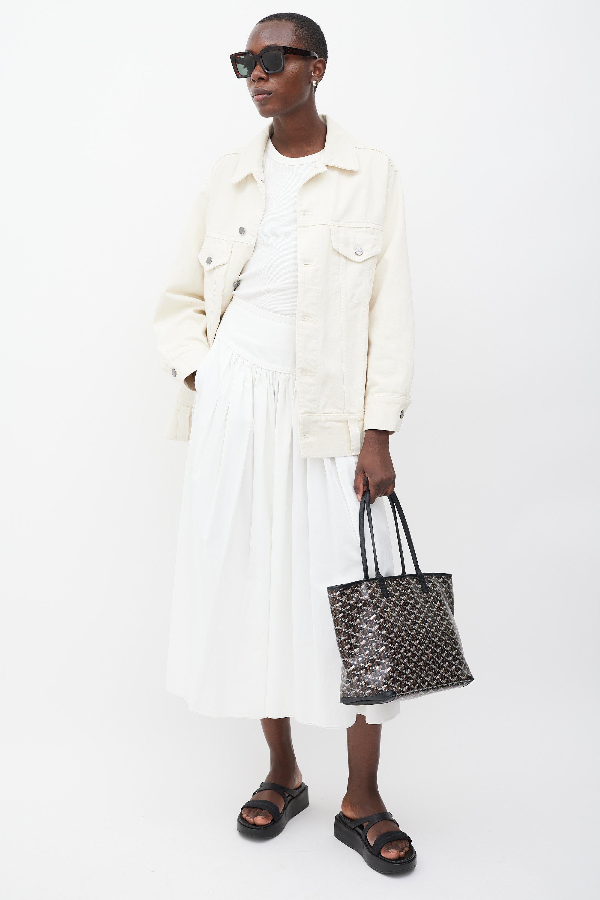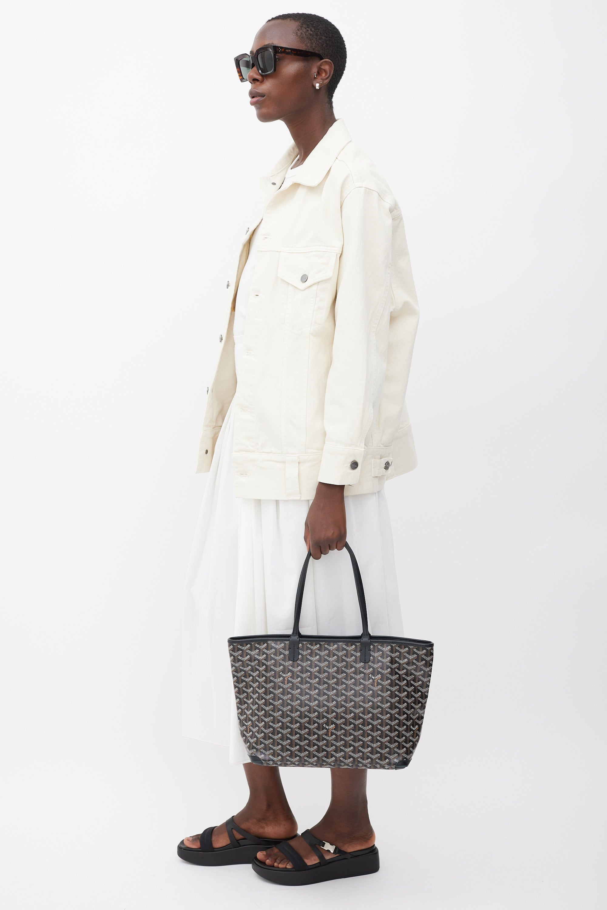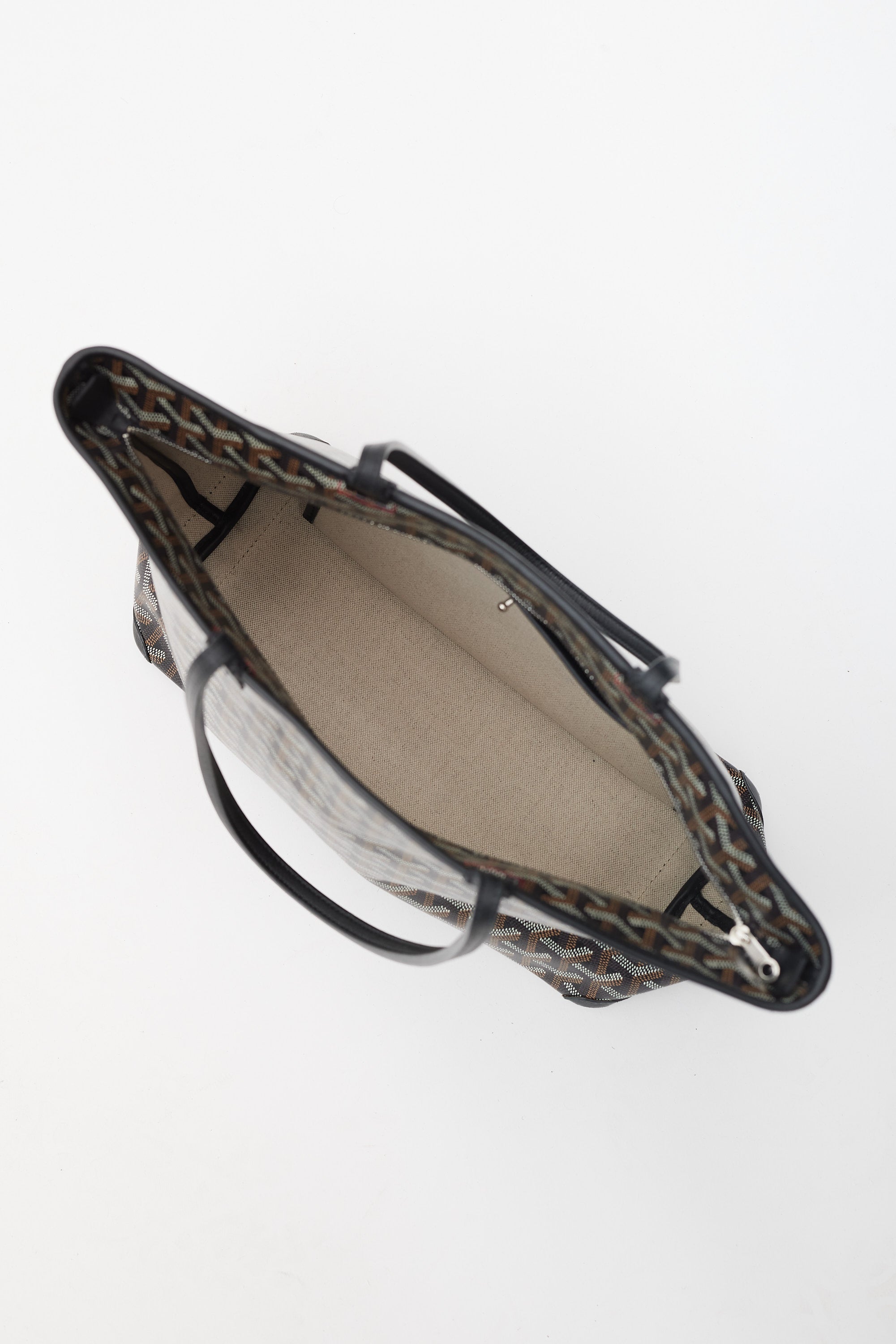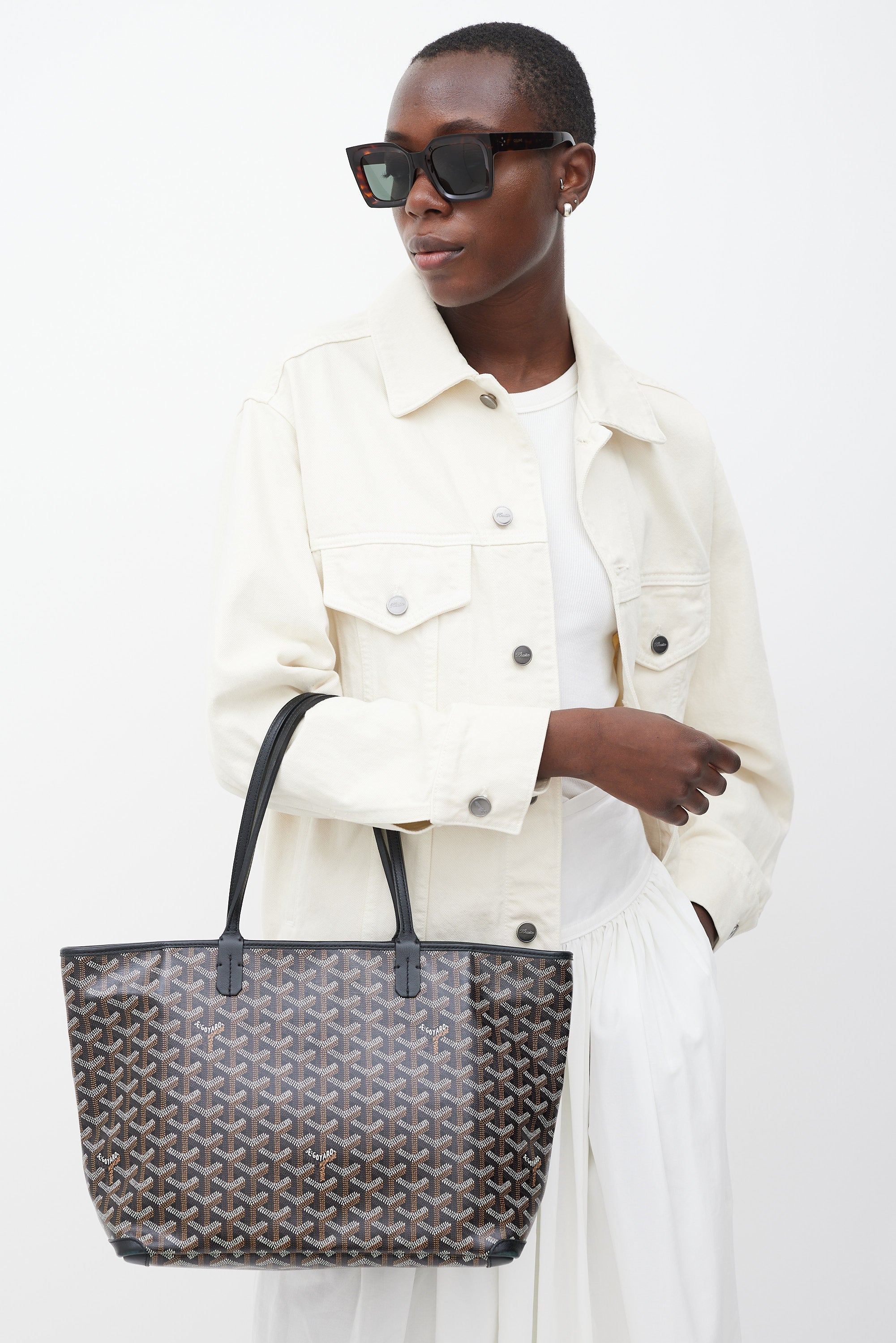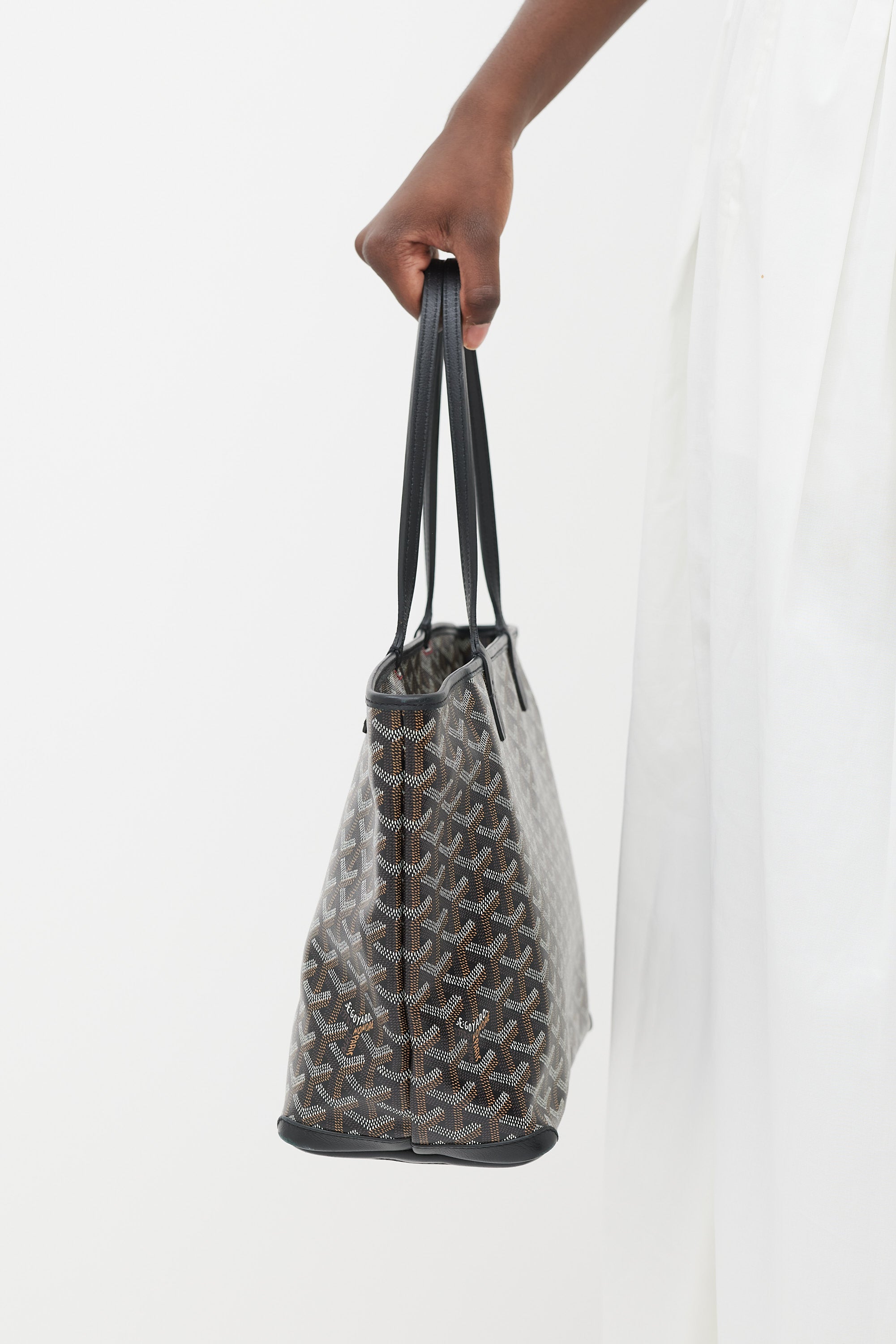 Pre-owned Goyard 2018 black Artois PM tote in Goyardine monogram coated canvas featuring two flat top handles, contrast stitching, one main compartment with one slip pocket, tonal leather trim, and top zip closure. Comes with original dust bag.