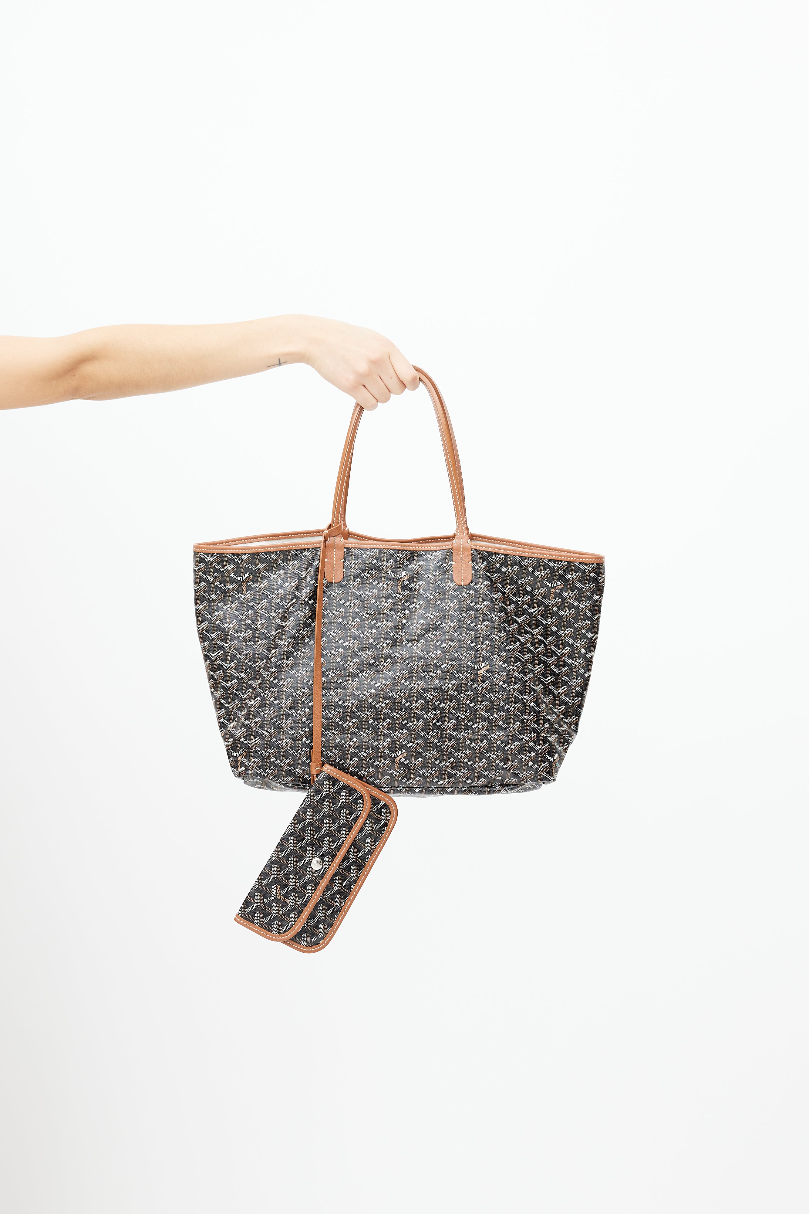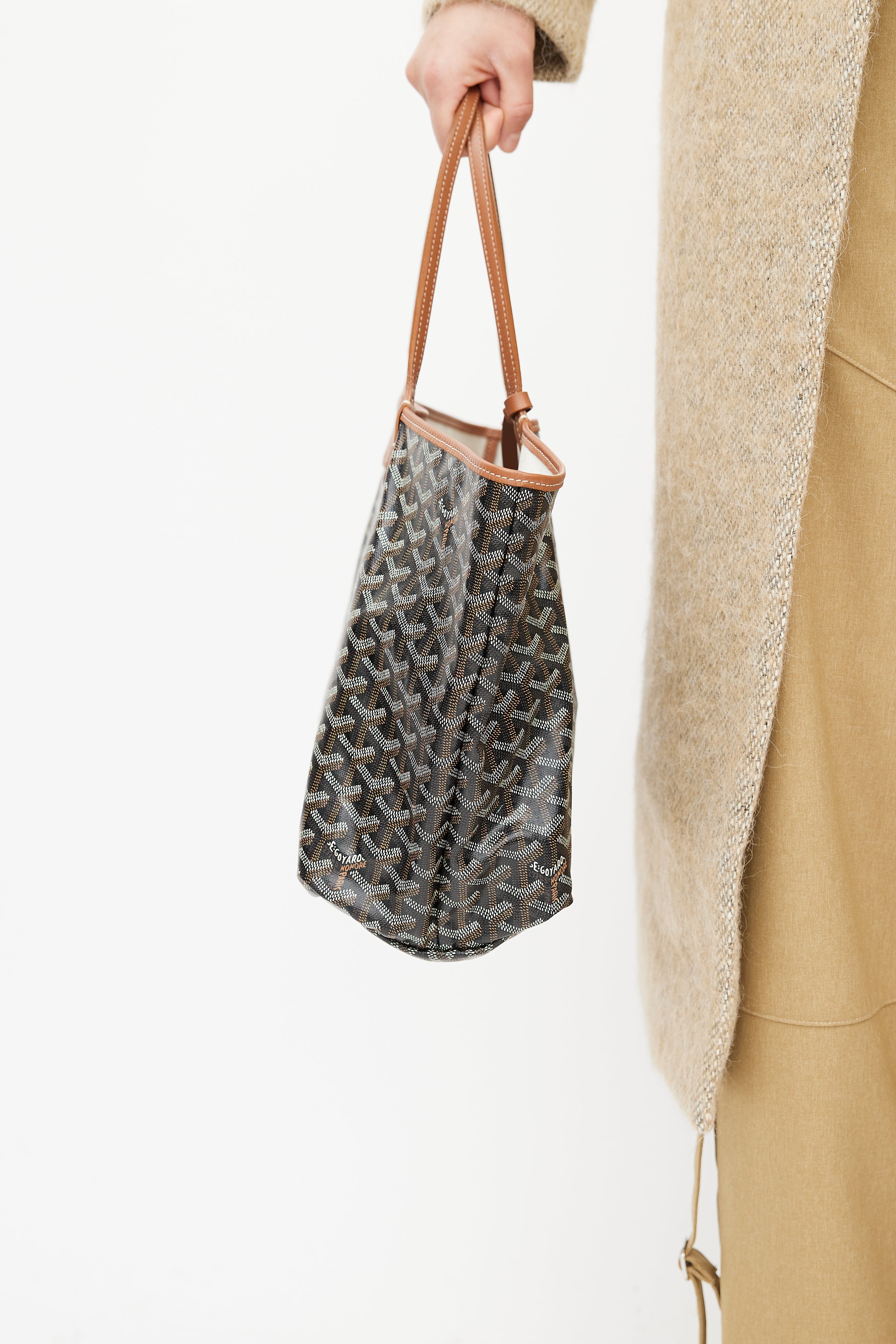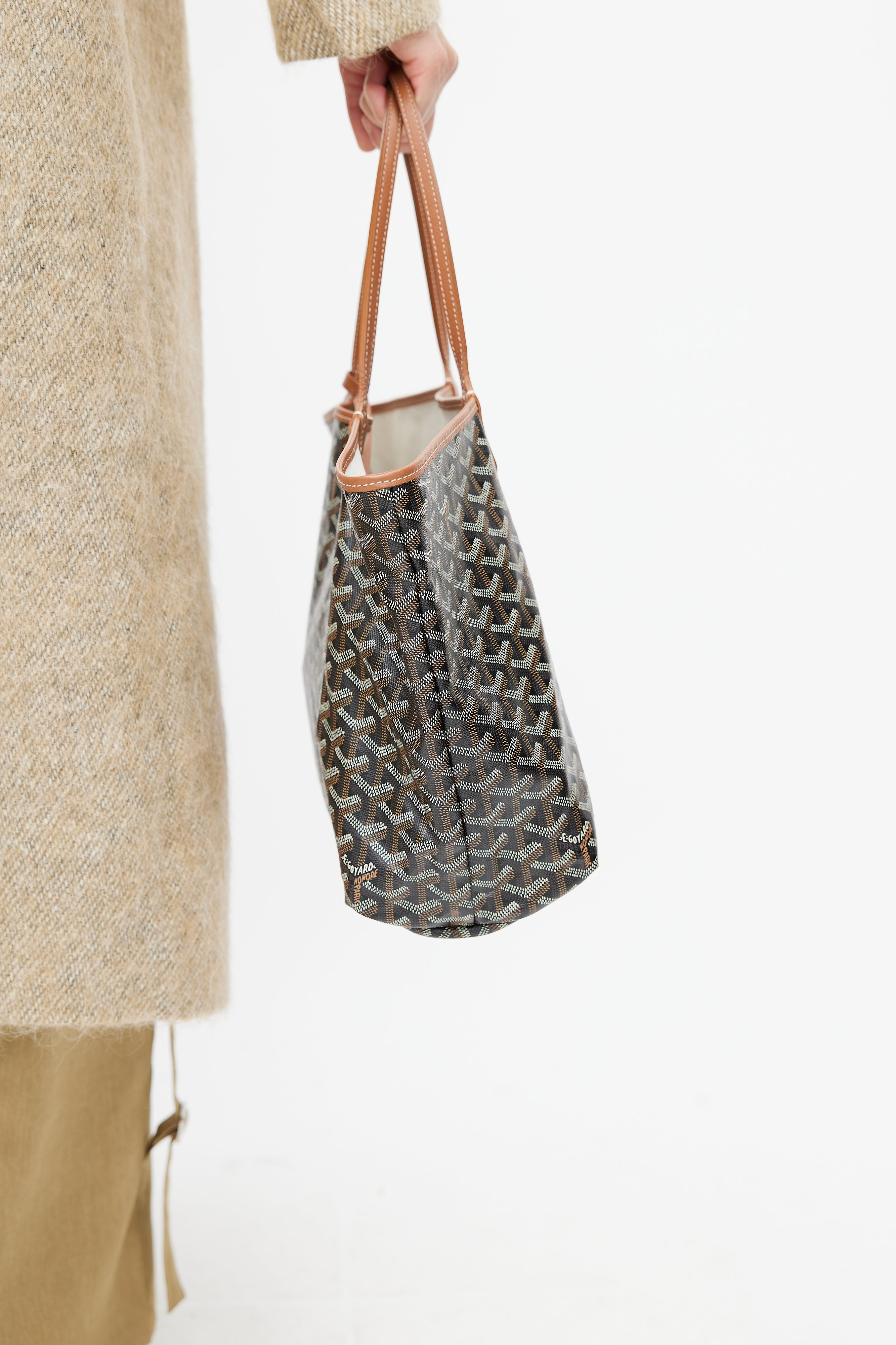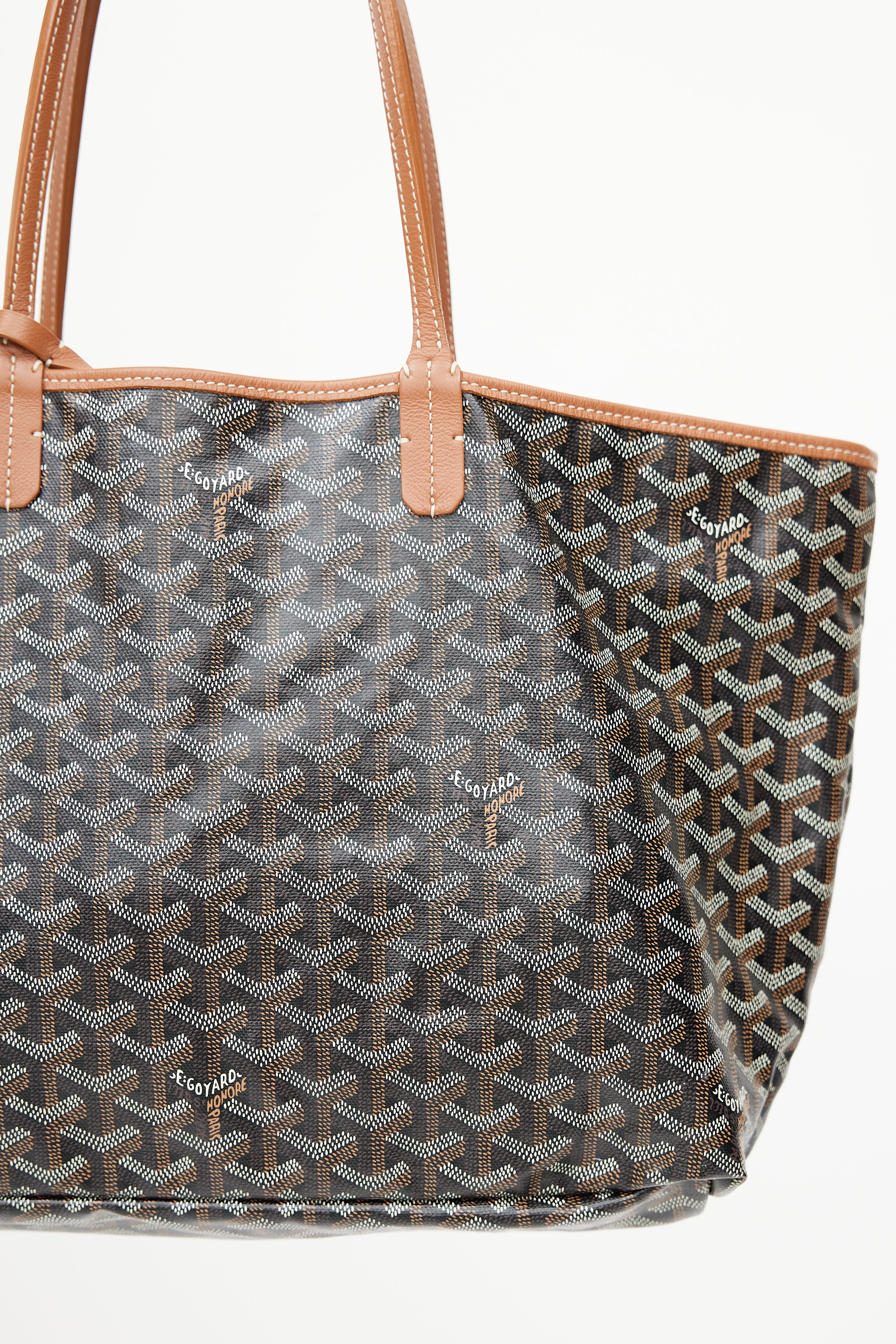 Pre-owned Goyard black and brown Saint Louis PM tote bag featuring two flat top handles, contrast stitch, Goyardine monogram canvas, reversible cotton lining, detachable pouch, and open compartment.