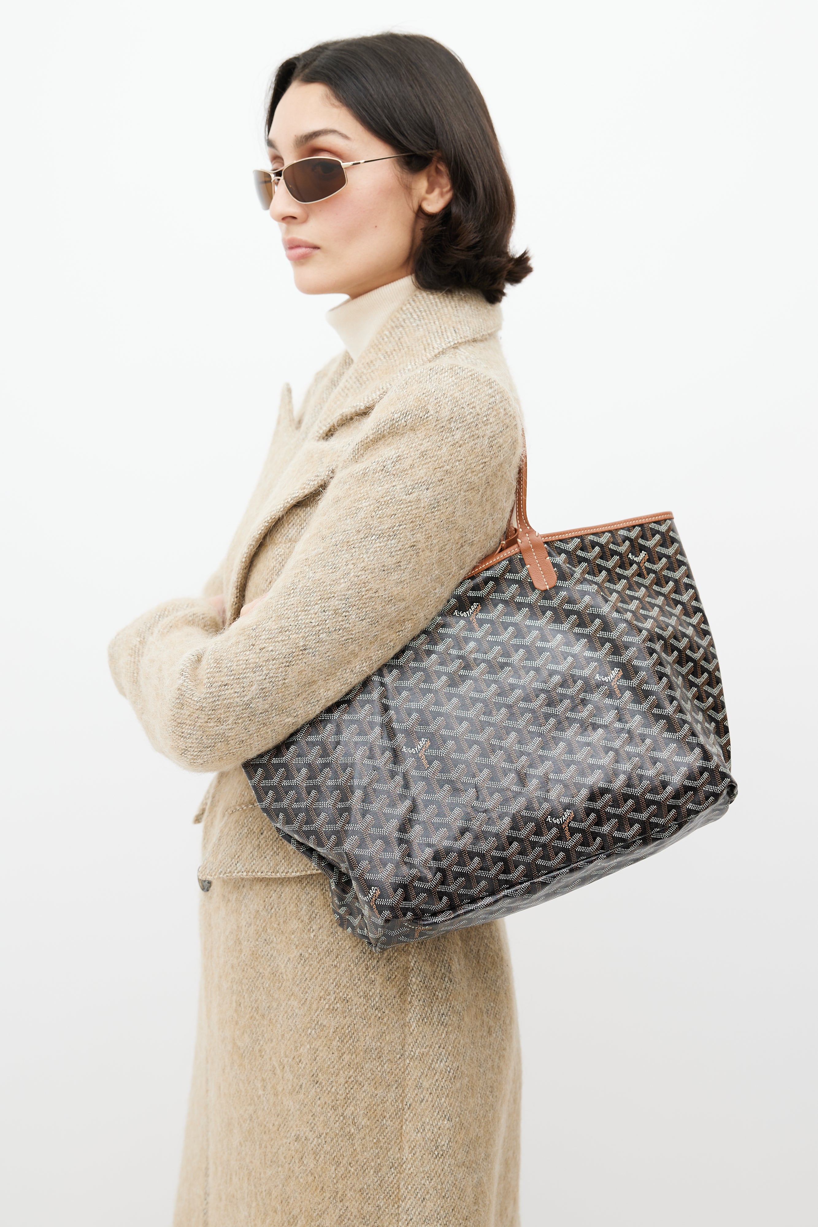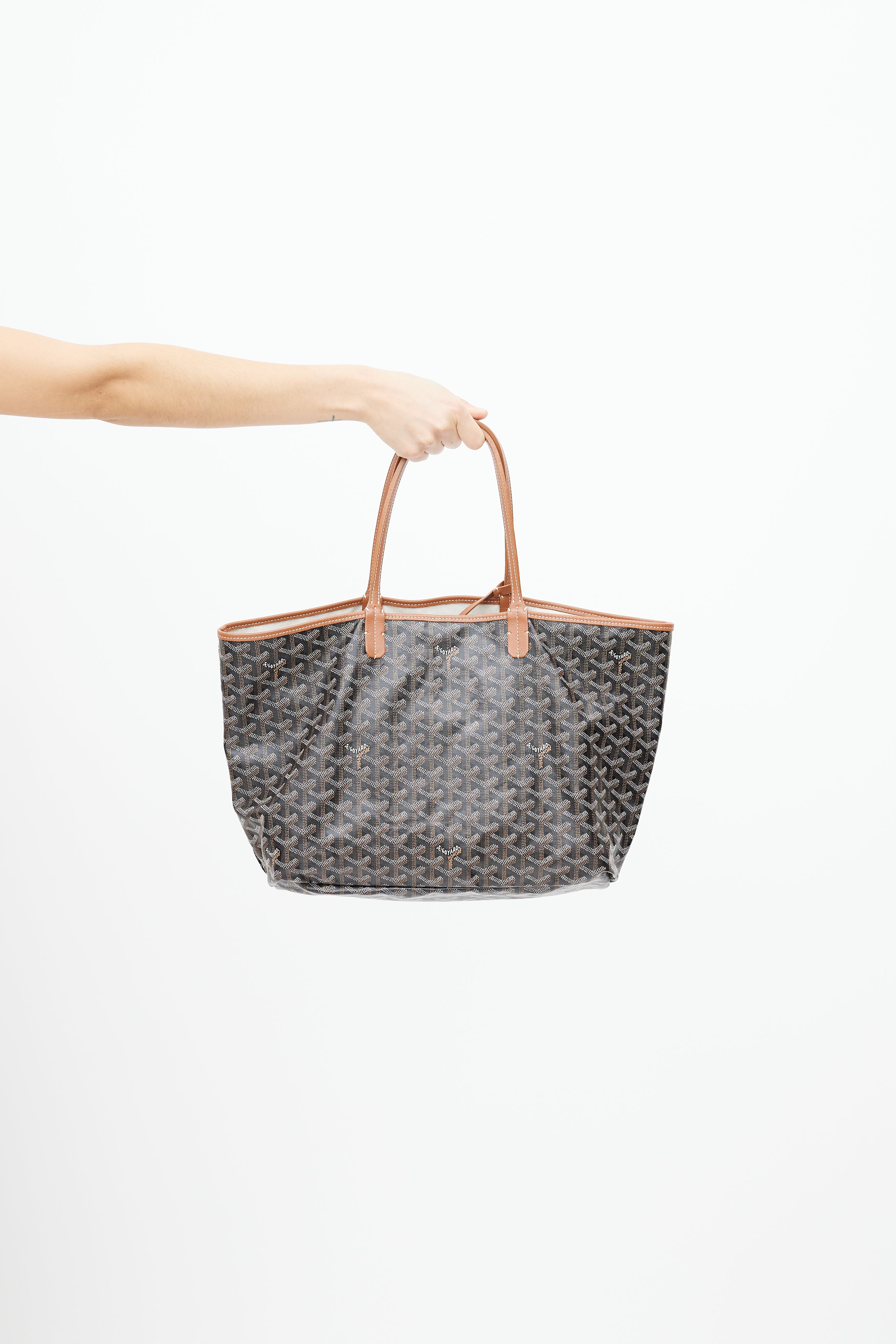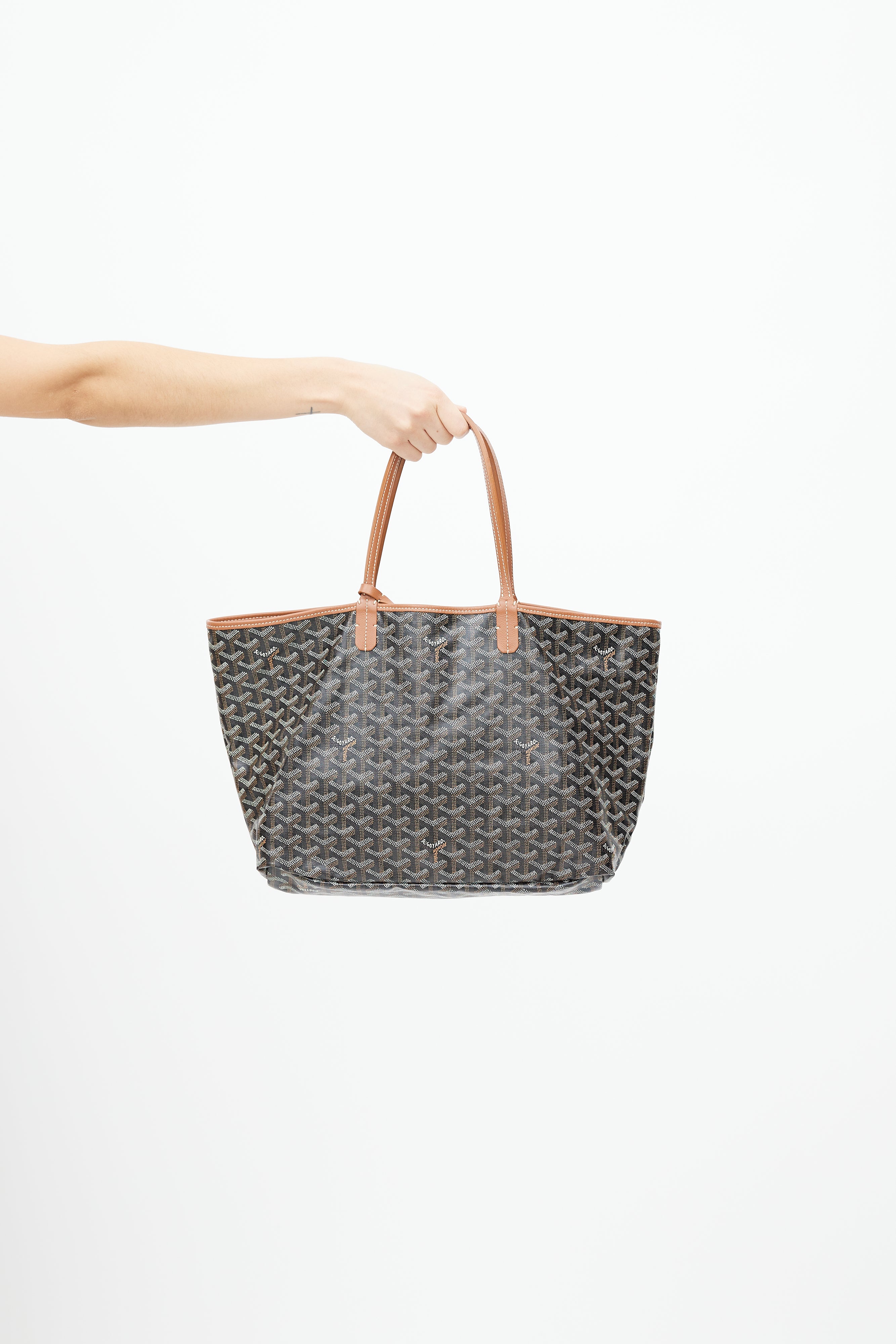 Pre-owned Goyard black and brown Saint Louis PM tote bag featuring two flat top handles, contrast stitch, Goyardine monogram canvas, reversible cotton lining, detachable pouch, and open compartment.