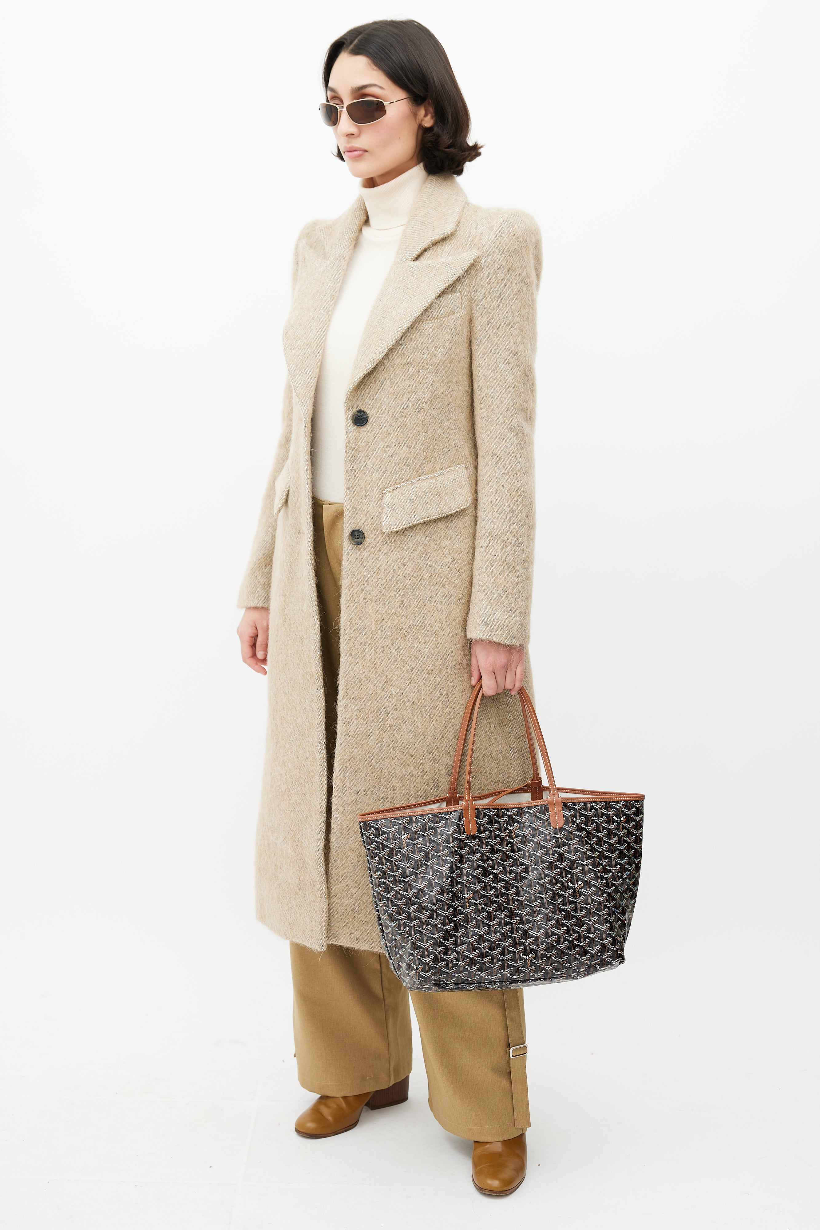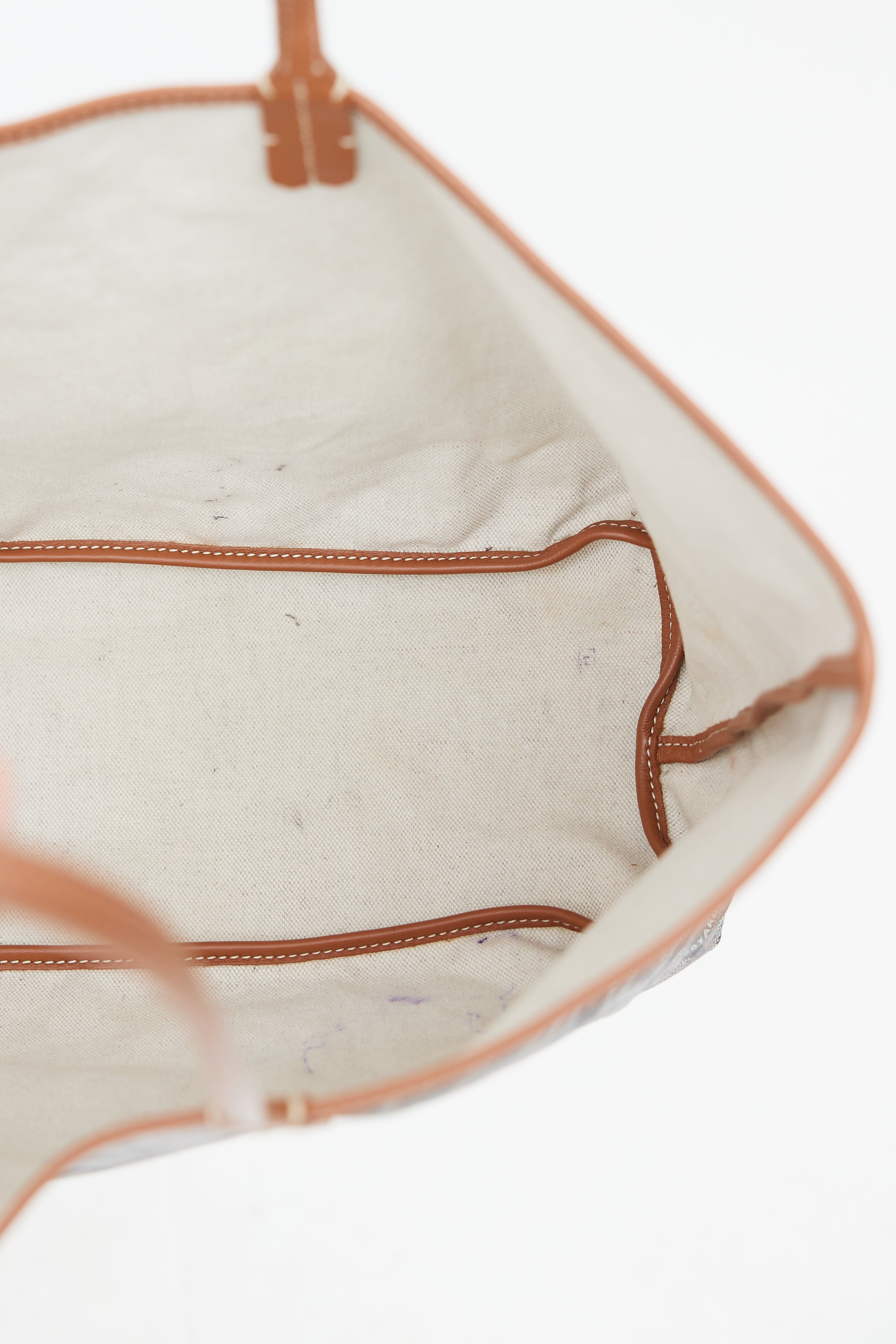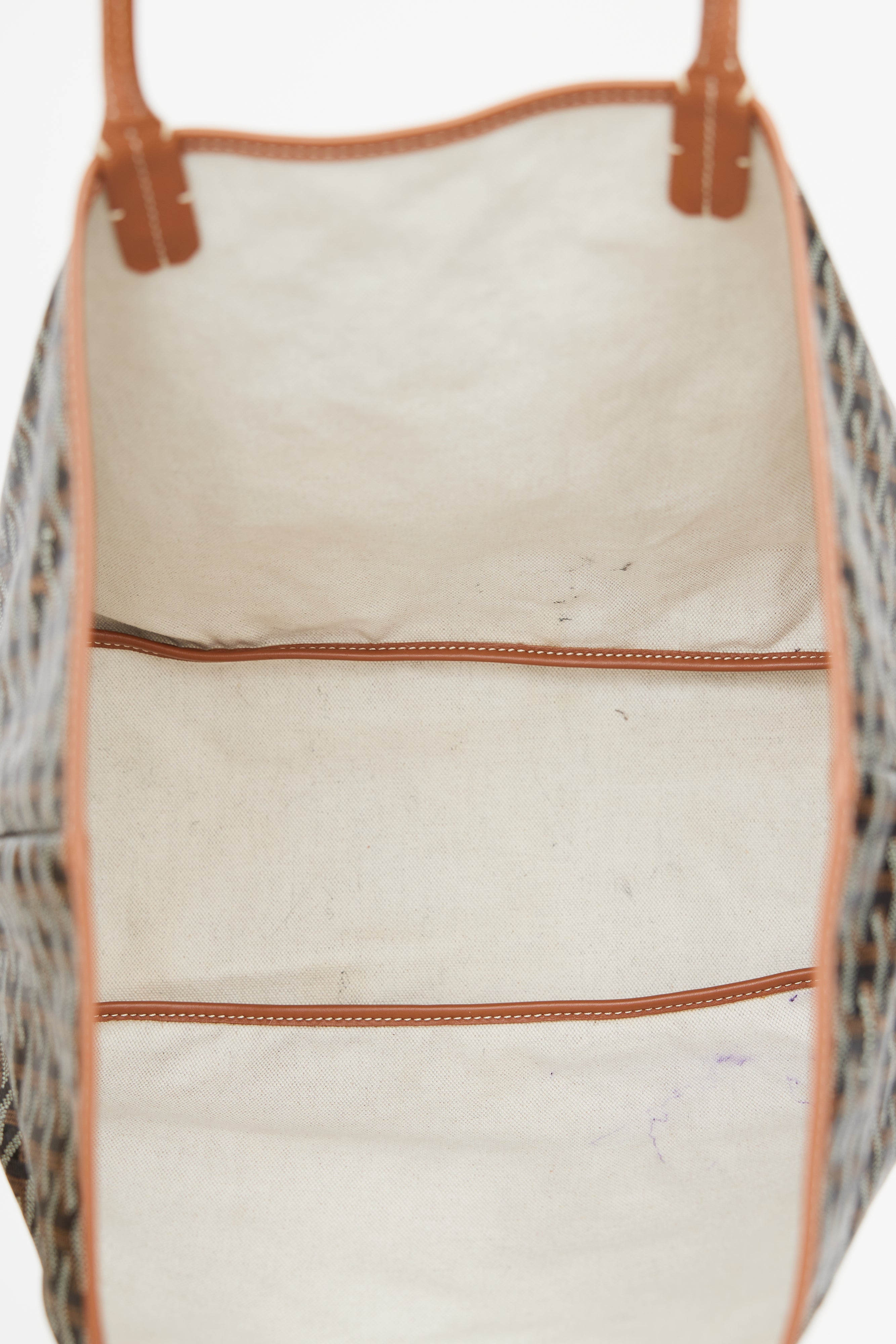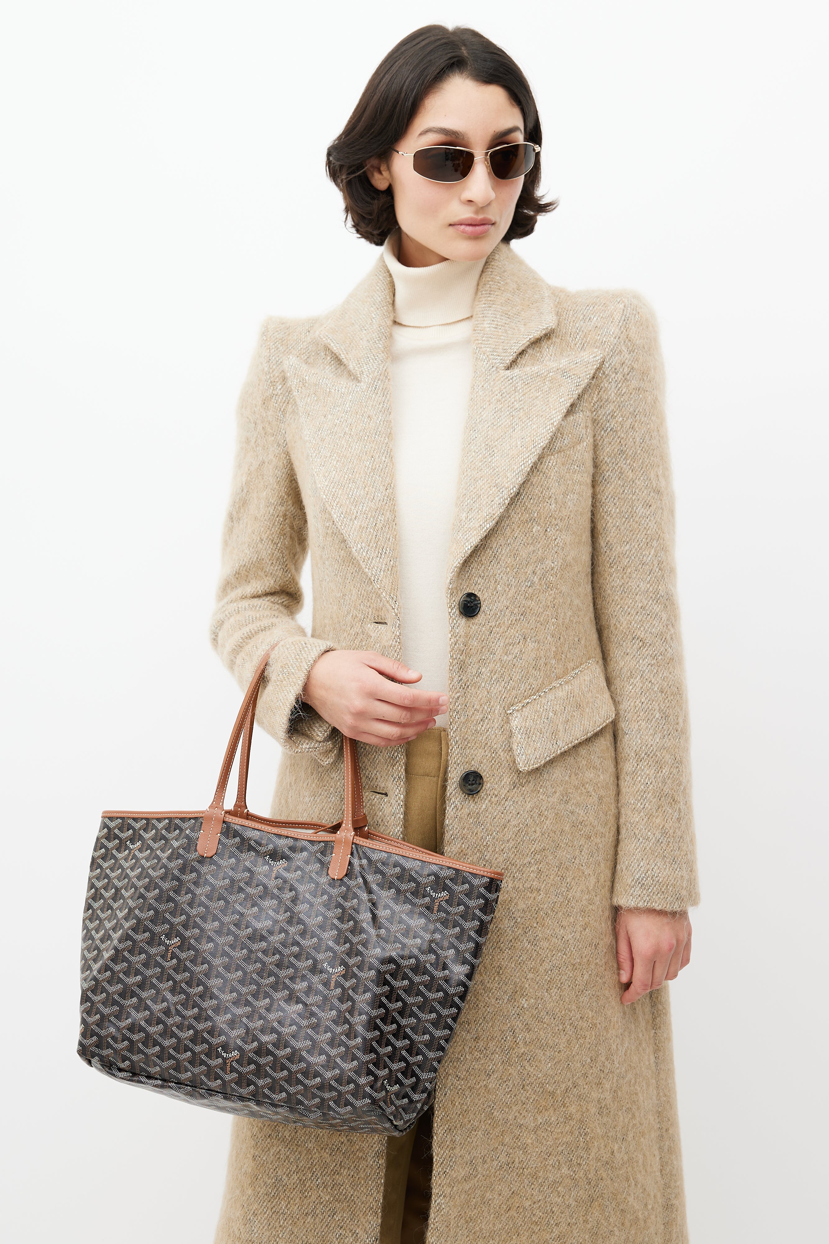 Pre-owned Goyard black and brown Saint Louis PM tote bag featuring two flat top handles, contrast stitch, Goyardine monogram canvas, reversible cotton lining, detachable pouch, and open compartment.