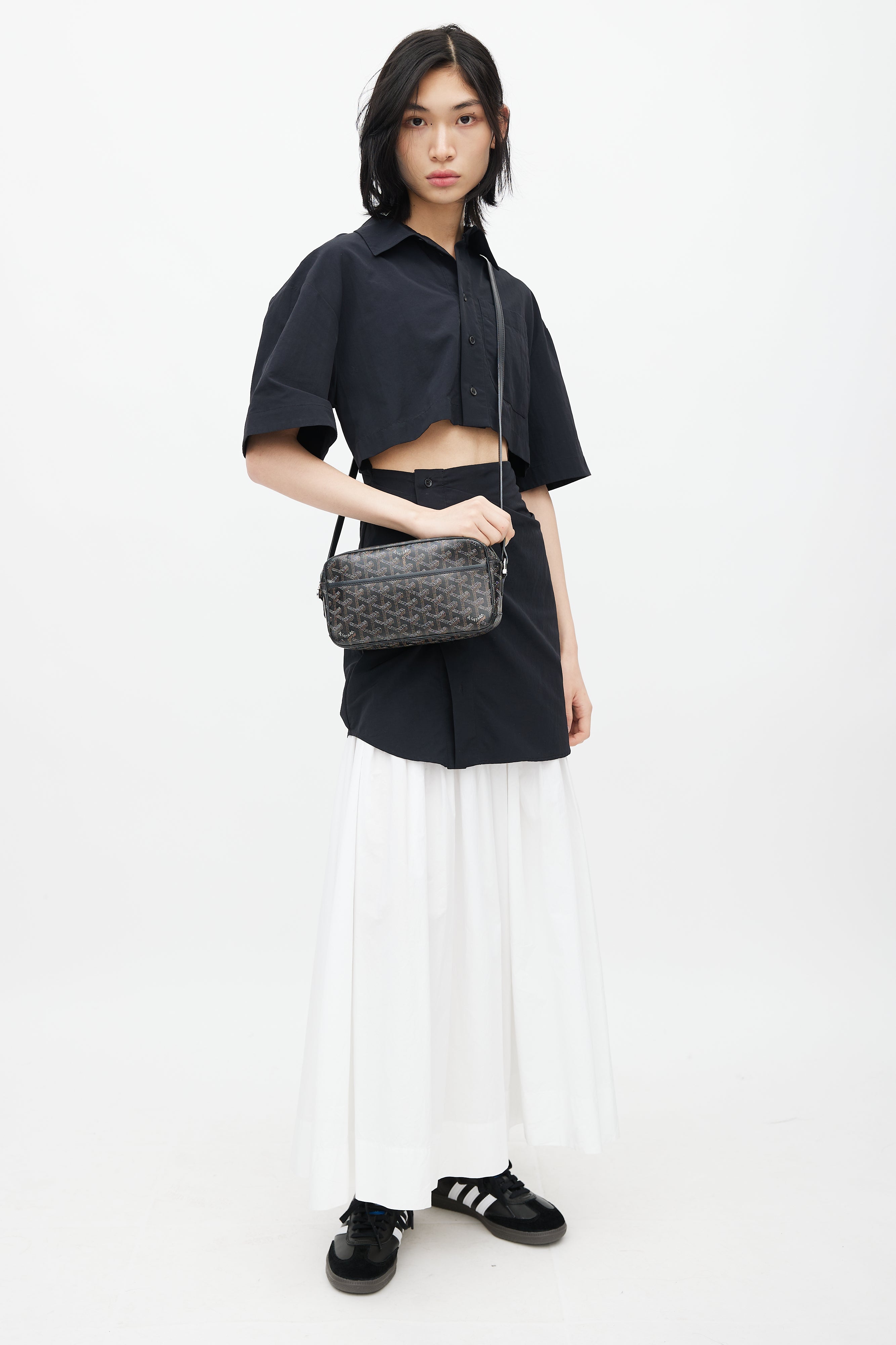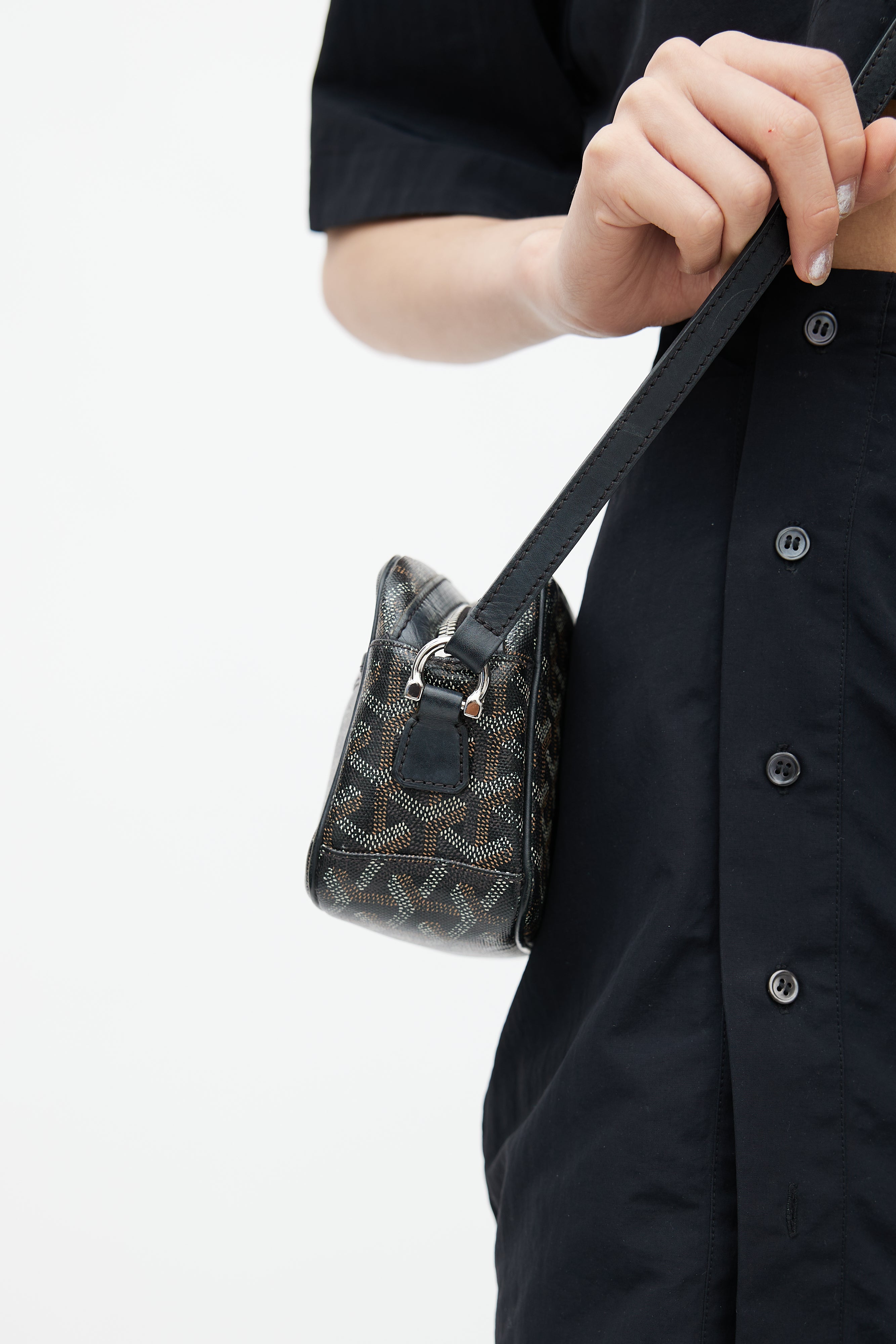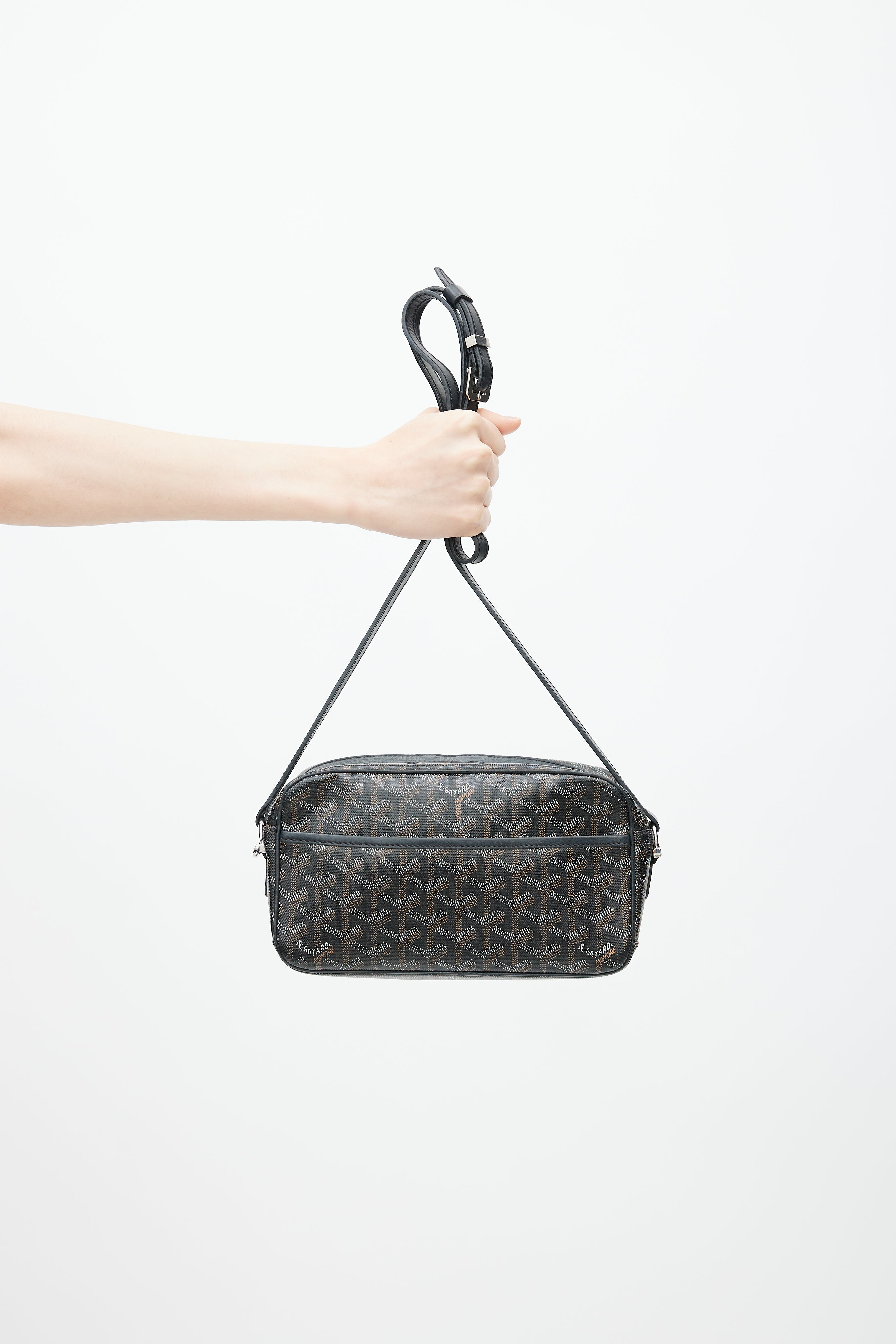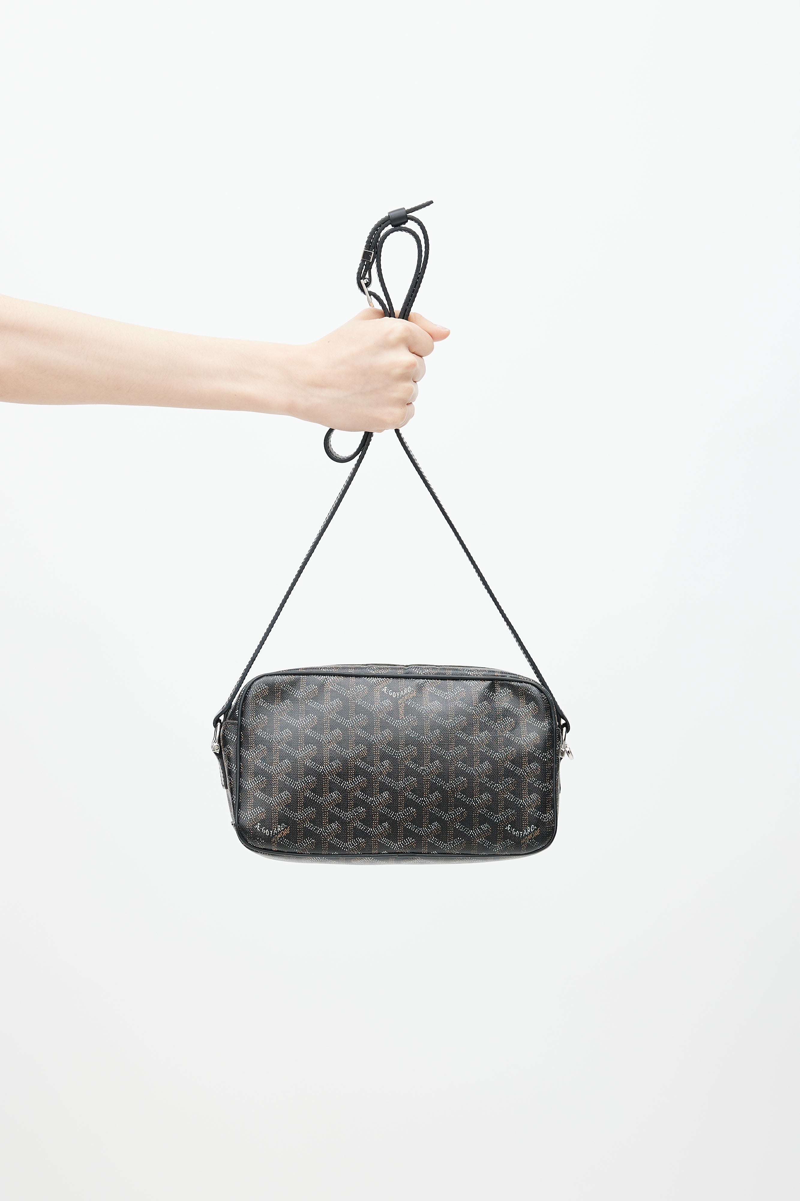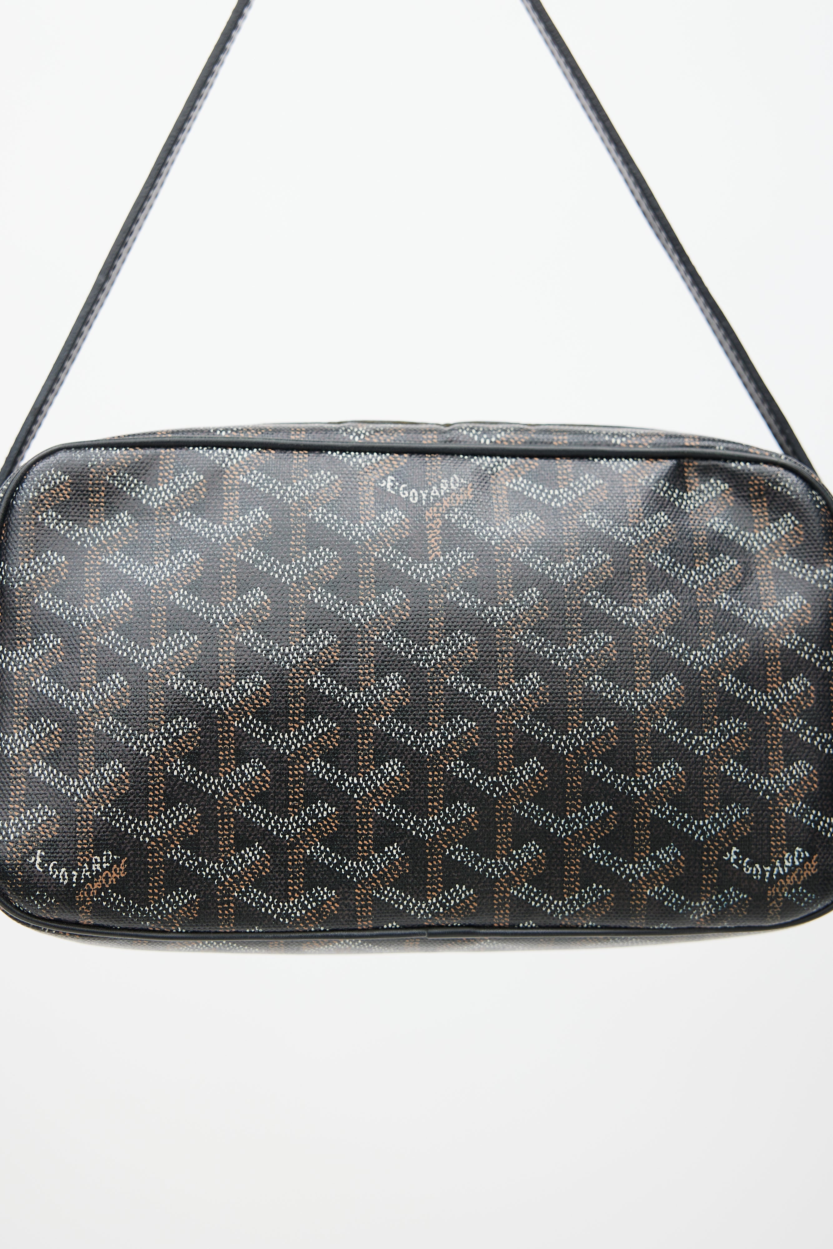 Pre-owned Goyard black Cap-Vert PM crossbody bag featuring Goyardine monogram coated canvas, slip pocket at front, zip closure at top, yellow canvas lining, slip pocket inside, and adjustable shoulder strap. Comes with original dust bag.