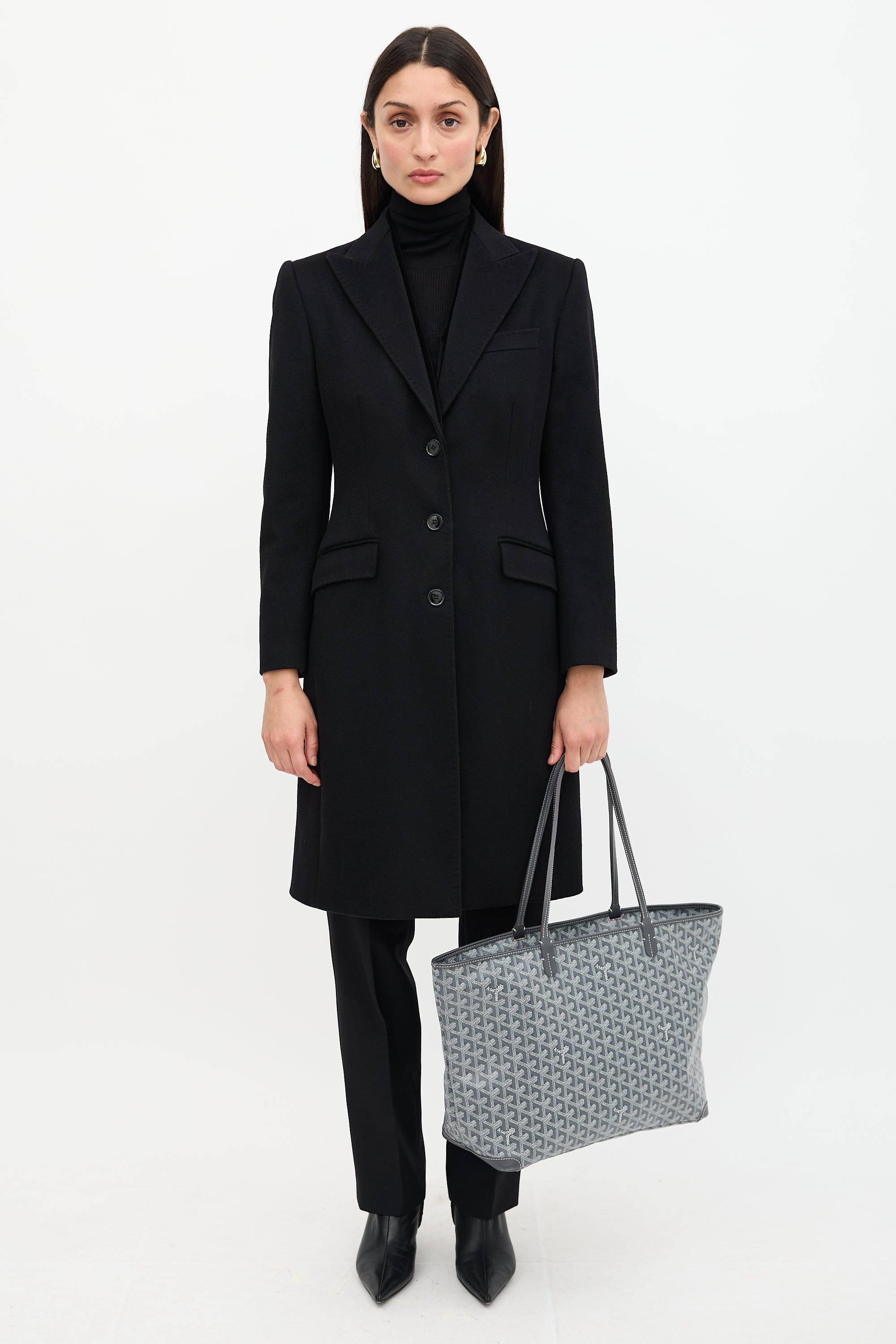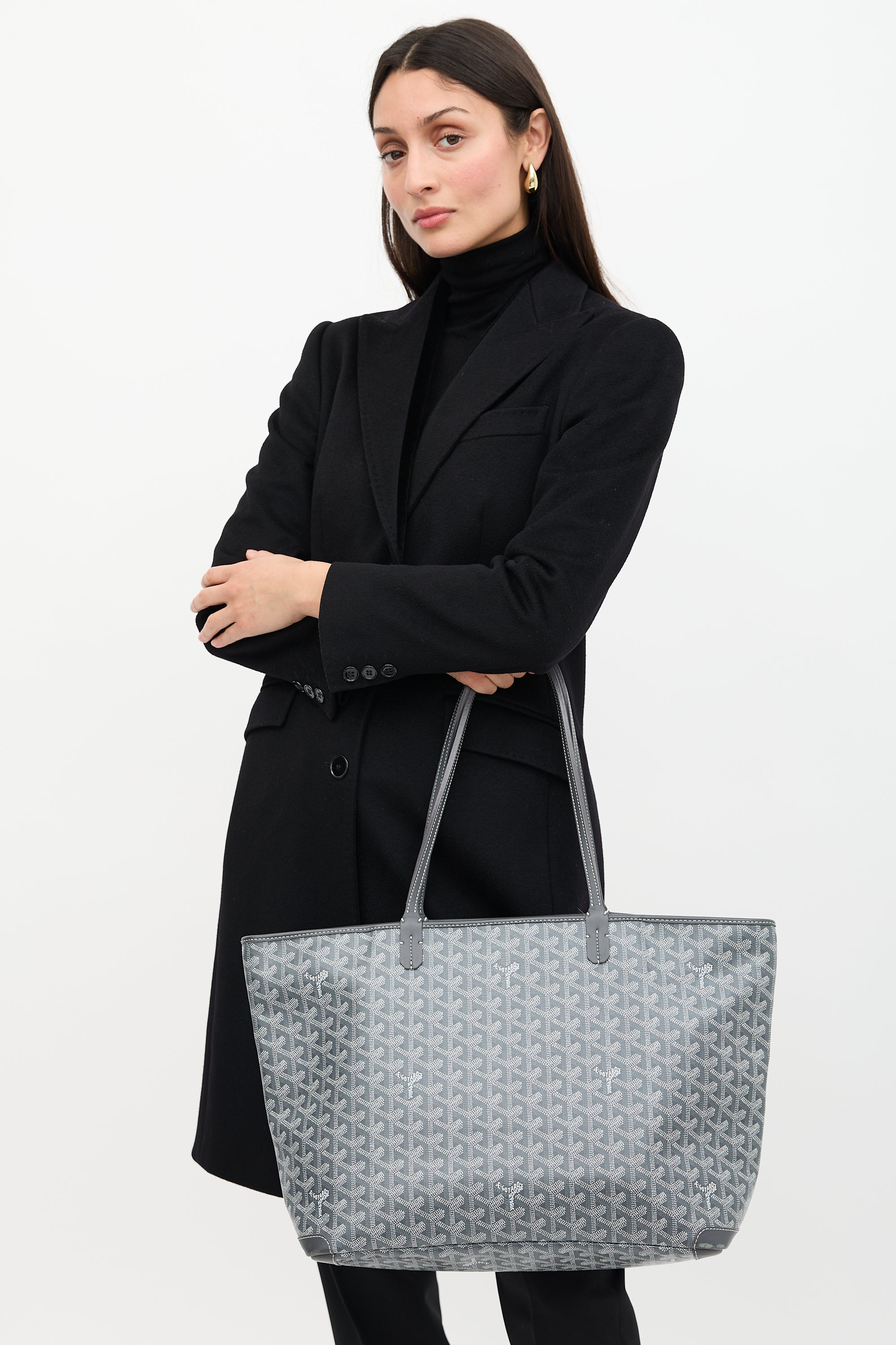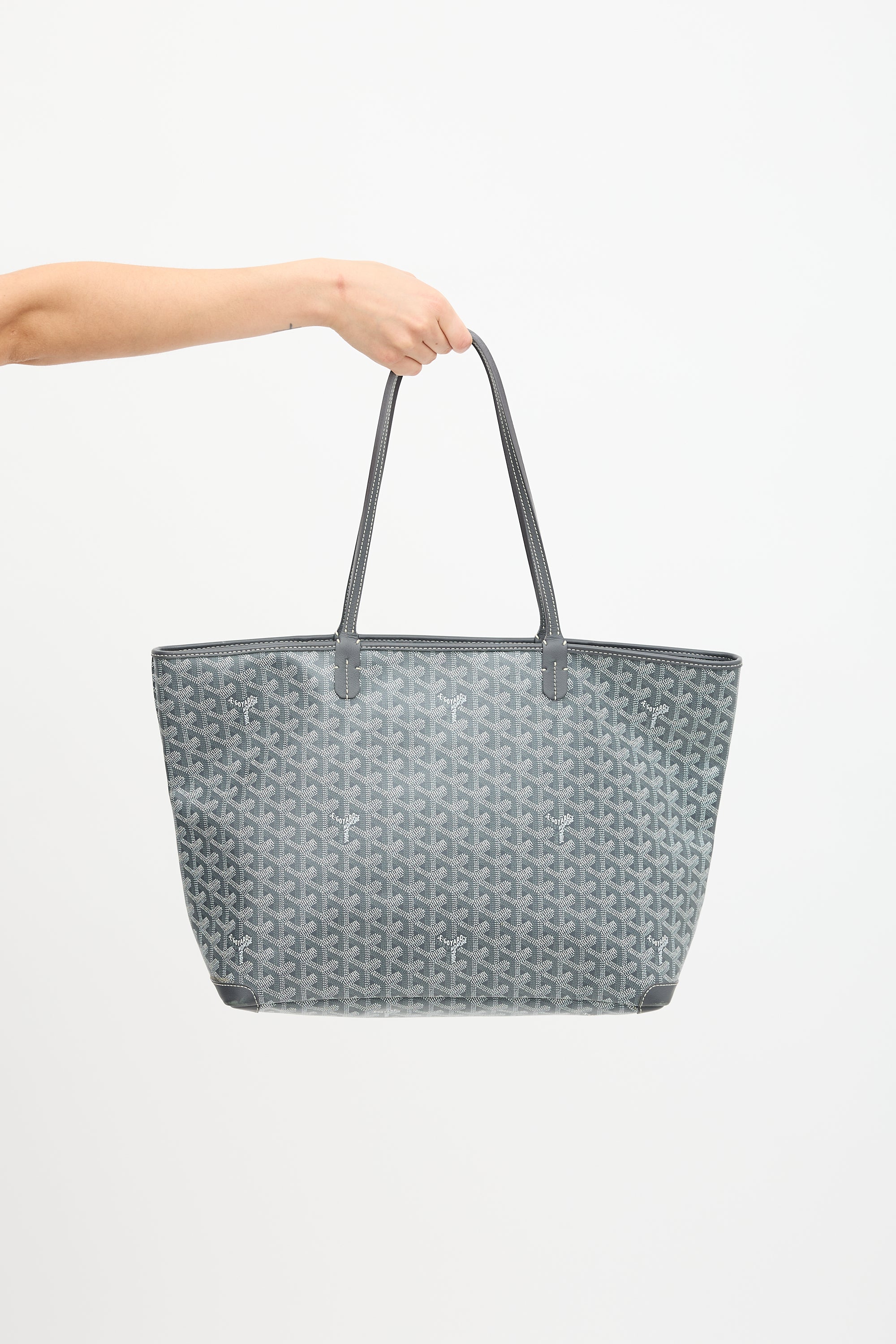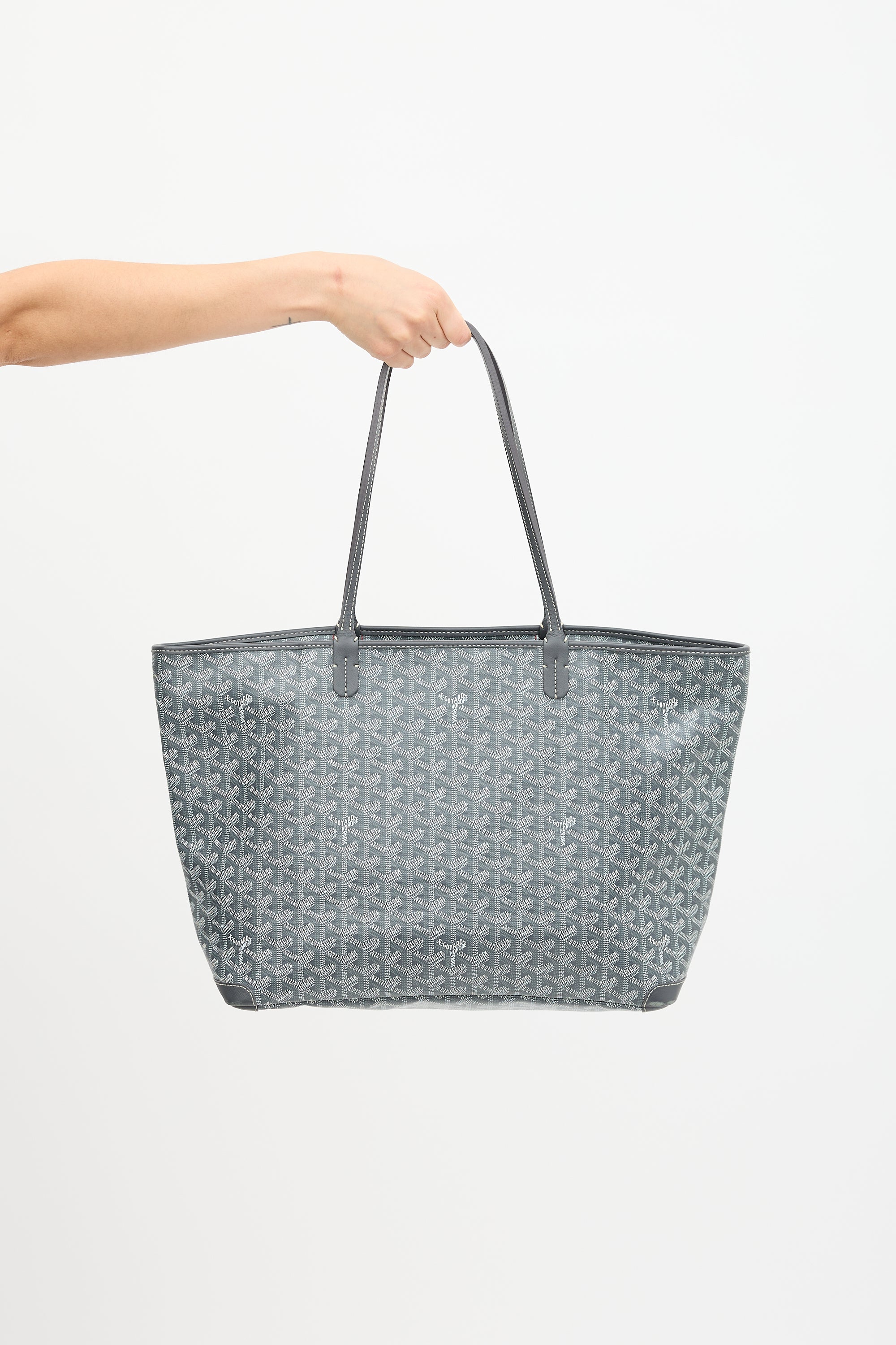 Pre-owned Goyard grey Artois MM tote bag featuring monogram Goyardine canvas, leather trim with contrast stitching, dual flat top handles, top zip closure, single main compartment, canvas lining, and interior slip pocket. Comes with original dust bag.