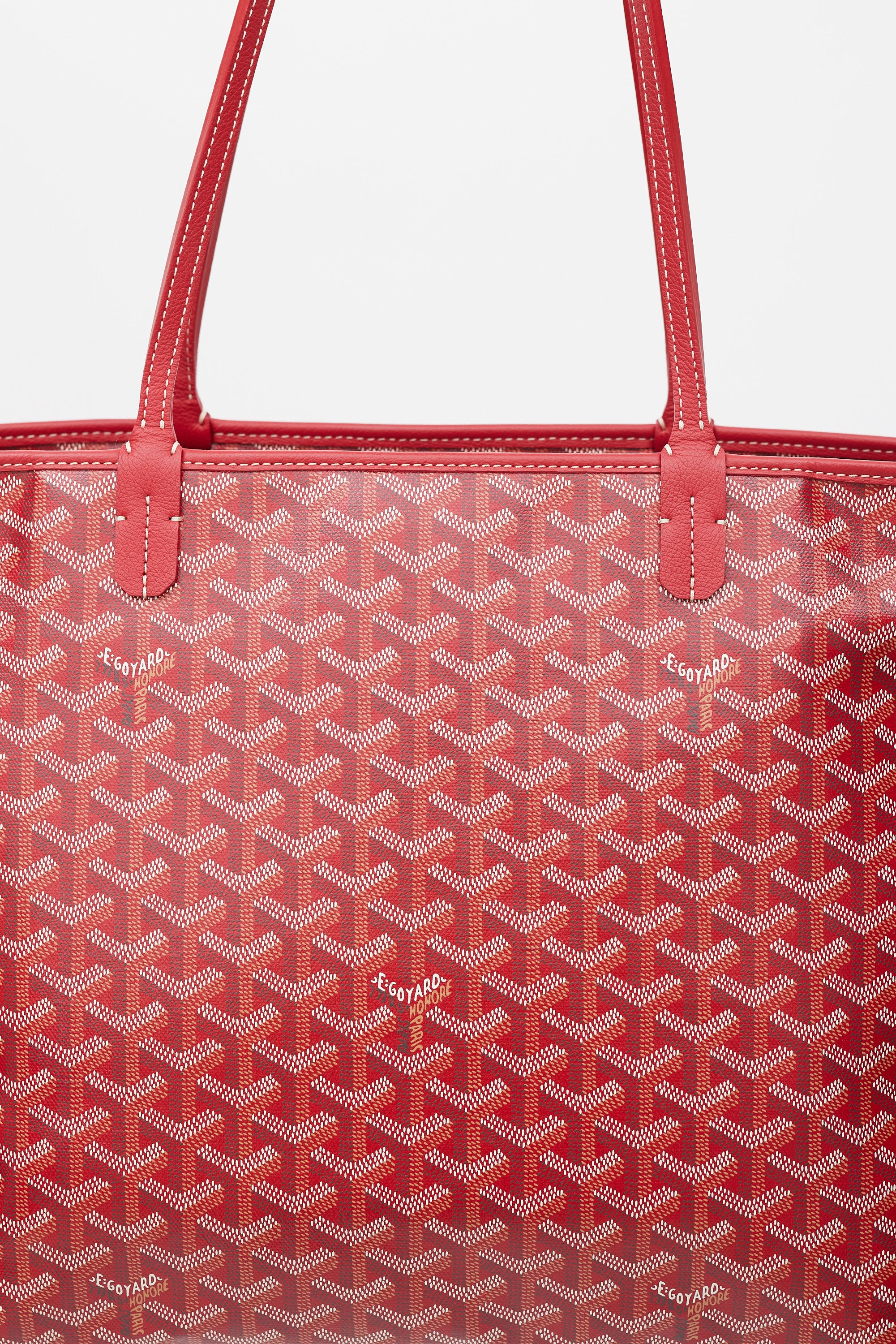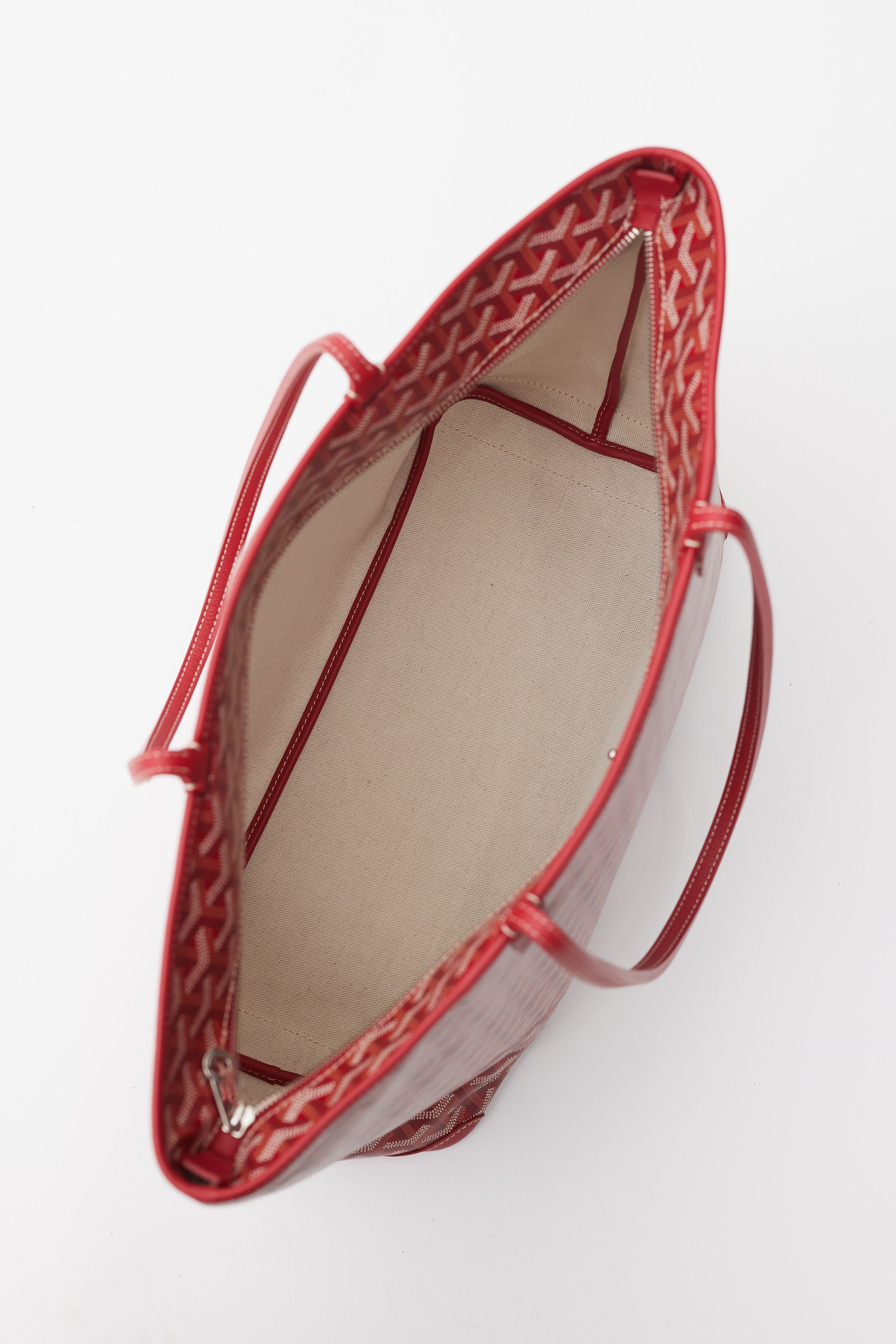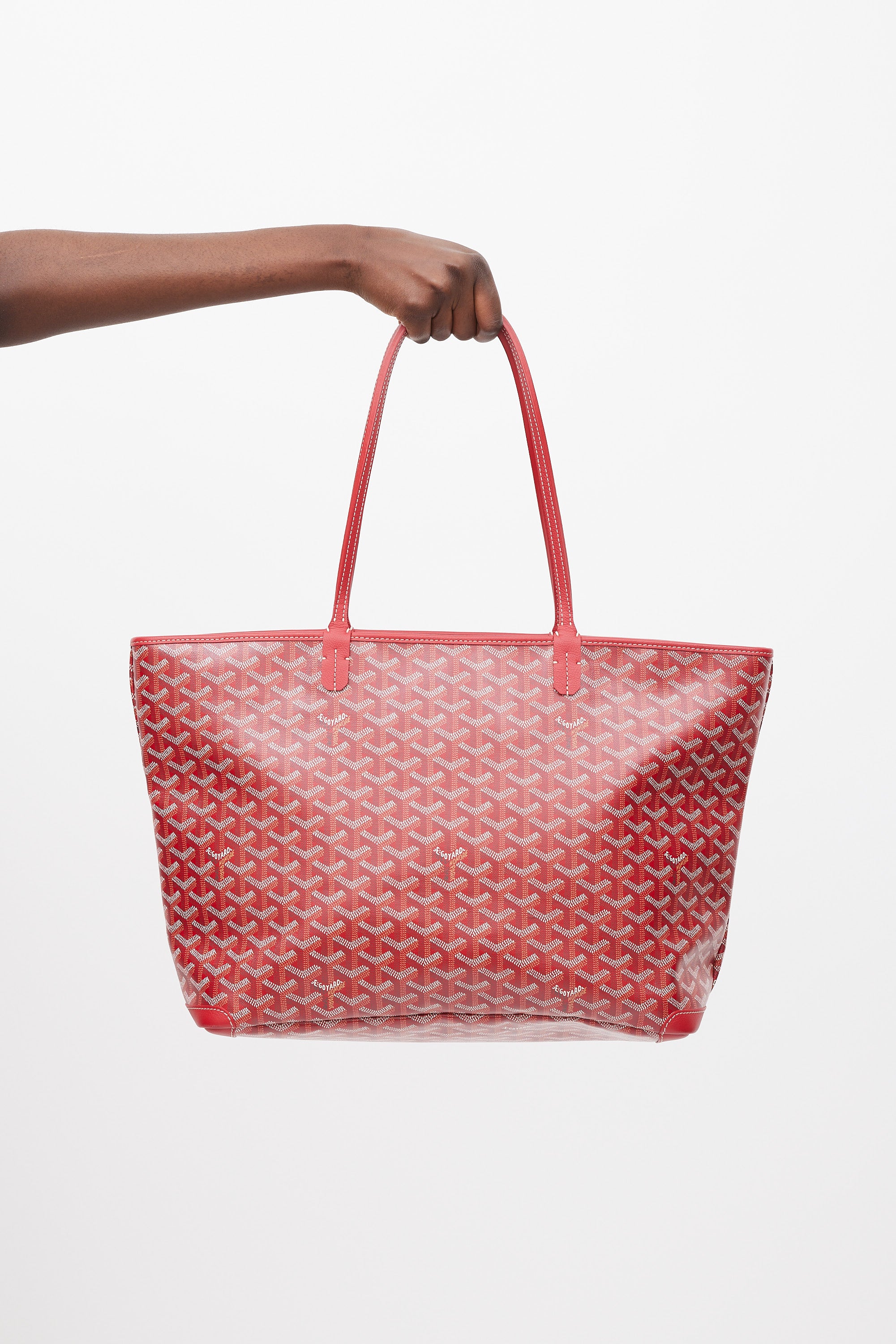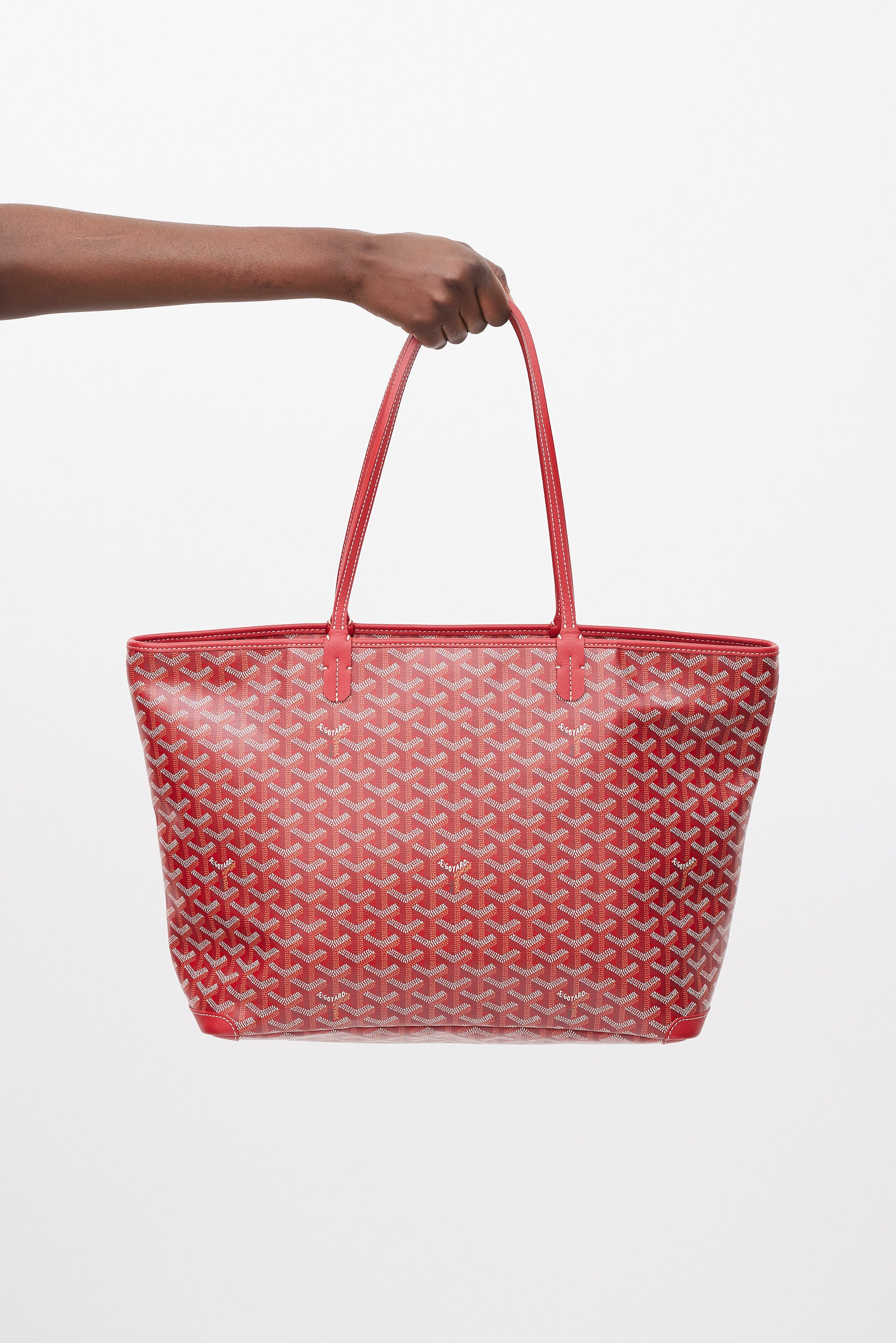 Pre-owned Goyard red Artois MM tote in Goyardine monogram coated canvas featuring two flat top handles, contrast stitching, one main compartment with one slip pocket, tonal leather trim, and top zip closure.