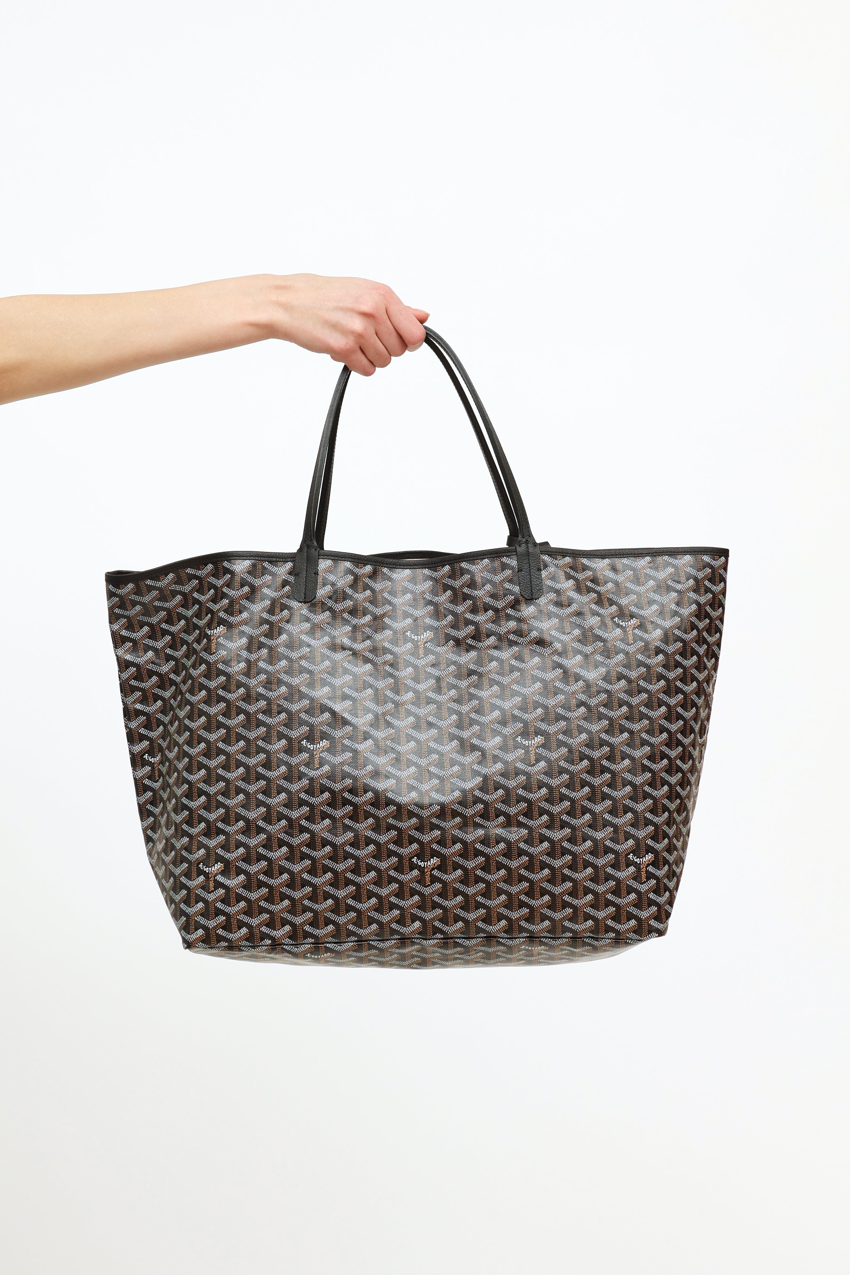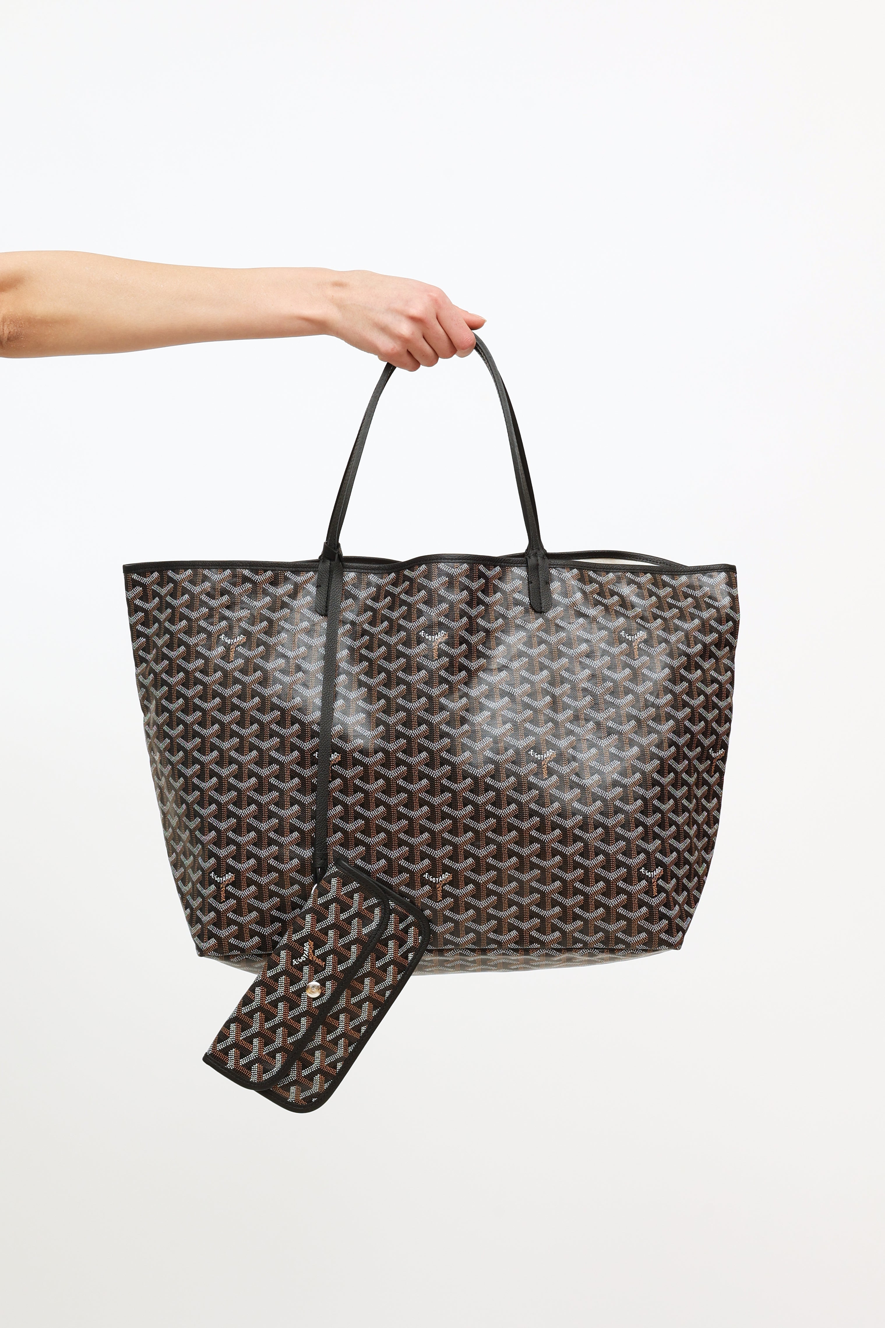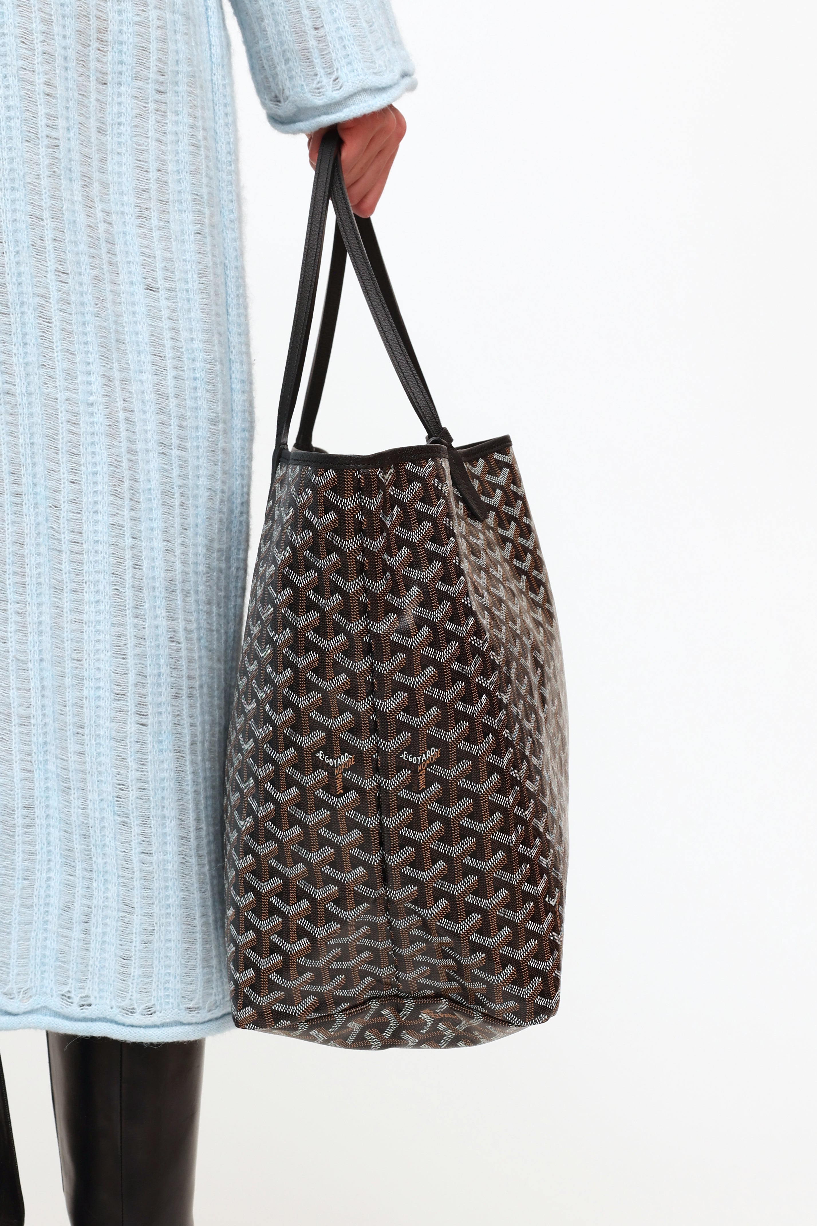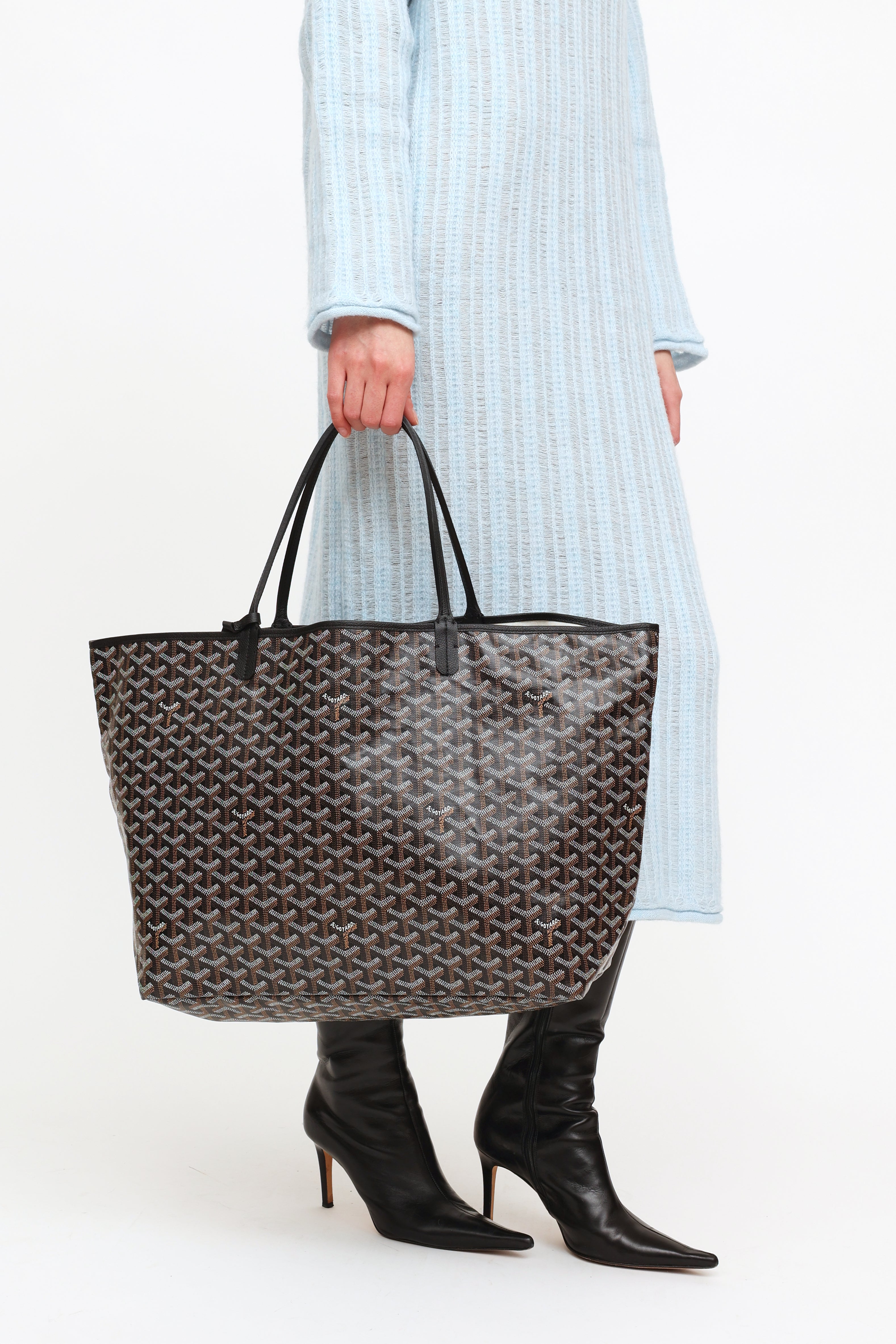 Pre-owned Goyard Noir Saint Louis GM tote bag featuring signature black Goyardine logo coated canvas, Chevroches Calfskin leather trim, linen and cotton interior, palladium hardware, dual leather handles, and tonal stitching. Detachable pouch with button closure, Goyardine canvas, black leather trim, and two slip pockets.