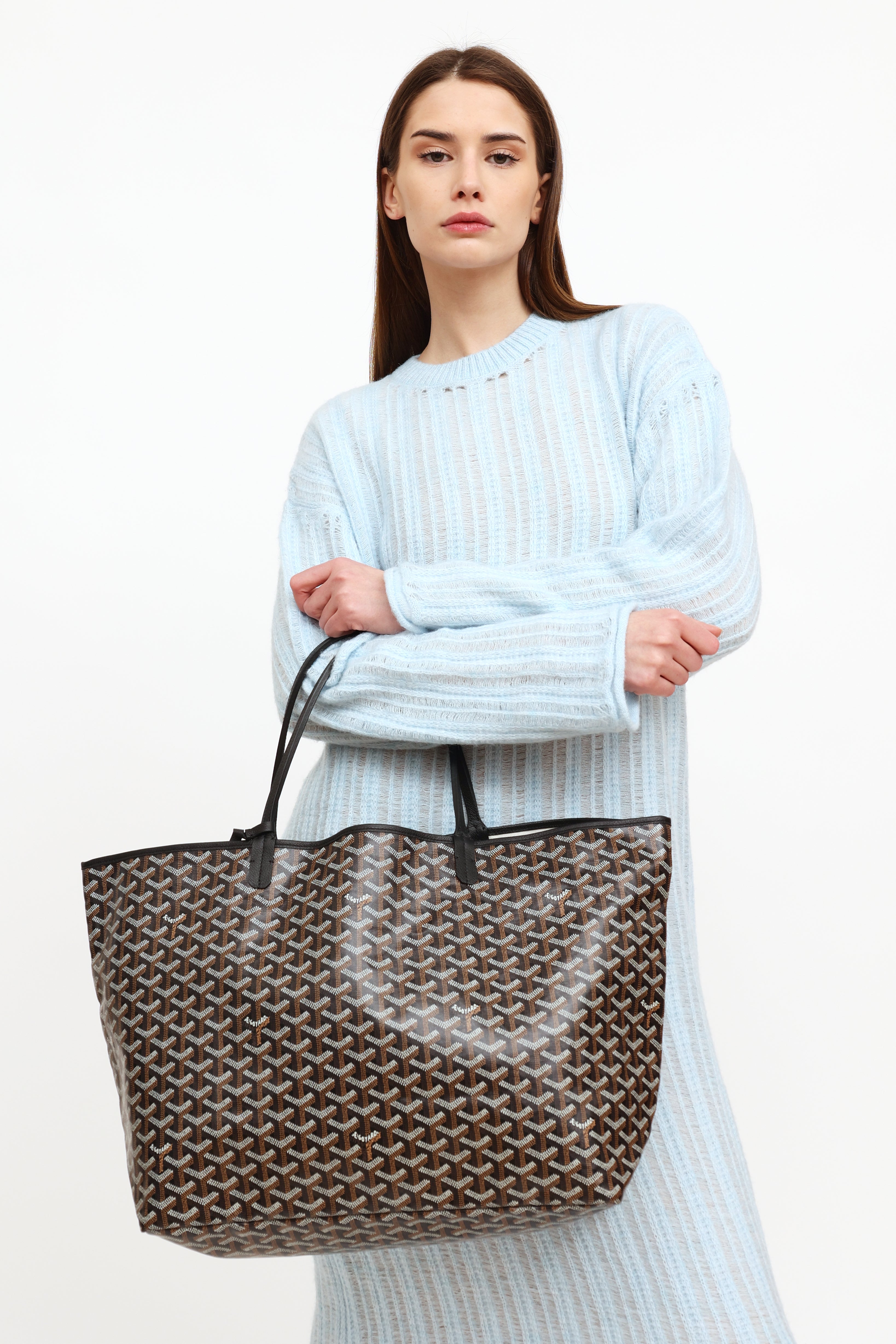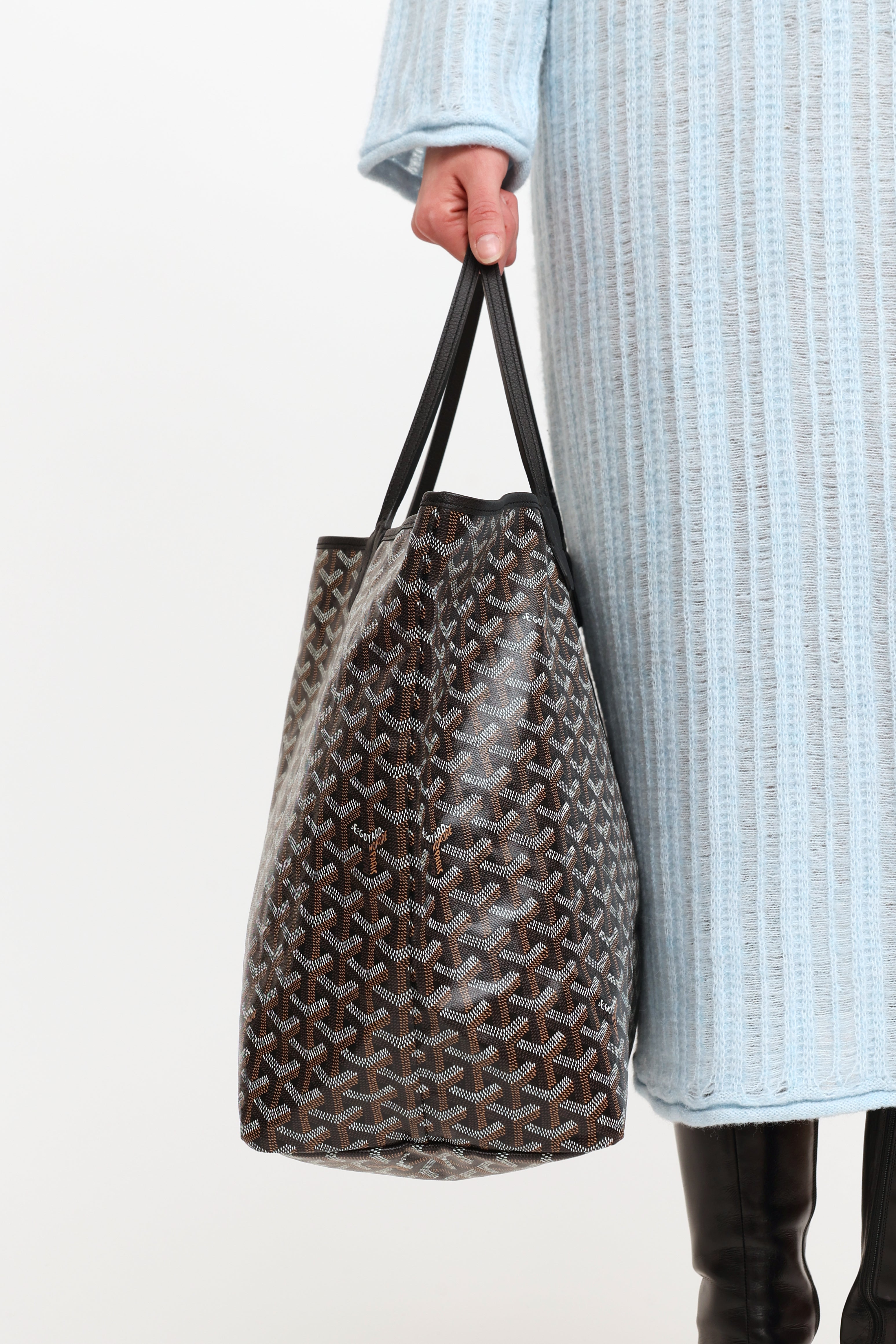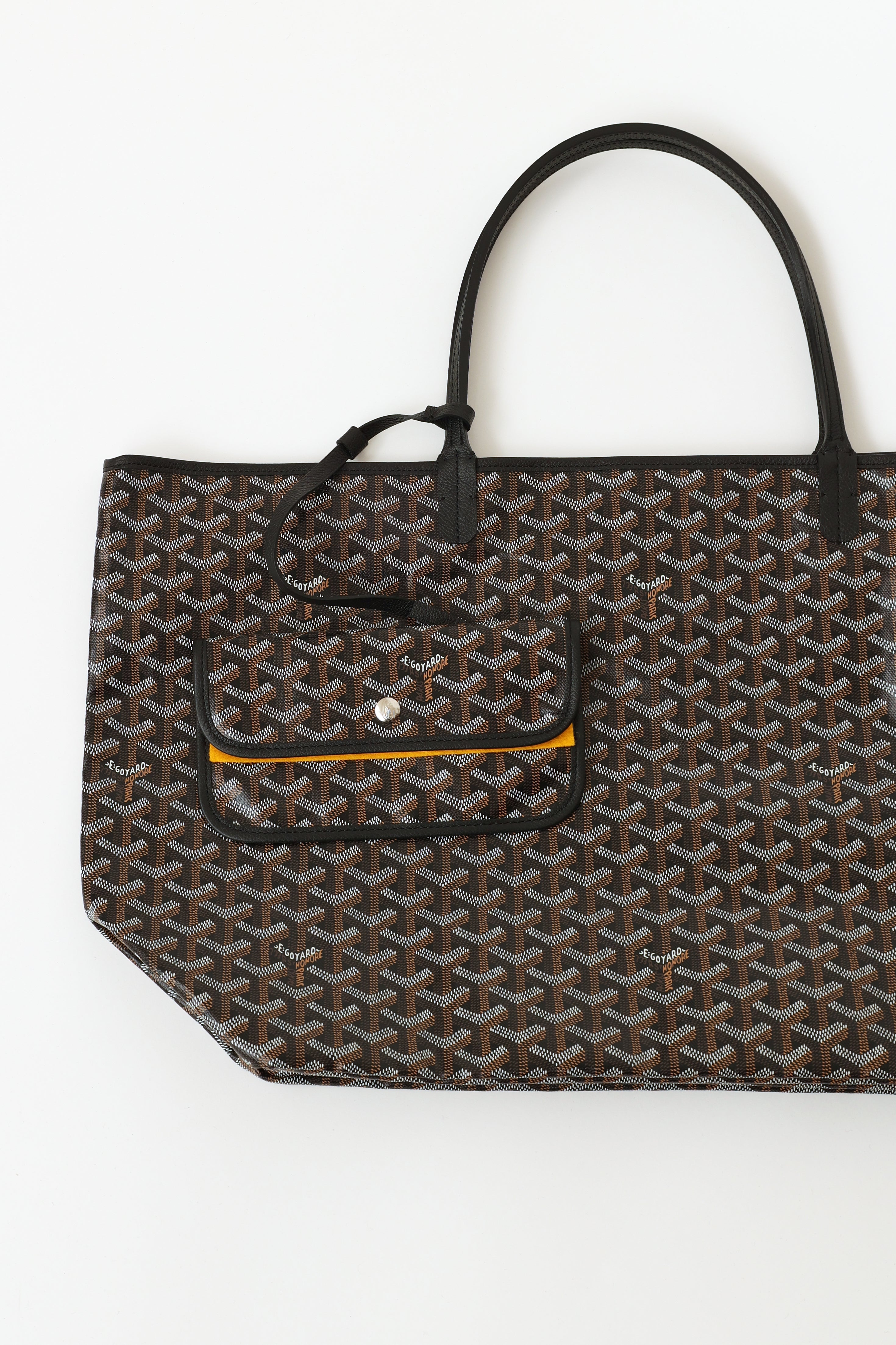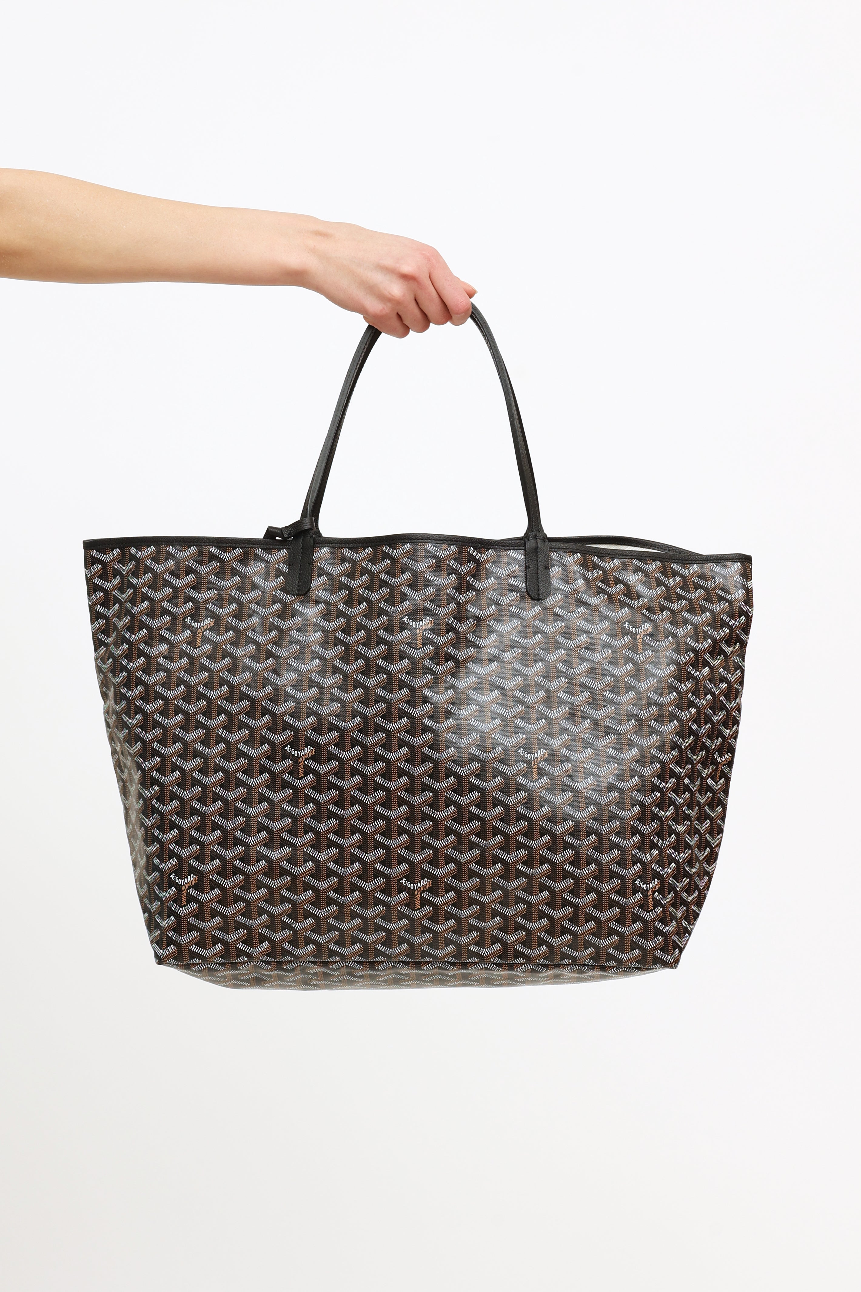 Pre-owned Goyard Noir Saint Louis GM tote bag featuring signature black Goyardine logo coated canvas, Chevroches Calfskin leather trim, linen and cotton interior, palladium hardware, dual leather handles, and tonal stitching. Detachable pouch with button closure, Goyardine canvas, black leather trim, and two slip pockets.
