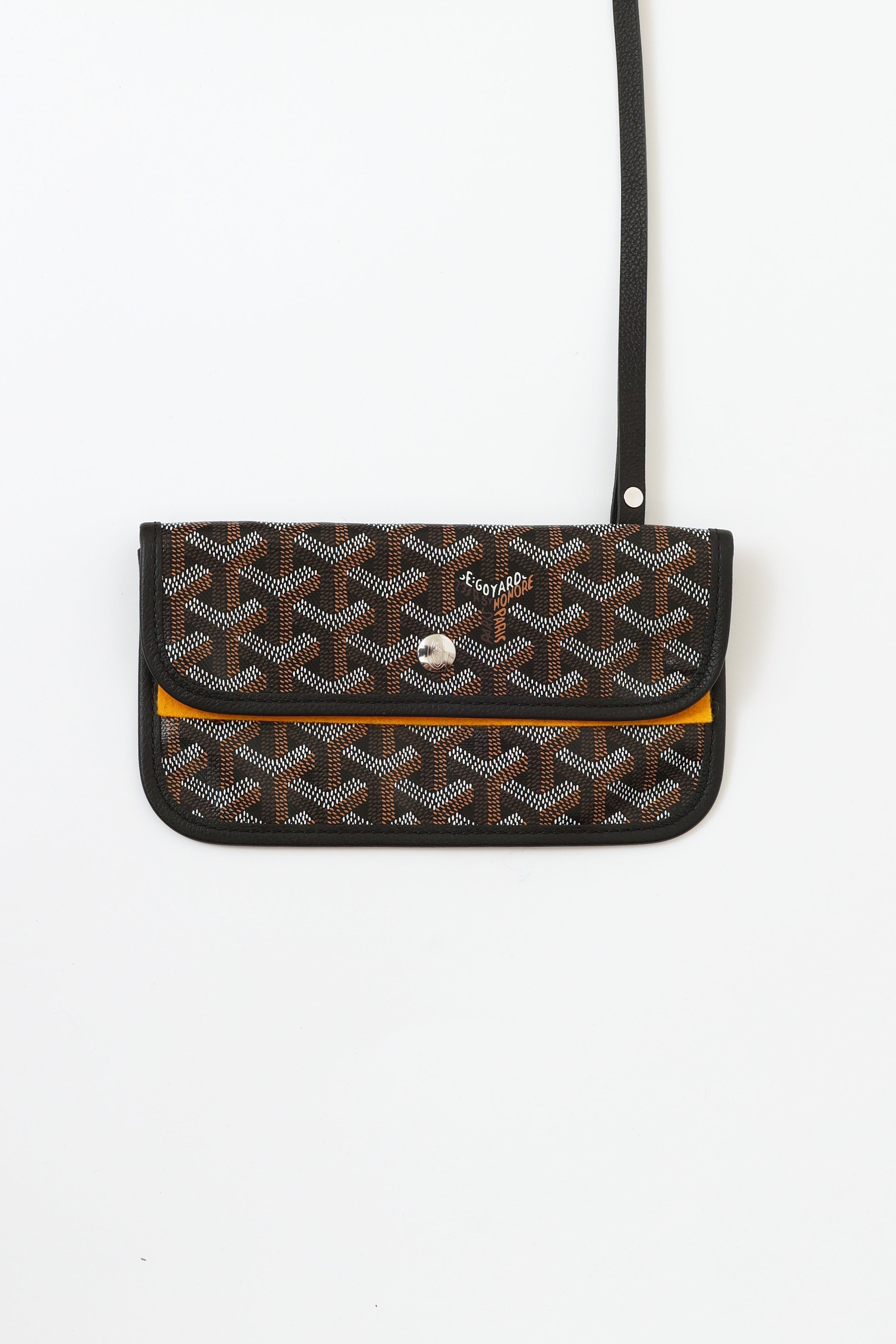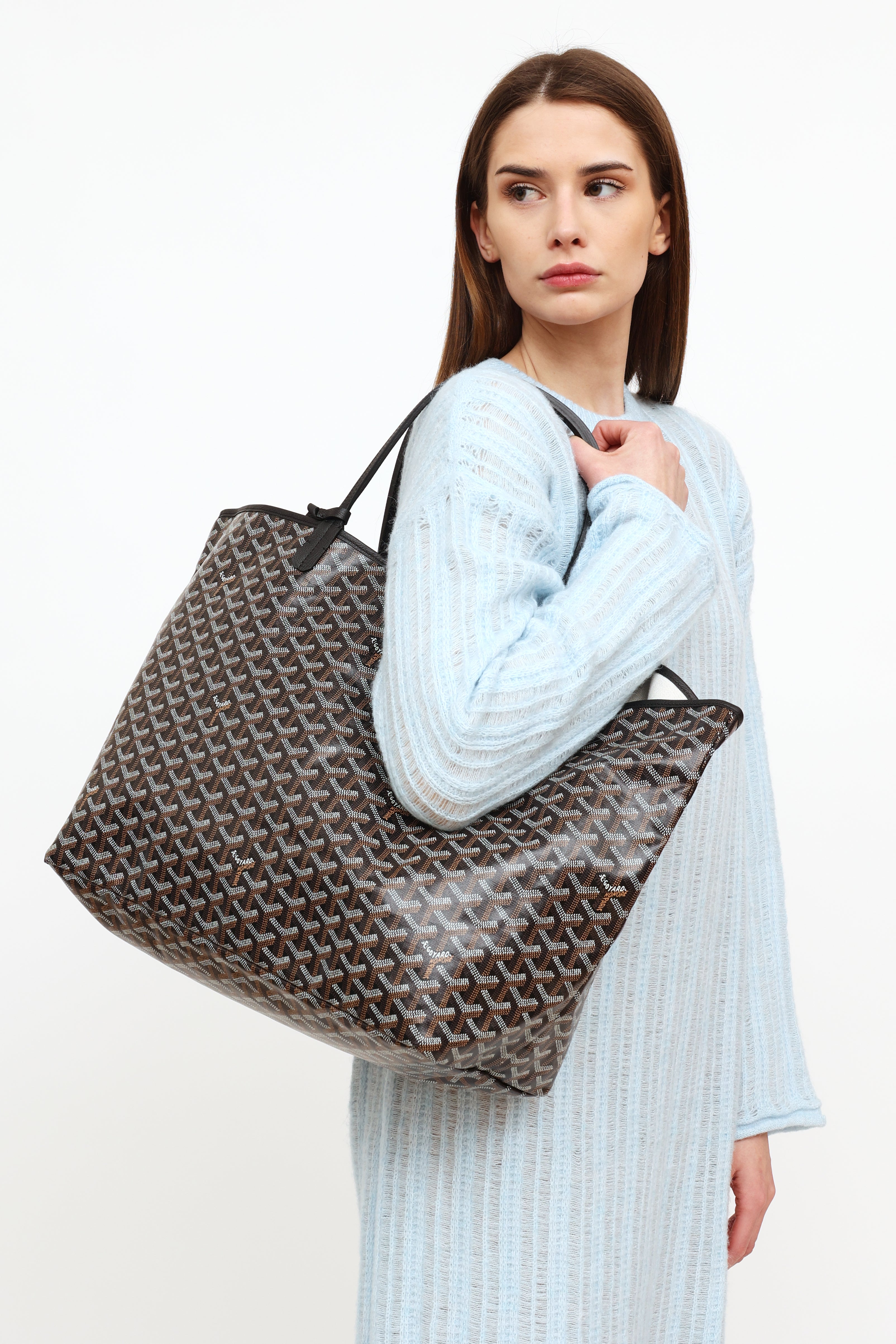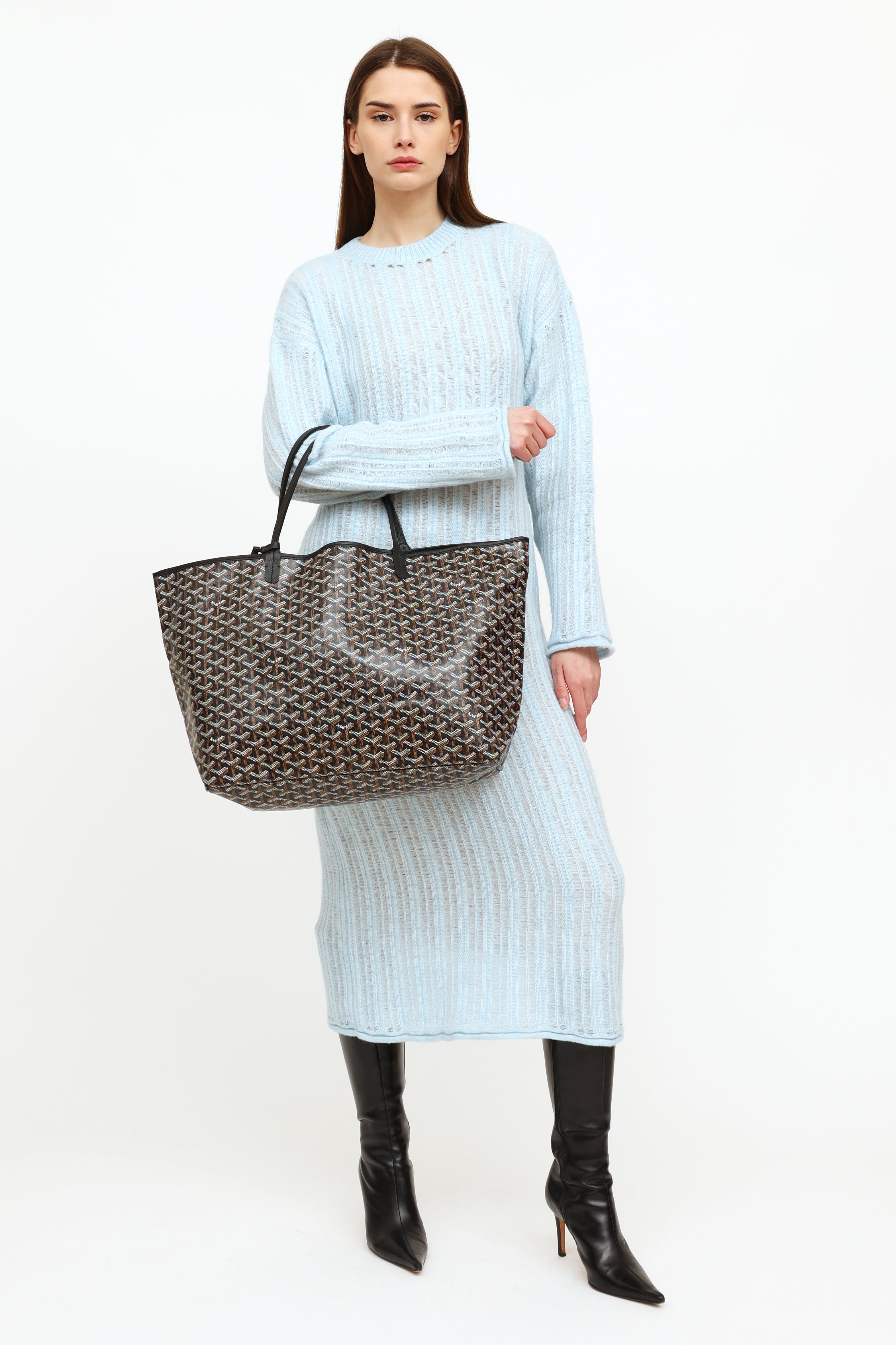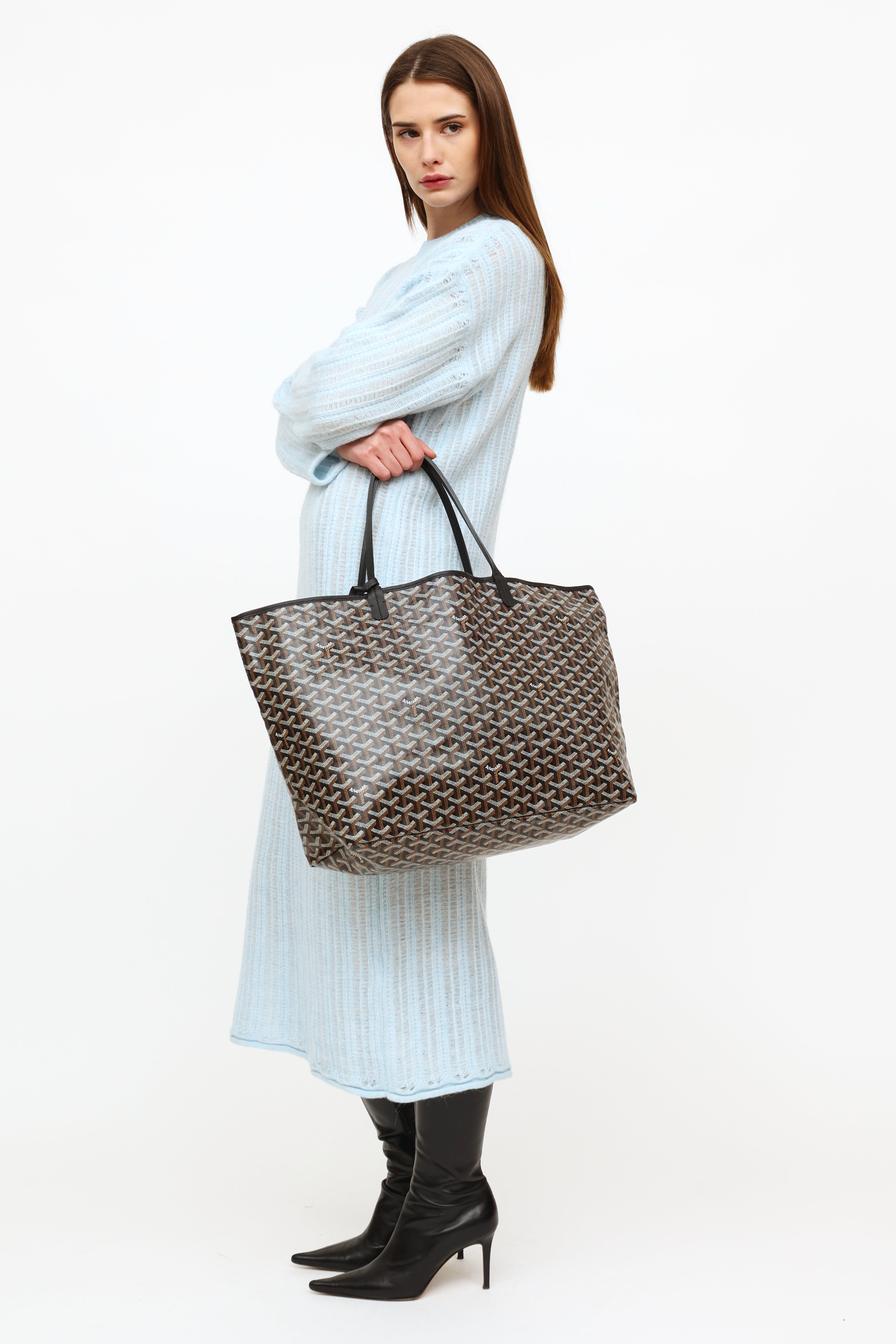 Pre-owned Goyard Noir Saint Louis GM tote bag featuring signature black Goyardine logo coated canvas, Chevroches Calfskin leather trim, linen and cotton interior, palladium hardware, dual leather handles, and tonal stitching. Detachable pouch with button closure, Goyardine canvas, black leather trim, and two slip pockets.