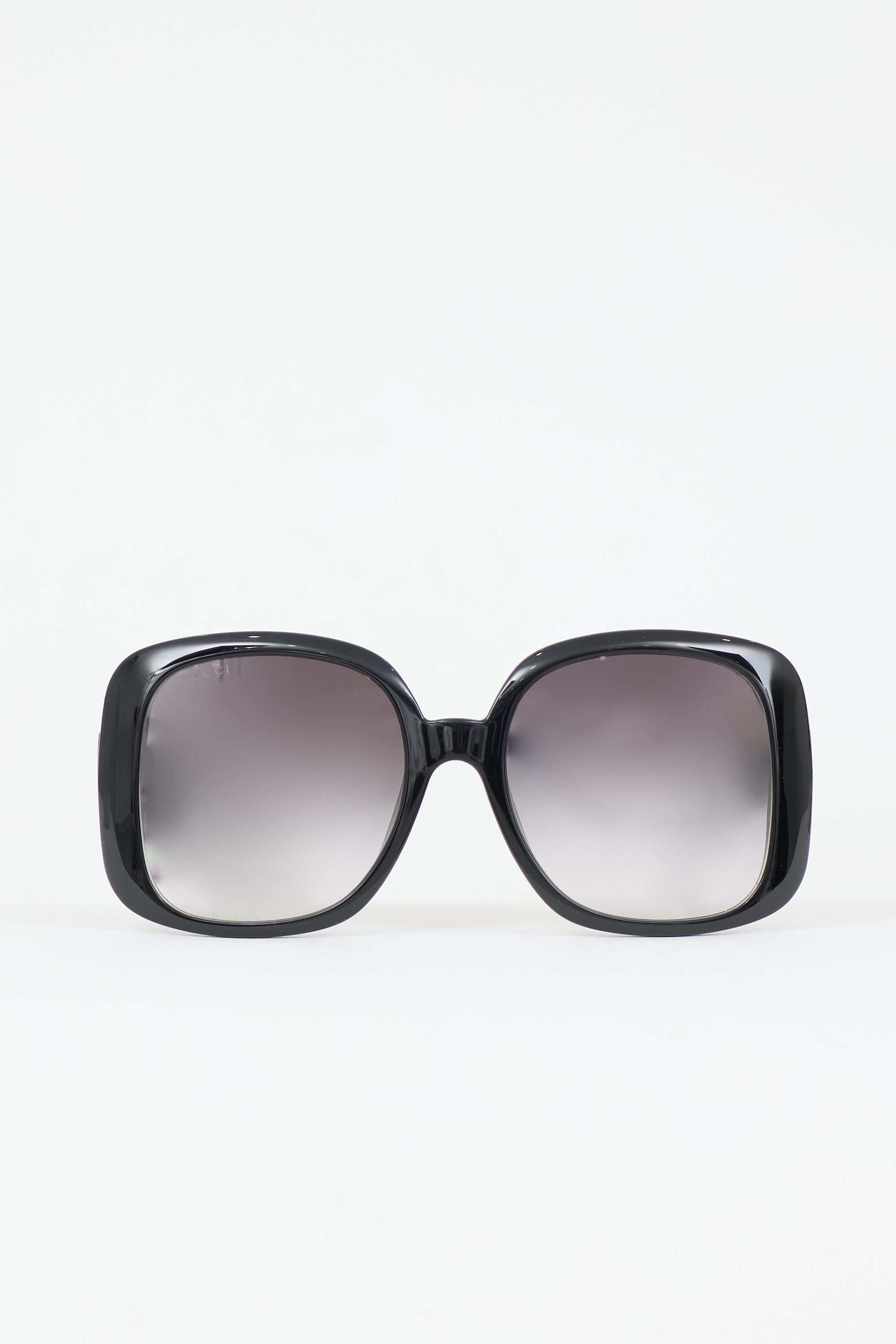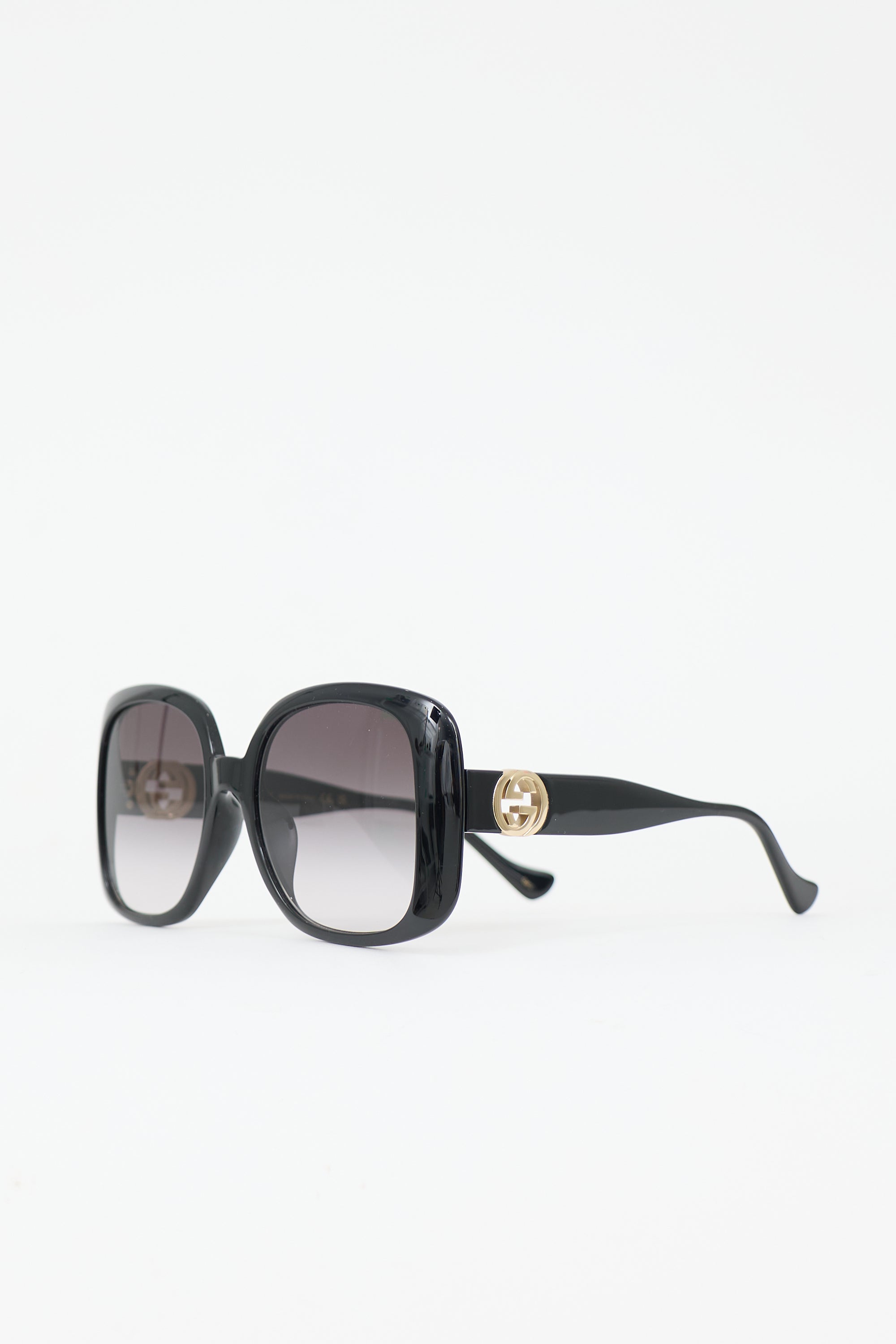 Pre-owned Gucci black GG1029SA sunglasses featuring gradient lens, oversized square frame, and gold tone GG logo at temple. Includes original case.