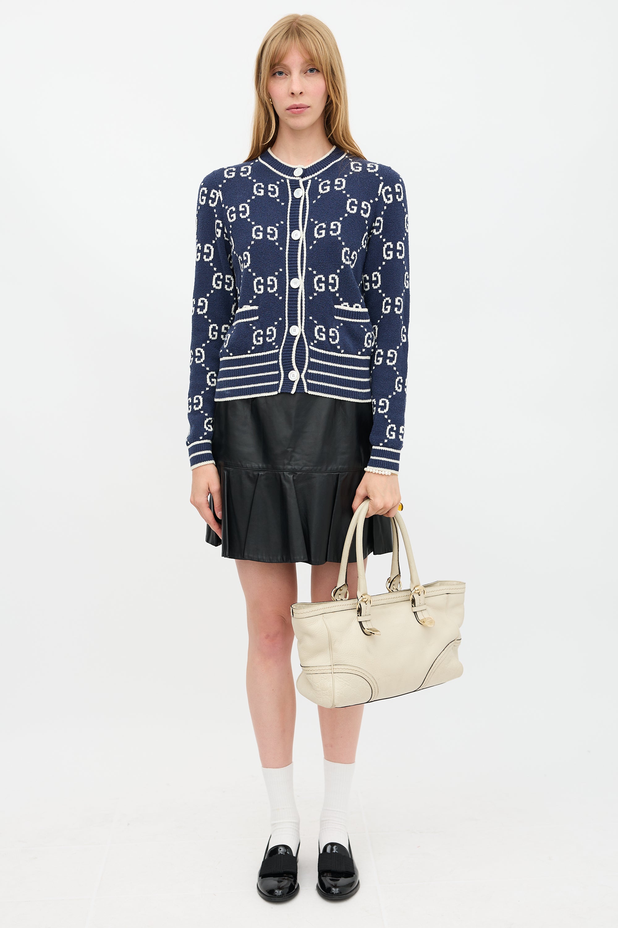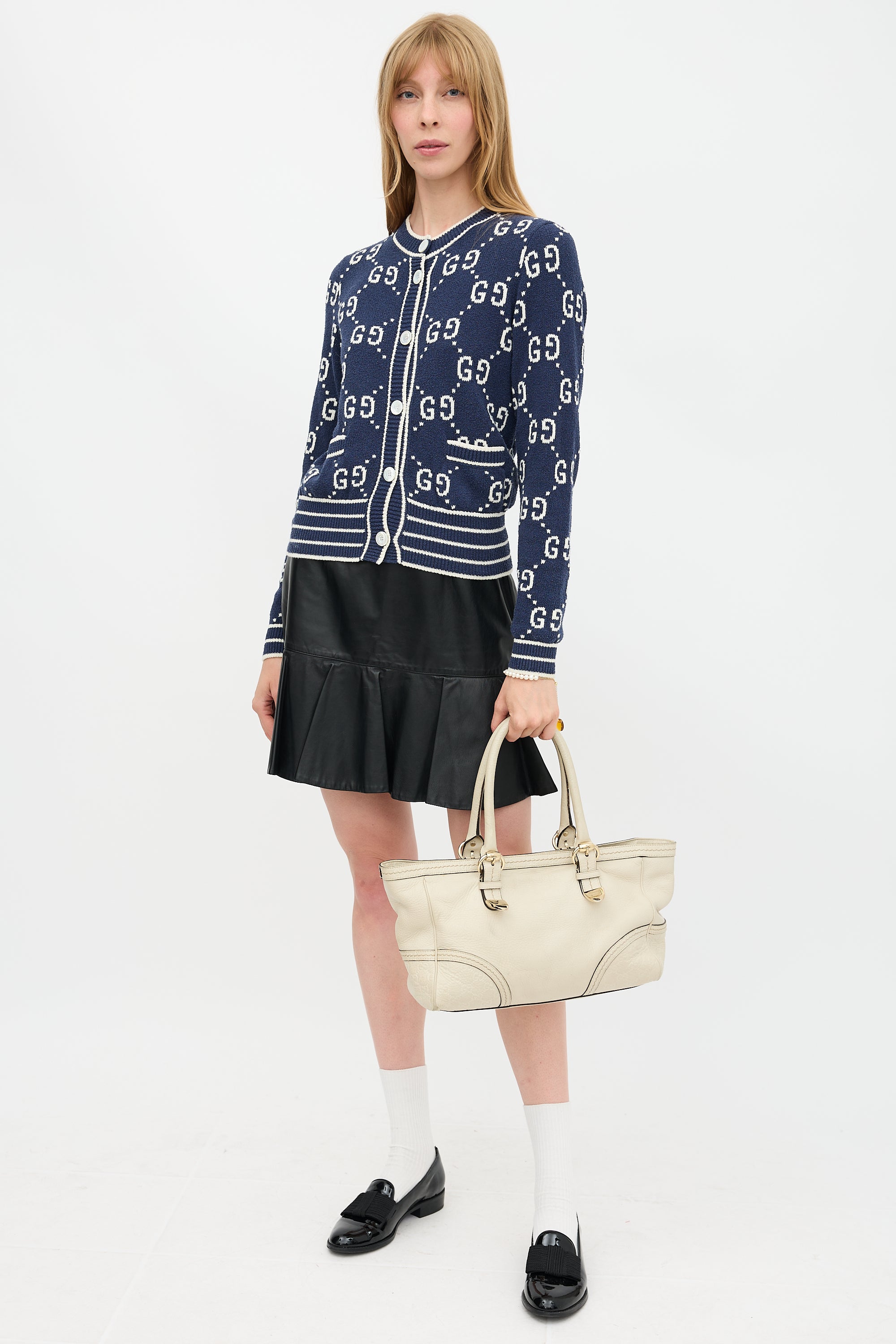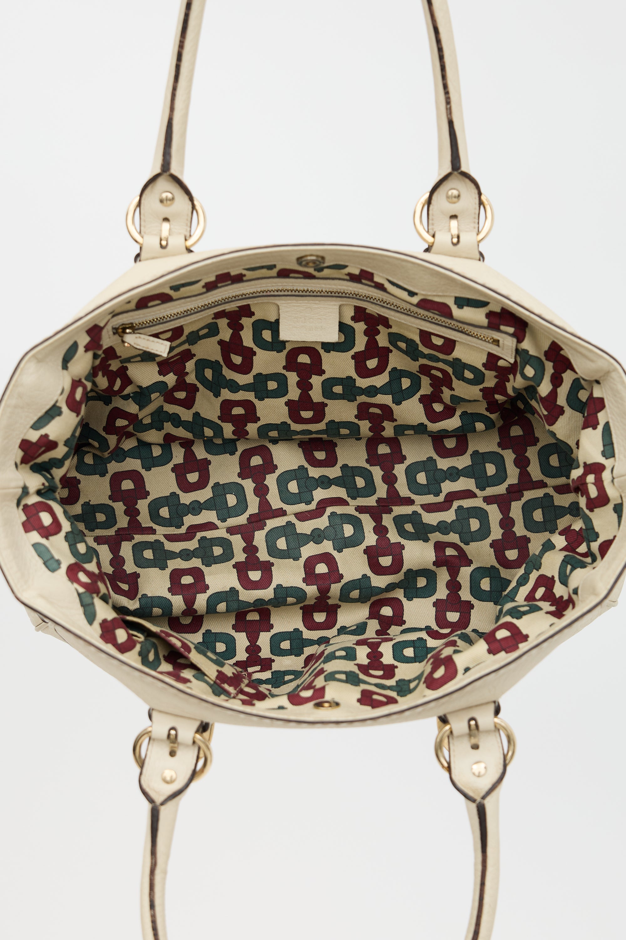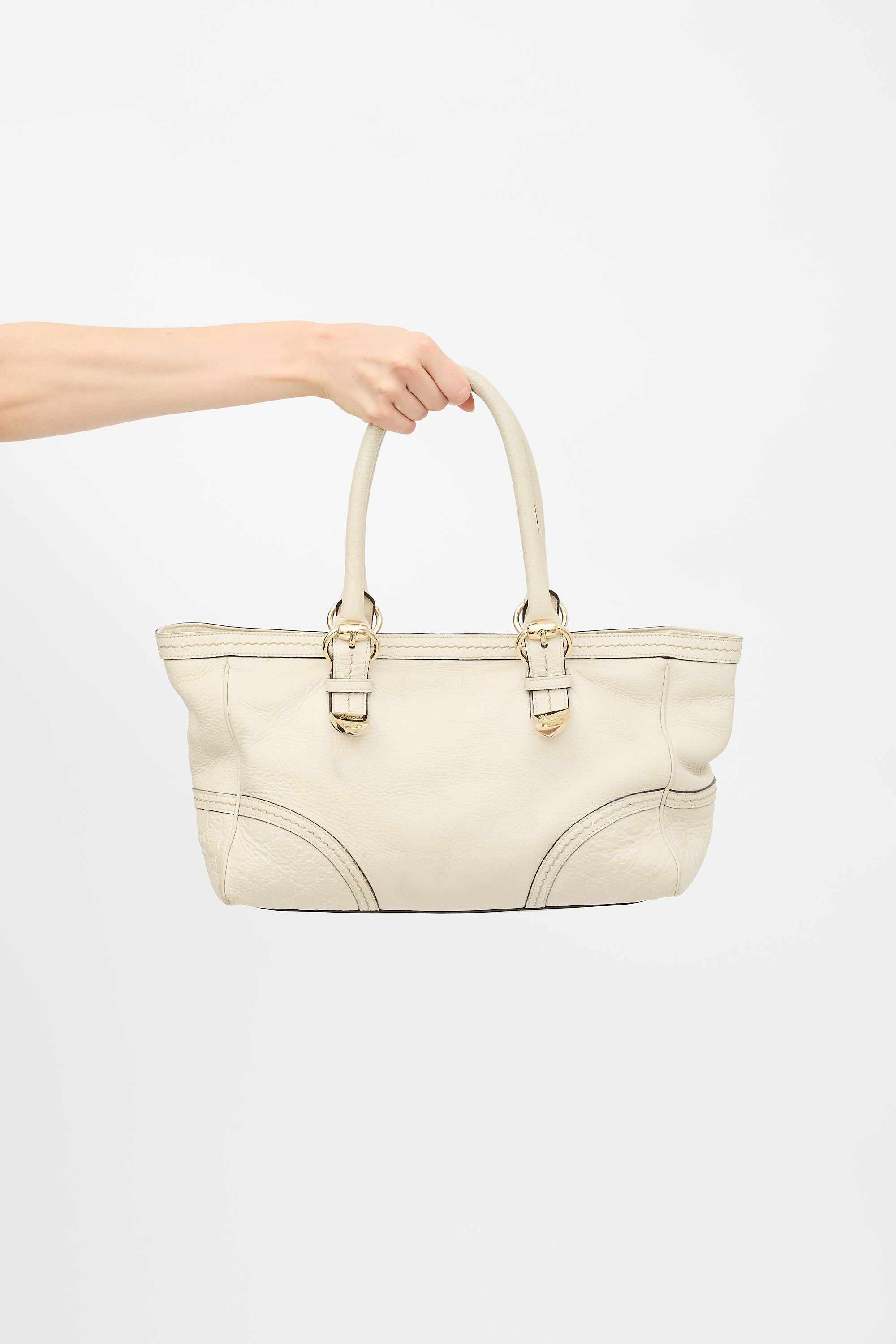 Pre-owned Gucci cream leather Signoria bag featuring dual rolled top handles, gold tone hardware, debossed logo buckles at face, debossed Guccissima monogram at corners and collar, five protective feet, snap button top closure, one main compartment, one interior zip pocket, and one interior phone pocket.