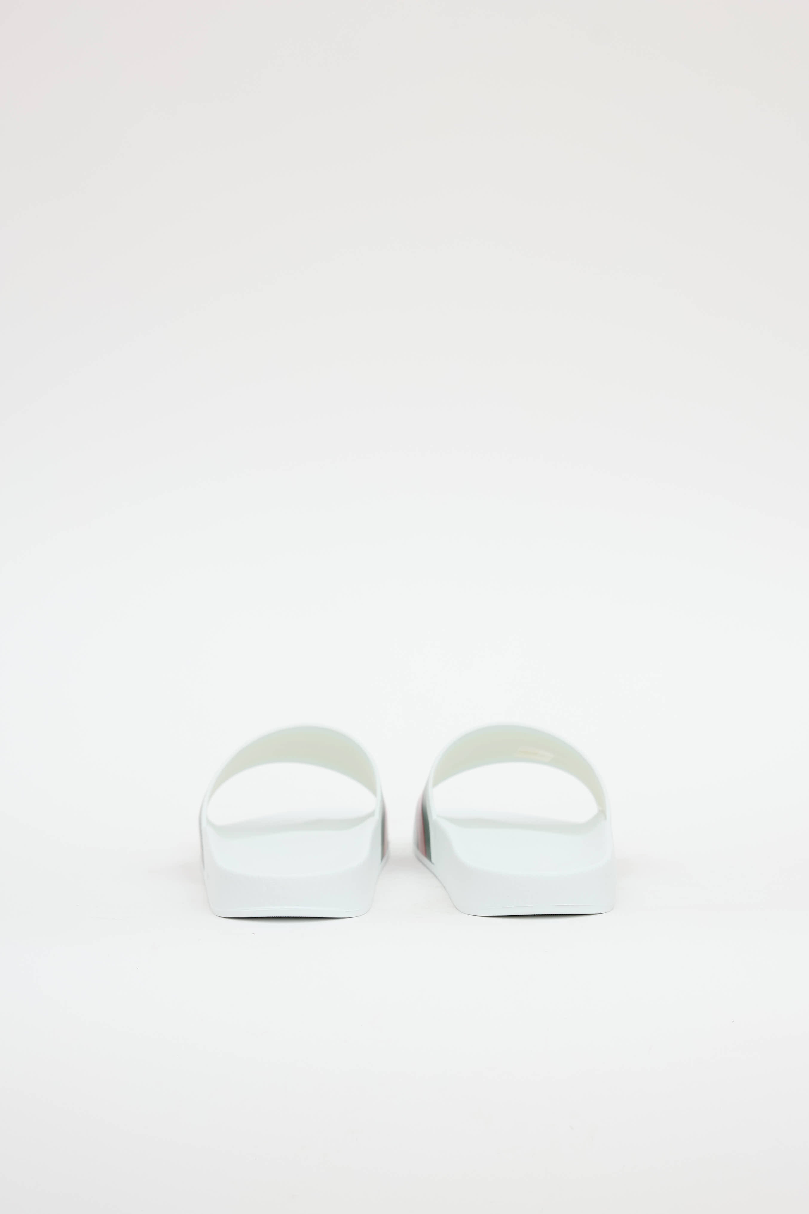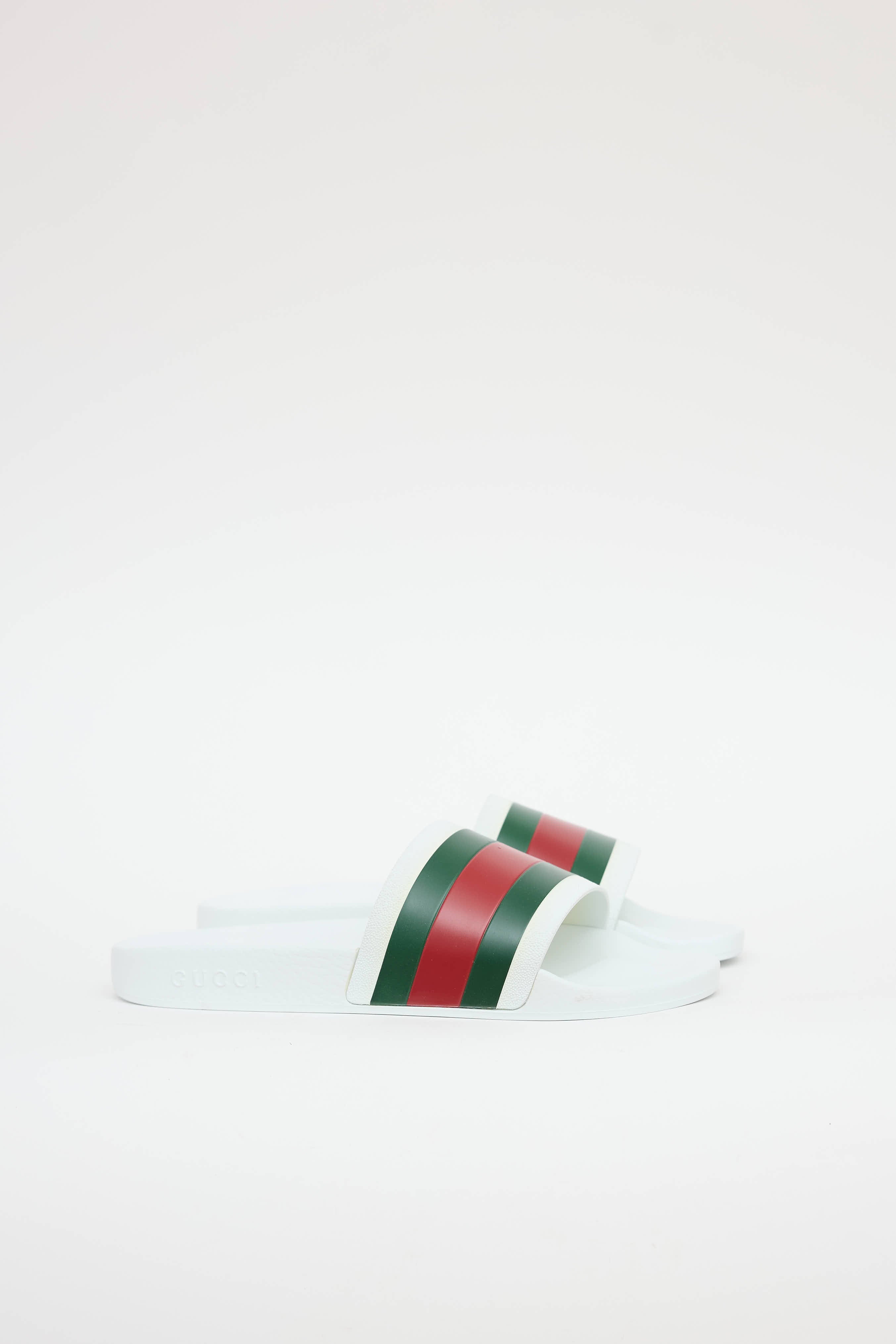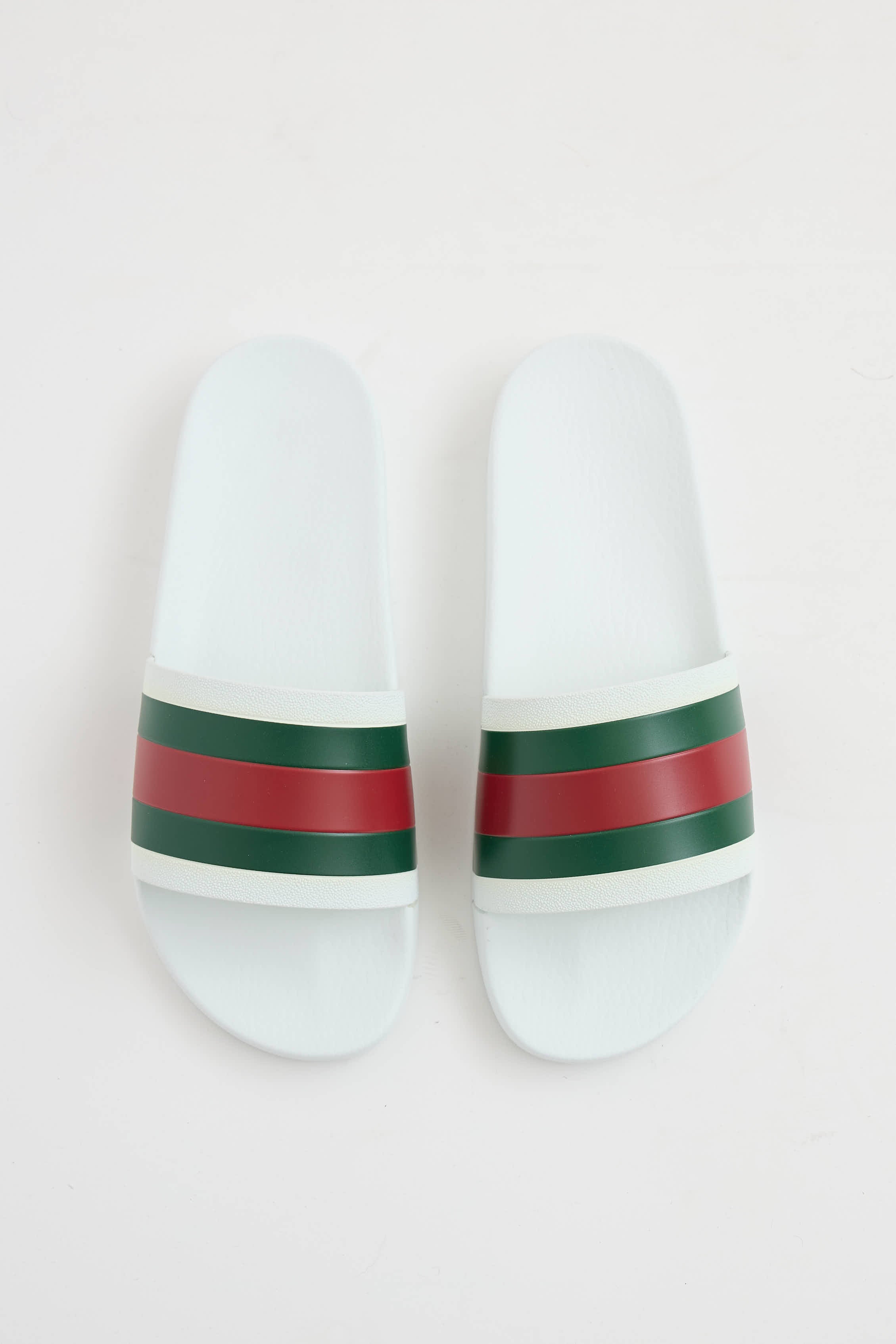 Pre-owned Gucci white and multicolor Pursit pool slides featuring open round toe, signature web stripe at vamp, and embossed logo at midsole.