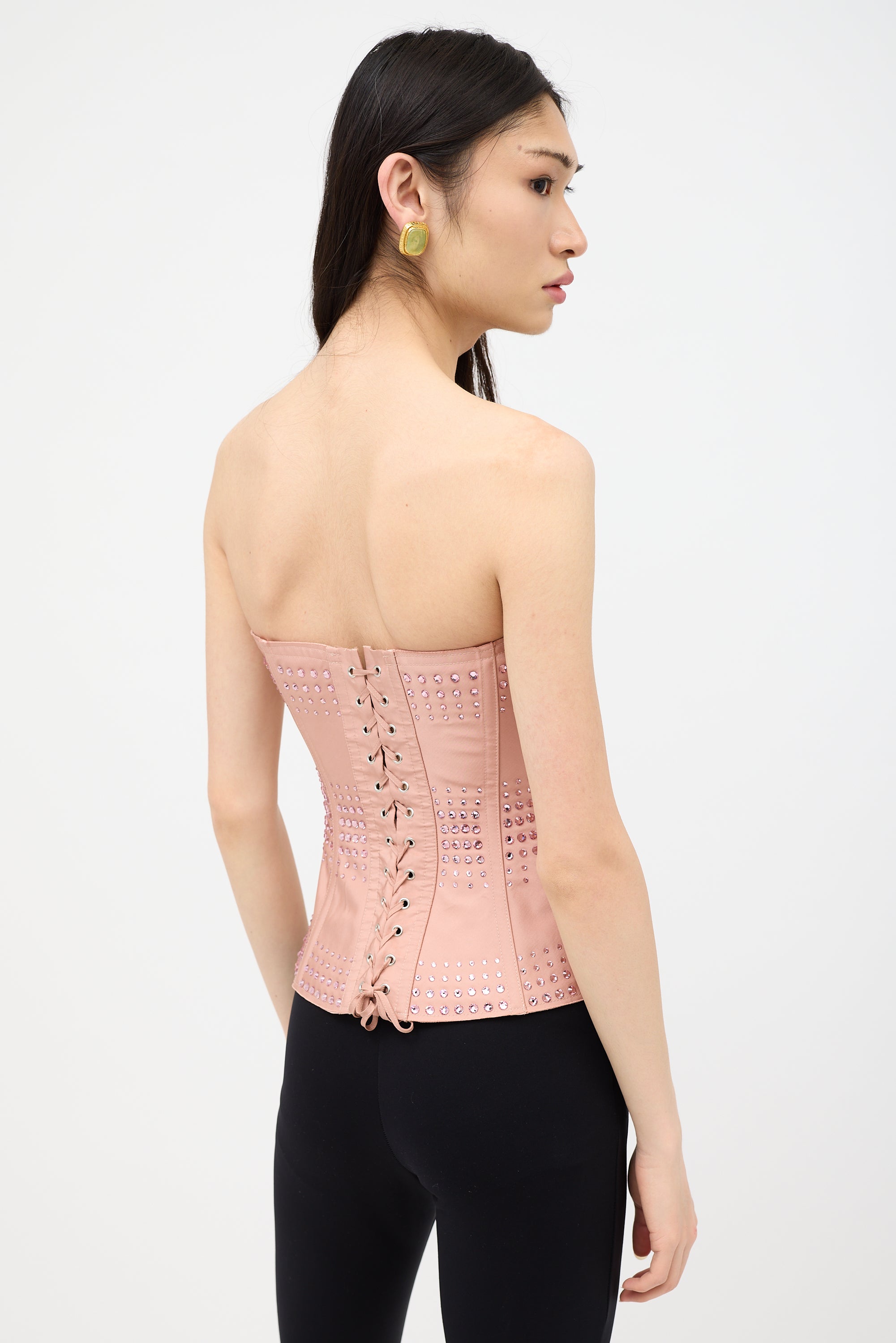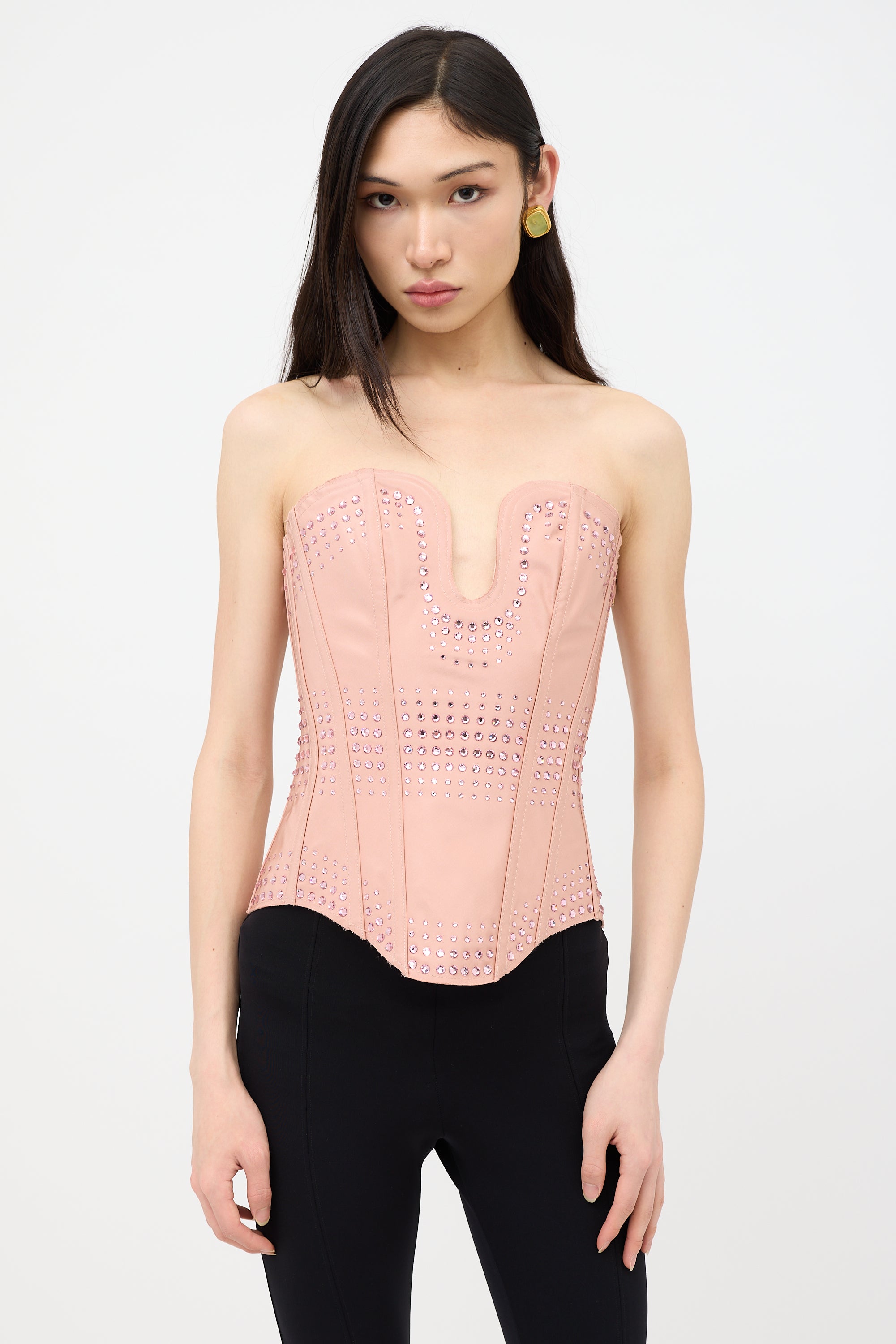 Gucci Resort 2022 pink silk corset top featuring a sweetheart neckline with plunging detail, raw edge trims, boned interior, tonal crystal embellishments throughout, side zip closure, and lace up closure at back. Alessandro Michele era design.
