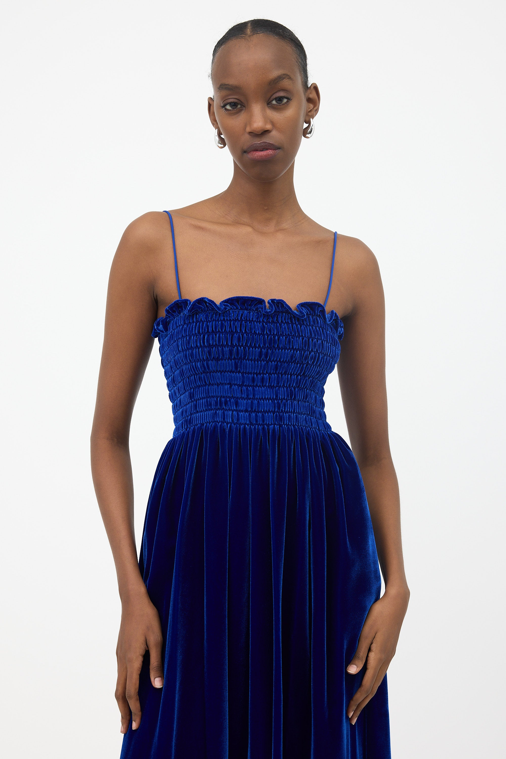 Pre-owned Gucci Resort 2023 blue velvet dress featuring a ruffled topline, rolled spaghetti straps, smocked bodice, and in seam pockets.