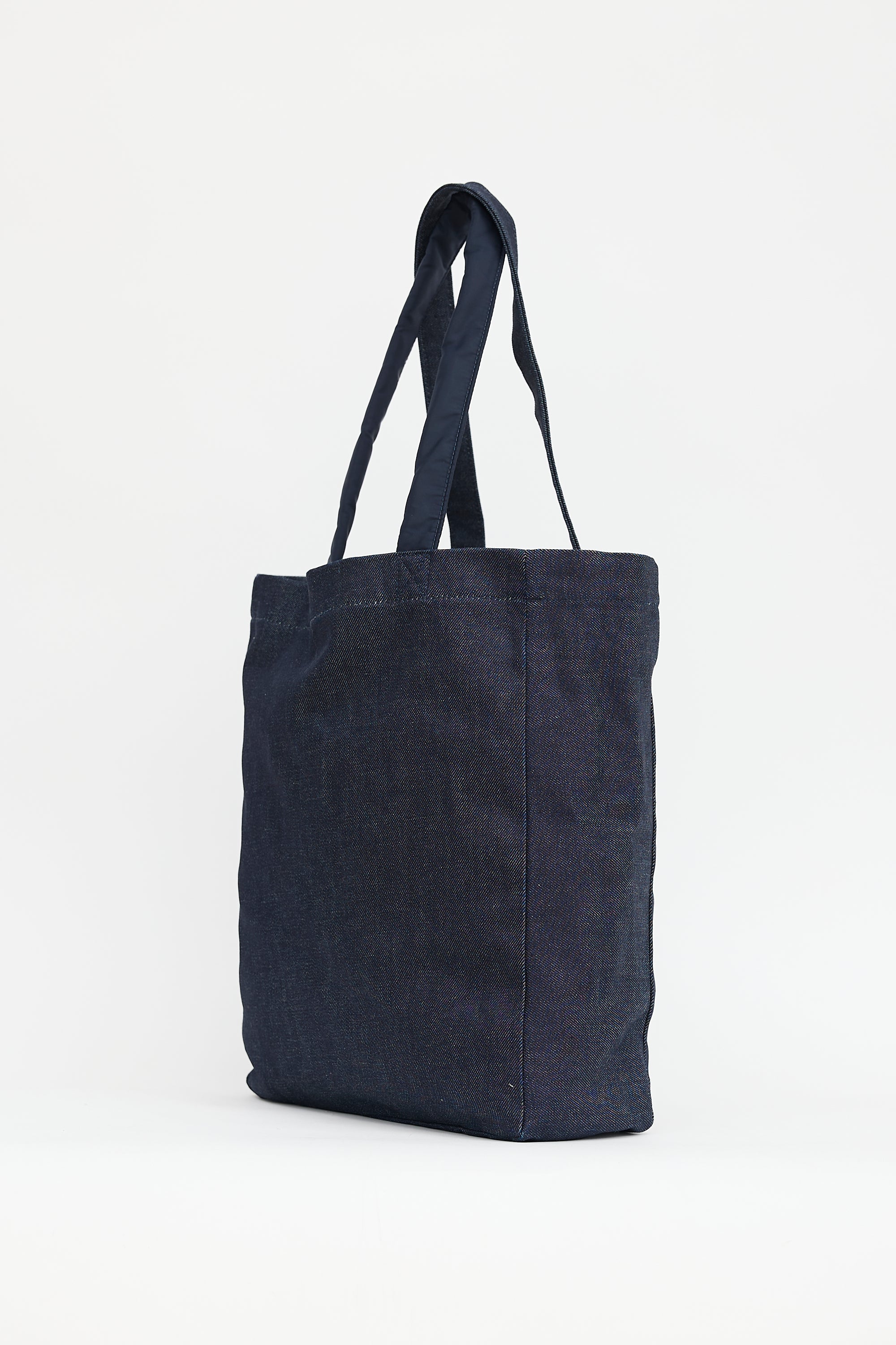 Pre-owned A.P.C. x Sacai dark wash denim tote bag featuring white printed logo at front, one padded top handle, one flat top handle, nylon interior with zip pocket, and one slip pocket.