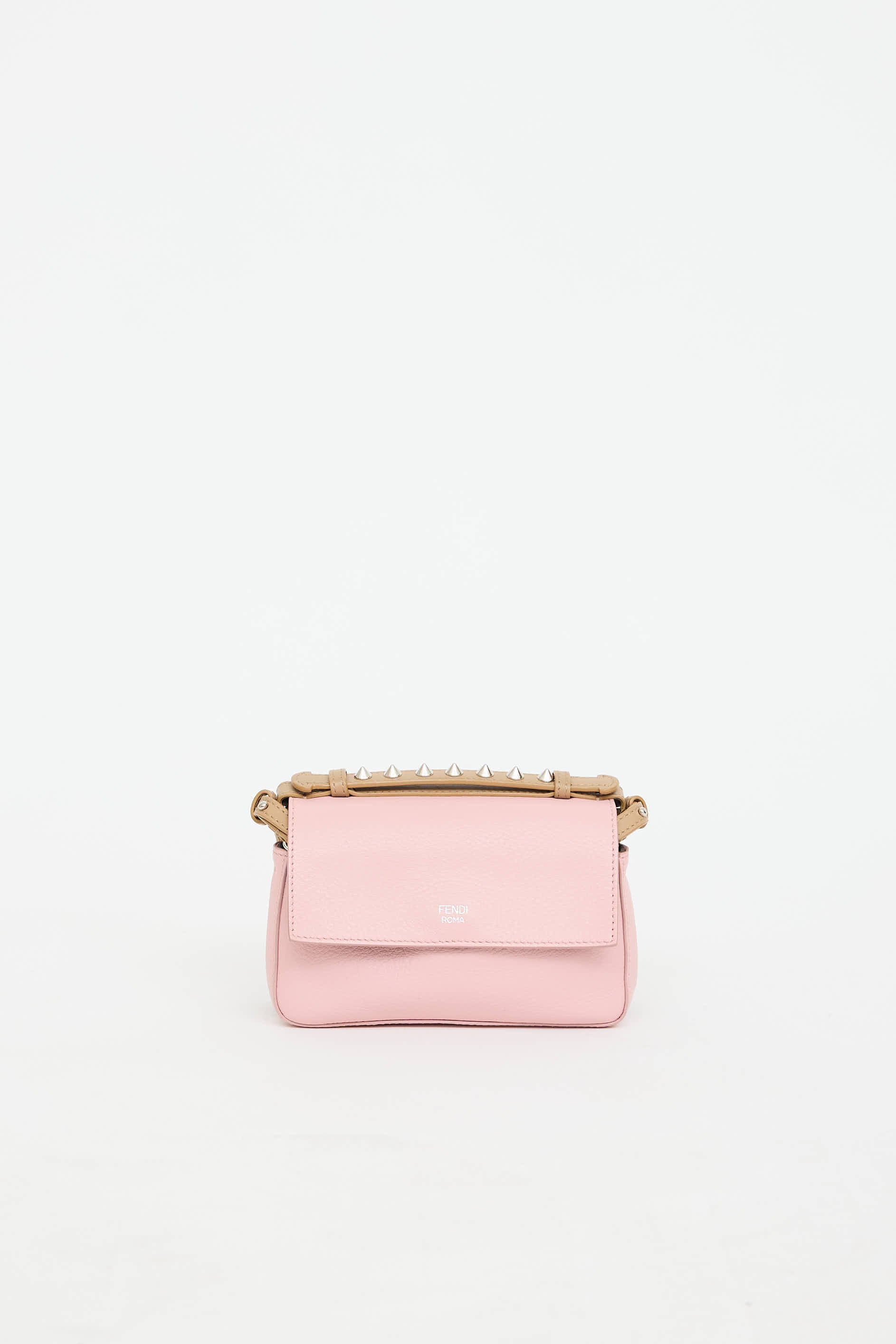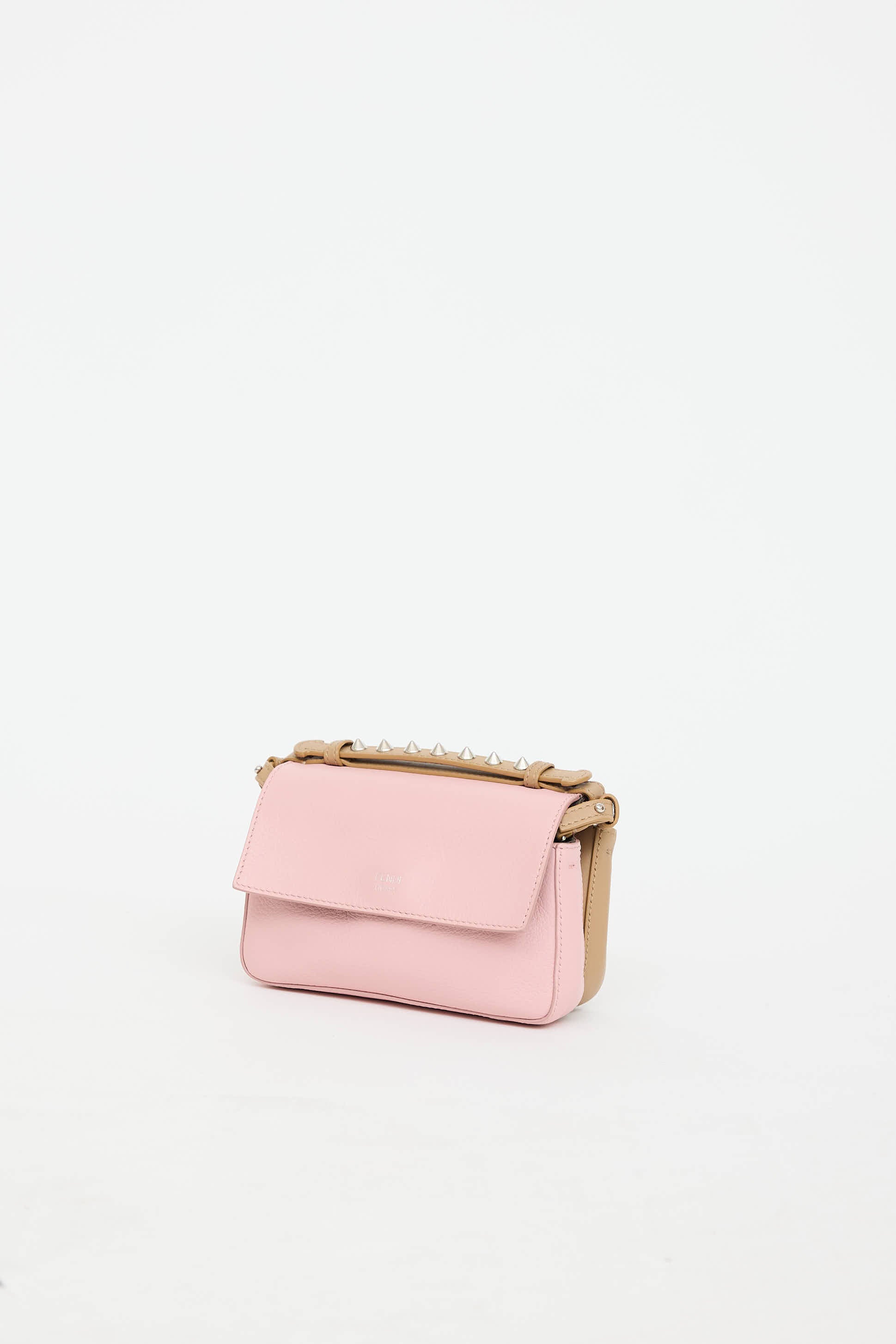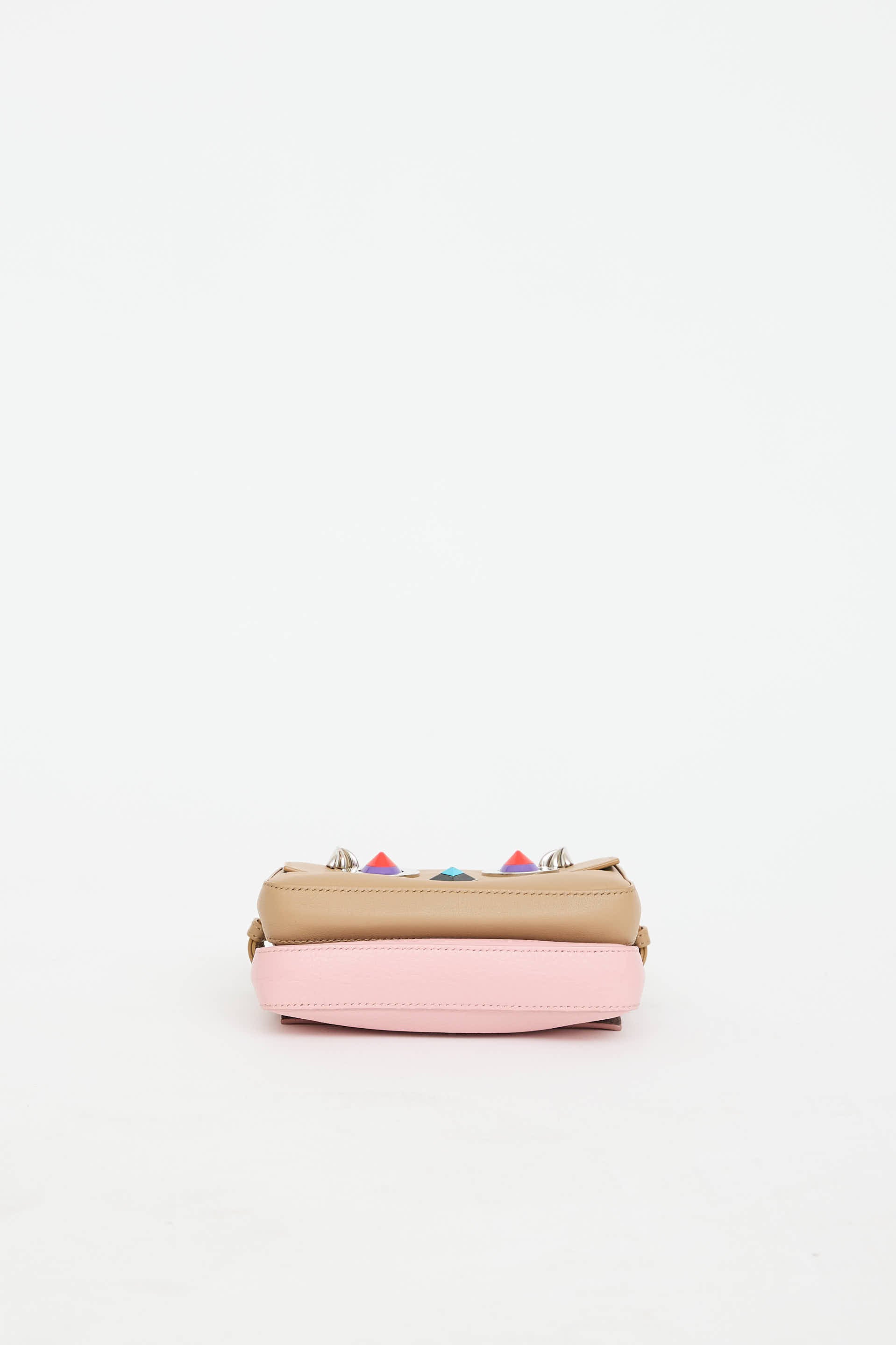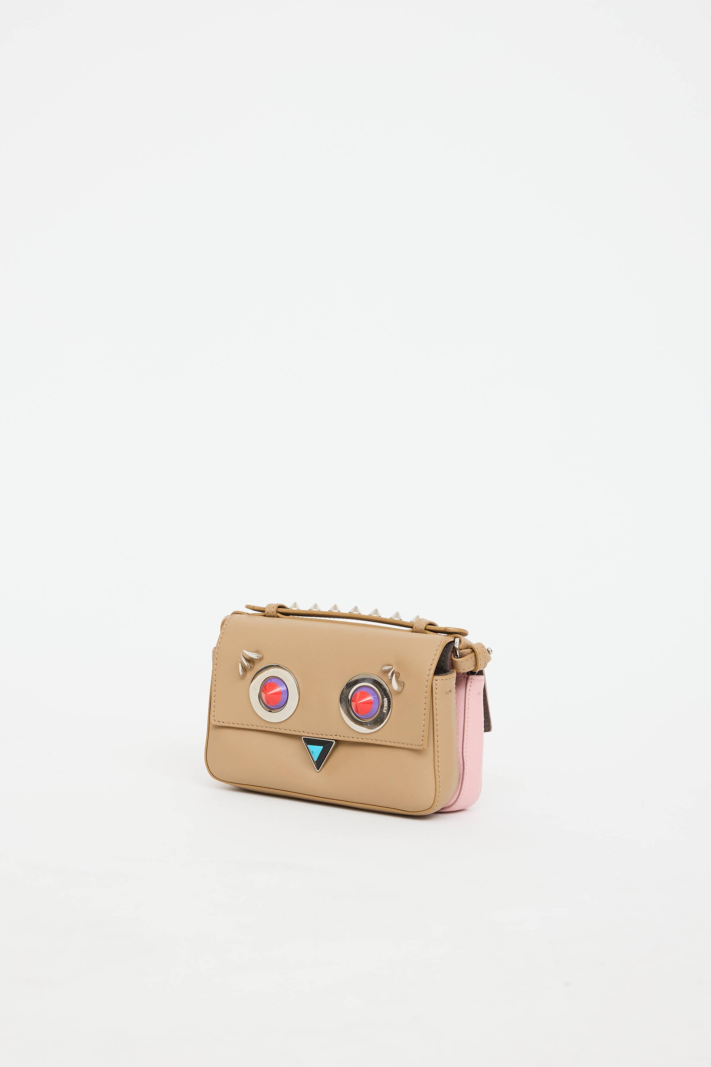 Pre-owned Fendi brown and pink Monster bag featuring smooth leather, monster face at front with logo, handle with studs, removable leather and chain strap, magnetic flap closure on front and back, front compartment has one slip pocket, back pocket has two card slots and lined in suede.