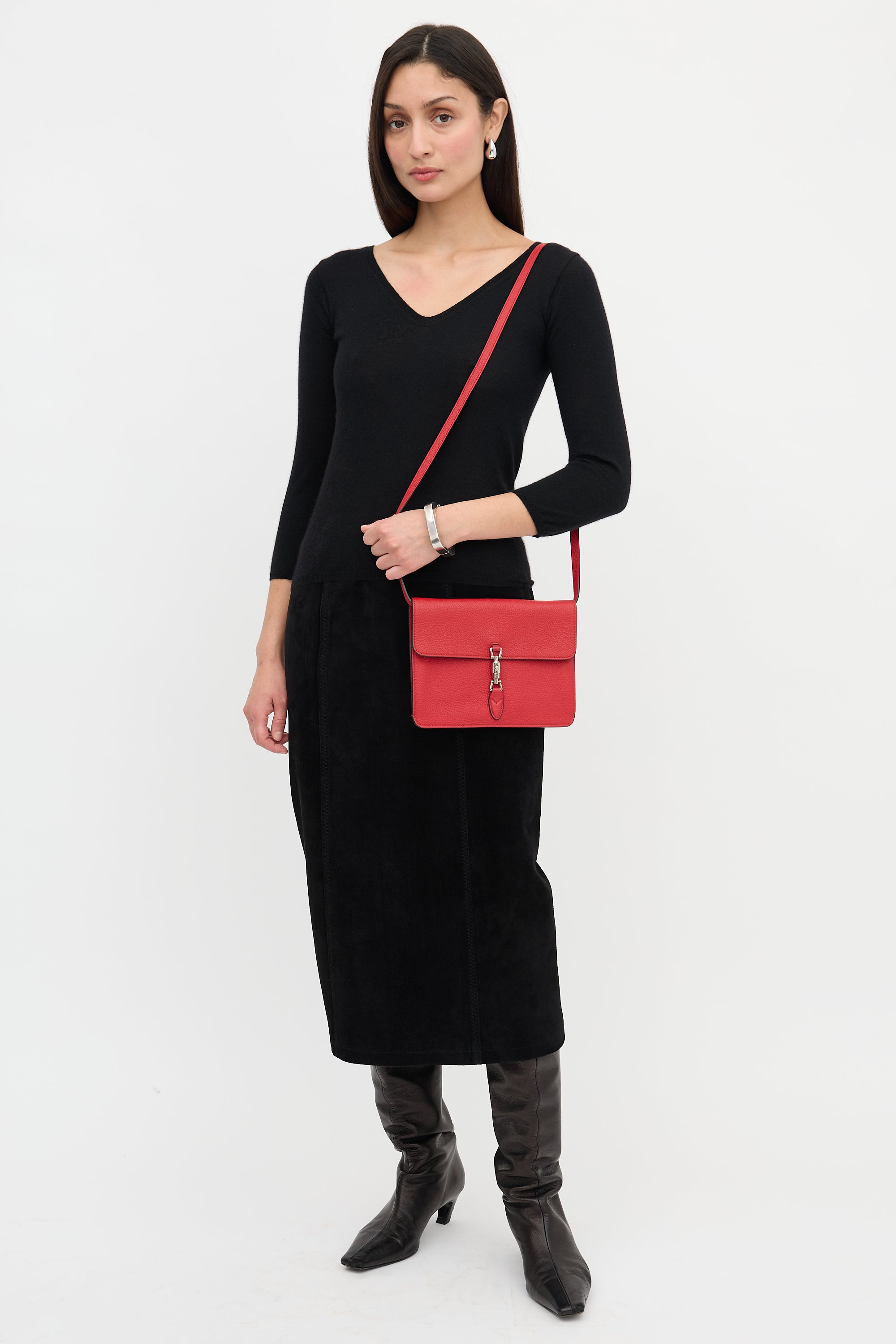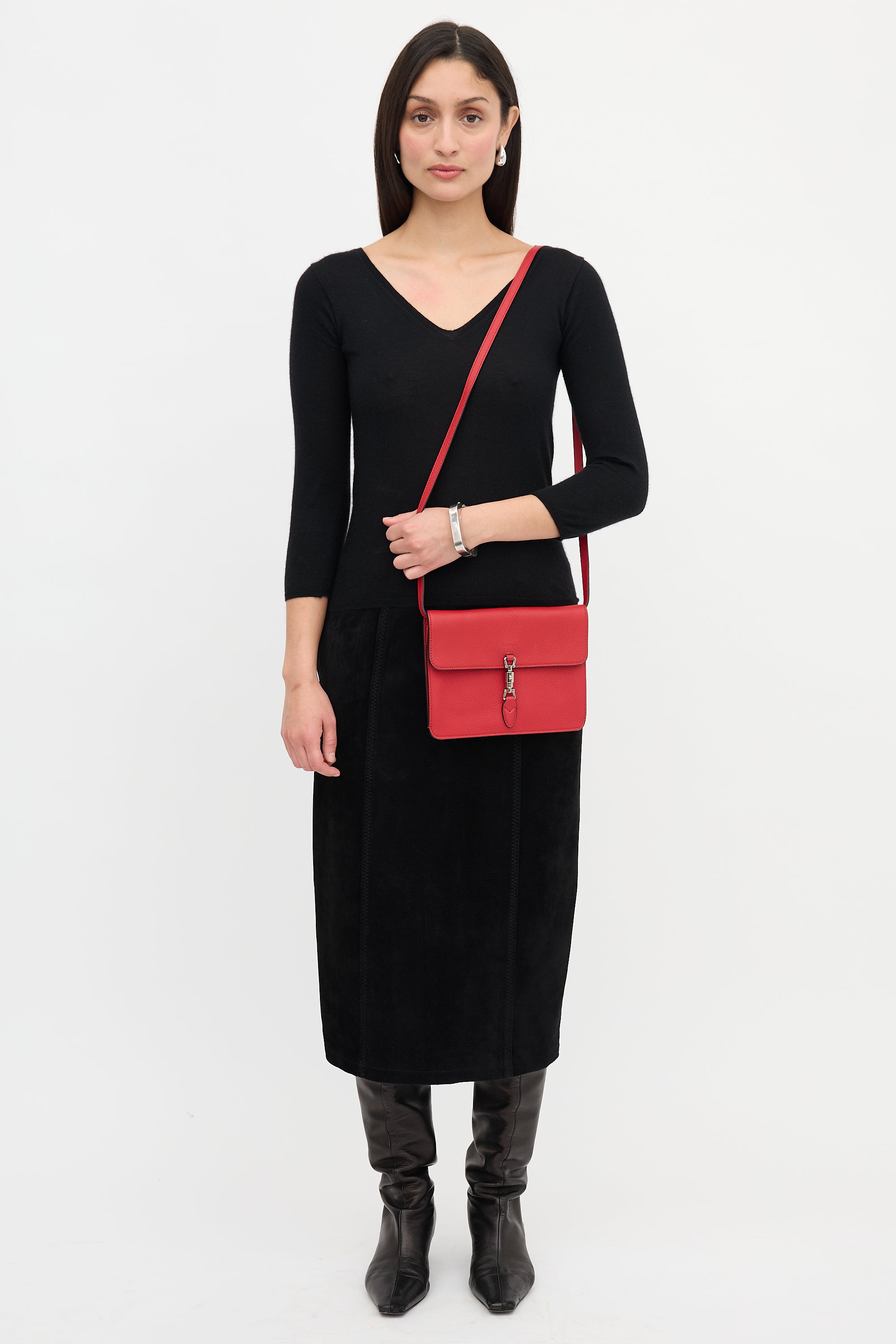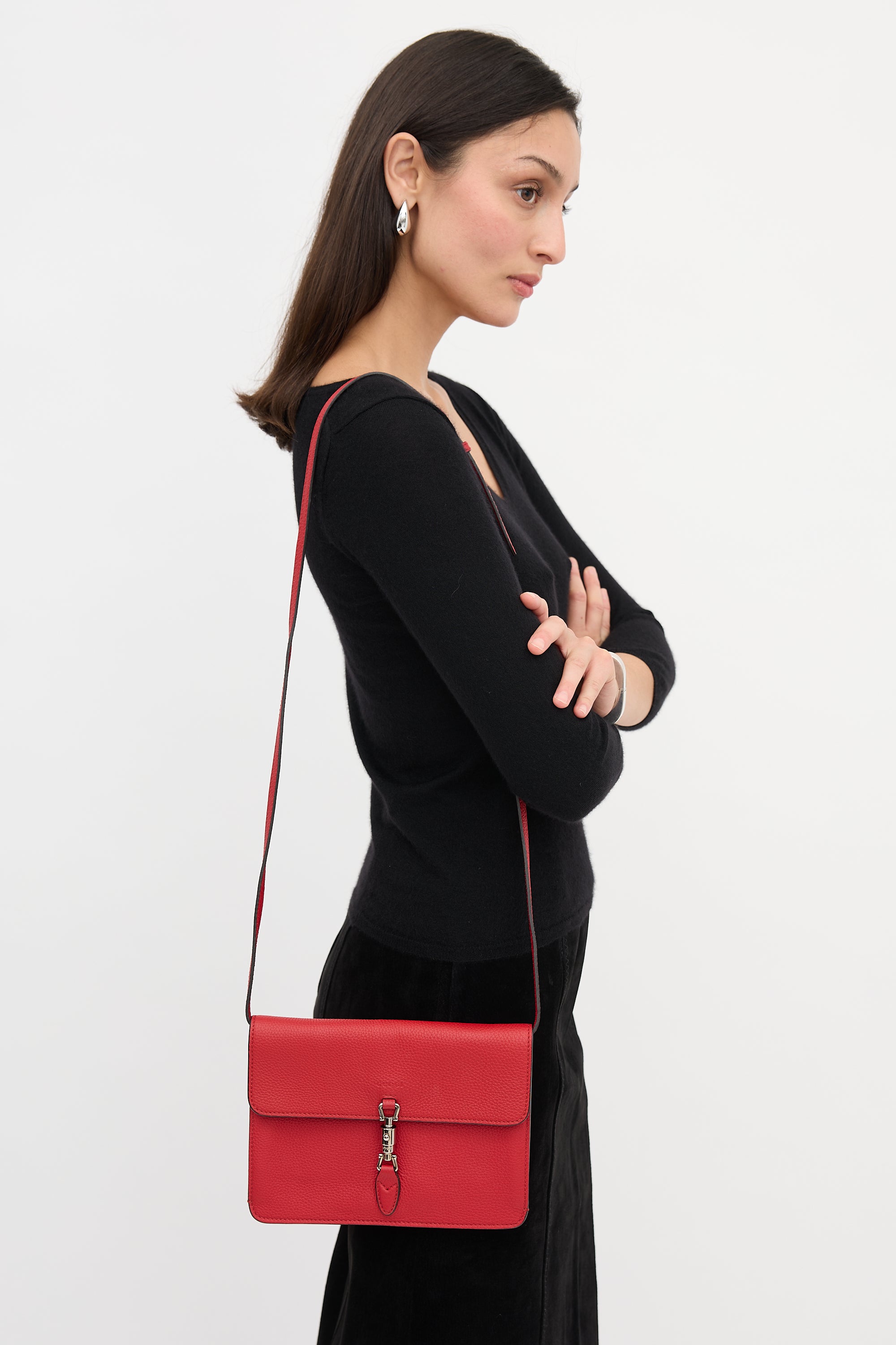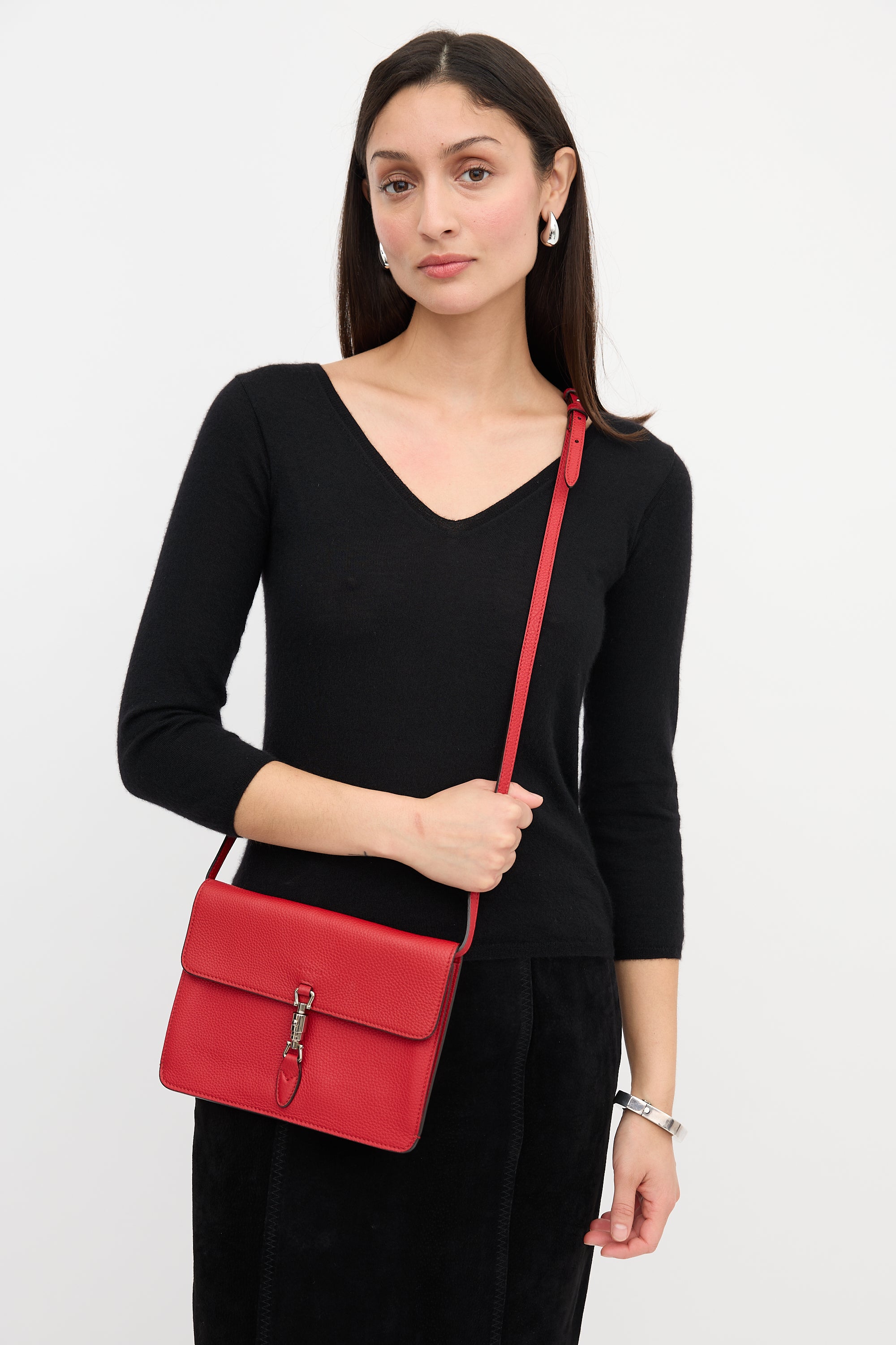 Pre-owned Gucci red pebbled leather soft Jackie Covertible bag featuring adjustable and detachable crossbody strap, silver tone hardware, top flap with debossed logo, siganture push lock closure with debossed logo, one main compartment, and one interior slip pocket.
