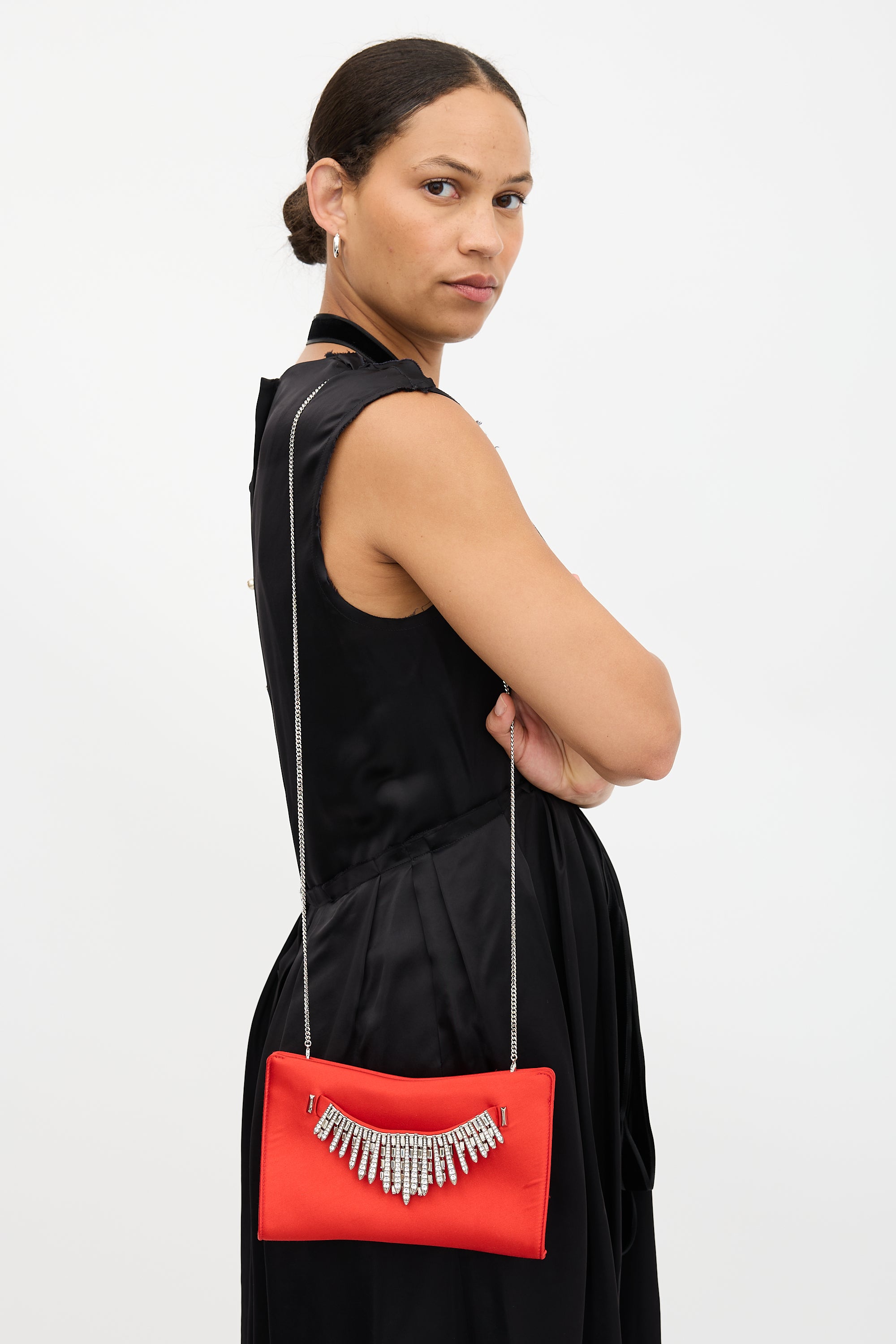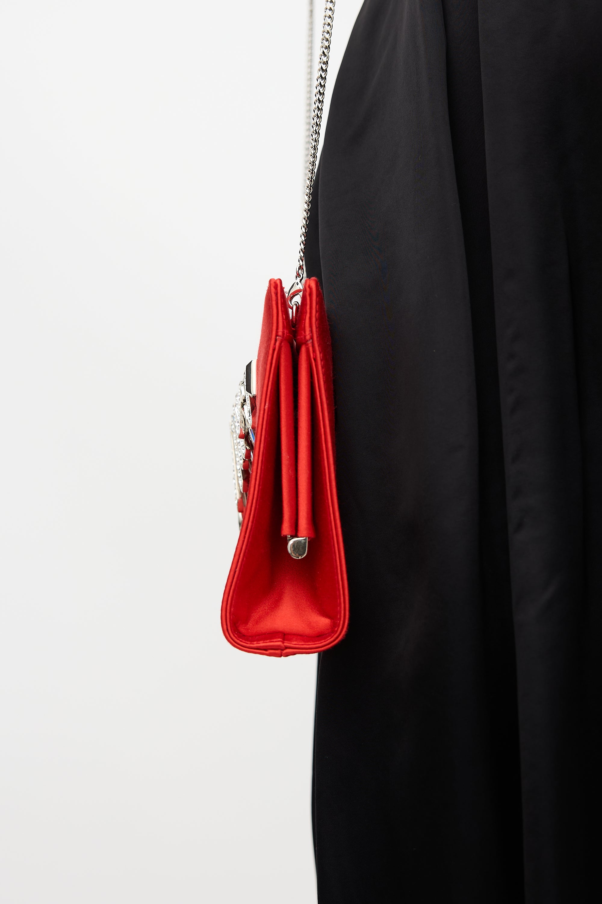 Pre-owned Jimmy Choo red satin Venus clutch featuring a silver crystal embellished strap at front, detachable chain link shoulder strap, hinge closure, and one lined main compartment with one slip pocket.