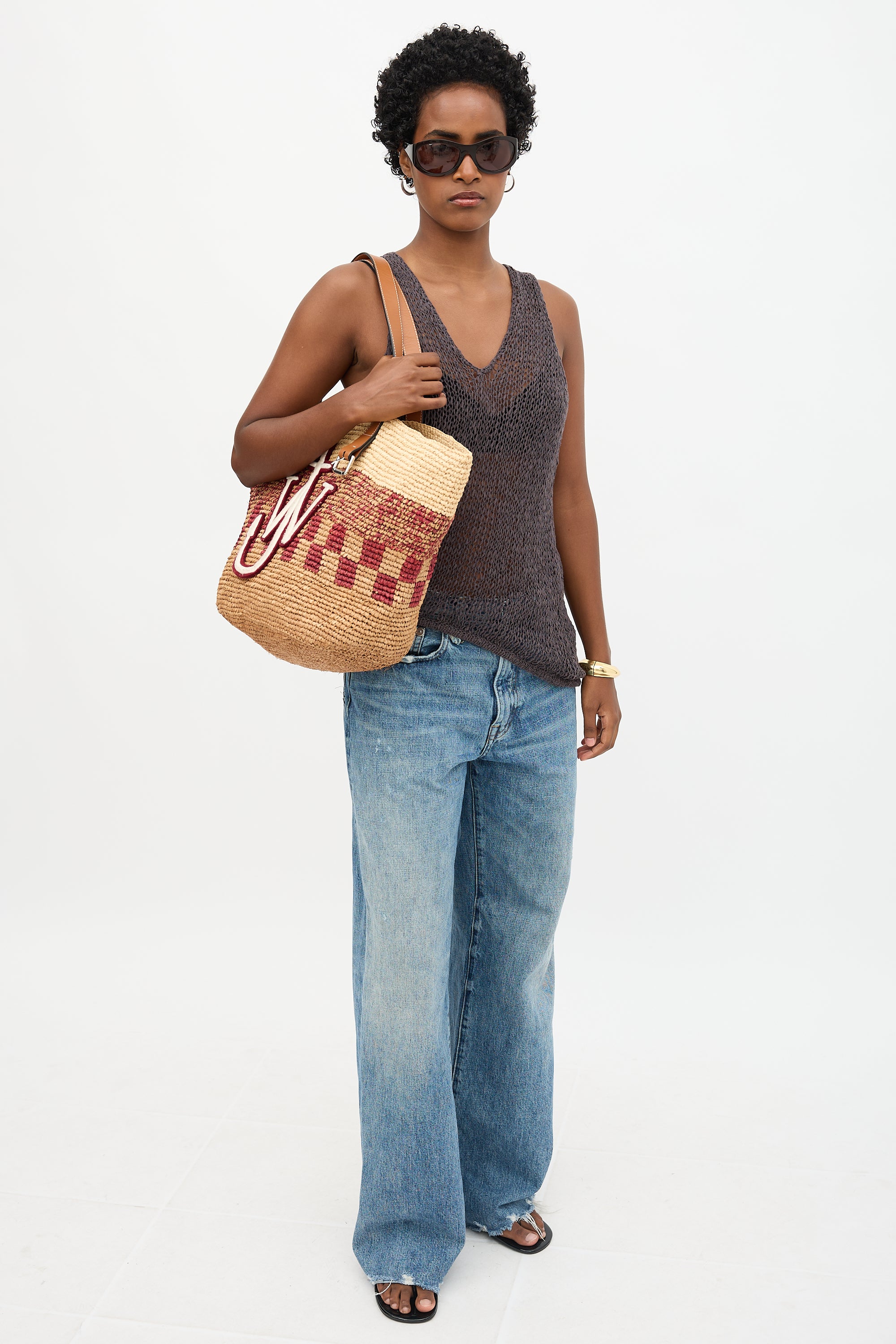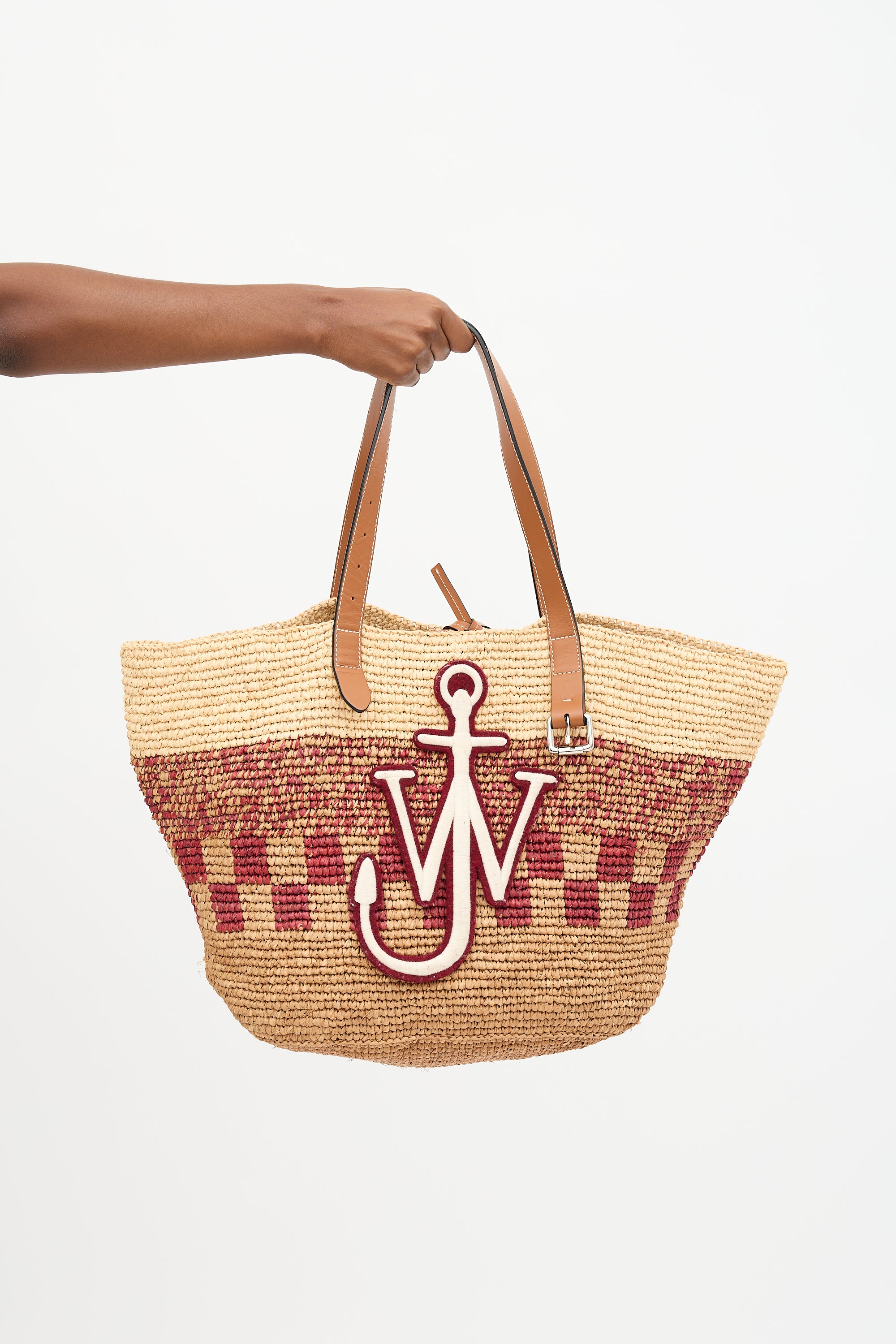 Pre-owned JW Anderson beige and burgundy raffia Belt Tote bag featuring woven body with checker pattern, front embroidered logo patch, dual leather belt carry handles, tie top closure, and one lined main compartment with logo tab.