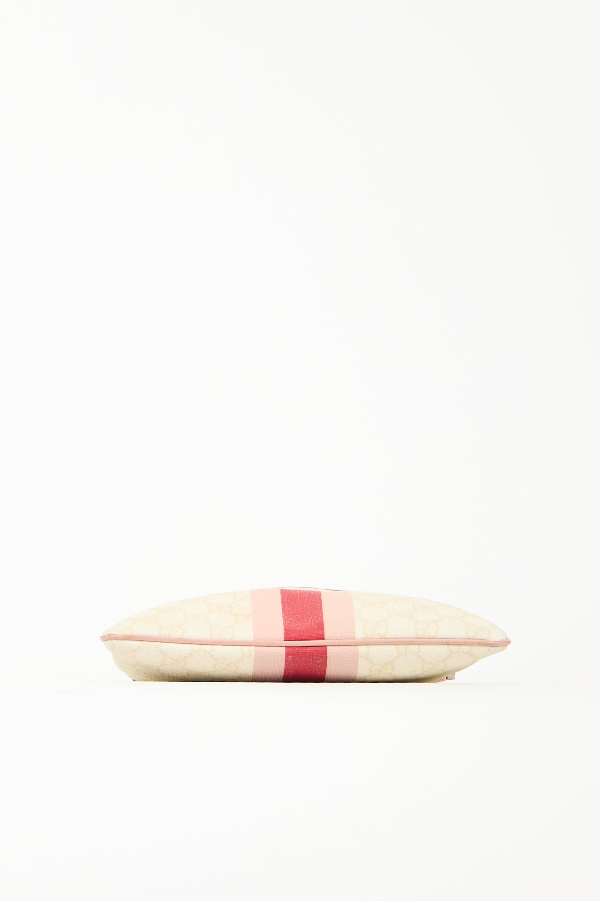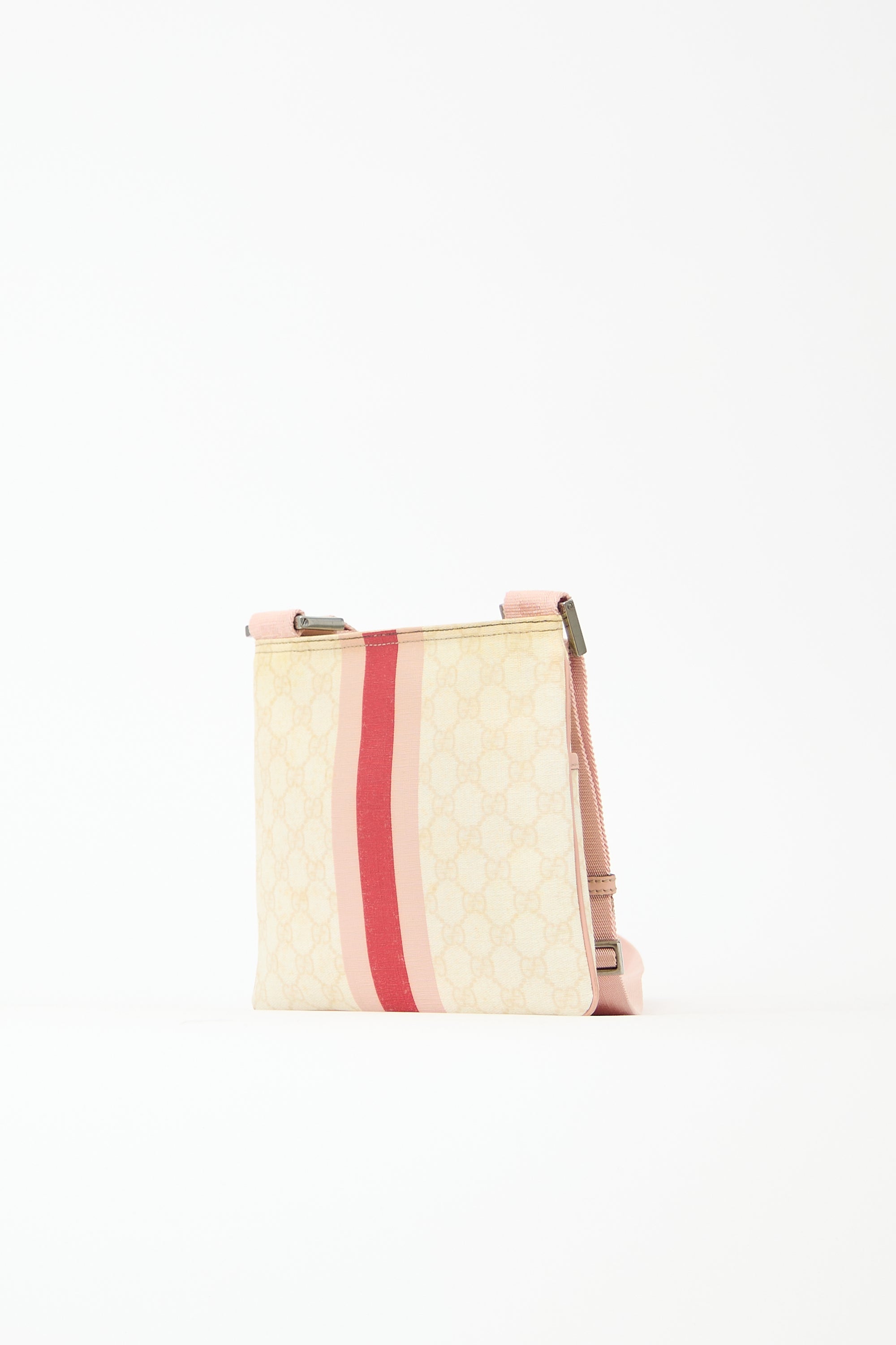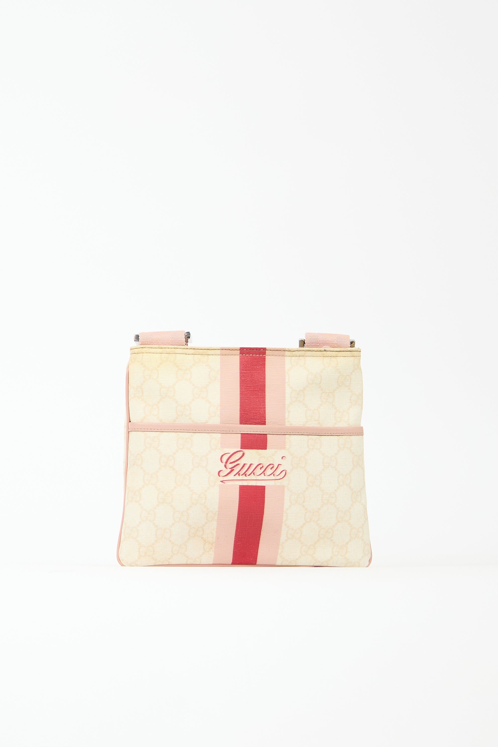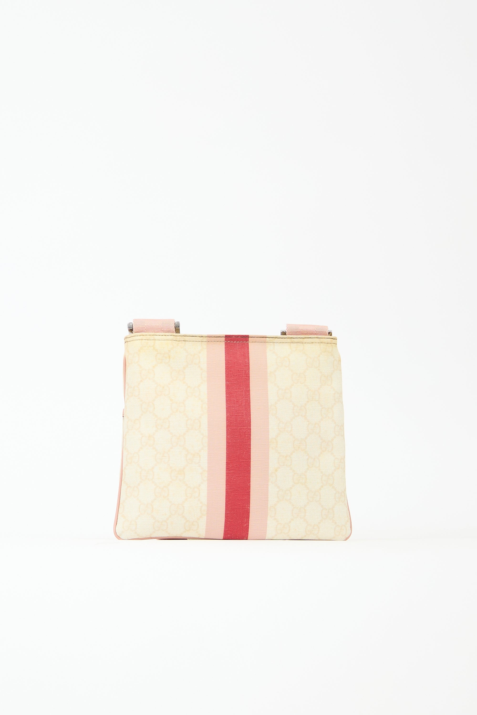 Pre-owned Gucci cream and pink crossbody bag featuring GG Supreme coated canvas, leather trim, printed Web stripe and front logo, front slip pocket, adjustable webbed shoulder strap, top zip closure, and one lined main compartment with one zip pocket and one slip pocket.
