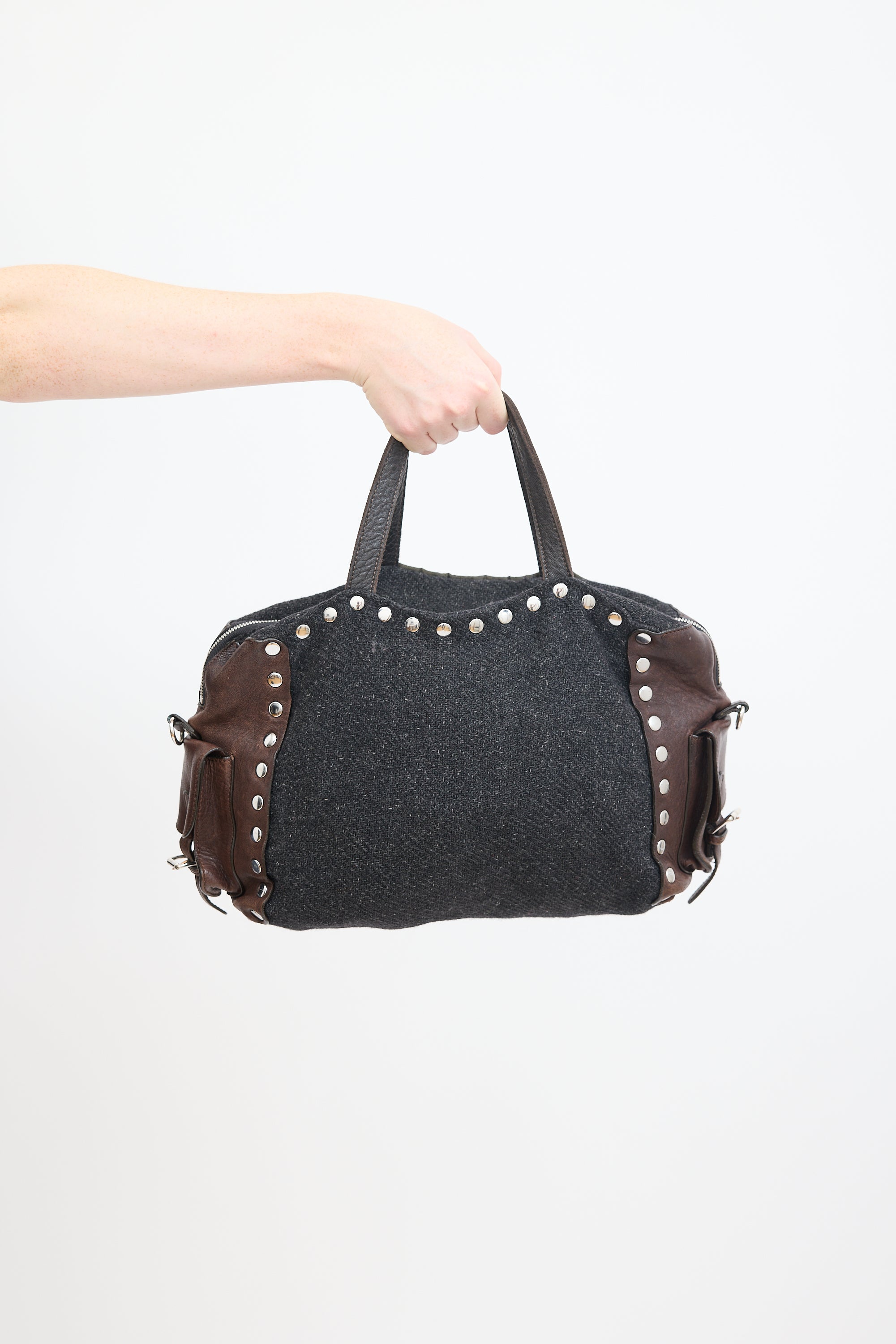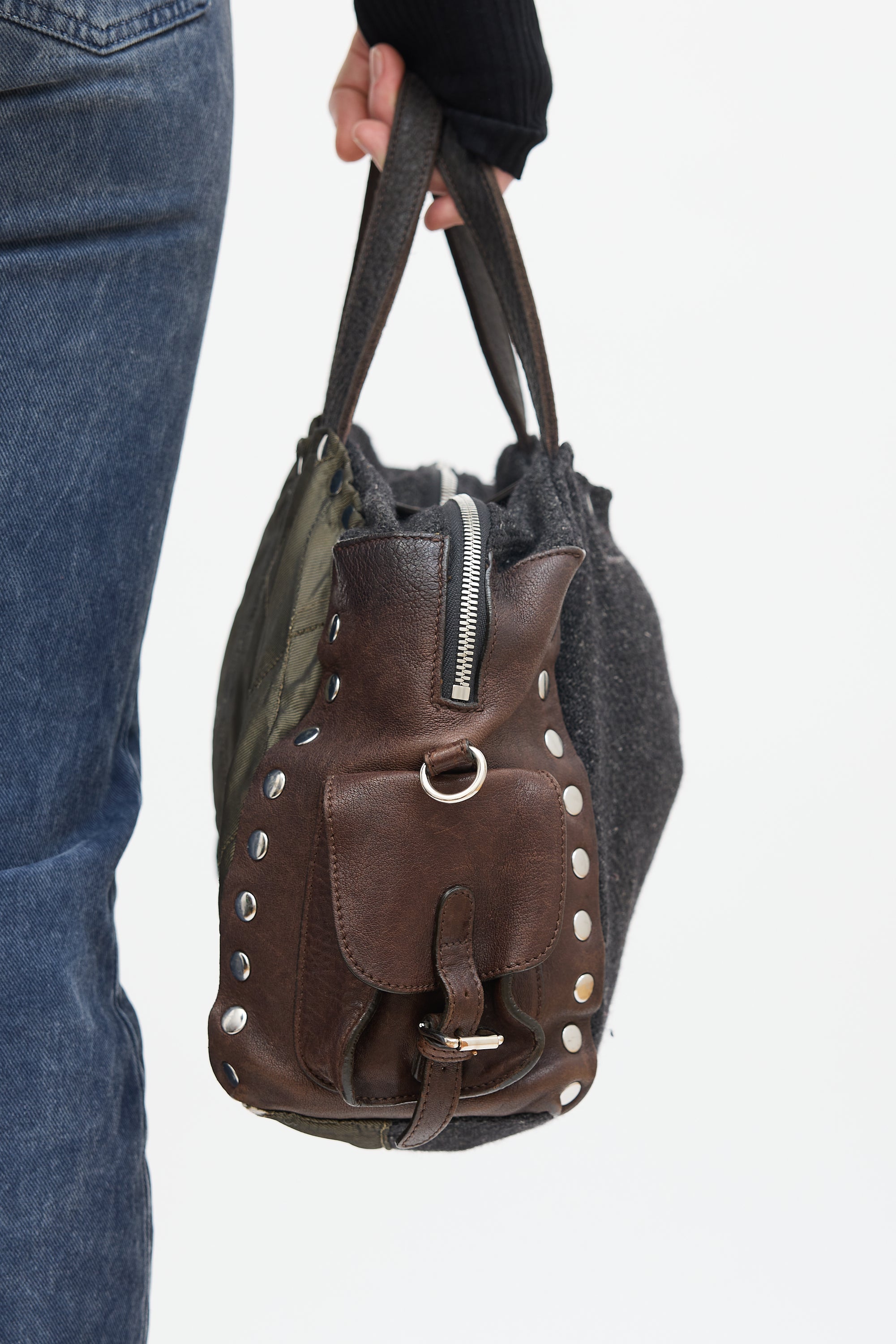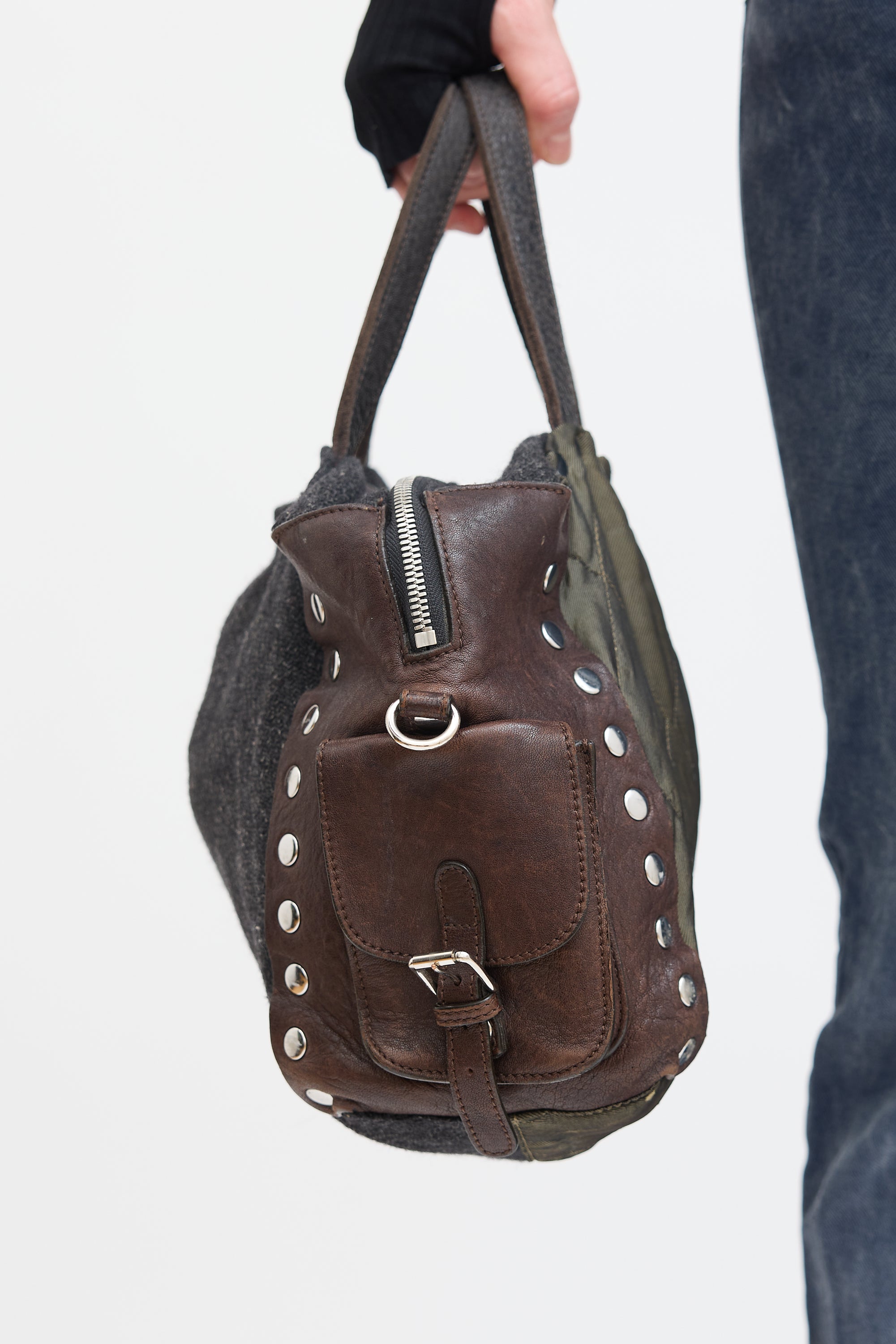 Pre-owned Marni Winter 2010 grey and multicolour bag featuring dual leather top handles, single adjustable and detachable crossbody strap, green quilted front and grey wool back, brown leather flap pockets at sides, silver tone stud embellishments throughout, and one lined main compartment with one zip and two slip pockets.