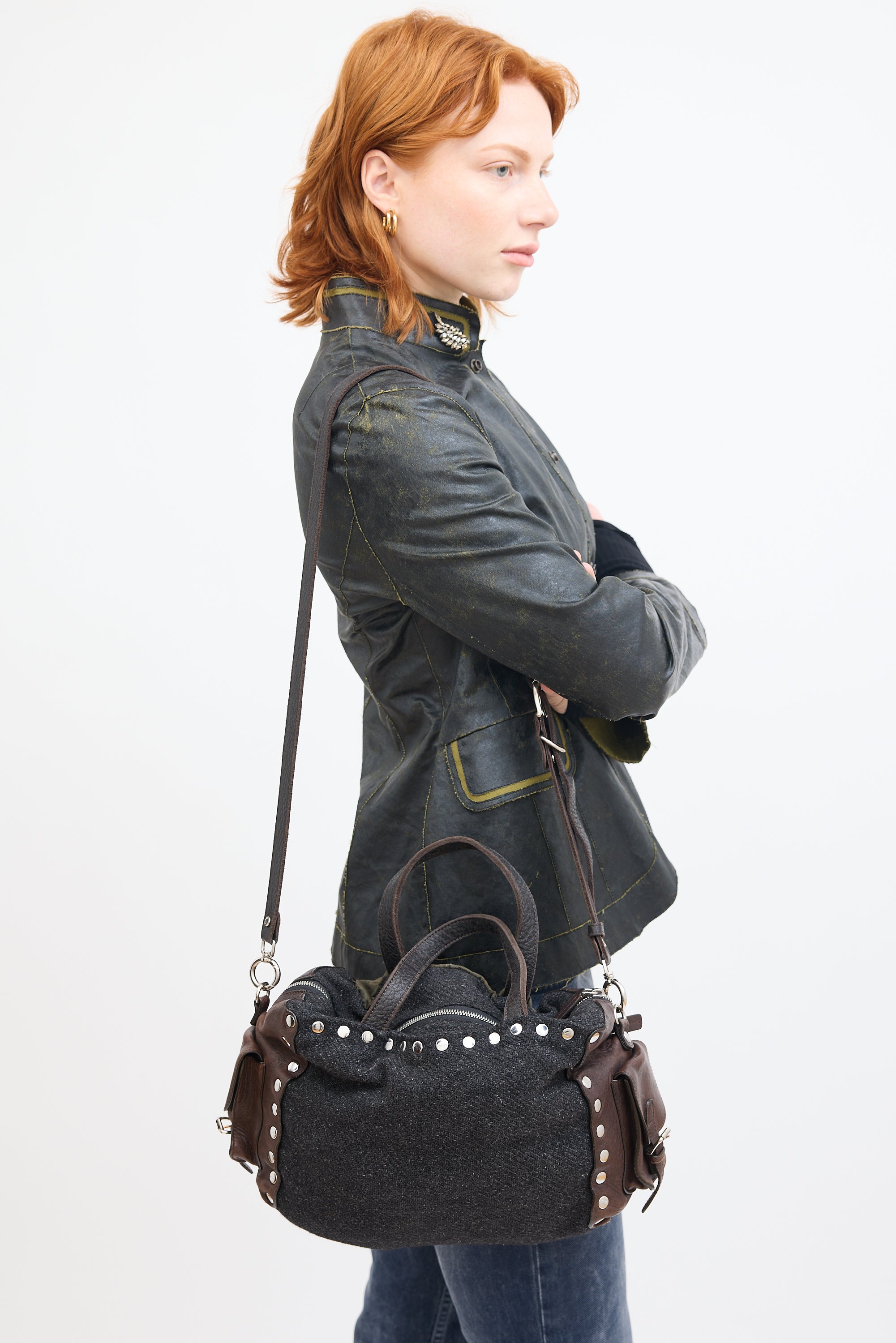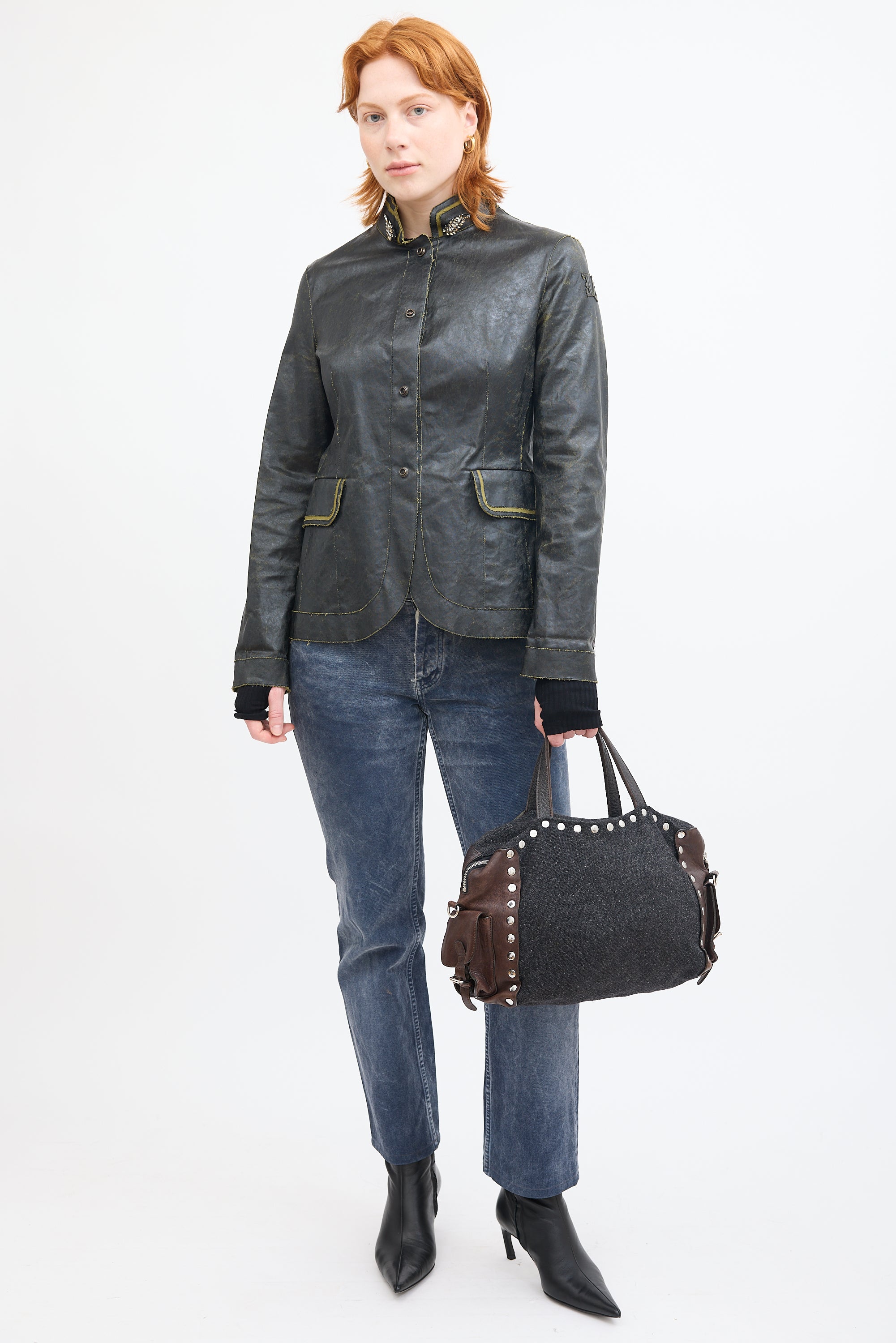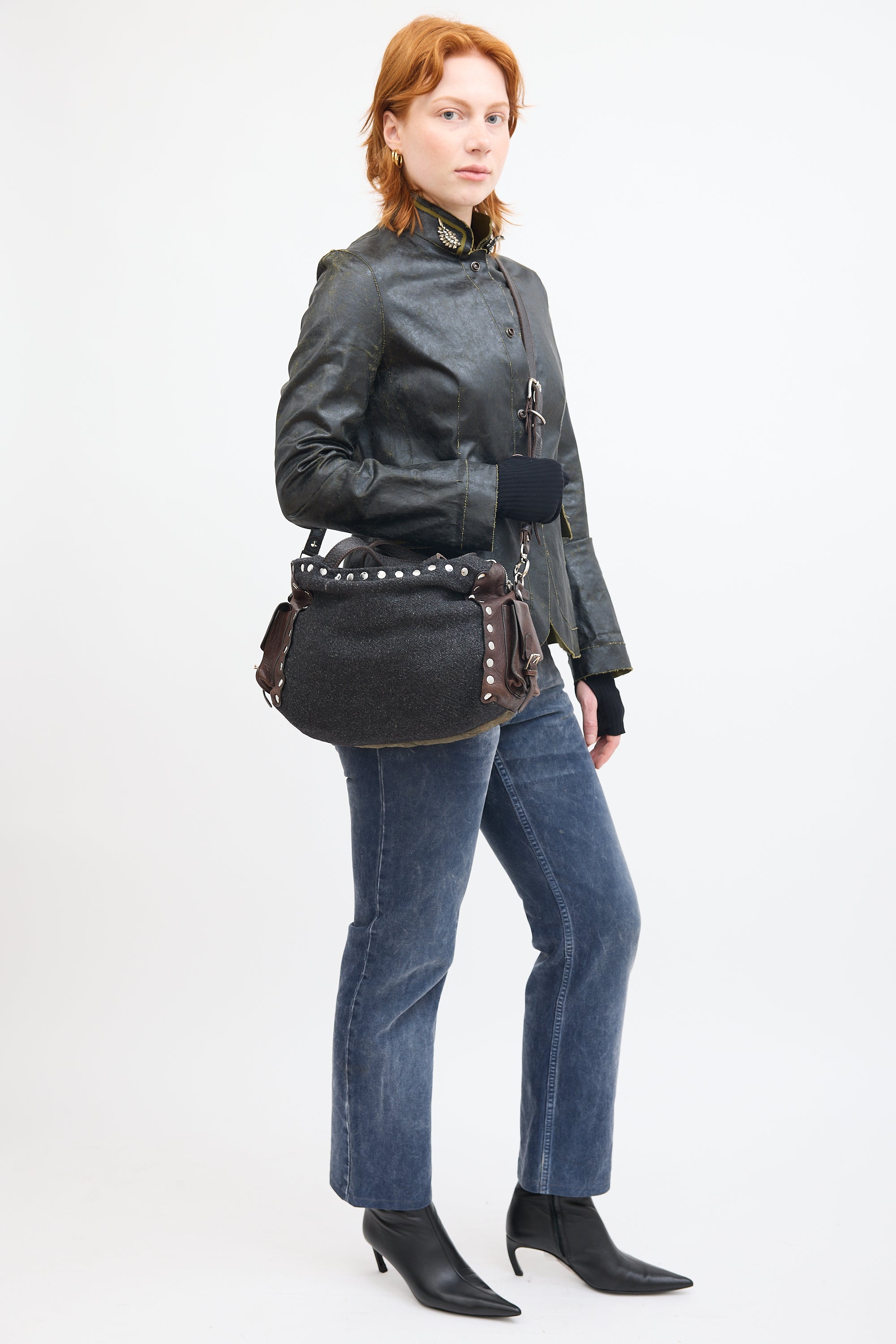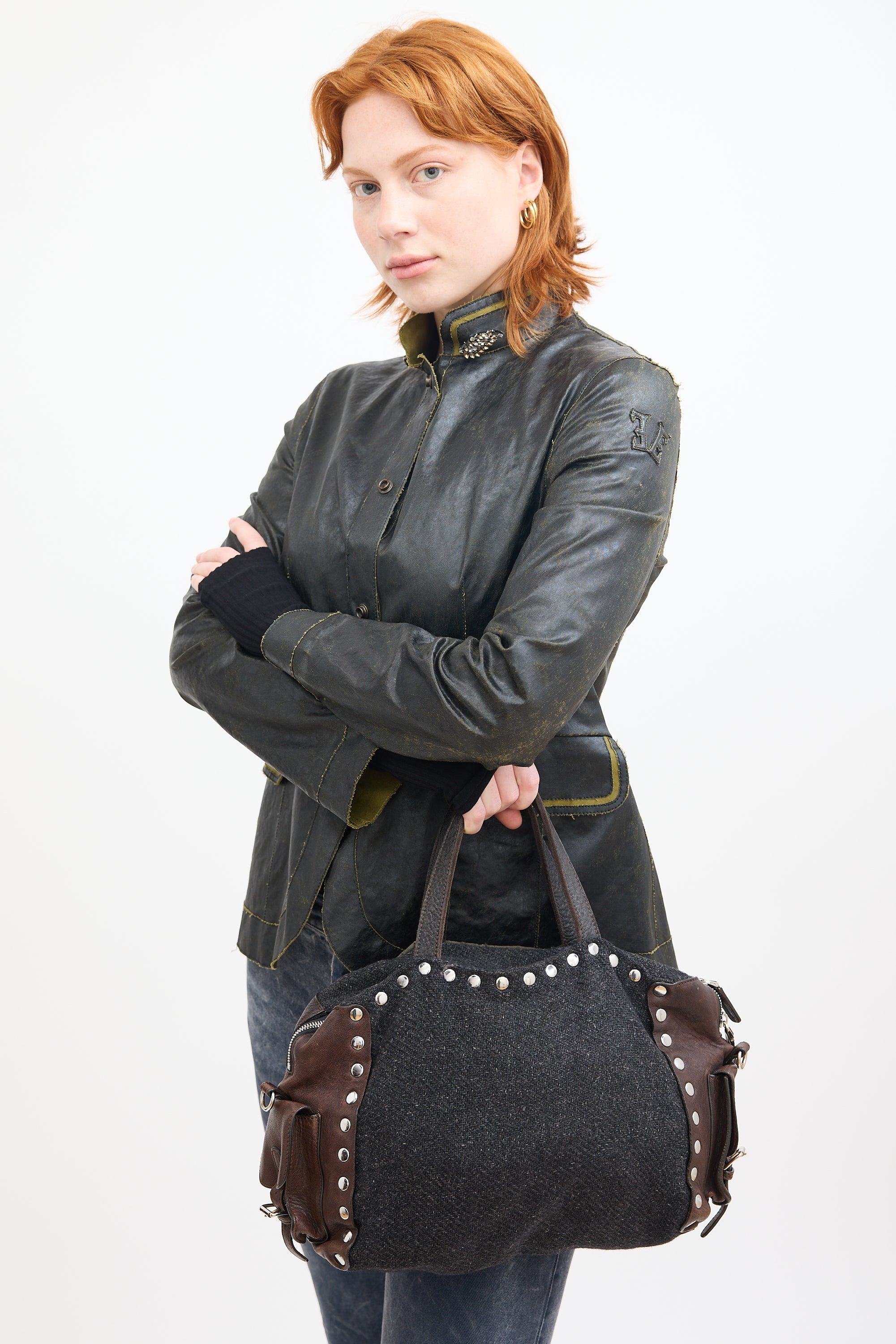 Pre-owned Marni Winter 2010 grey and multicolour bag featuring dual leather top handles, single adjustable and detachable crossbody strap, green quilted front and grey wool back, brown leather flap pockets at sides, silver tone stud embellishments throughout, and one lined main compartment with one zip and two slip pockets.