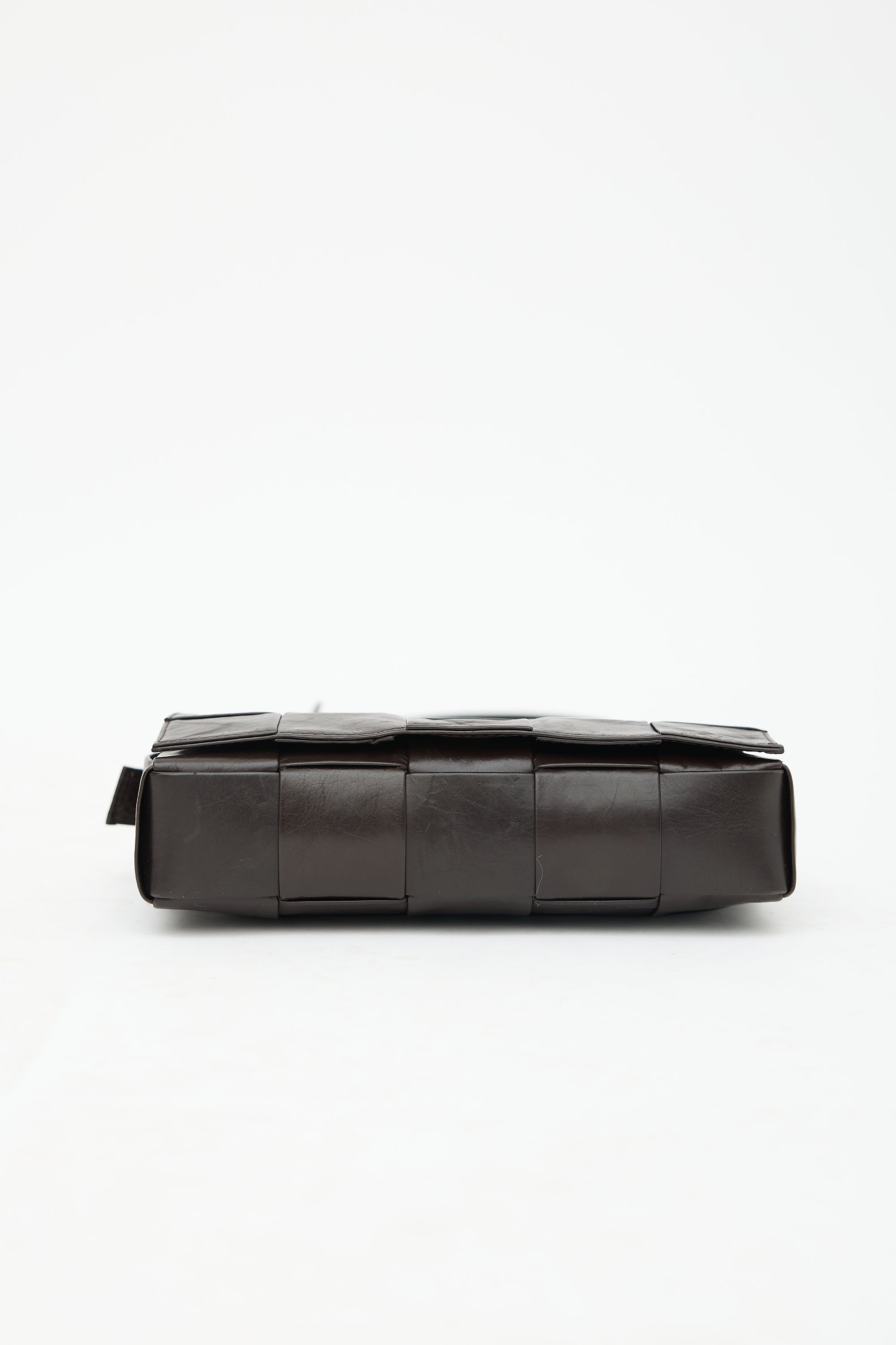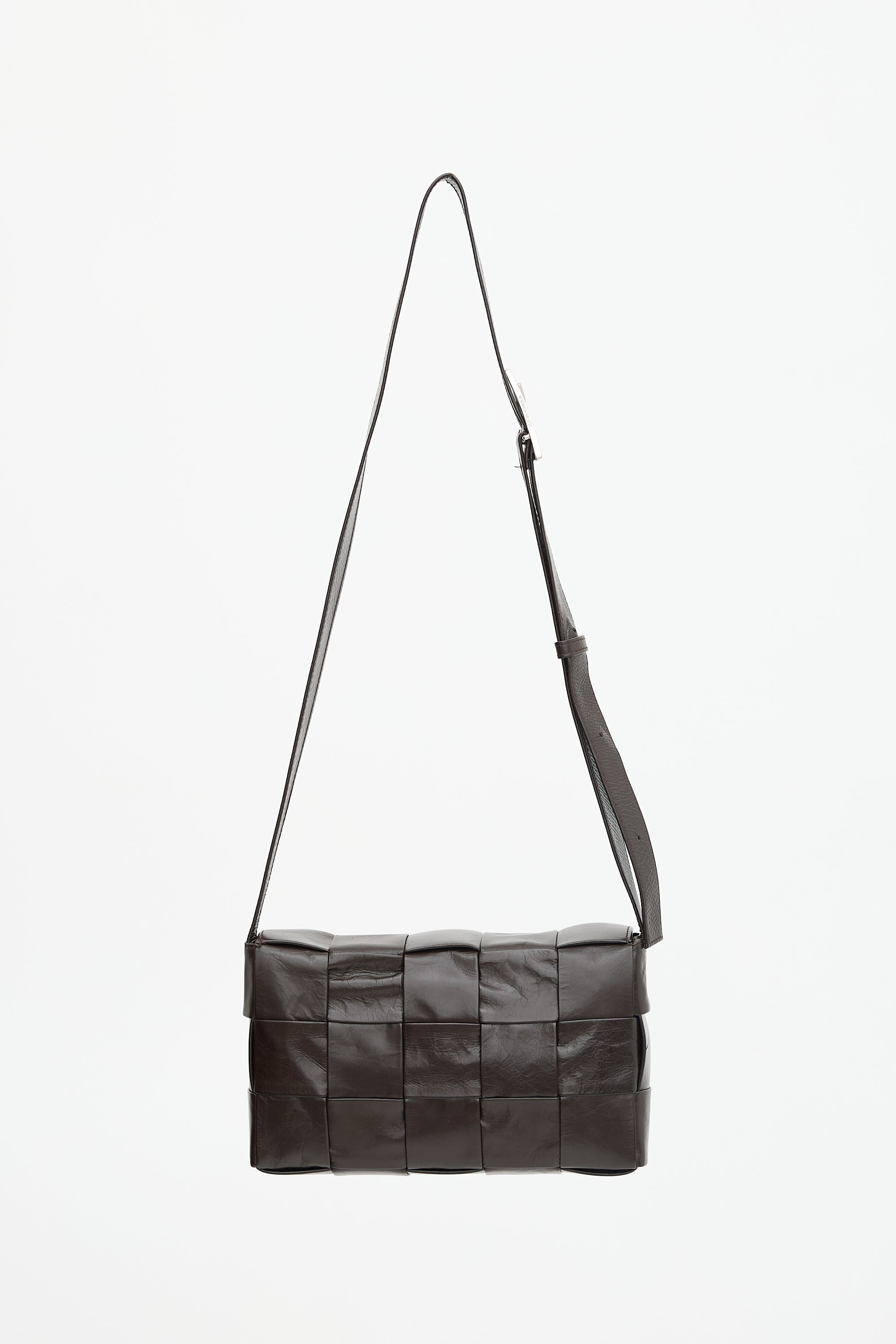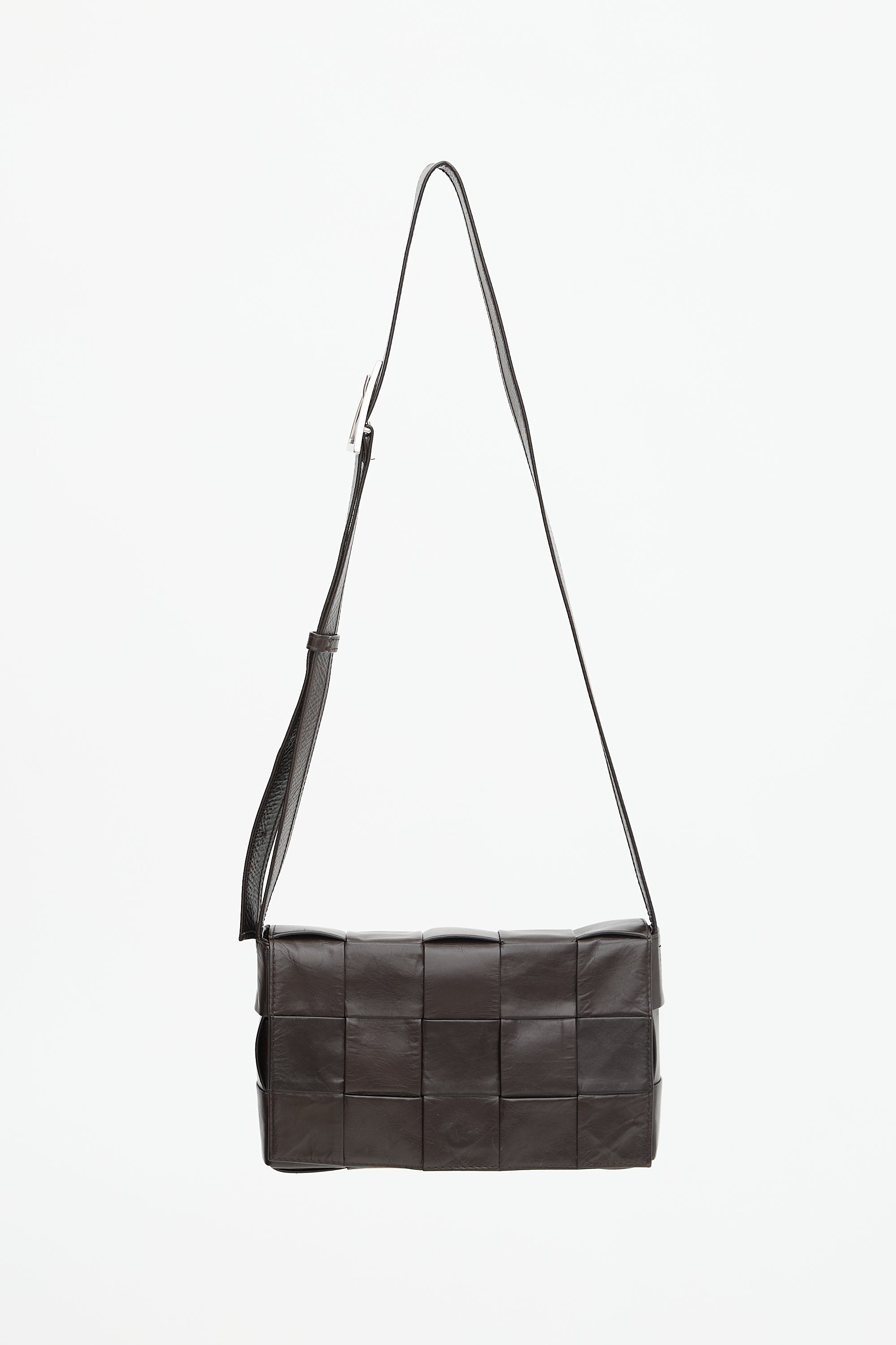 Pre-owned Bottega Veneta brown leather Cassette bag featuring a signature Intrecciato woven body, adjustable flat shoulder strap with triangle buckle, front flap with magnetic closure, and one main compartment with one zip pocket. Comes with original dust bag.