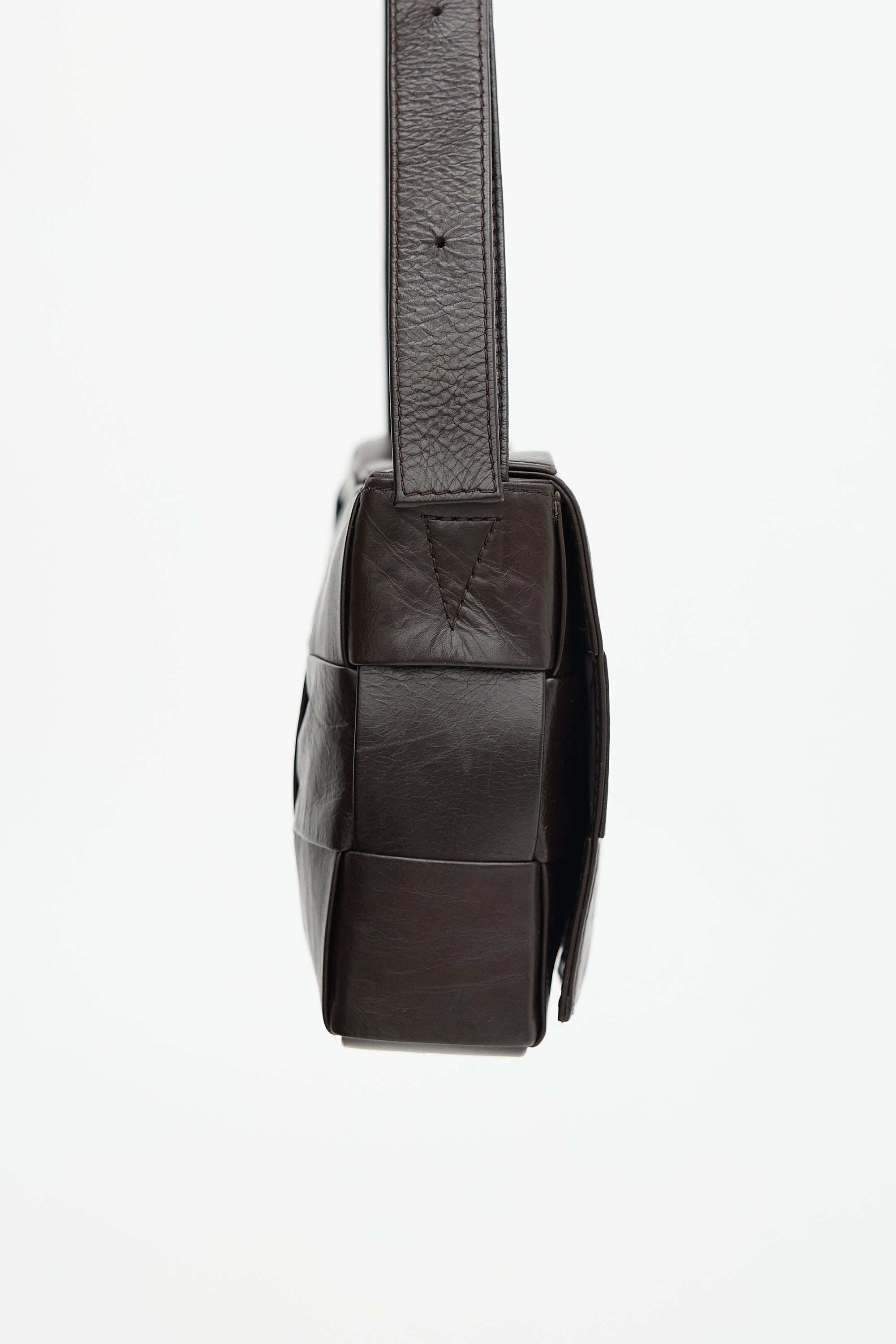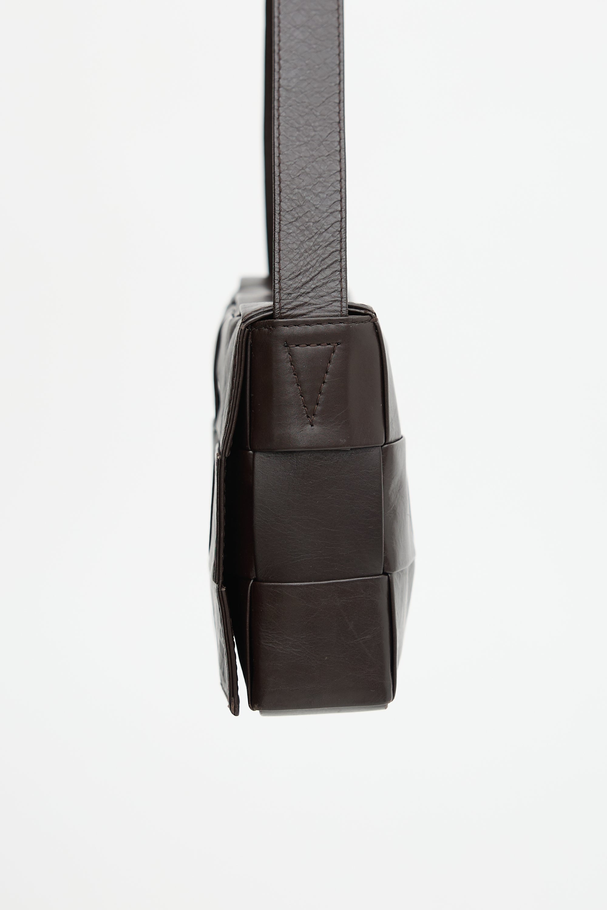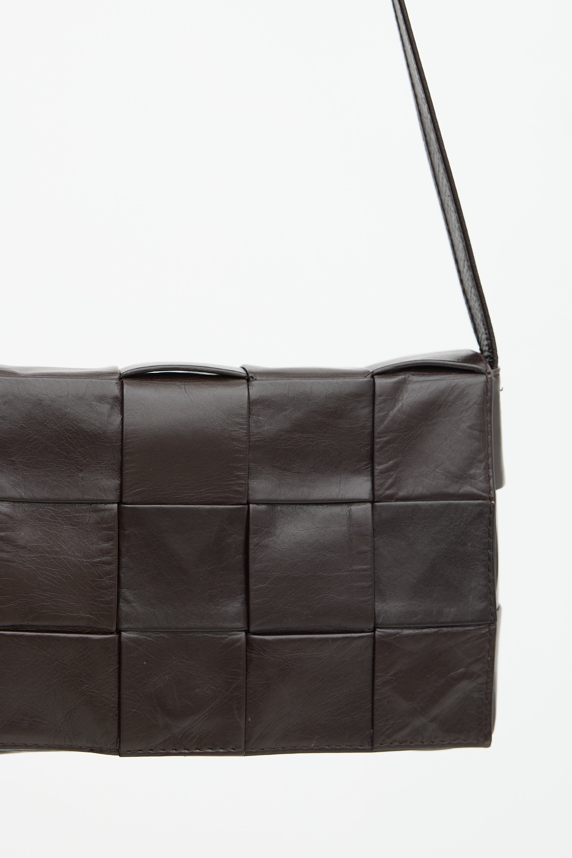 Pre-owned Bottega Veneta brown leather Cassette bag featuring a signature Intrecciato woven body, adjustable flat shoulder strap with triangle buckle, front flap with magnetic closure, and one main compartment with one zip pocket. Comes with original dust bag.