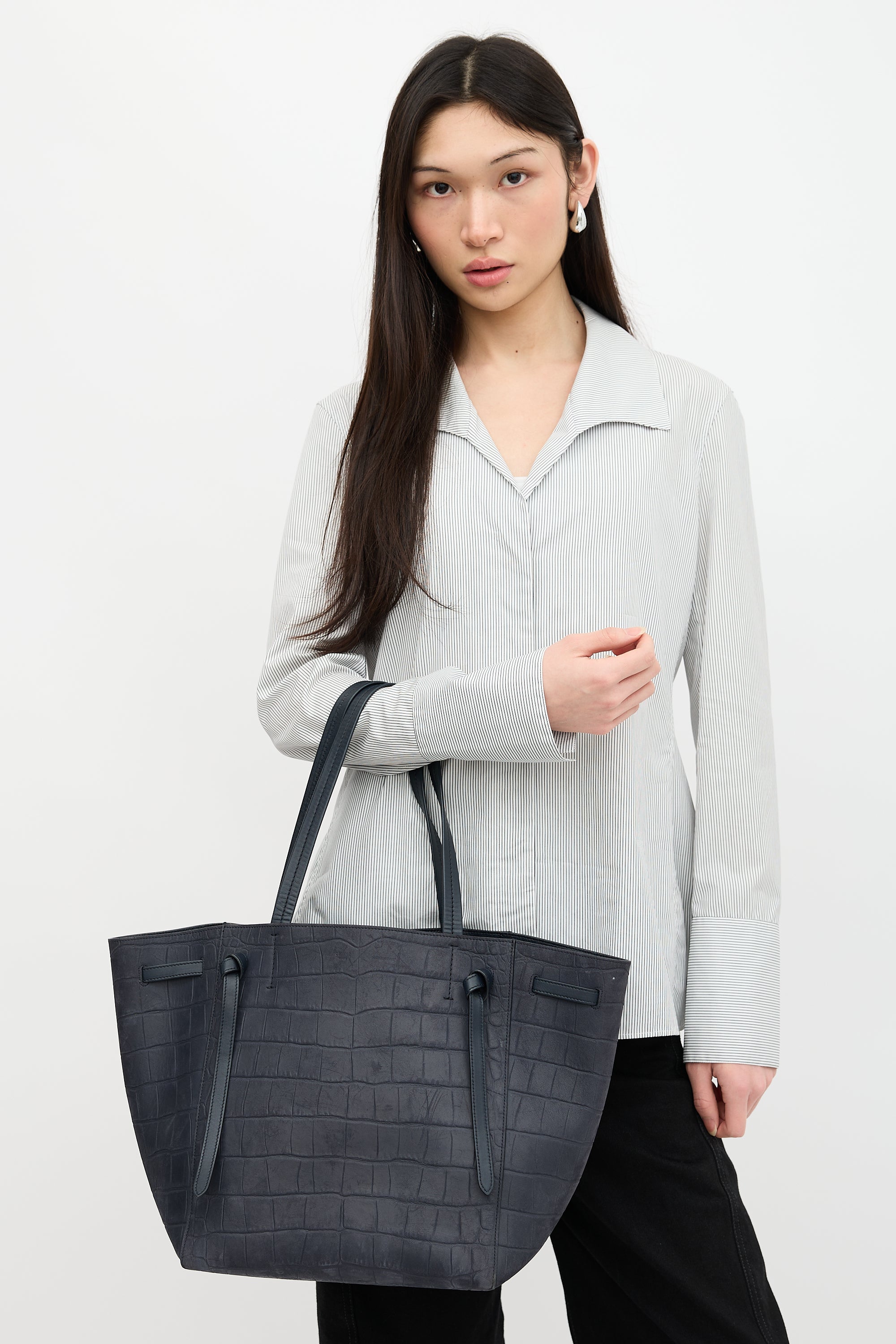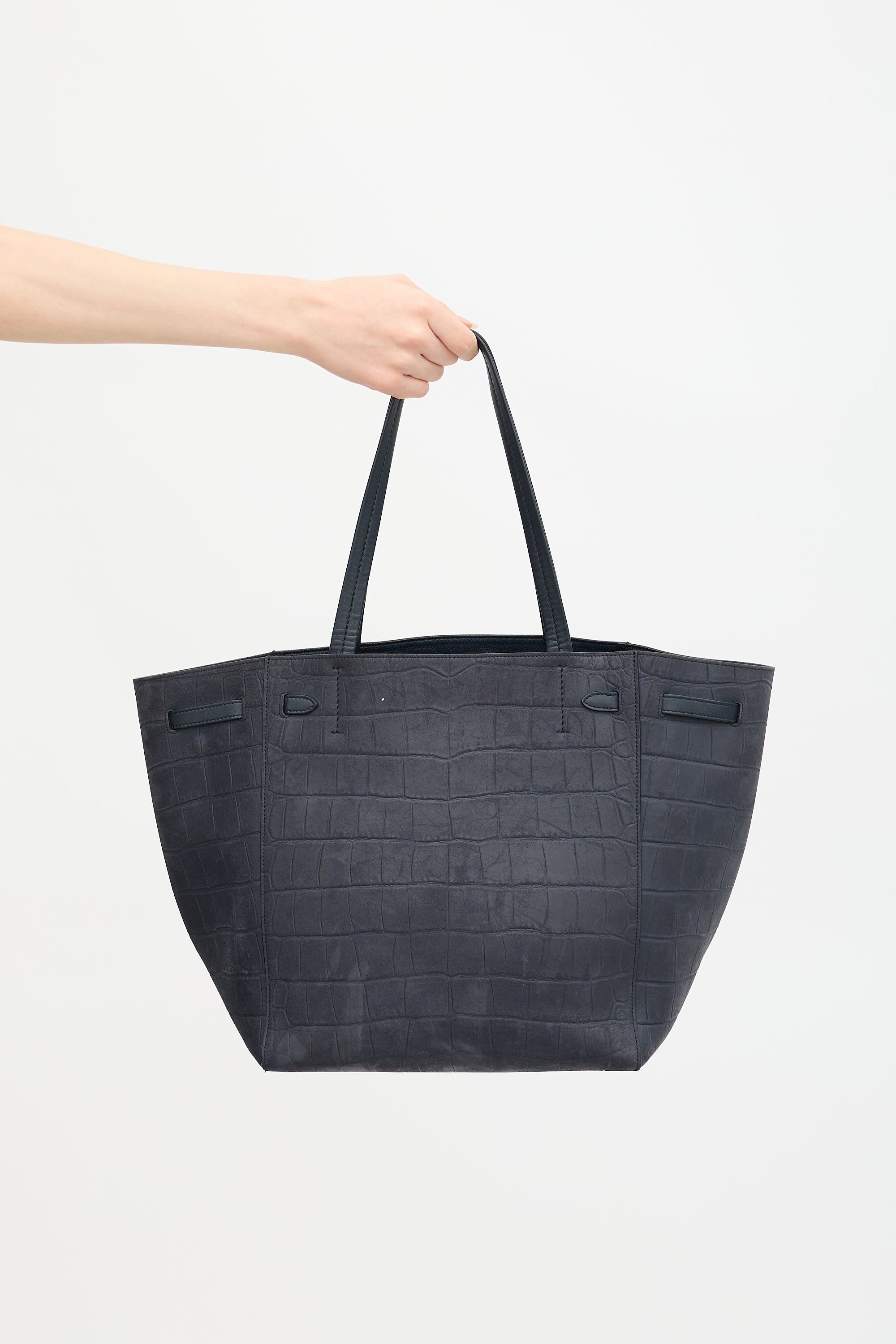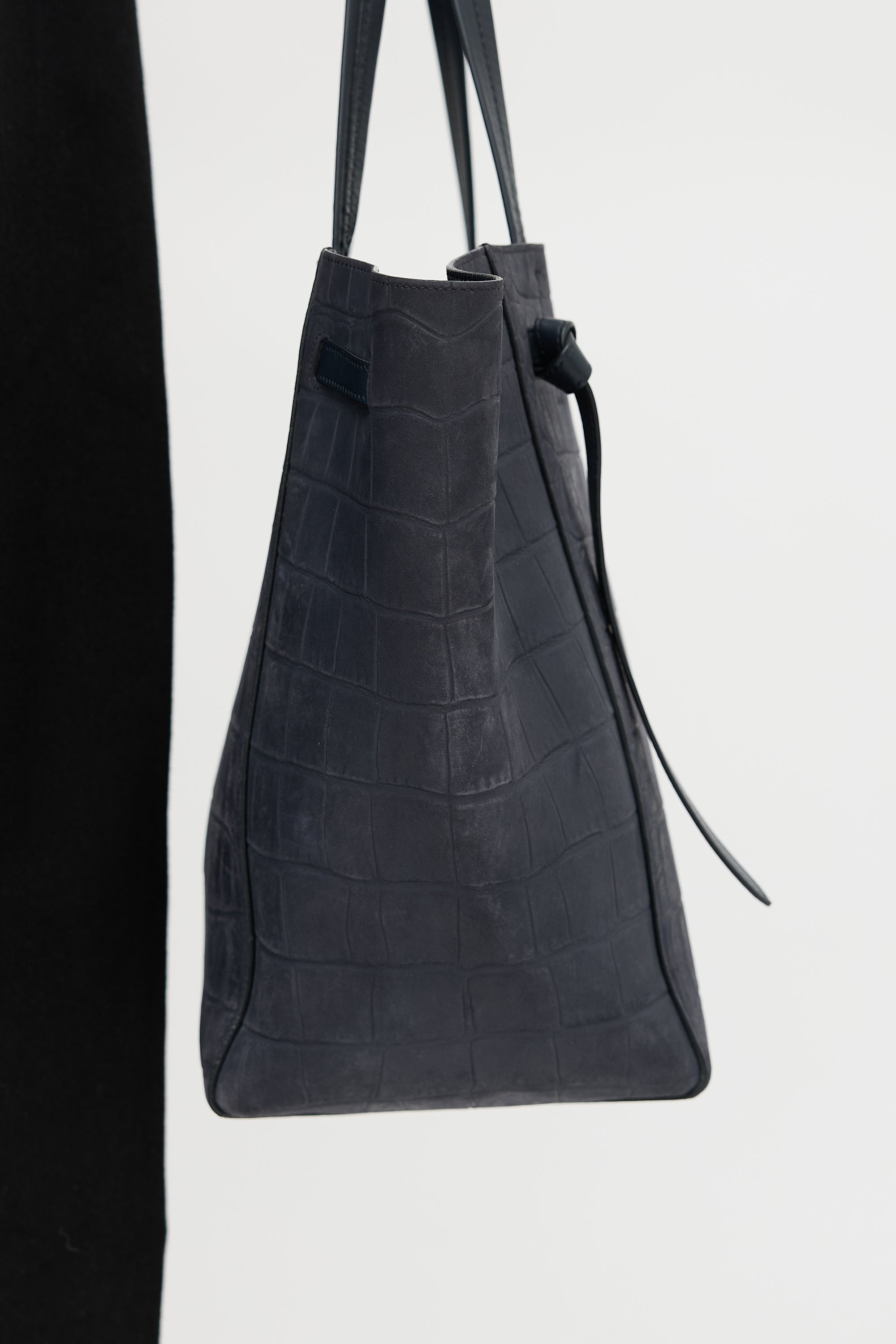 Pre-owned Celine 2015 navy suede Cabas Phantom tote bag featuring croc embossed surface, stamped logo at front, knotted belt at topline, dual flat top handles, open top, and one lined main compartment with one zip pocket and two slip pockets.