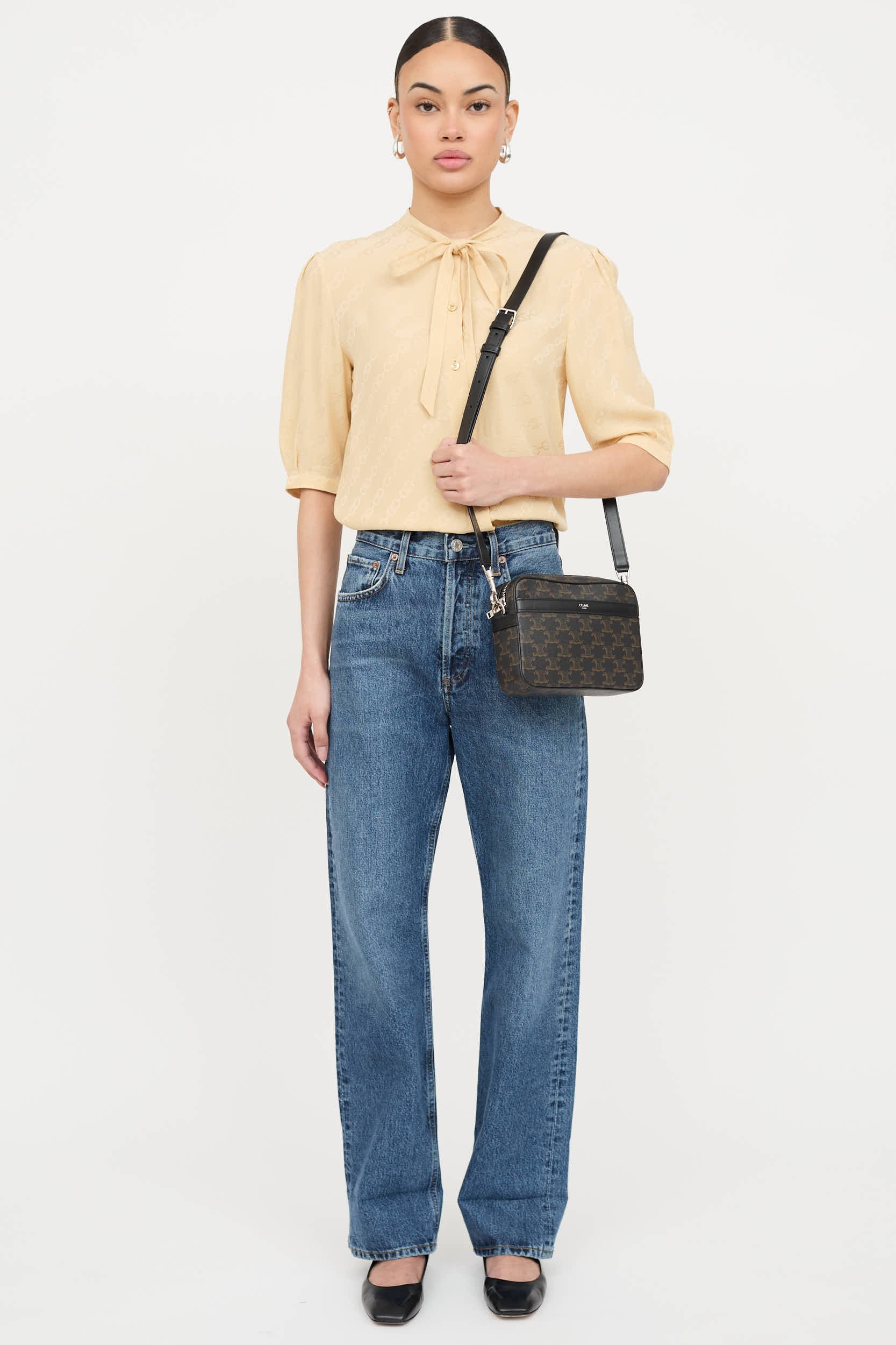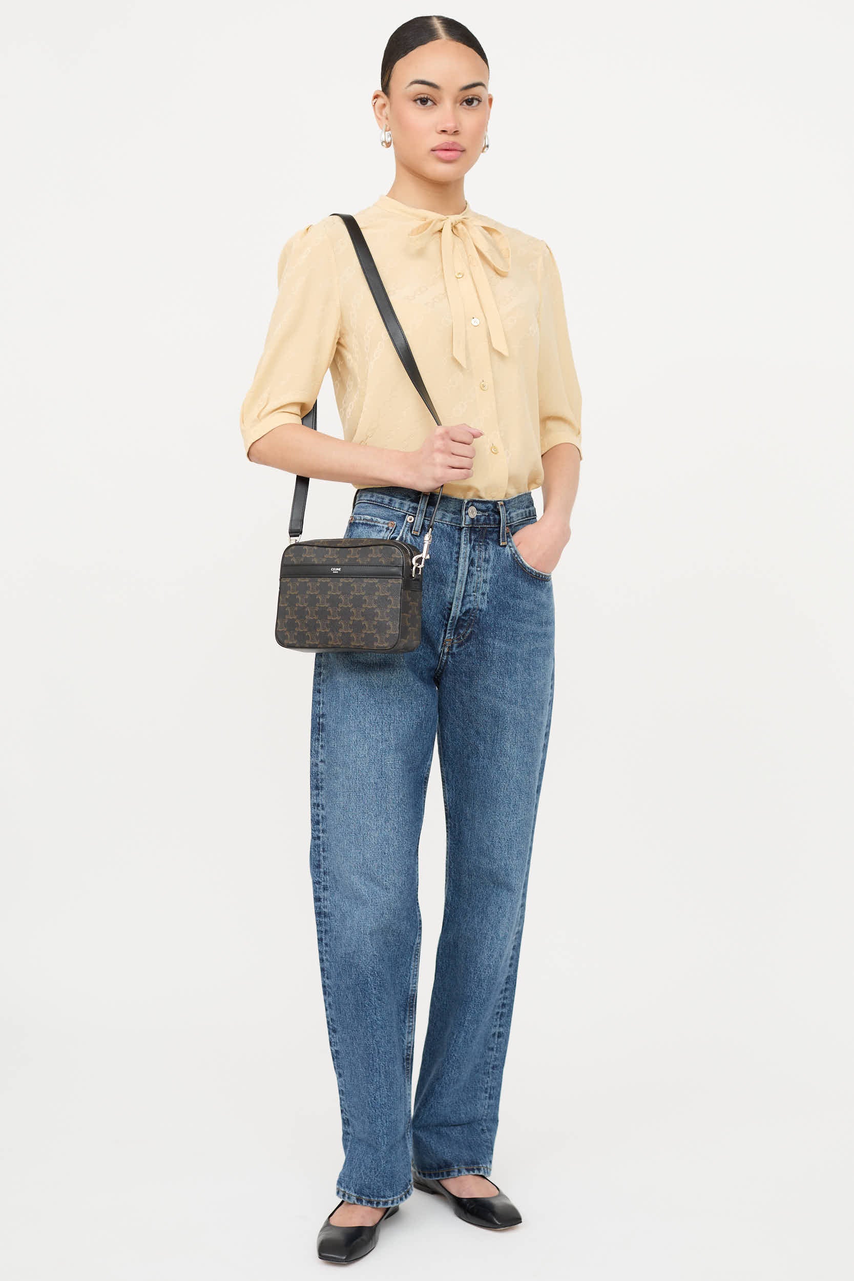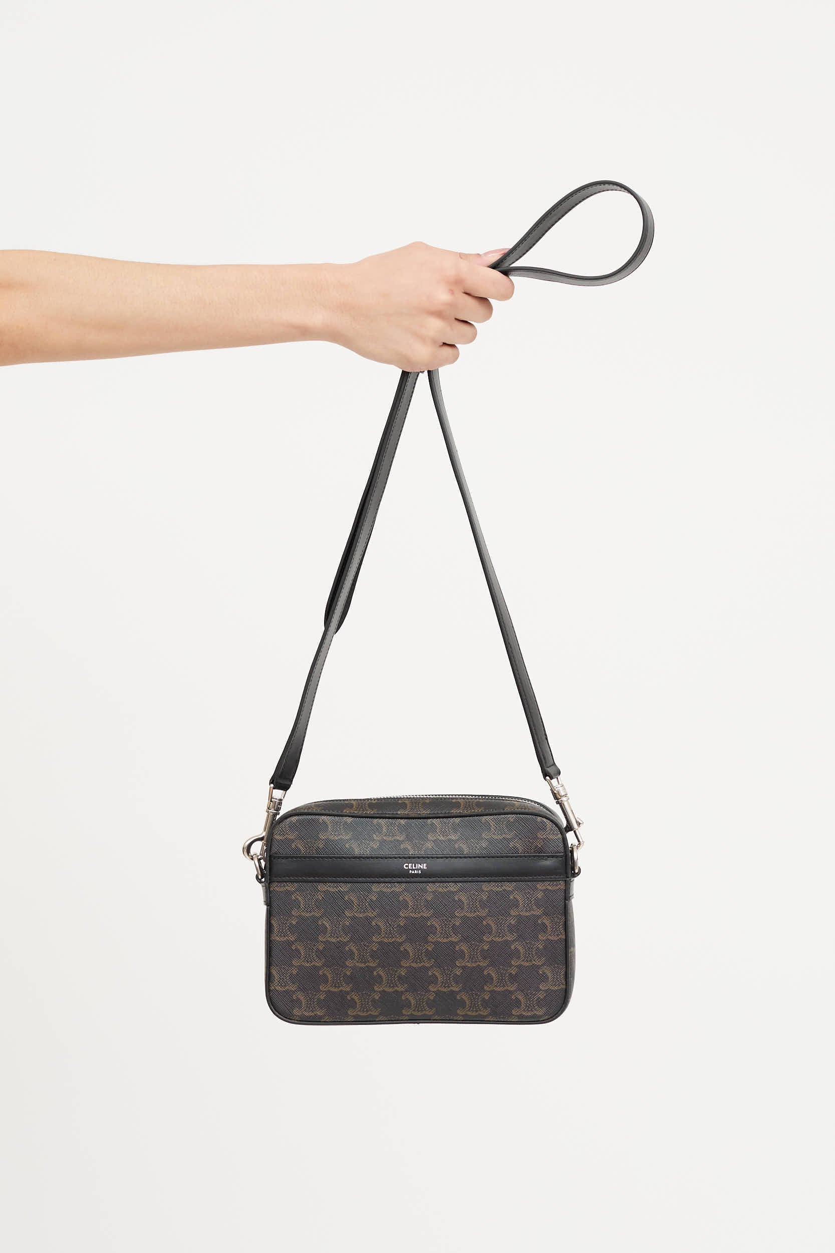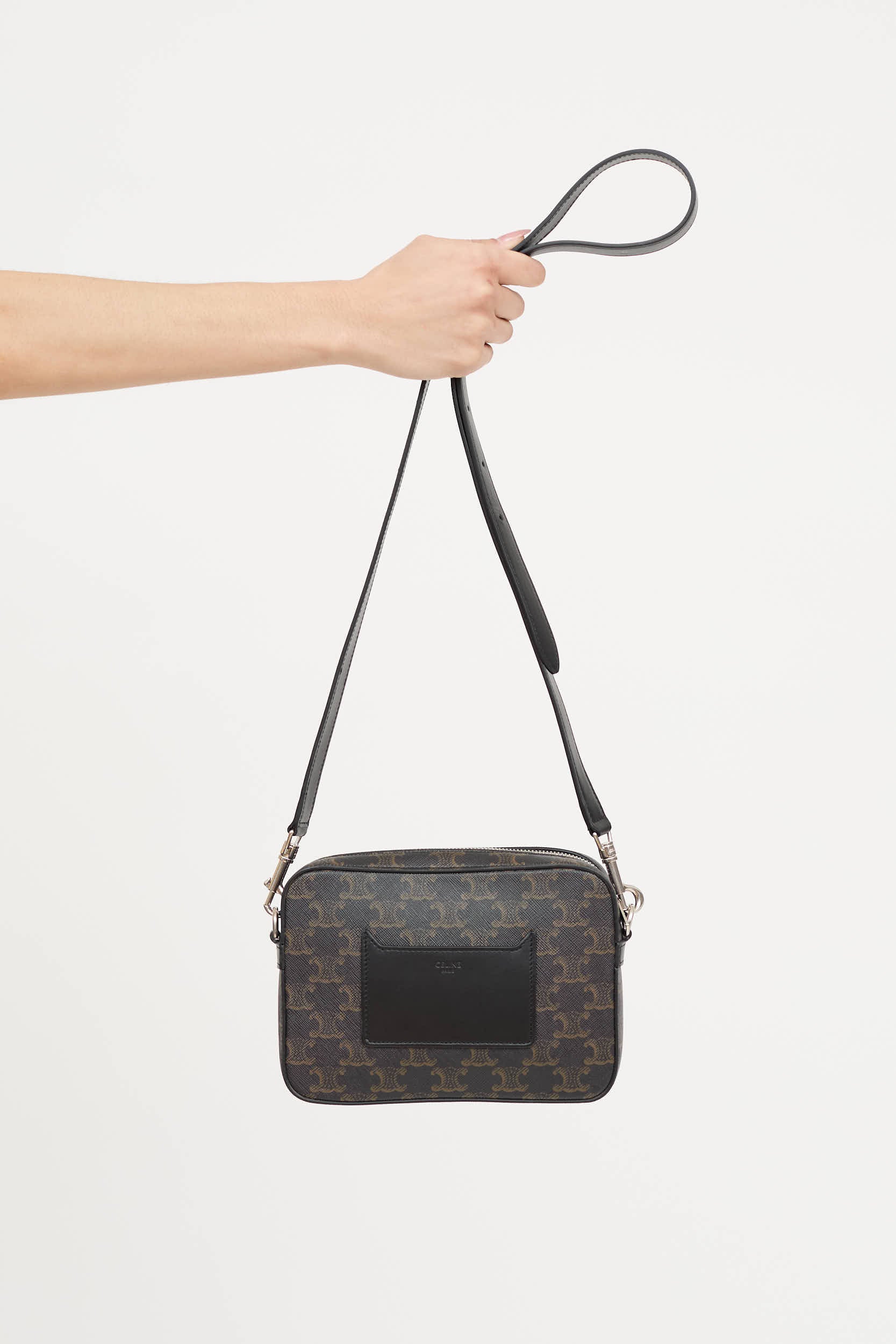 Pre-owned Celine brown and black small messenger back featuring Triomphe monogram throughout, slip pocket at front with printed logo, card slot at back, detachable crossbody strap, top zip closure, and one main compartment with one slip pocket.