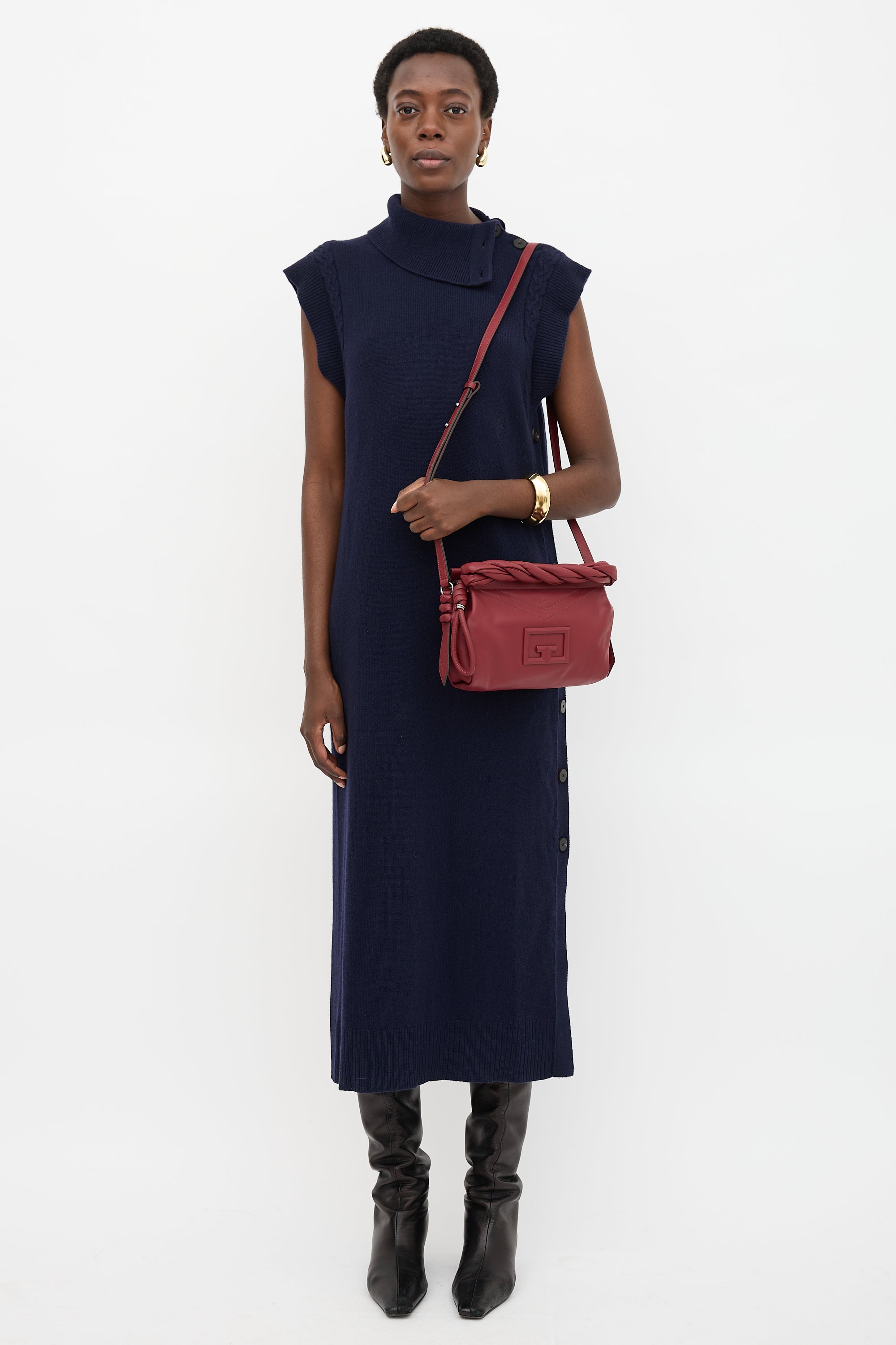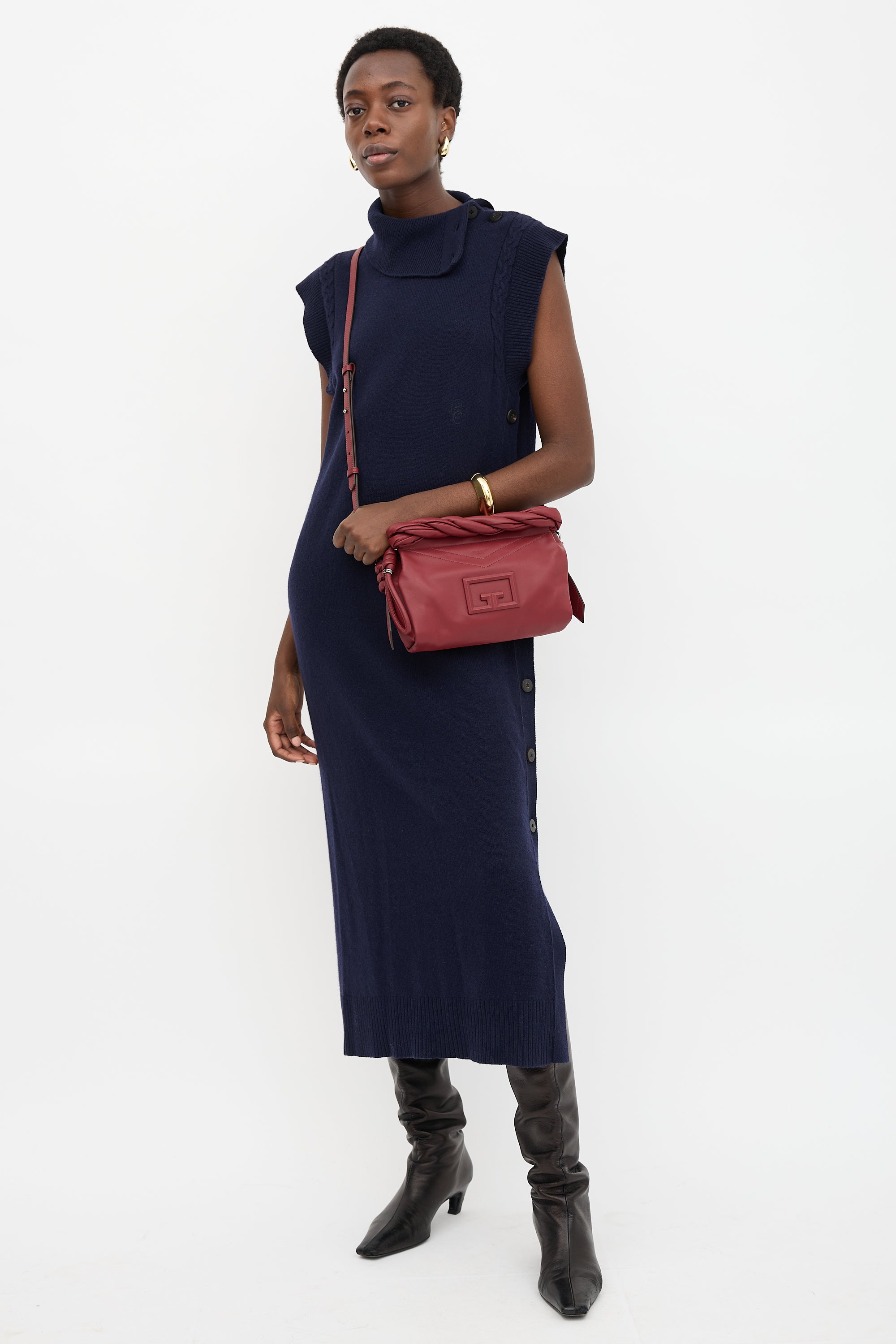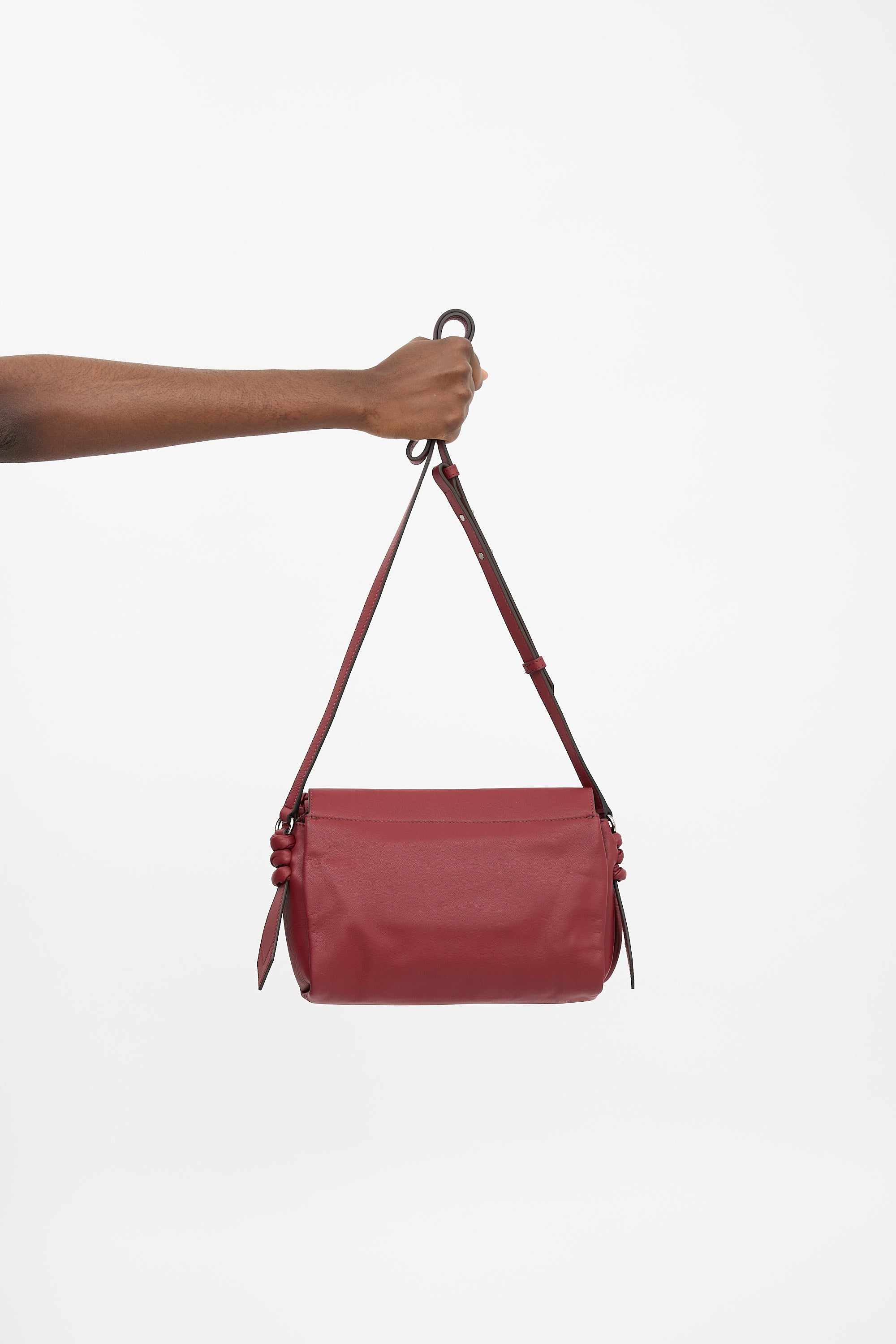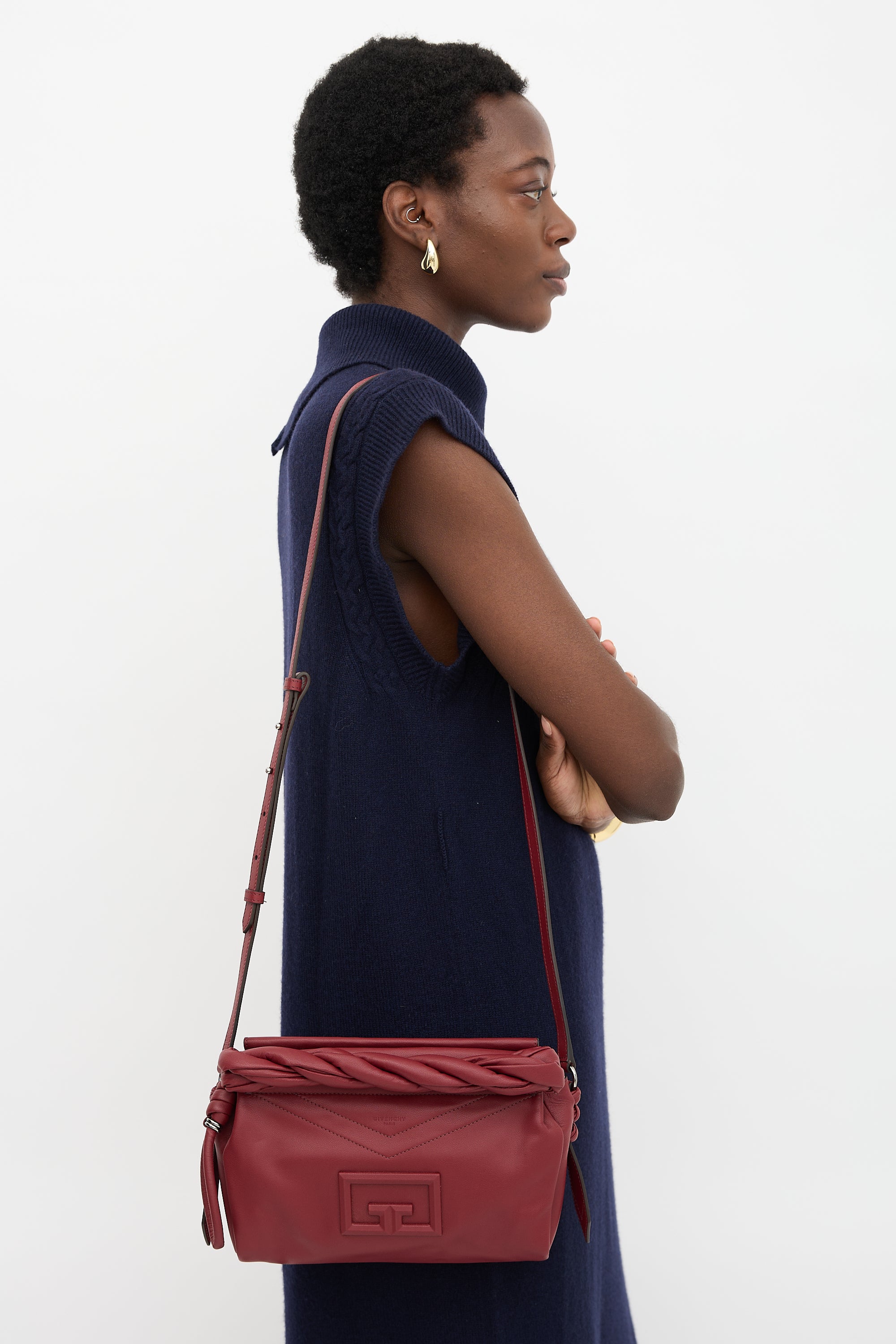 Pre-owned Givenchy burgundy leather ID93 crossbody bag featuring tonal stitching, stamped logo and covered logo embellishment at front, twisted top design, adjustable shoulder strap, top zip closure, and one lined main compartment with one slip pocket.