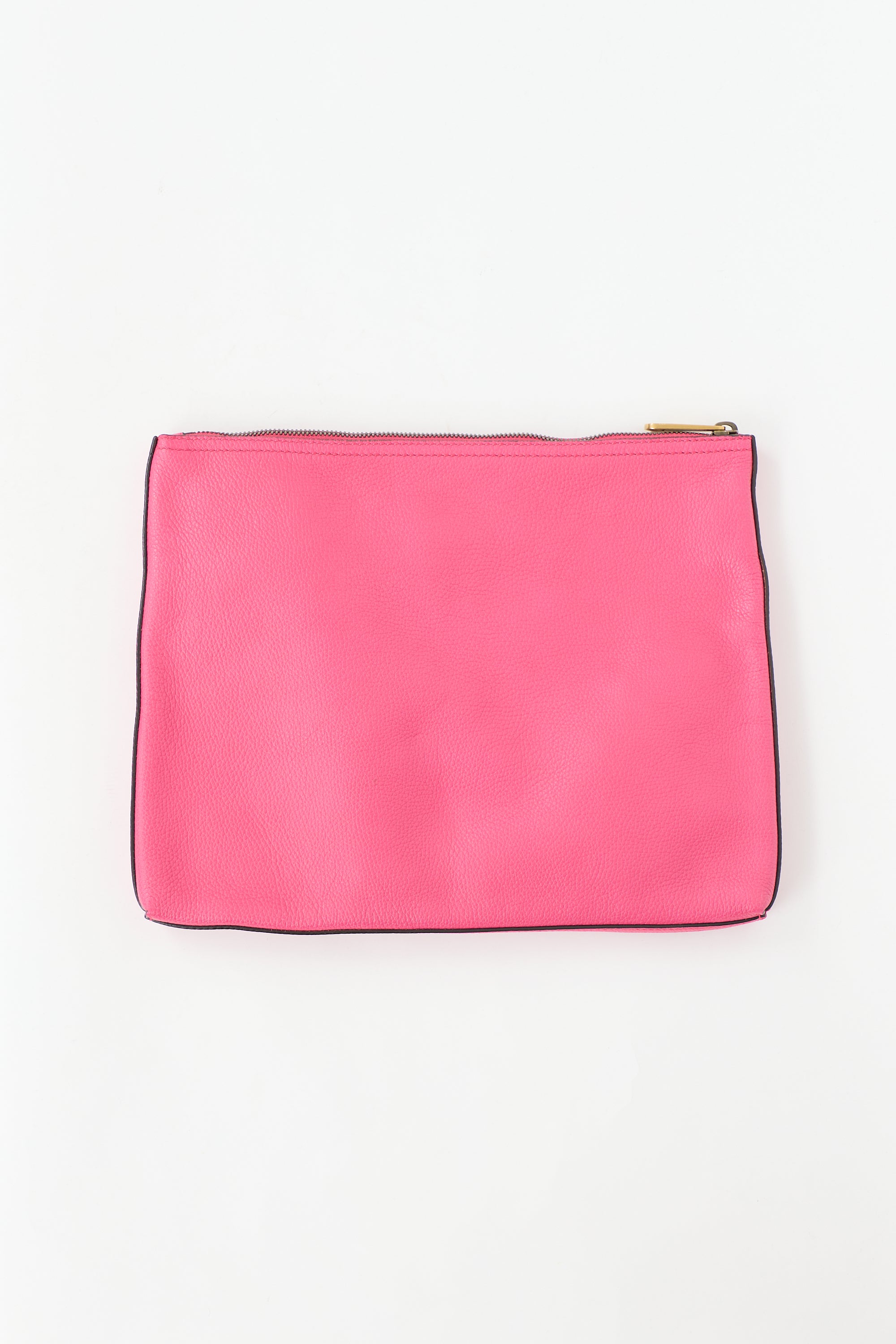 Pre-owned Gucci pink leather portfolio clutch featuring green and red printed logo at front, top zip closure, and one main compartment. Comes with original dust bag.