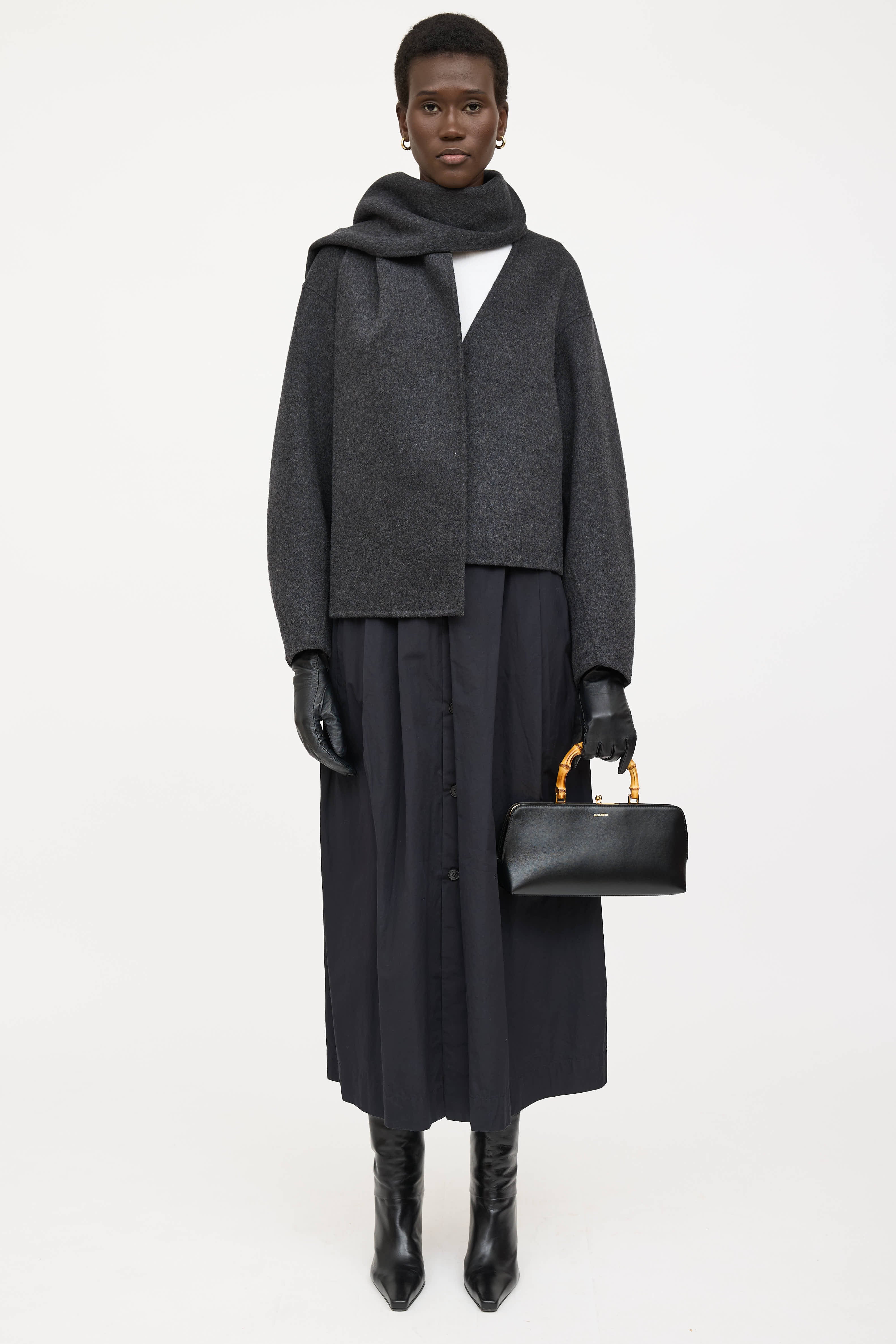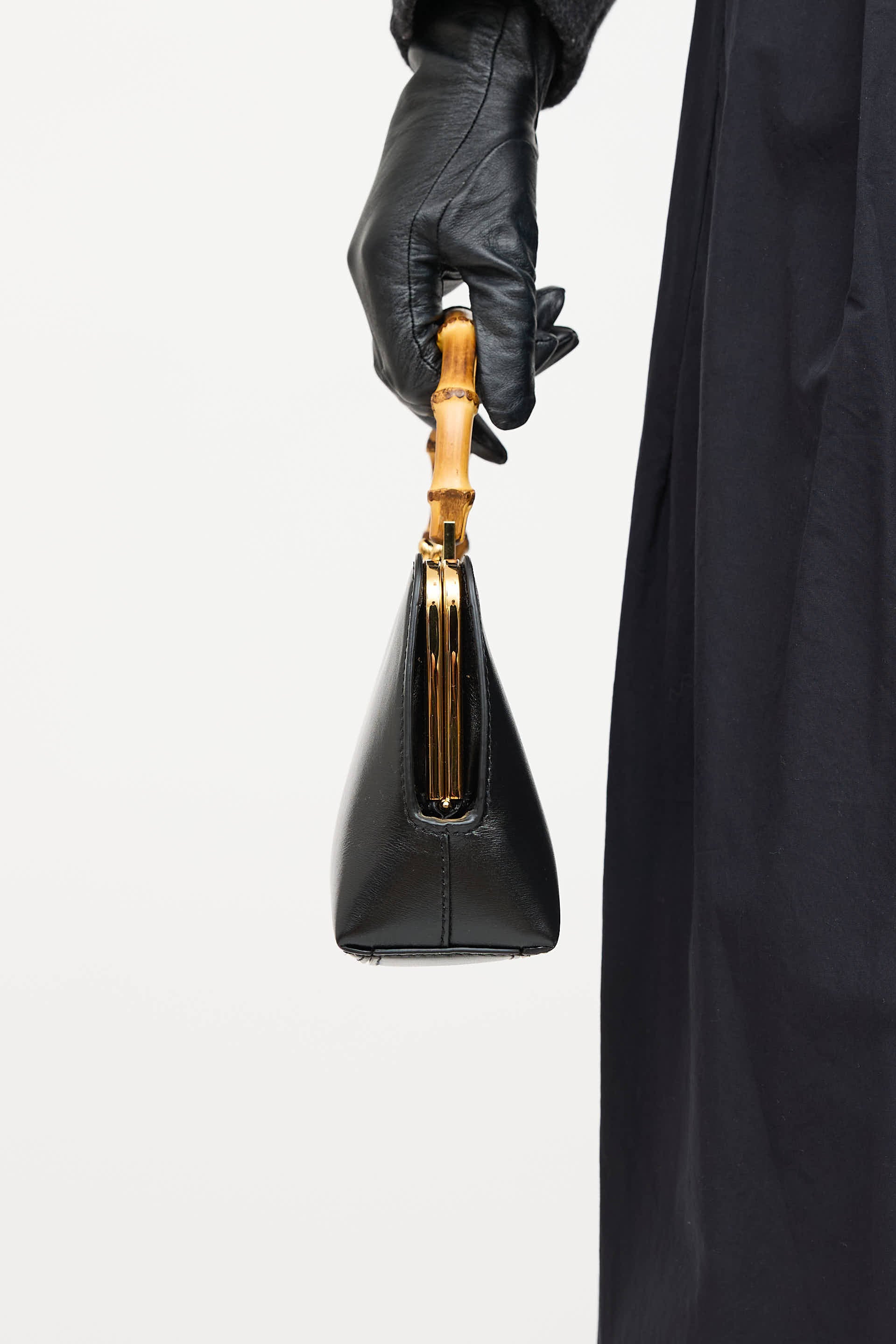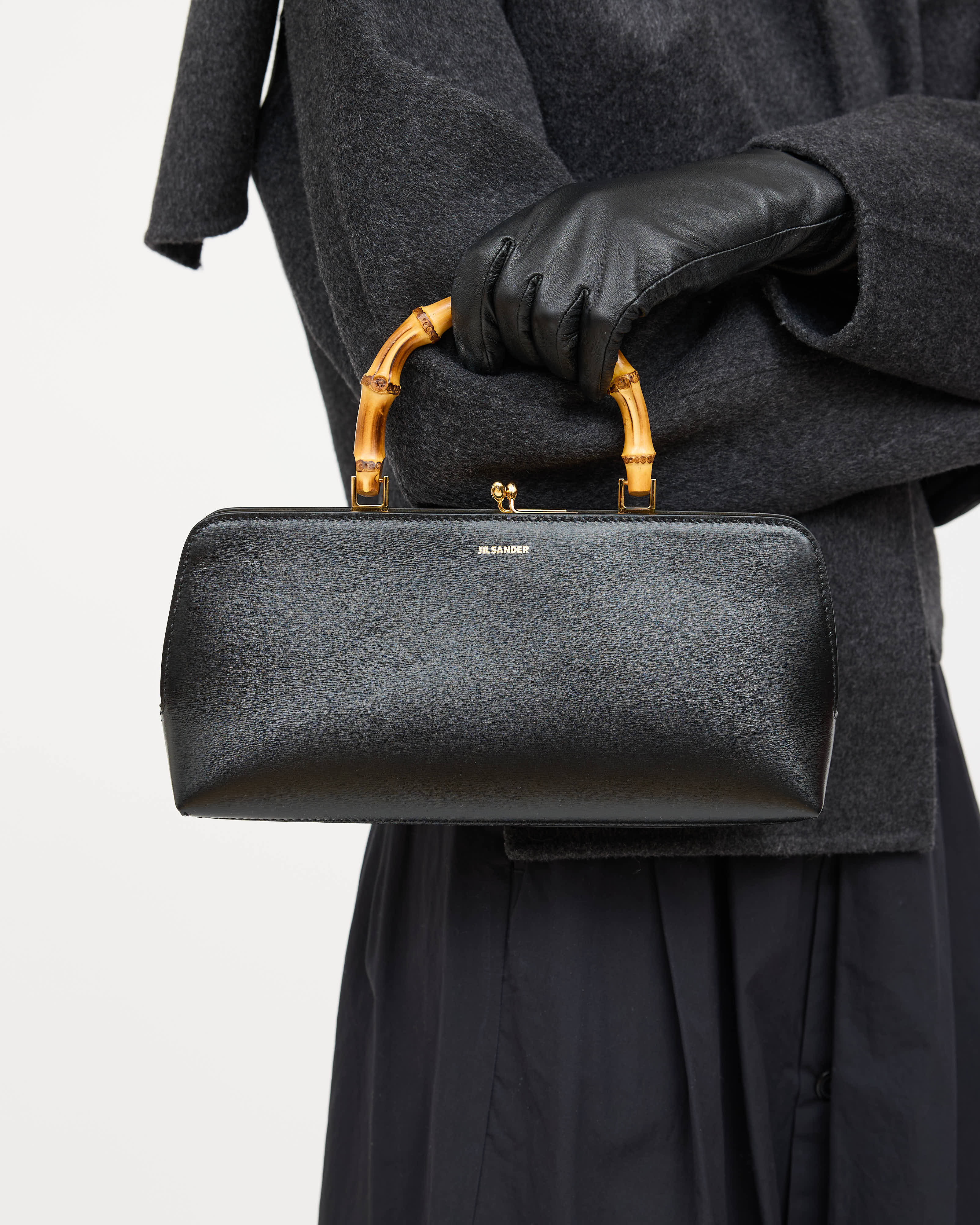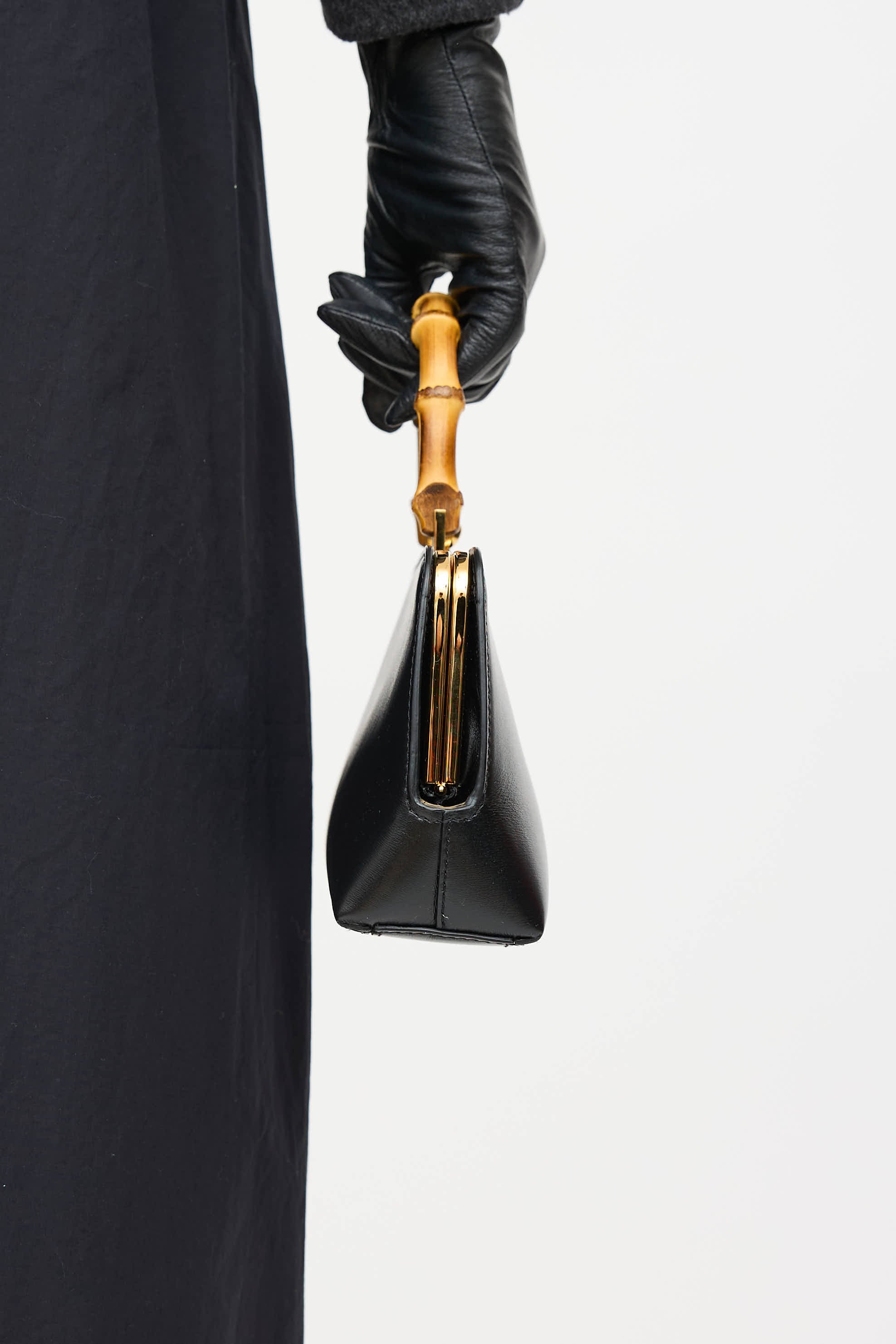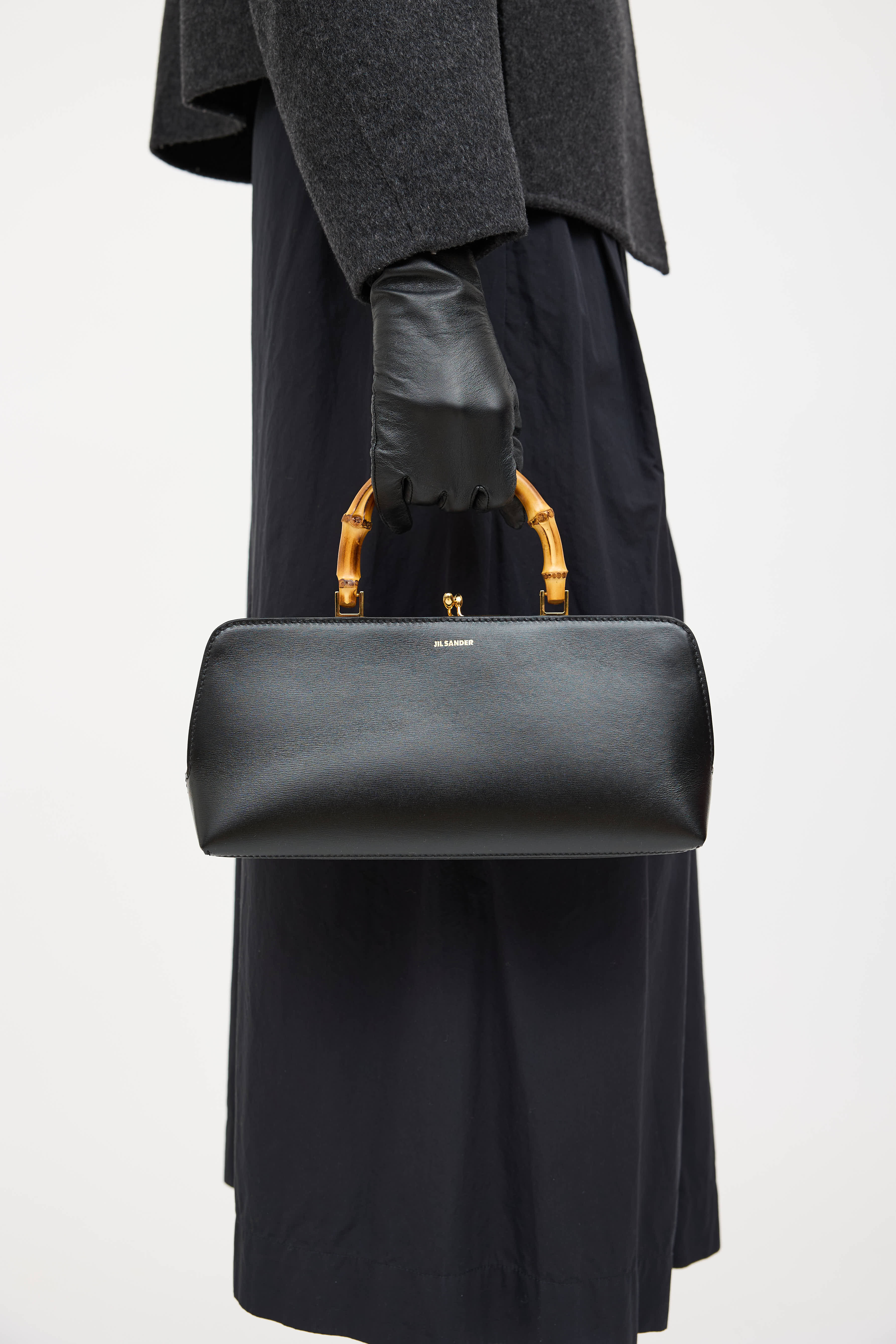 Pre-owned Jil Sander black leather Goji Bamboo Handle bag featuring kiss lock closure, gold tone hardware, bamboo top handle, and stamped logo at front.