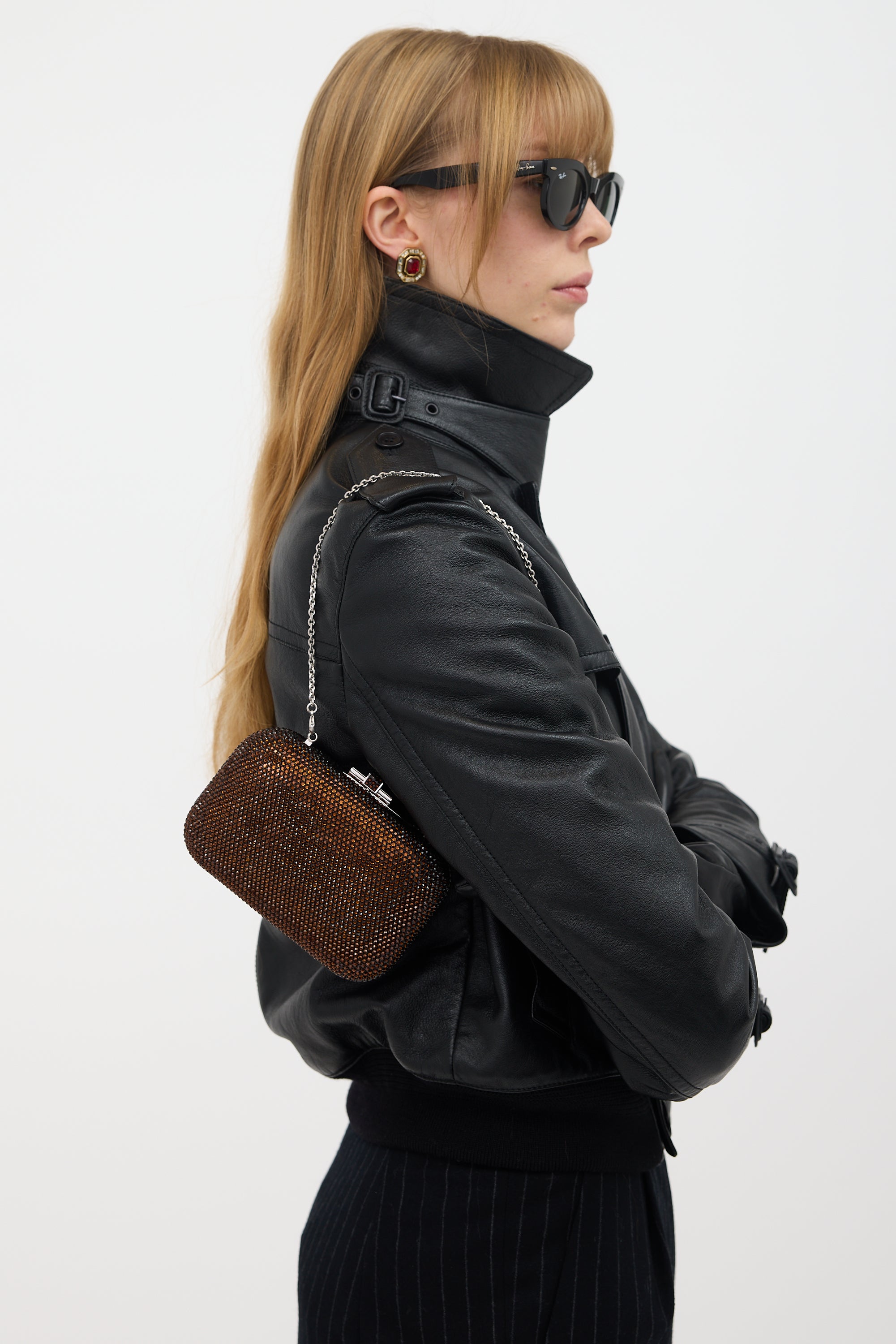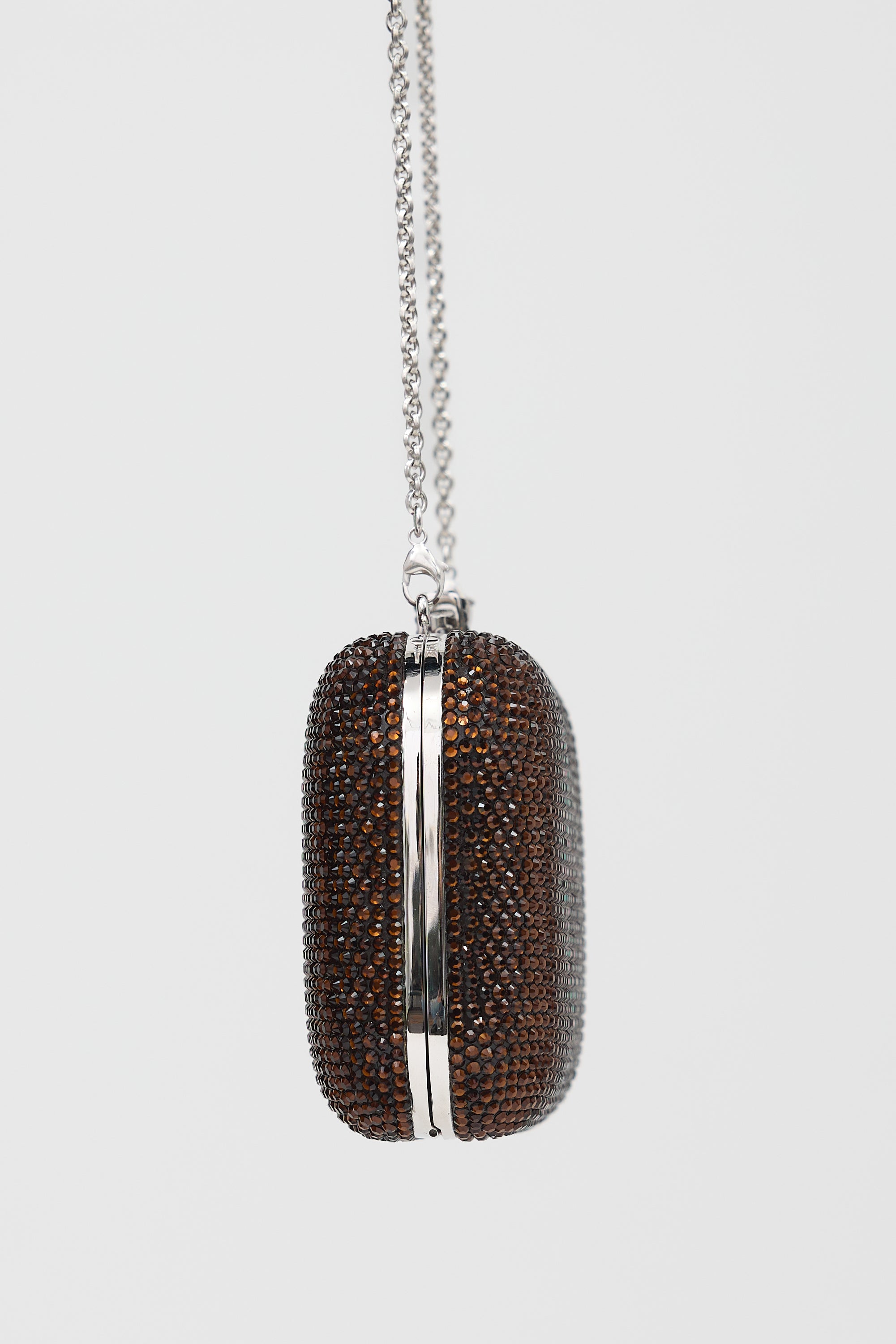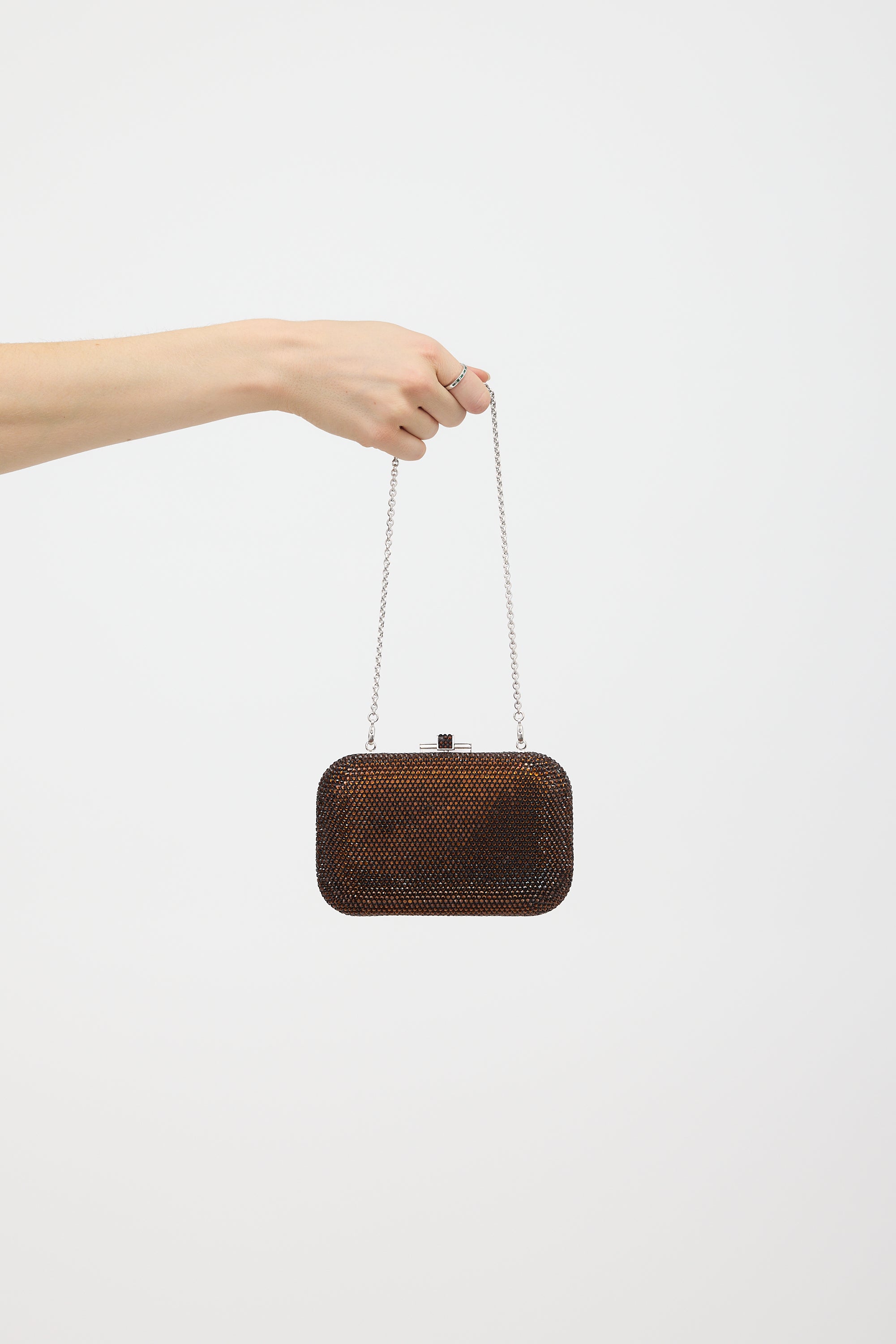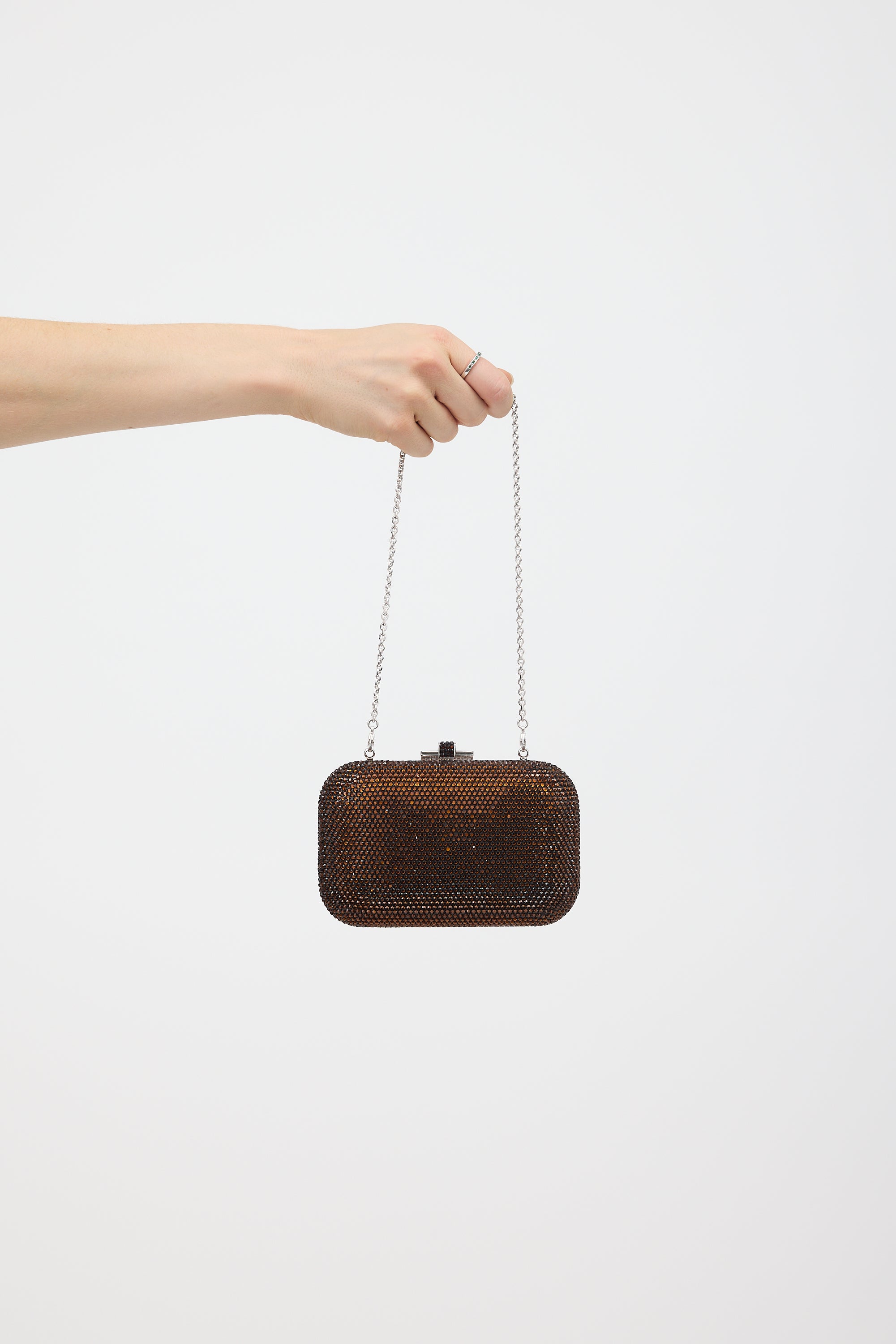 Pre-owned Judith Leiber clutch featuring brown crystal embellishments, detachable chain shoulder strap, slide lock closure, and metallic silver leather lined main compartment.