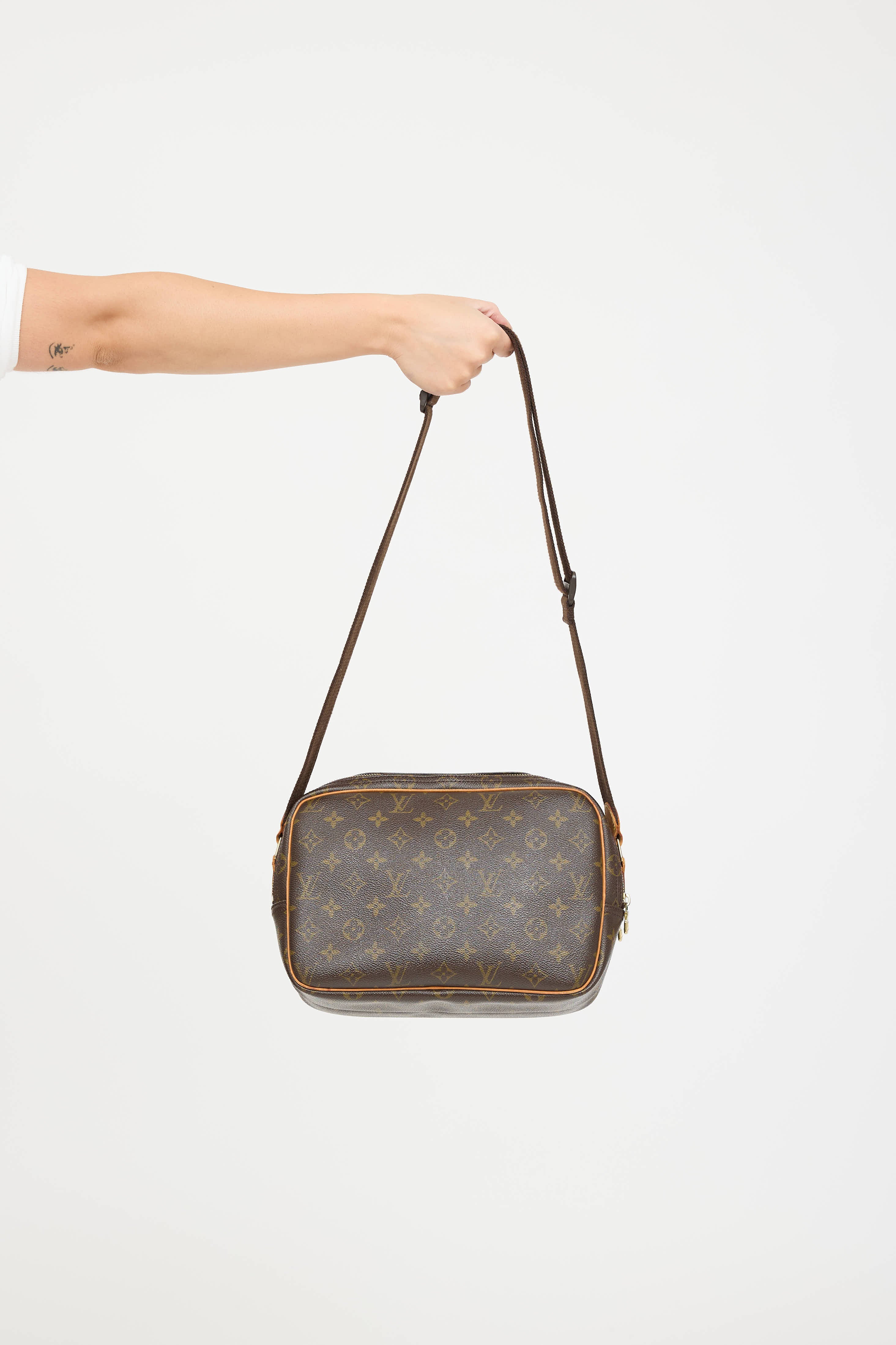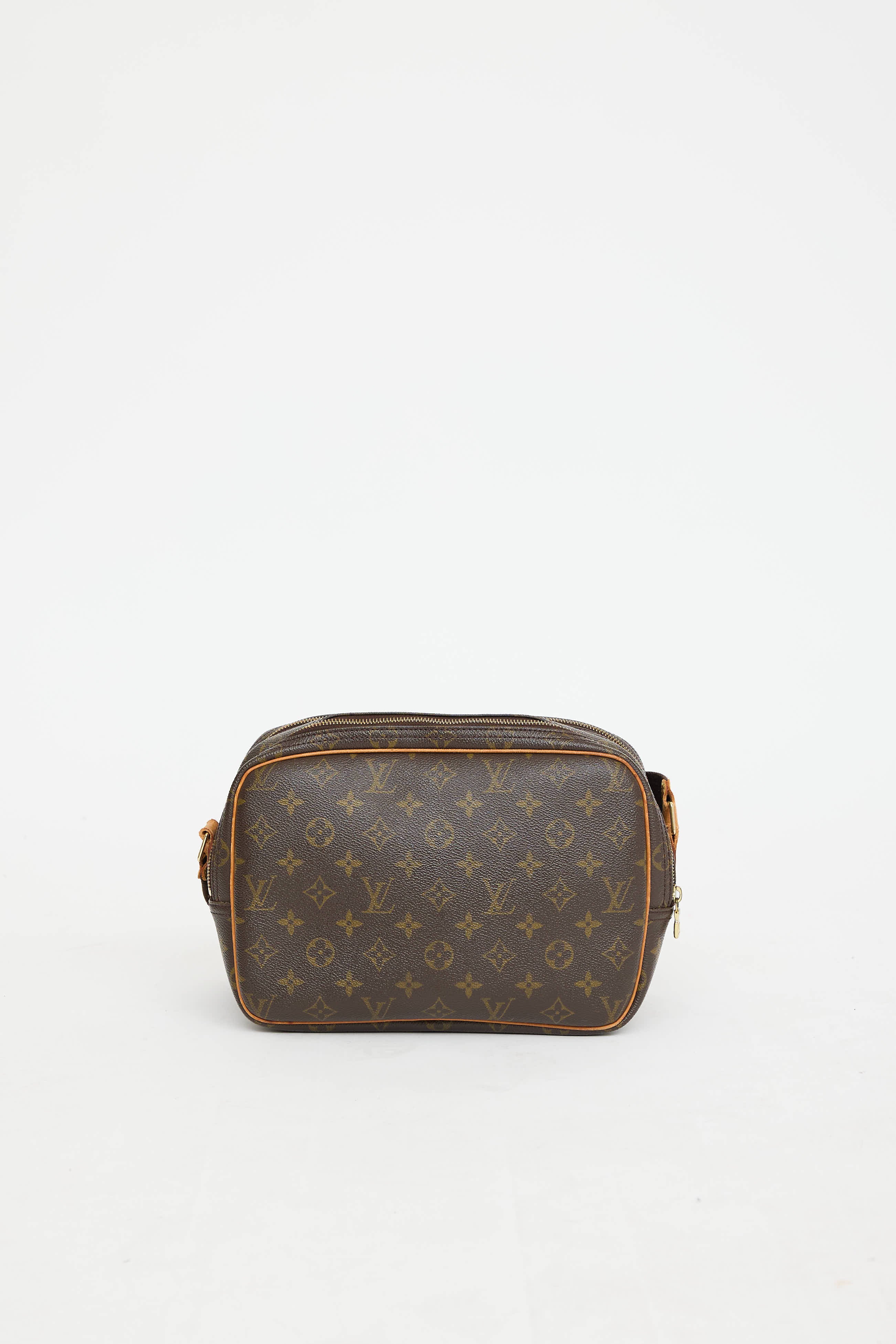 Pre-owned Louis Vuitton brown Reporter bag featuring flat webbed adjustable crossbody strap with leather trim, gold tone hardware, monogram print throughout, rolled edges, single slip pocket at front and zip closure top. Interior features two main compartments with single slip pocket in front compartment.