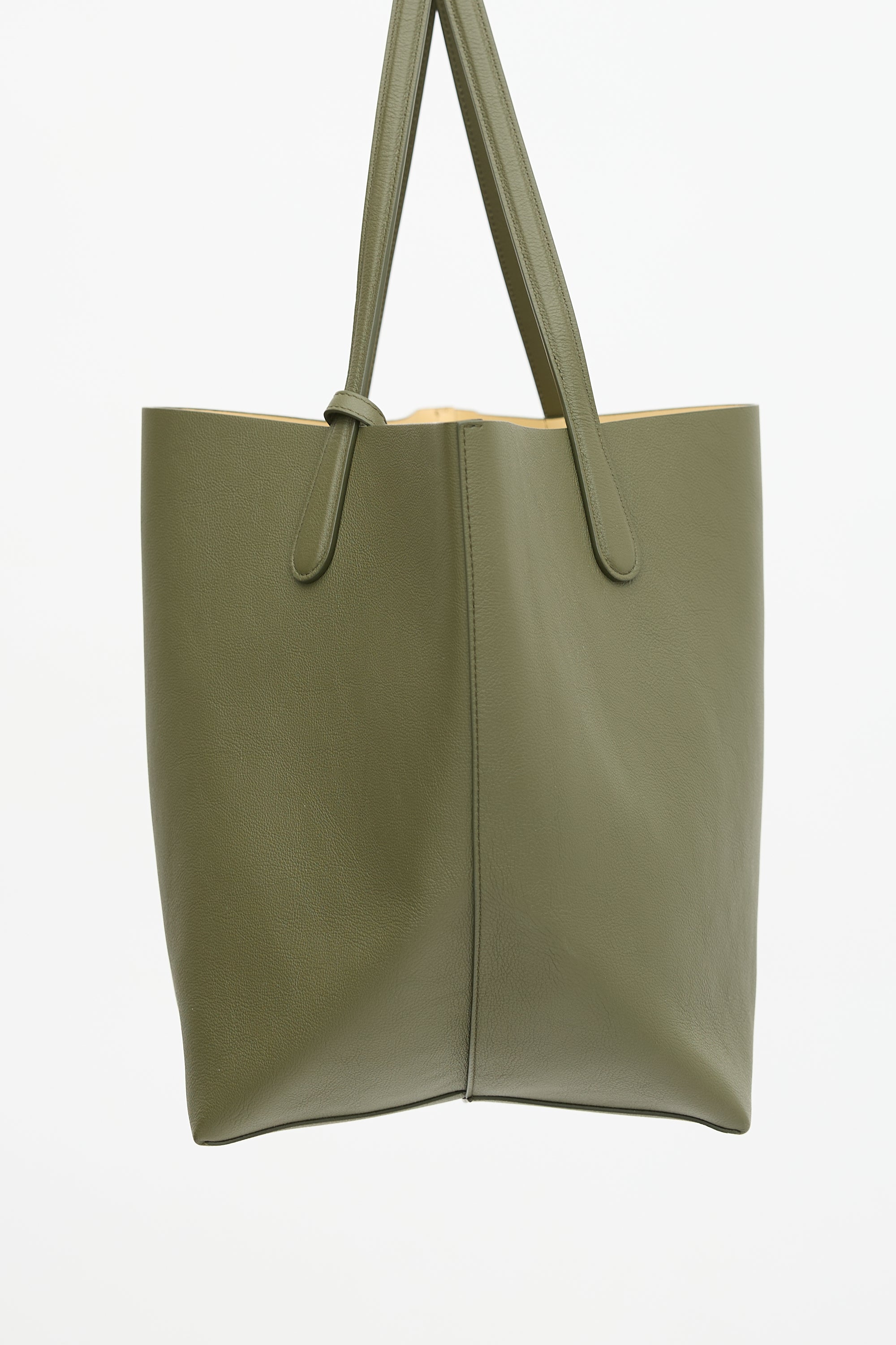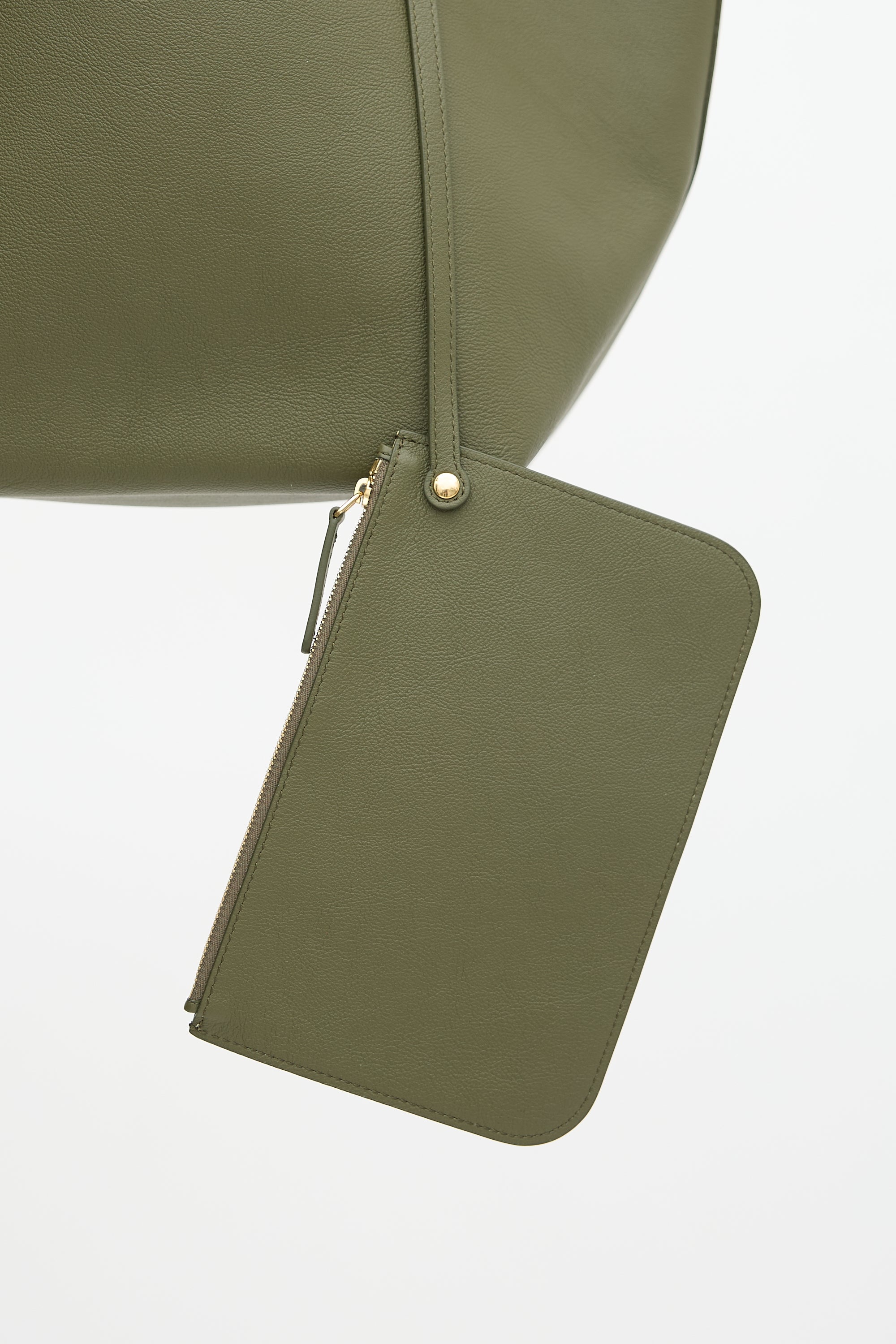 Pre-owned Mansur Gavriel green leather Everyday tote bag featuring dual flat shoulder straps, detachable zip pouch, open top, and one main compartment.
