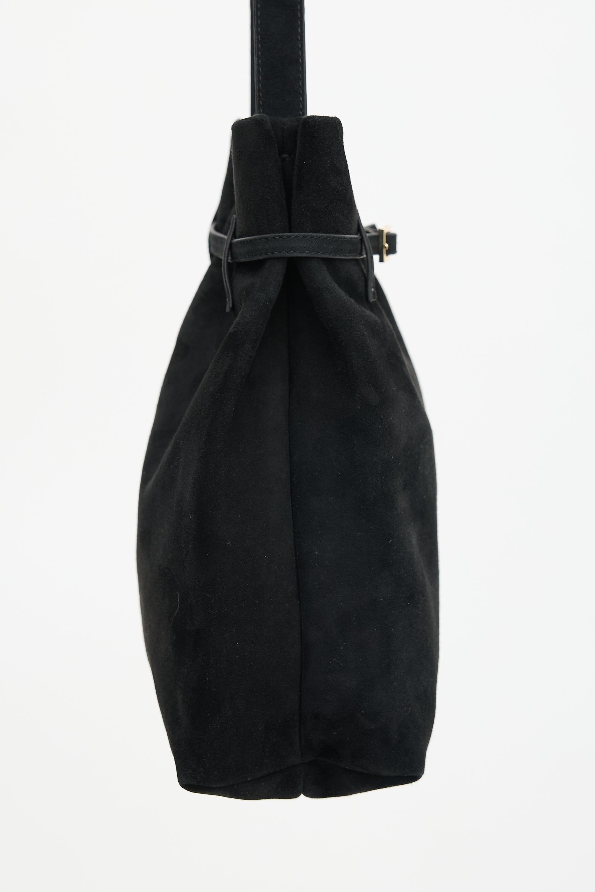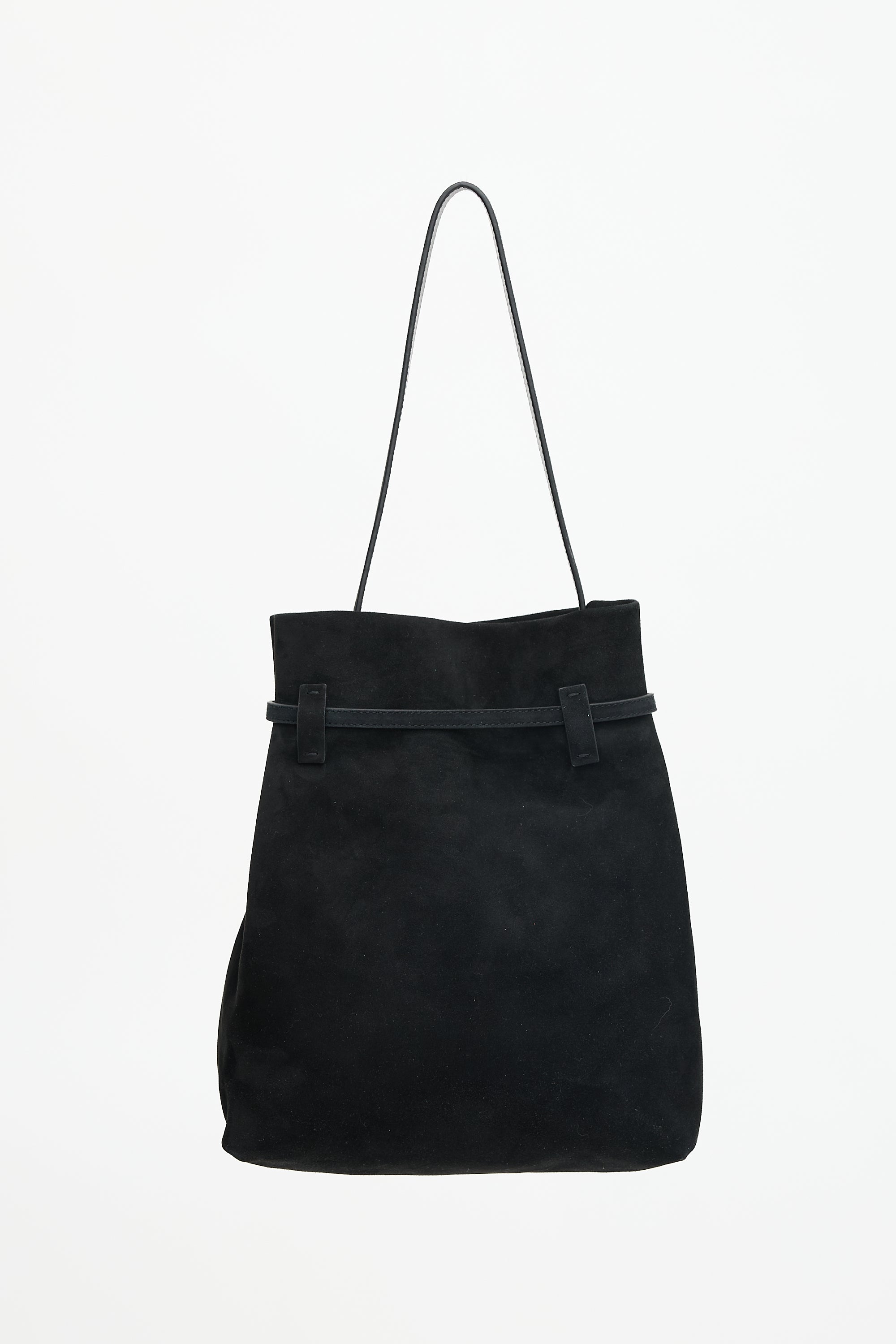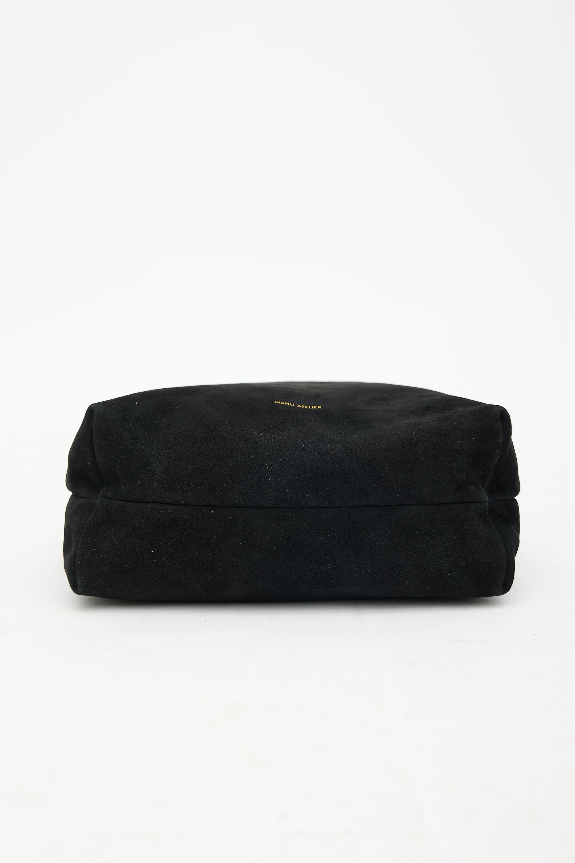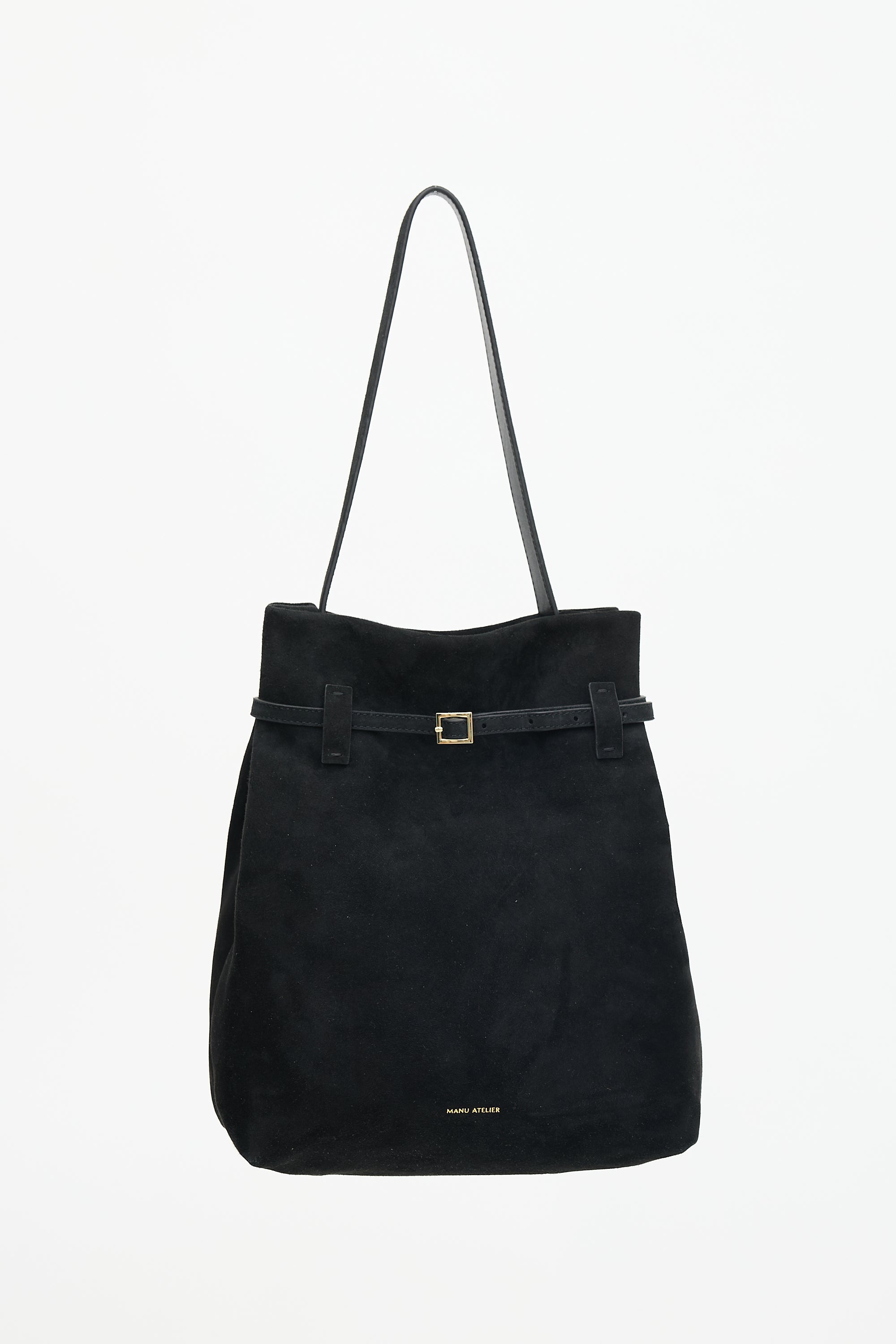 Pre-owned Manu Atelier black suede Tote Du Jour tote bag featuring a flat shoulder strap, wrap around belted top adjustment, open top with snap button closure, and one lined main compartment with one zip pocket. Comes with original dust bag.