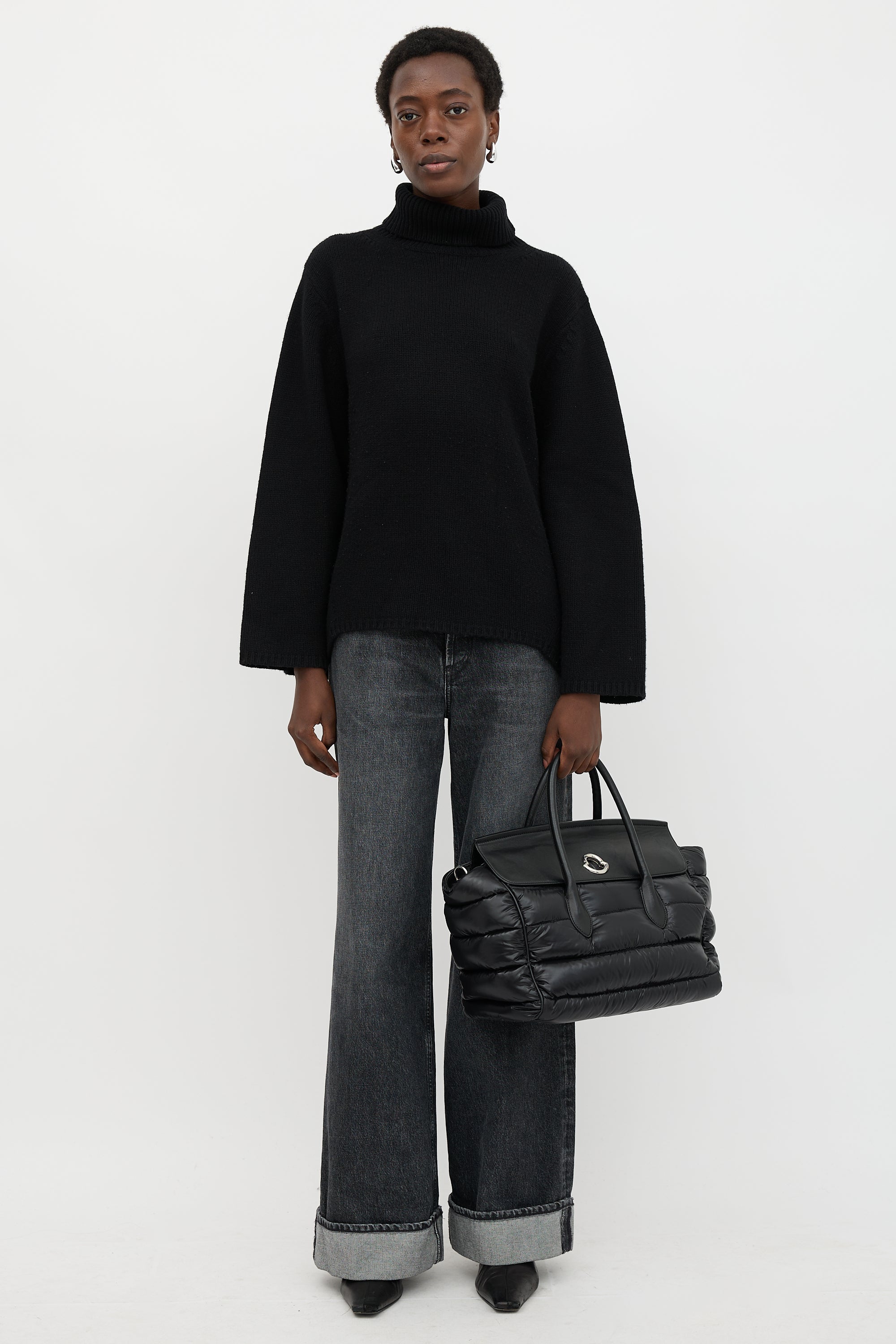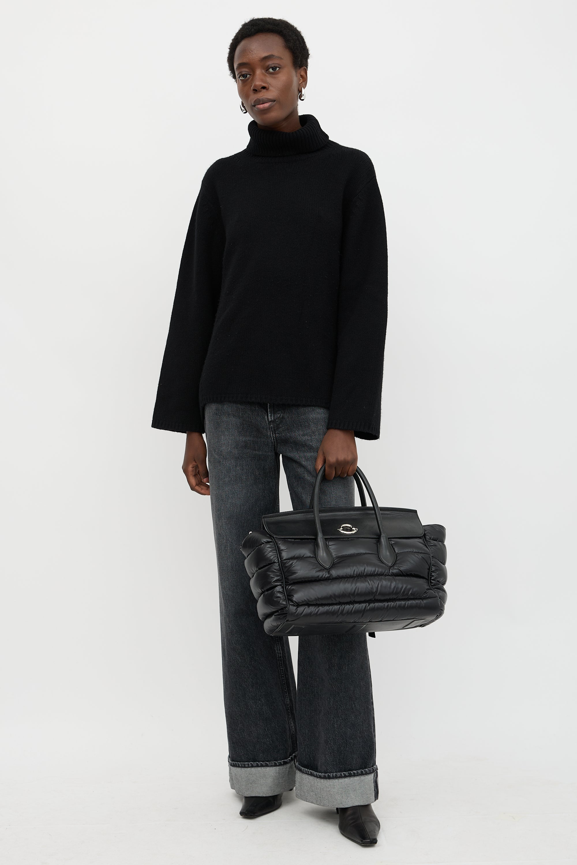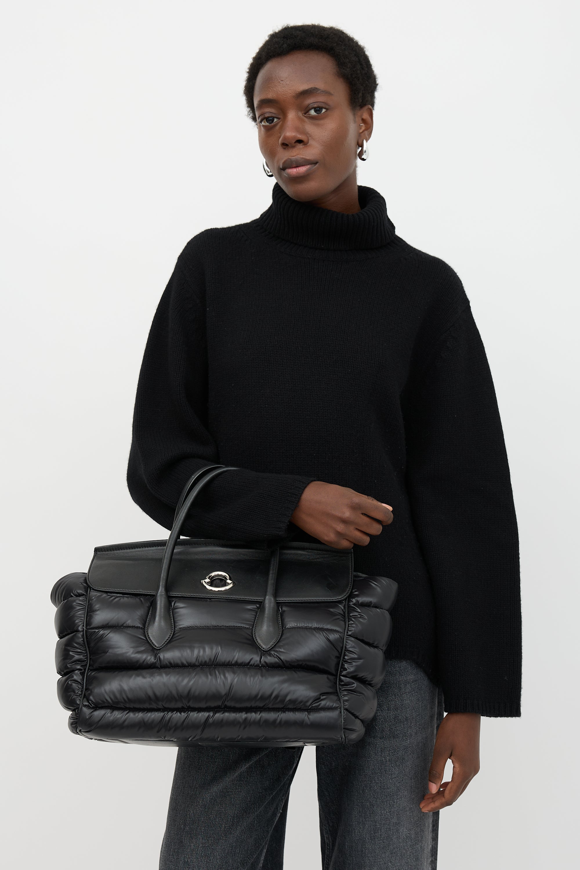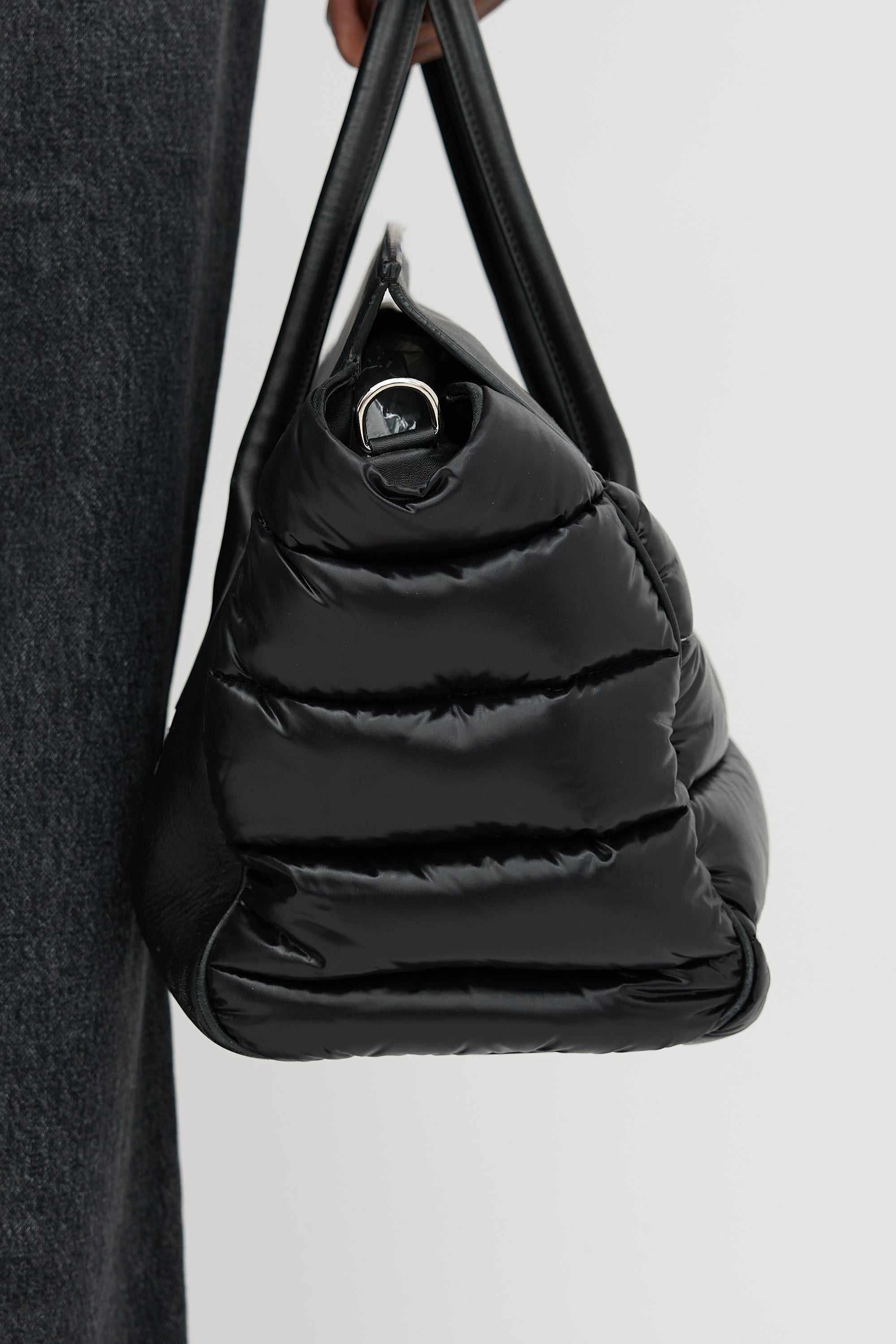 Pre-owned Moncler black nylon padded Evera tote bag featuring tonal leather panelling, dual rolled leather top handles, detachable and adjustable shoulder strap, front flap with logo cutout hardware, back zip pocket, and one lined main compartment with one zip pocket and one slip pocket.