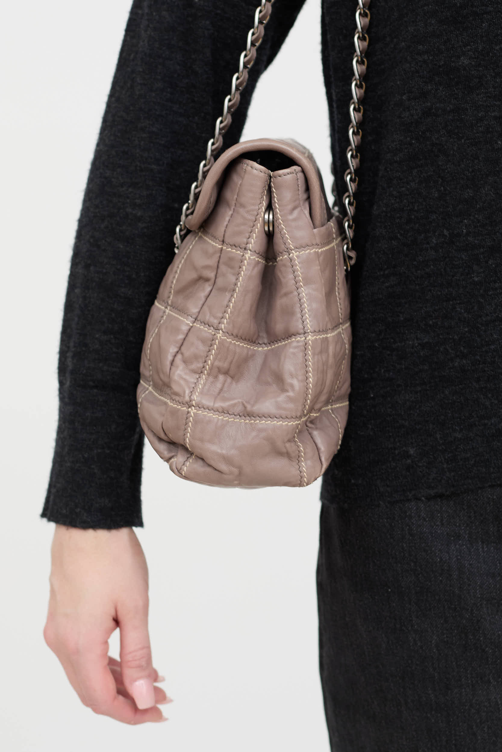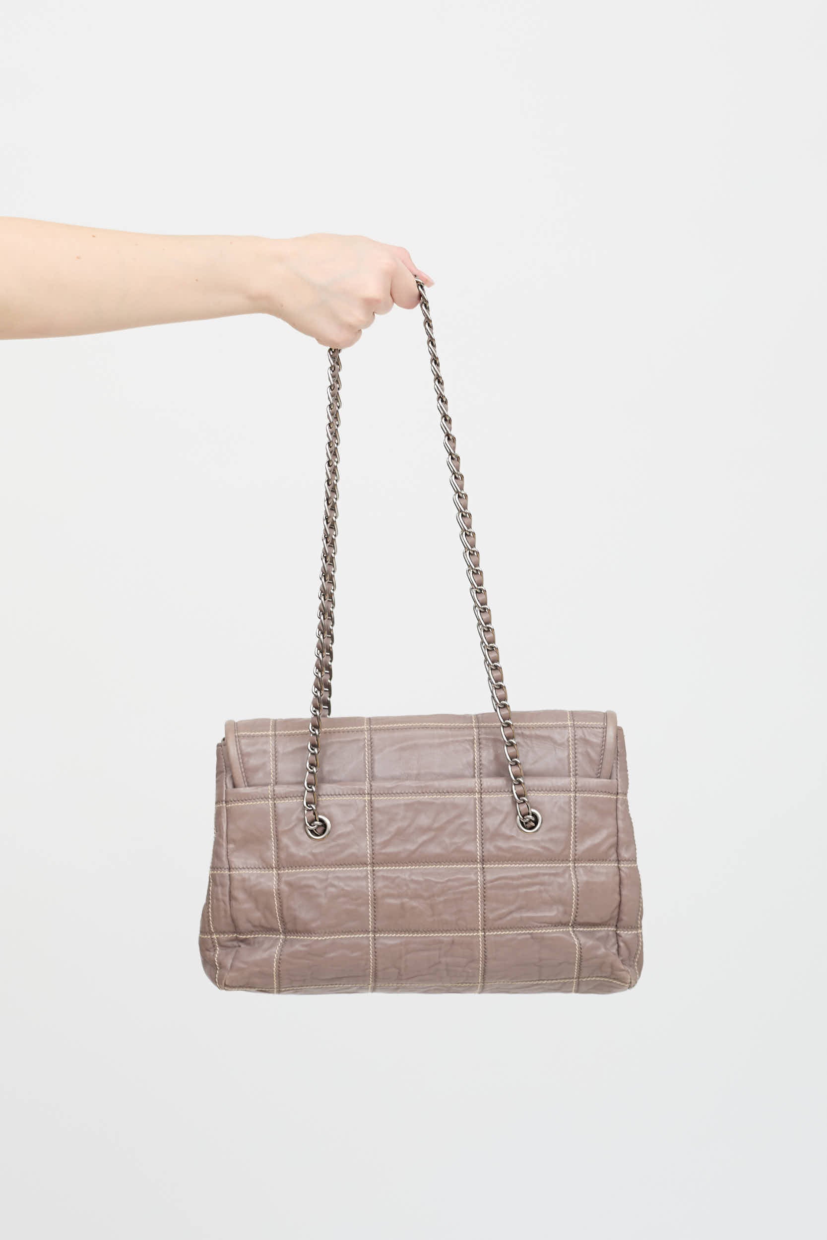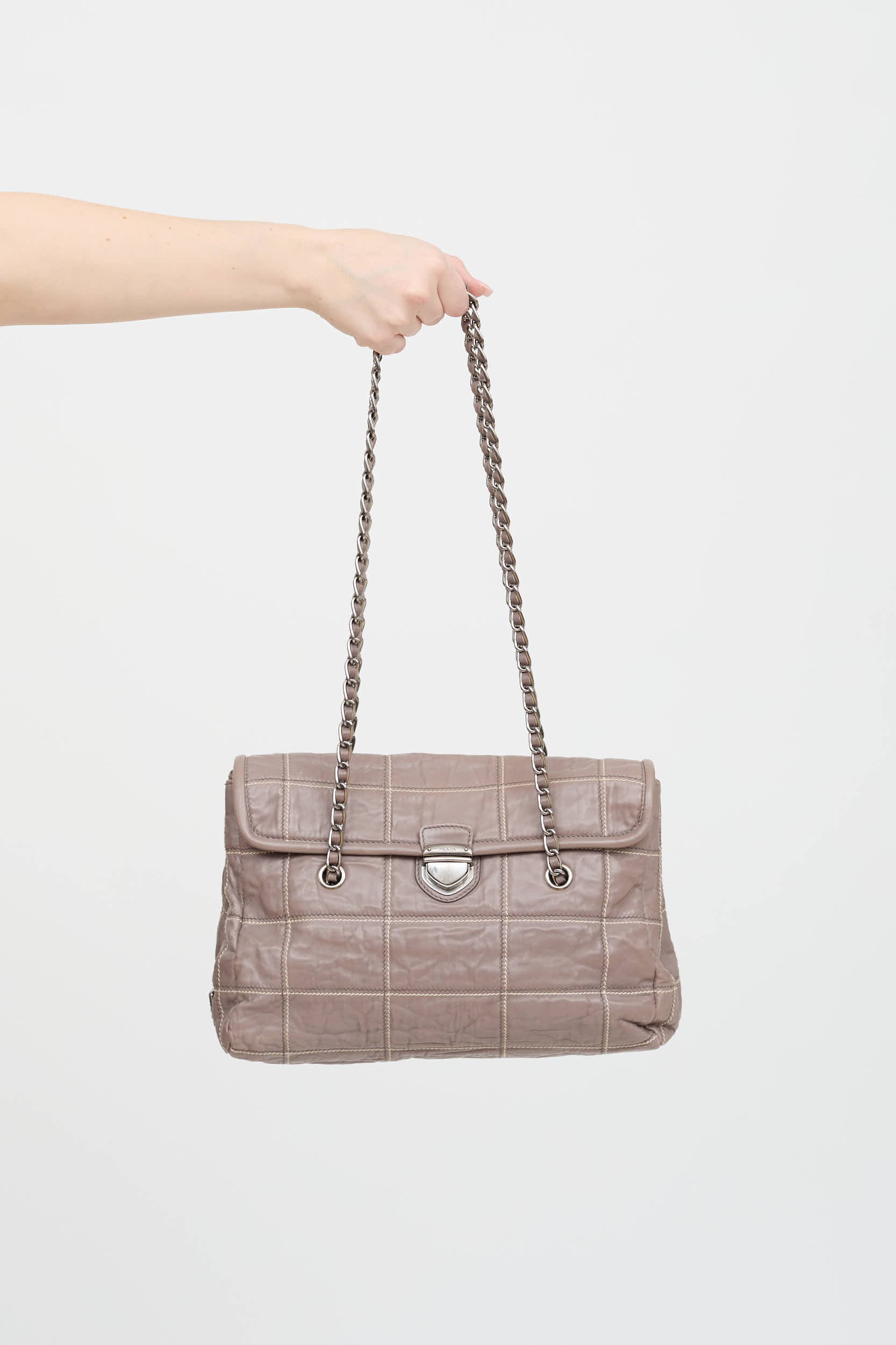 Pre-owned Prada grey nappa Antique Easy bag featuring dual braided leather and chain shoulder strap, slip pocket with magentic closure at back, contrast stitch detailing, gun tone hardware, triangle logo plaque at side, top flap with embossed logo at interior, push lock closure, two main compartments, zip pocket divider at middle, two slip pockets, and one zip pocket.