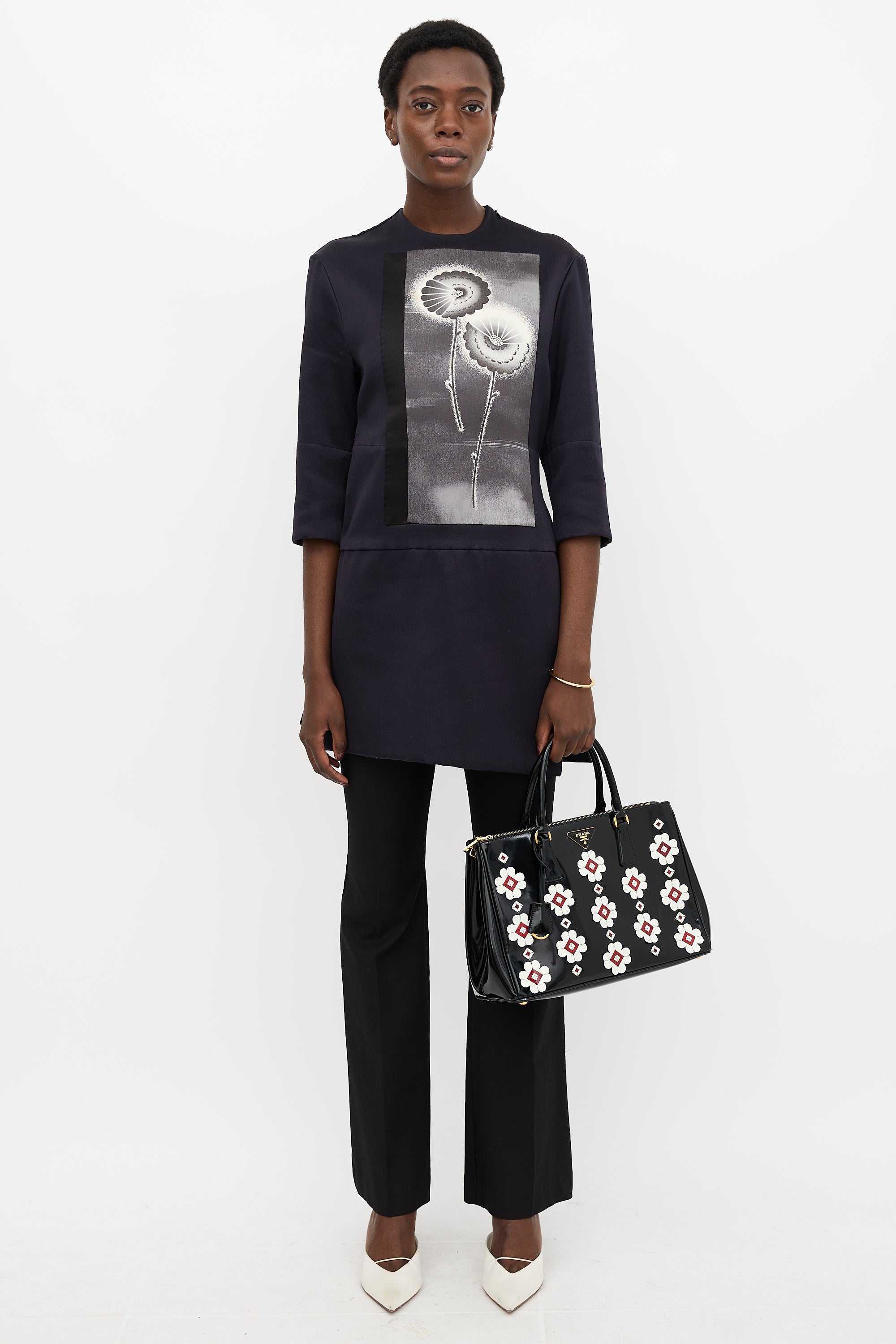 Pre-owned Prada black patent Galleria bag featuring two rolled top handles, gold tone hardware, signature triangle logo plaque at front, metal protective feet, detachable clochette, extendable sides with snap button fastening, white and burgundy floral patches, one middle compartment with one zip pockets and three slip pockets, and two zip compartments. Includes original dust bag.