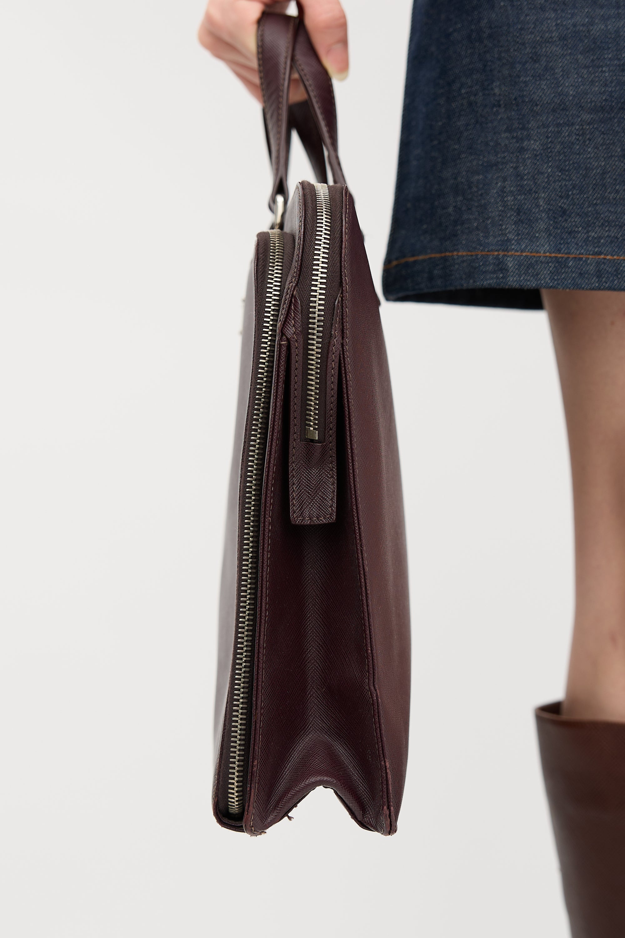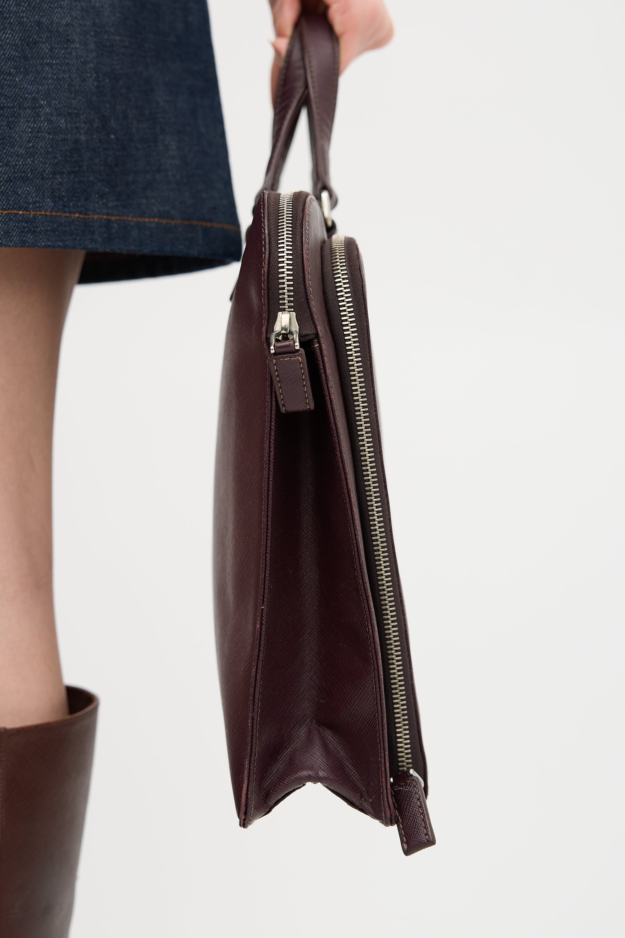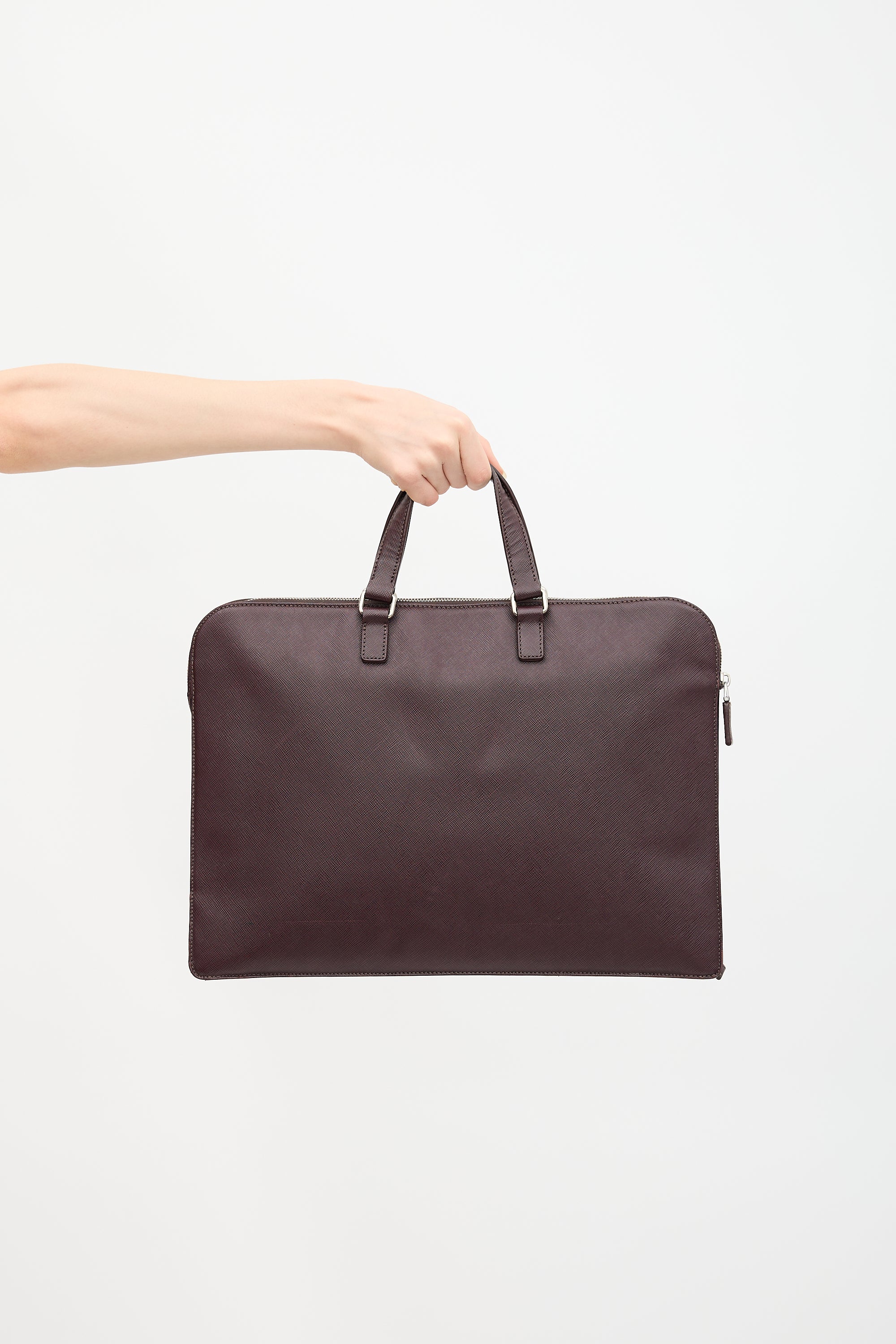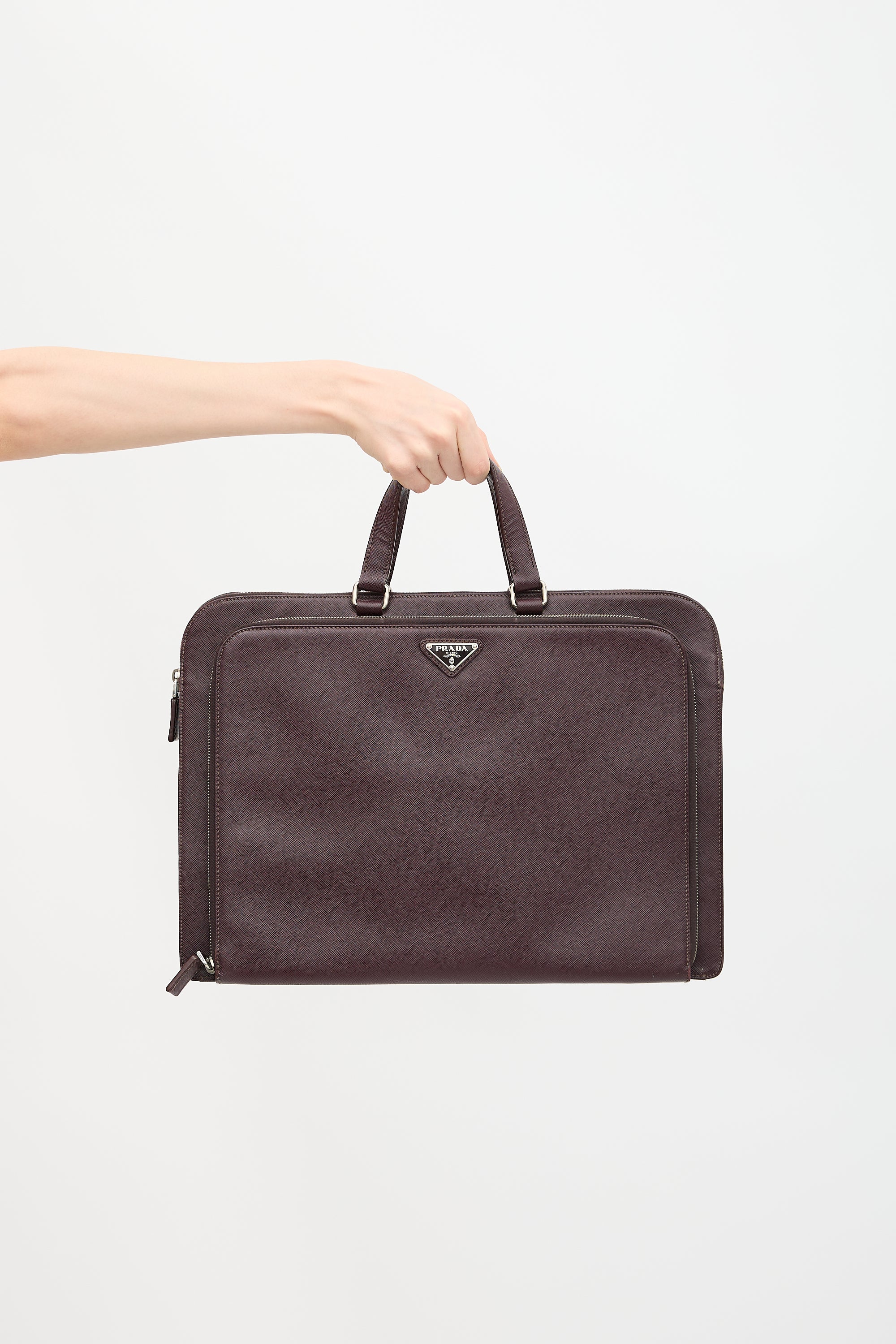 Pre-owned Prada burgundy saffiano leather briefcase featuring tonal stitching, signature triangle logo plaque at front, front zip compartment with fourteen slip pockets and three pen holders, top zip closure, and one lined main compartment with one zip pocket.