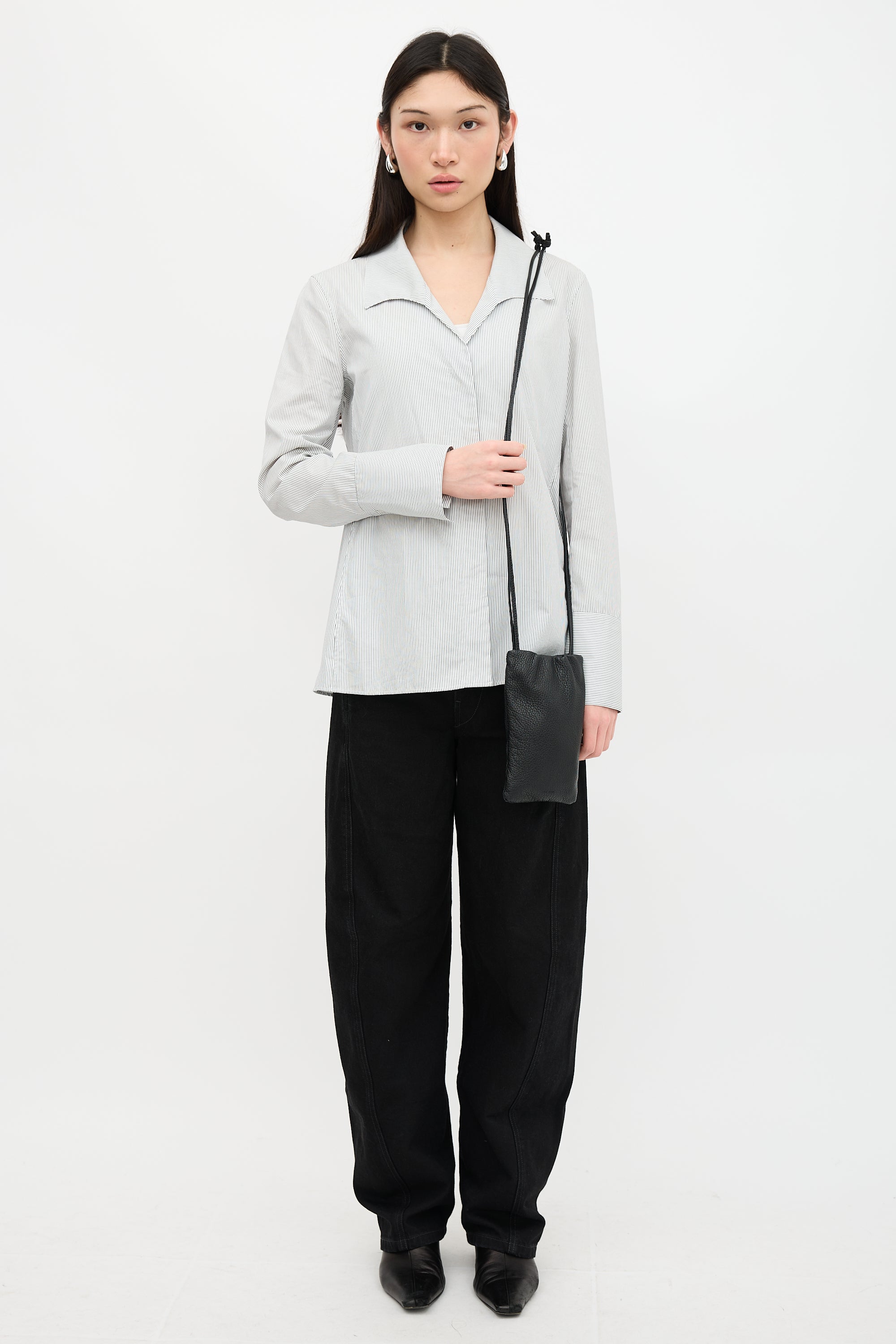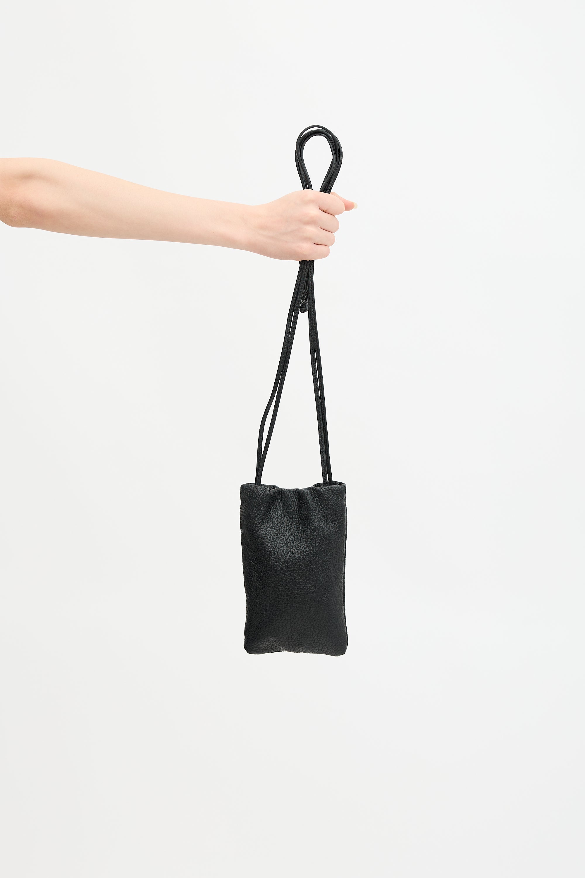 Pre-owned The Row black leather Bourse Phone Case bag featuring stamped logo at bottom centre front, dual knotted crossbody straps, magnetic top closure, and one lined main compartment.