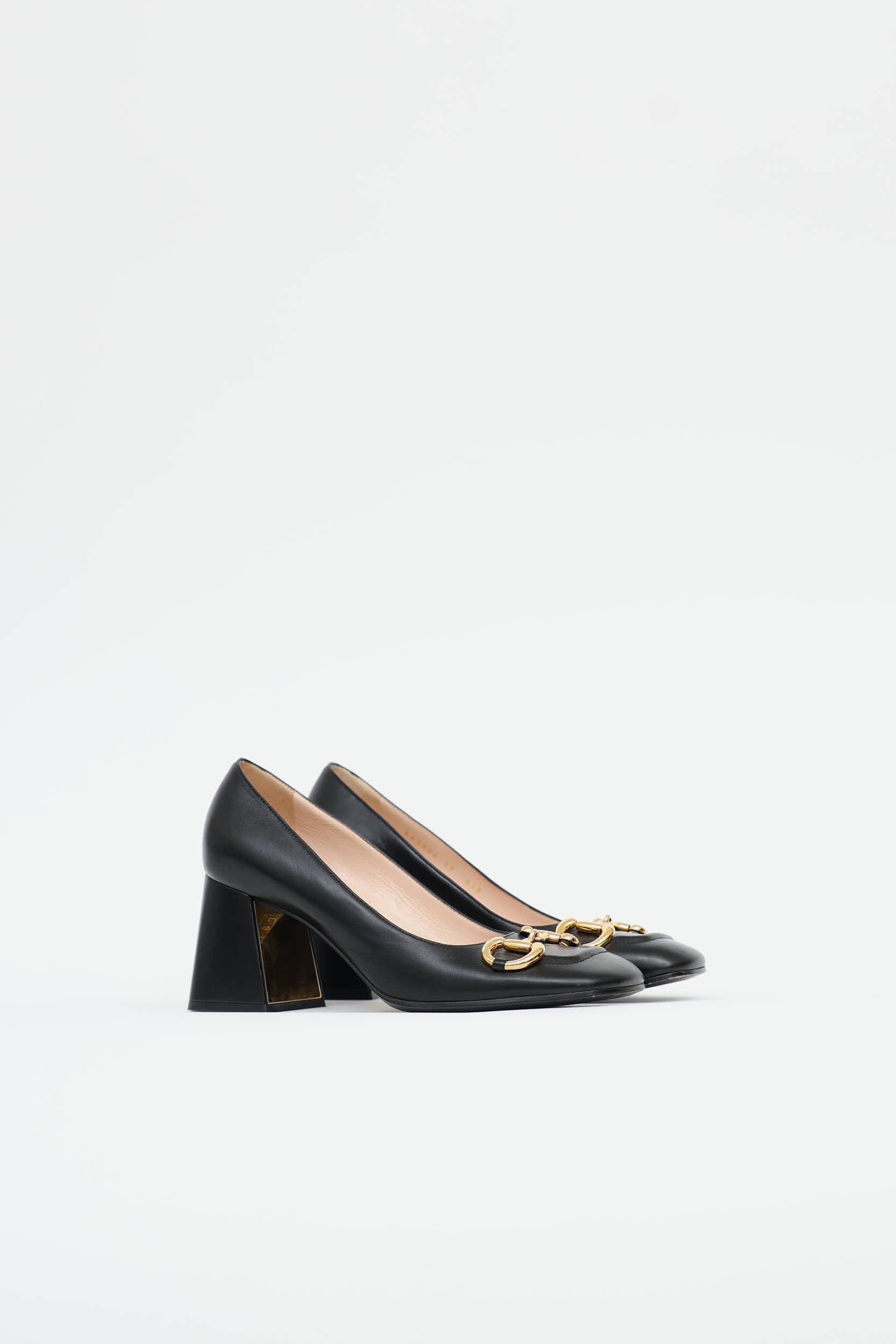 Pre-owned Gucci black Malaga heels featuring a square toe, gold tone horsebit hardware at vamp, and wrapped block heel with gold tone hardware.