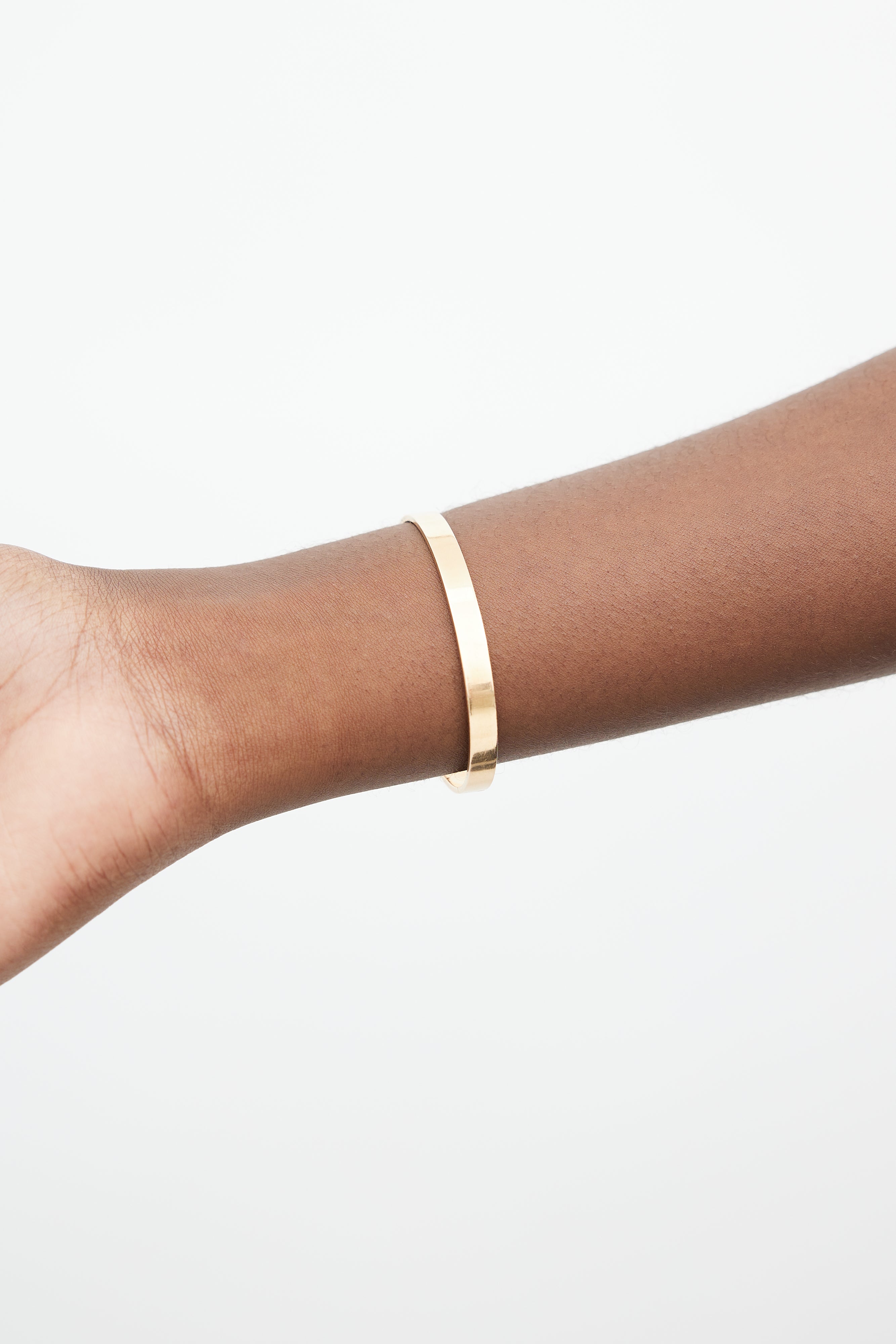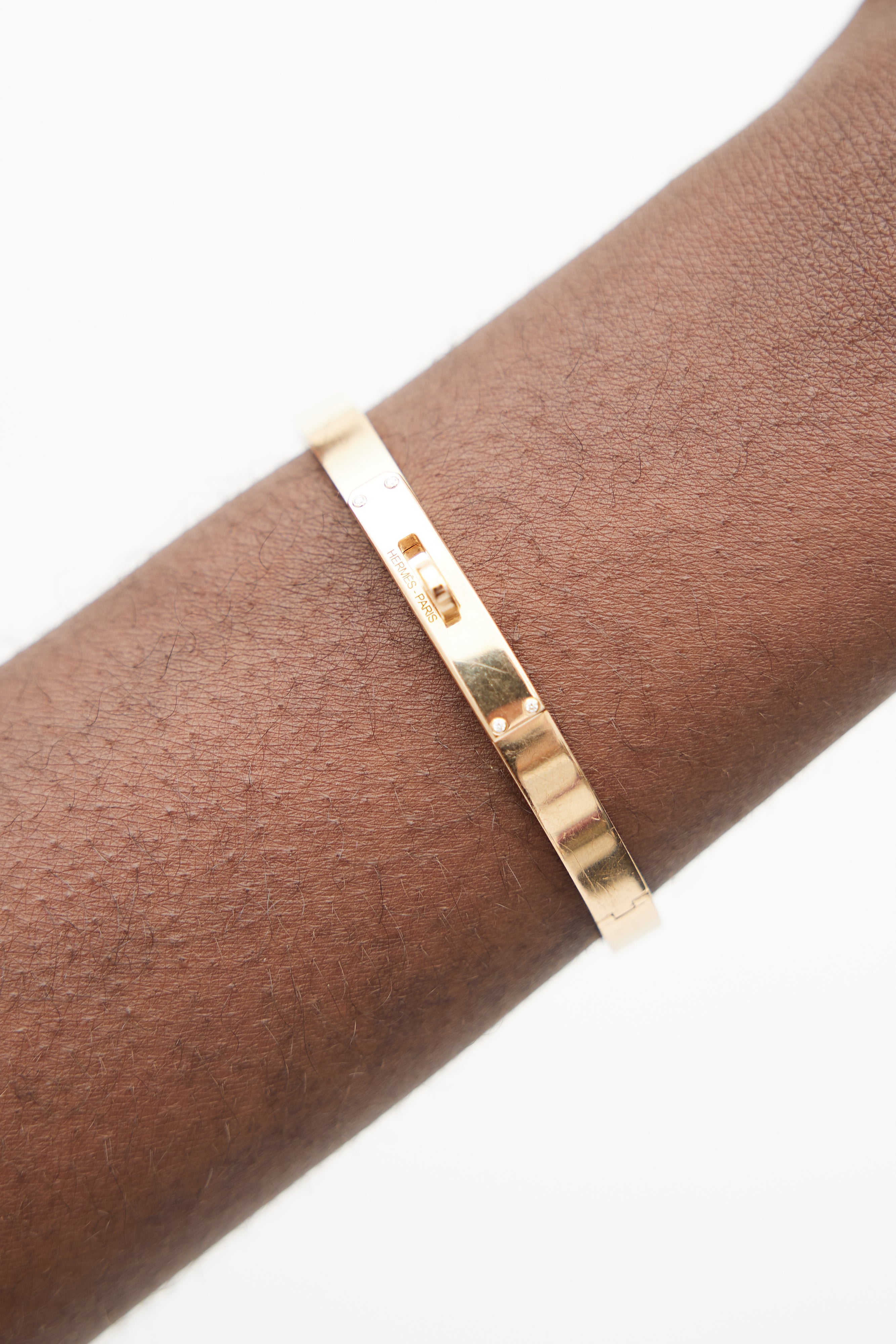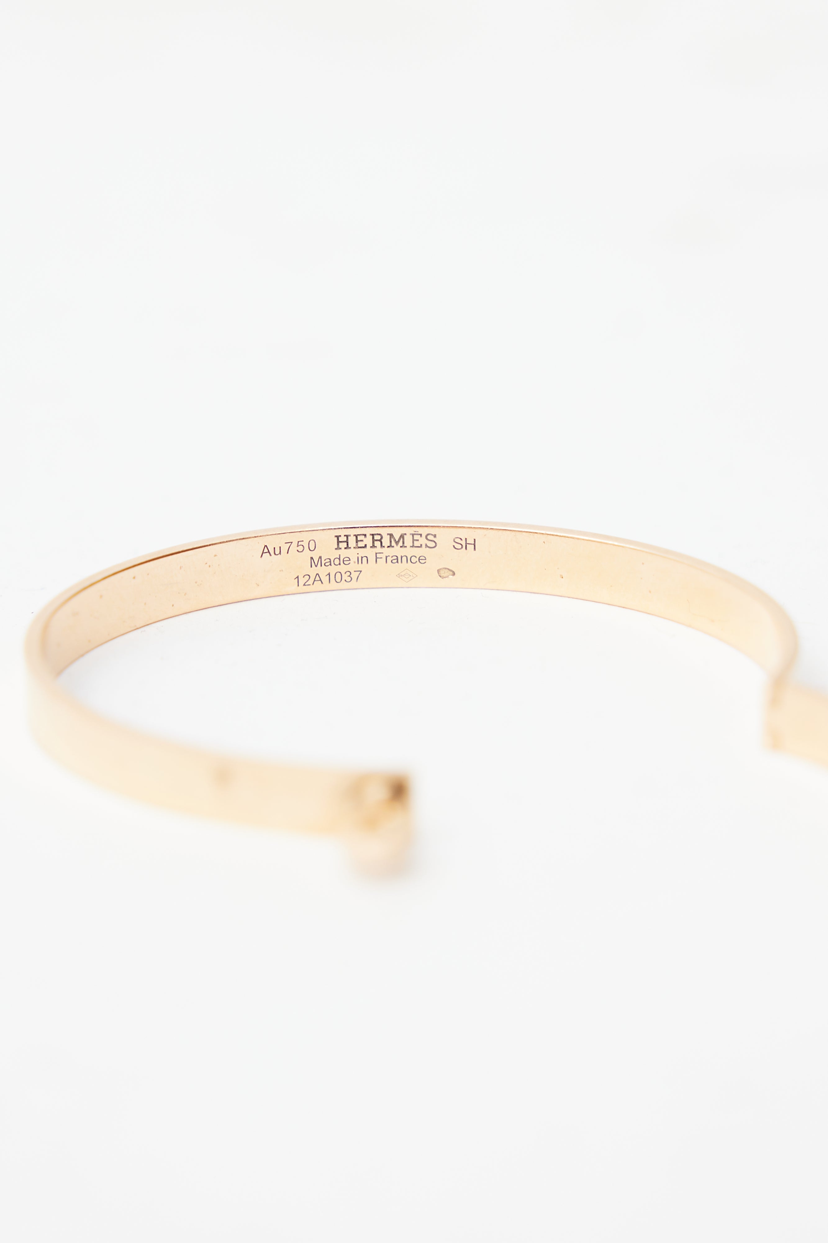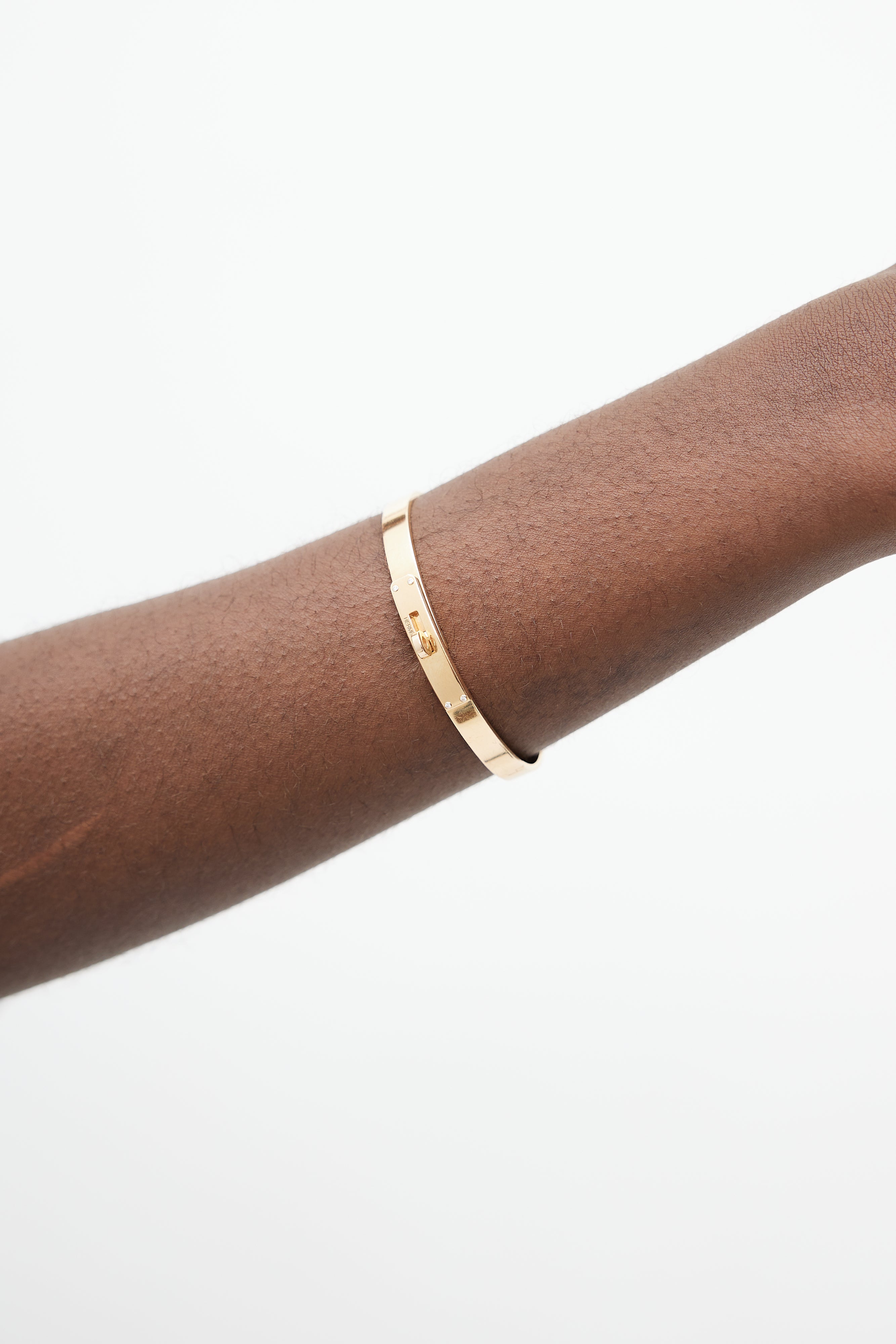 Pre-owned Hermès 18k gold bracelet featuring signature Kelly turn lock at front, diamond embellishment at face, hinge closure, and engraved logo inside.