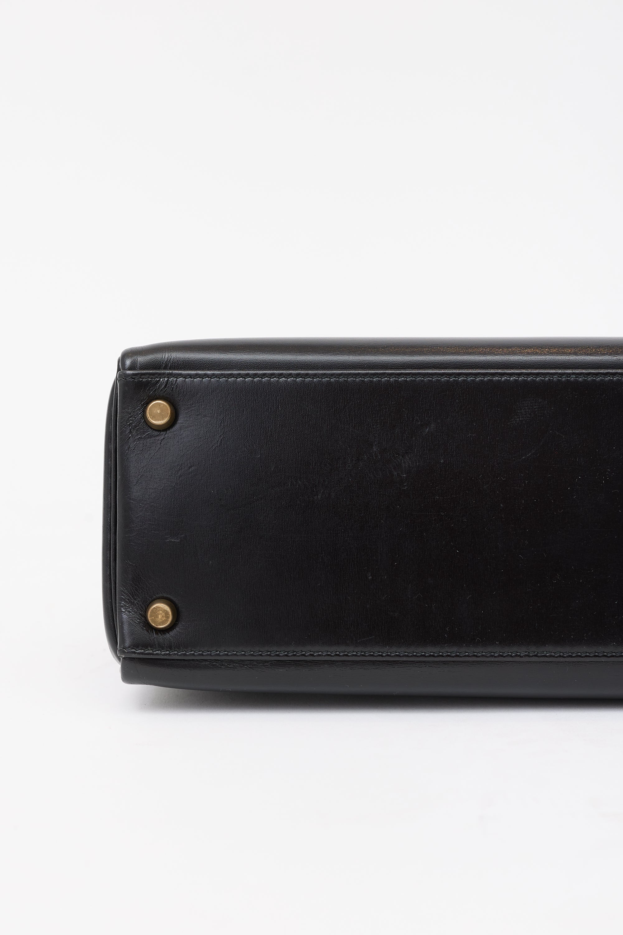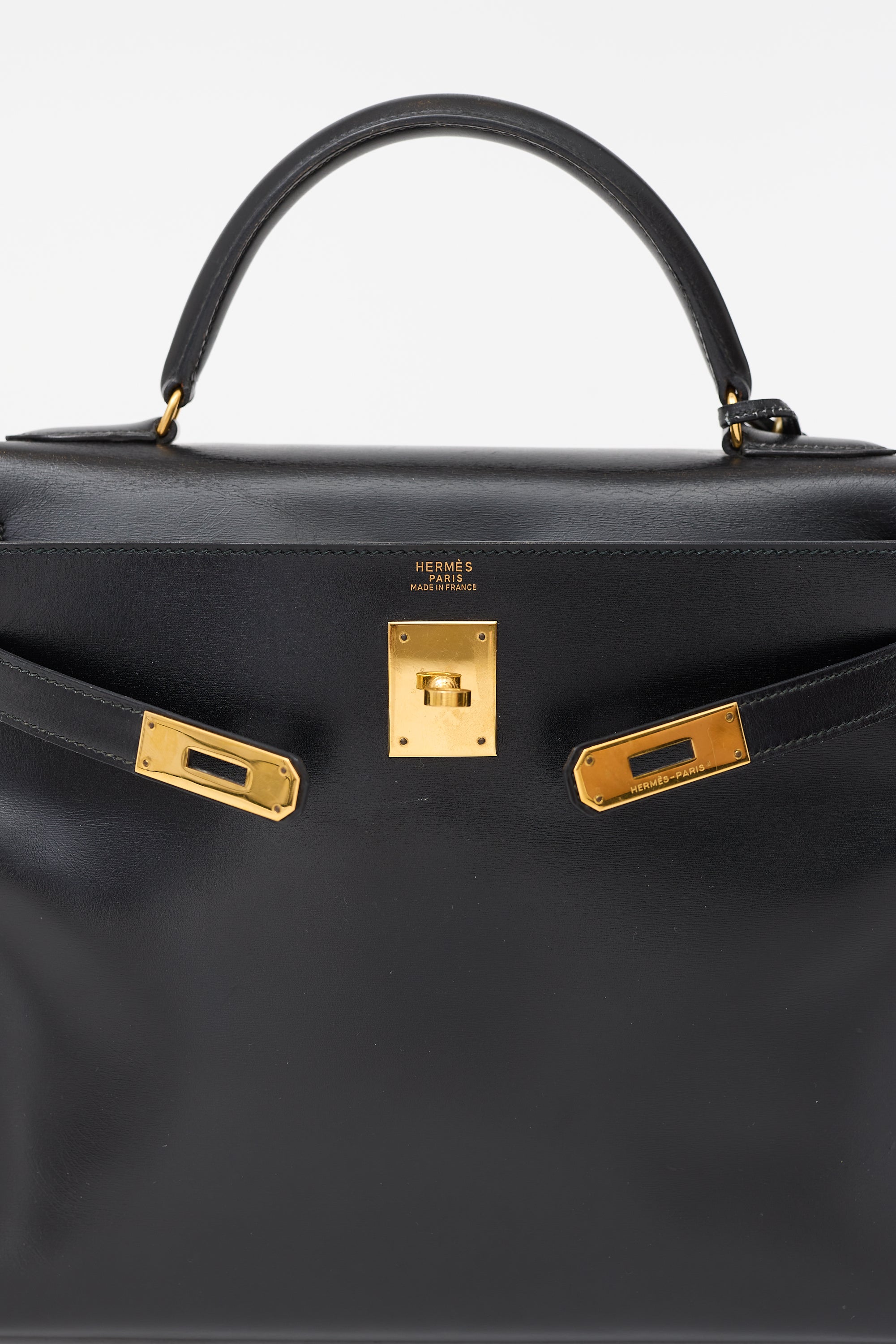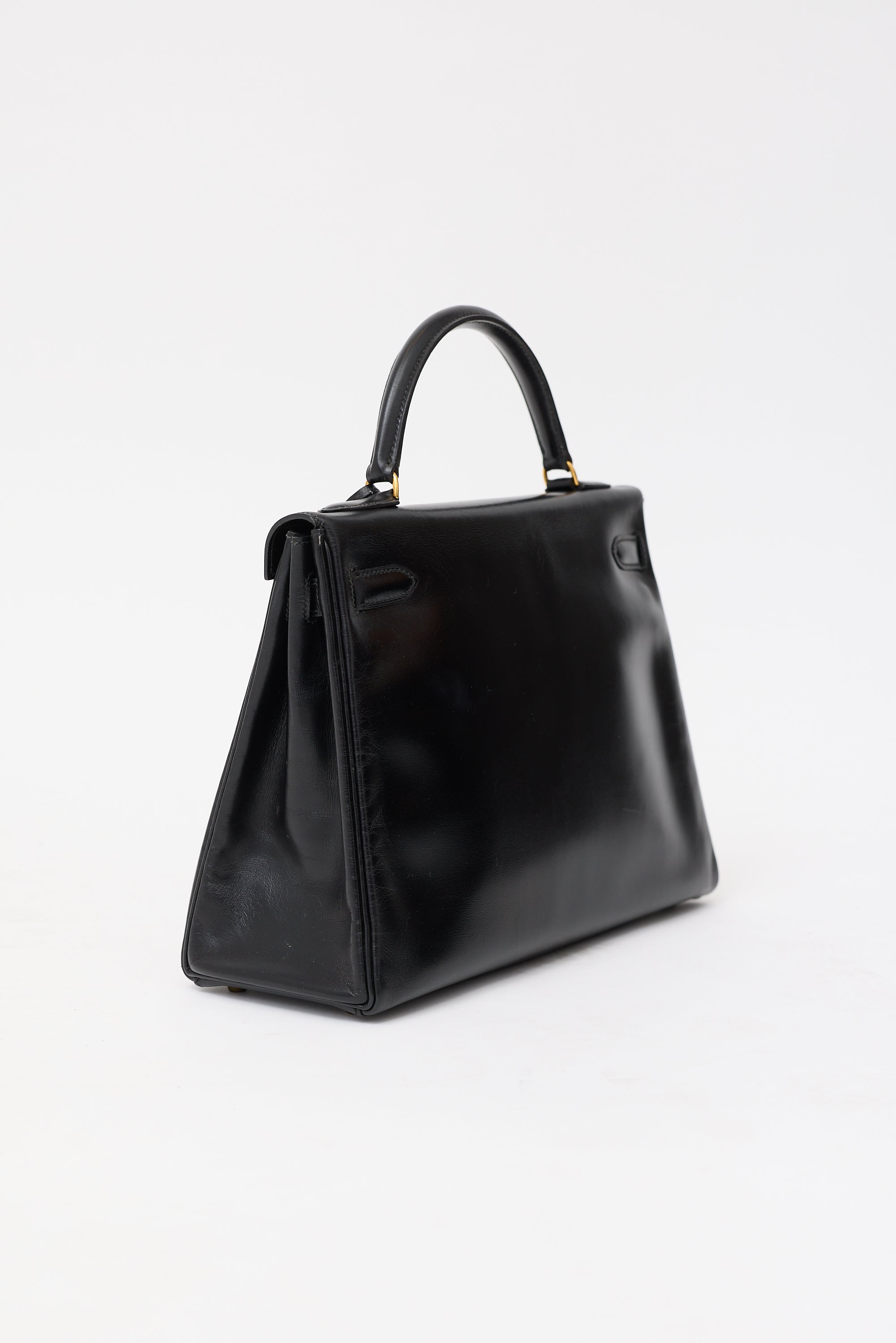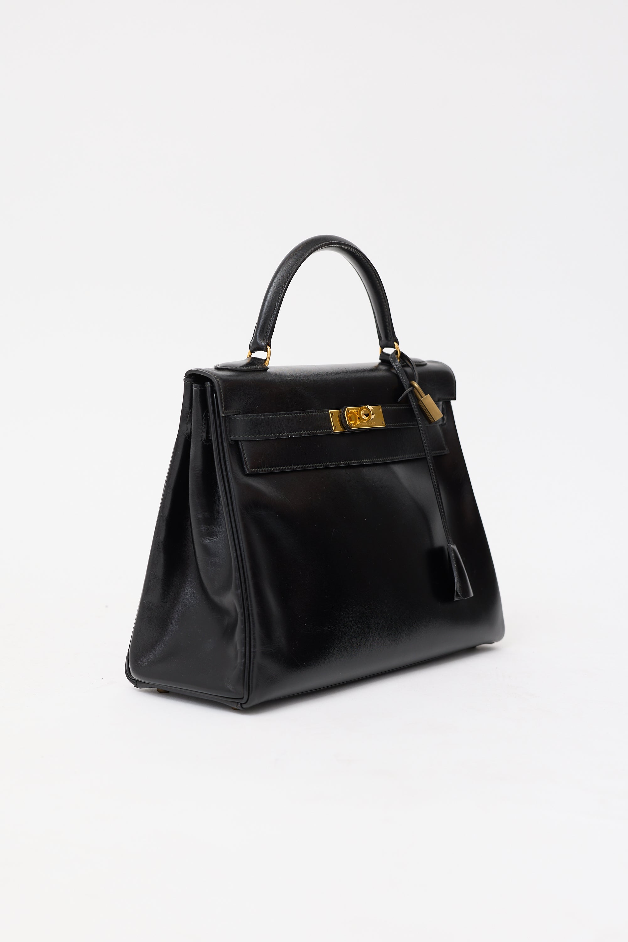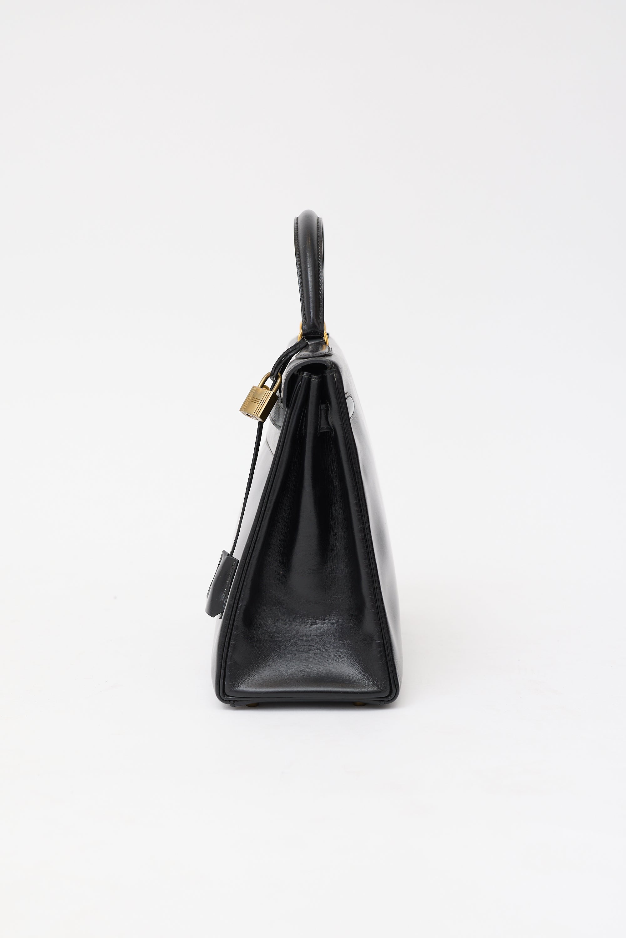 Pre-owned Hermès 1989 Kelly Retourne 32 bag in Noir Box leather featuring single rolled top handle, gold plated hardware, gold stamped logo under flap, side belt detail, signature twist lock closure, logo engraved plaque, four clou, detachable key and padlock clochette, and one main compartment with two slip pockets and one zip pocket.
