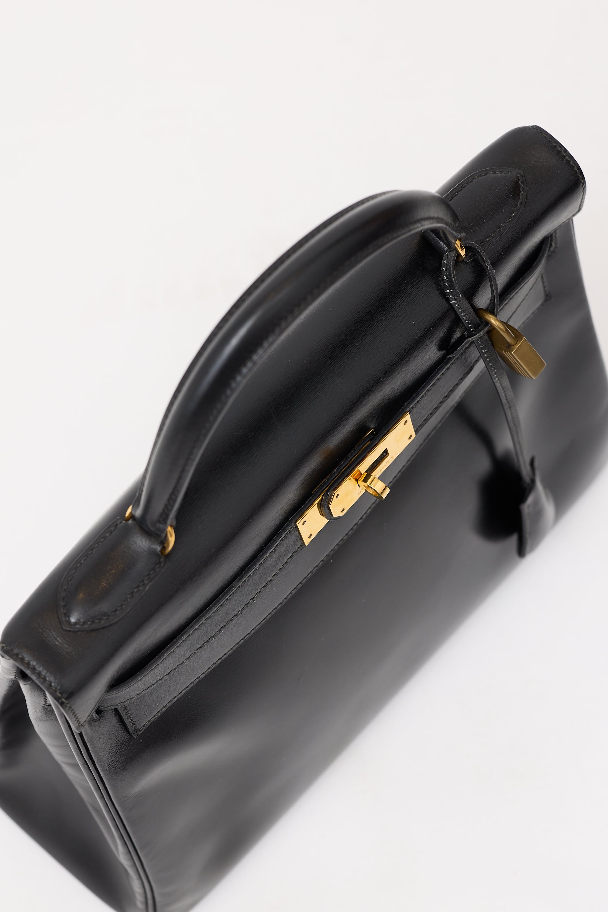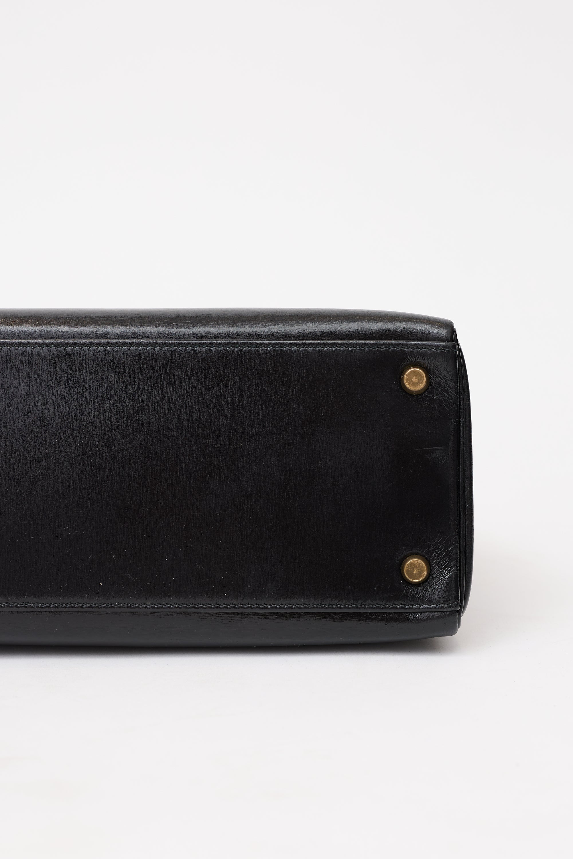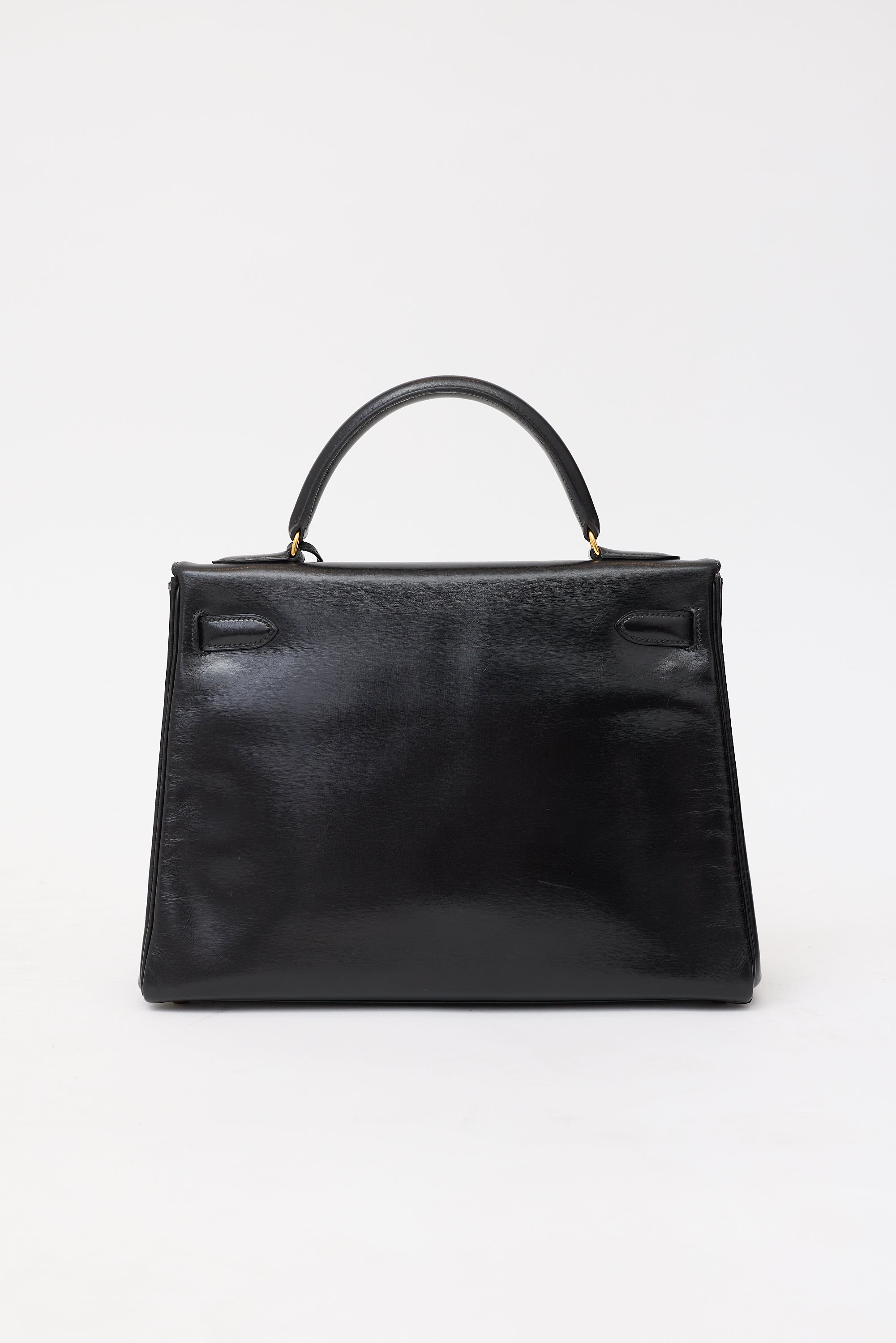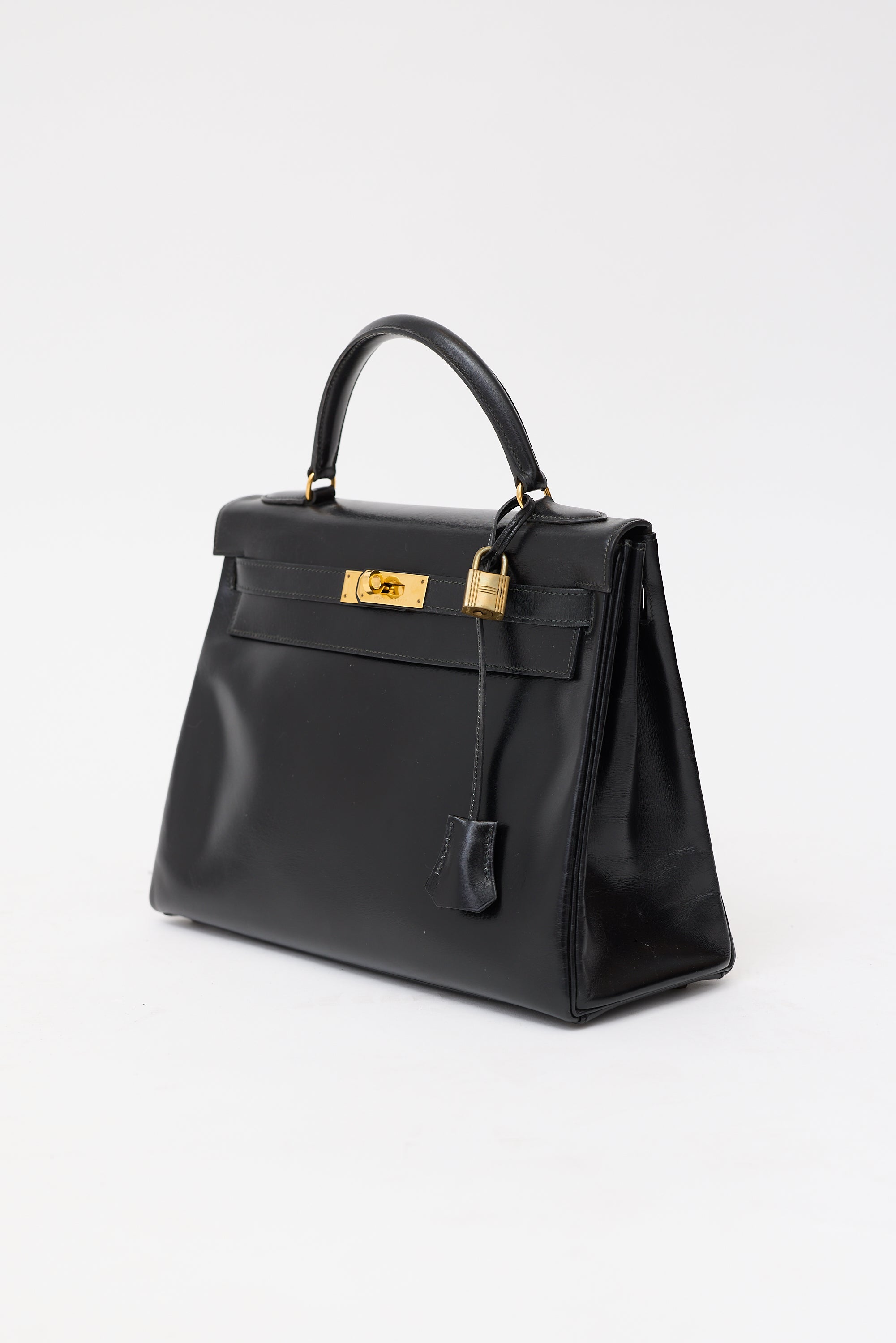 Pre-owned Hermès 1989 Kelly Retourne 32 bag in Noir Box leather featuring single rolled top handle, gold plated hardware, gold stamped logo under flap, side belt detail, signature twist lock closure, logo engraved plaque, four clou, detachable key and padlock clochette, and one main compartment with two slip pockets and one zip pocket.