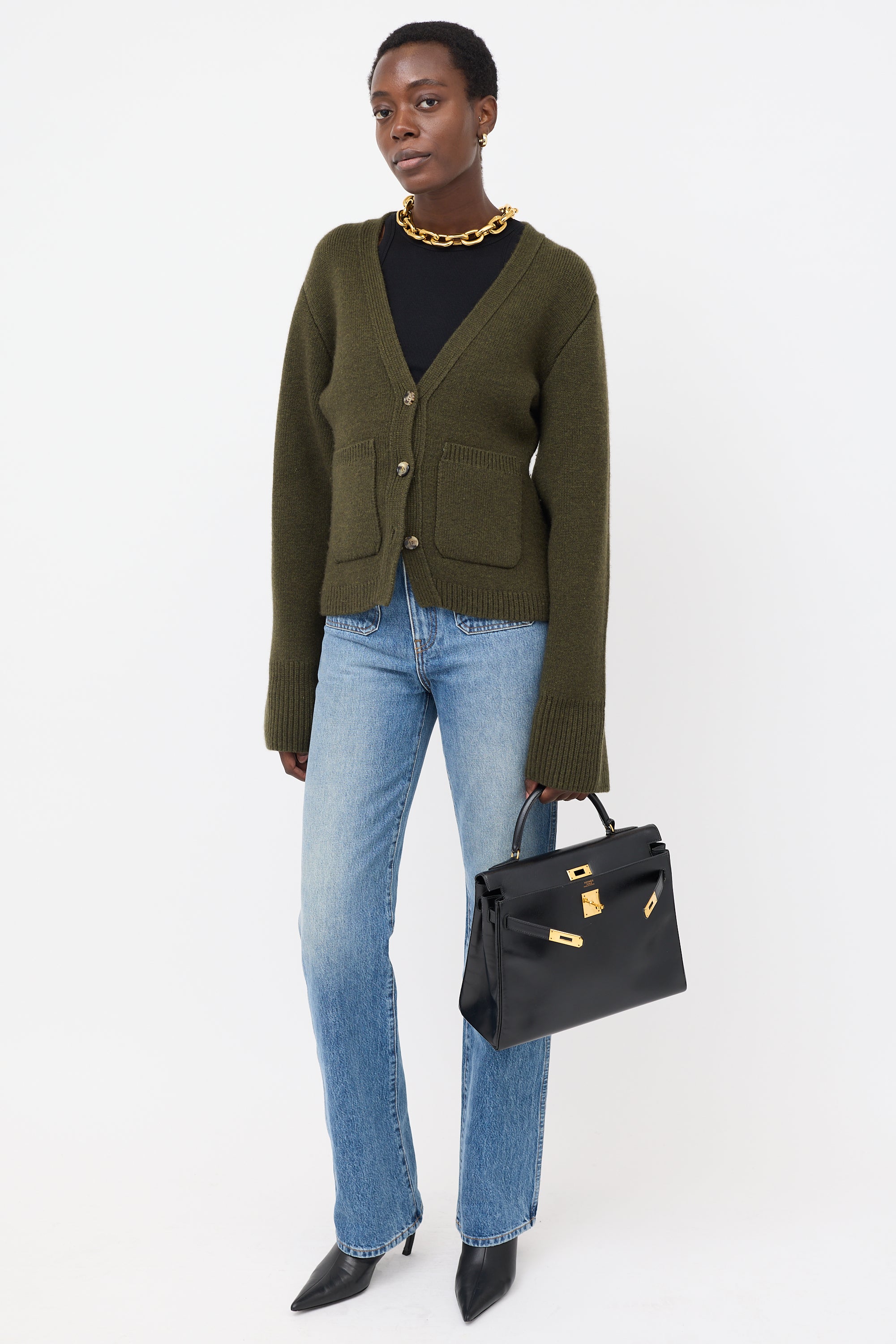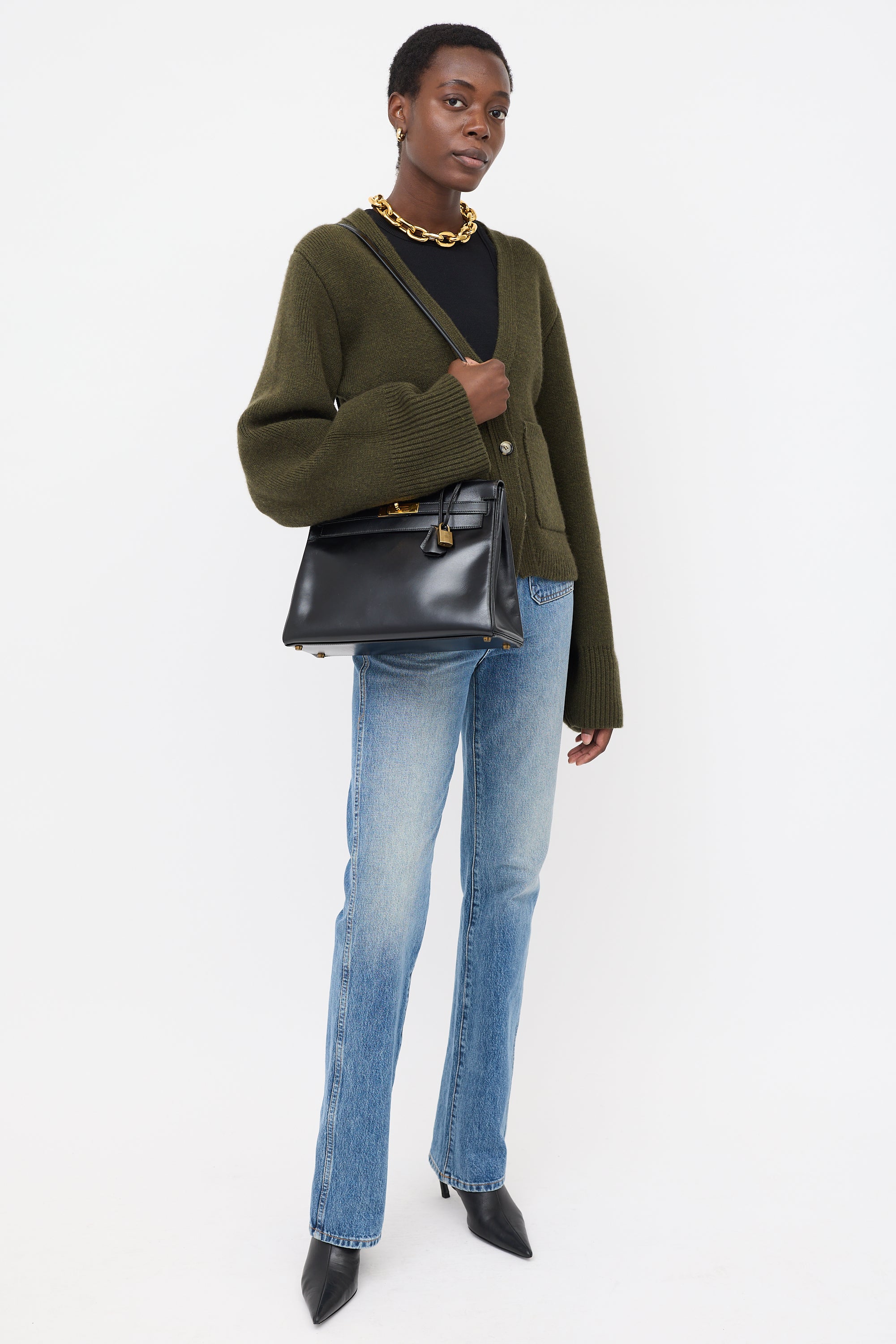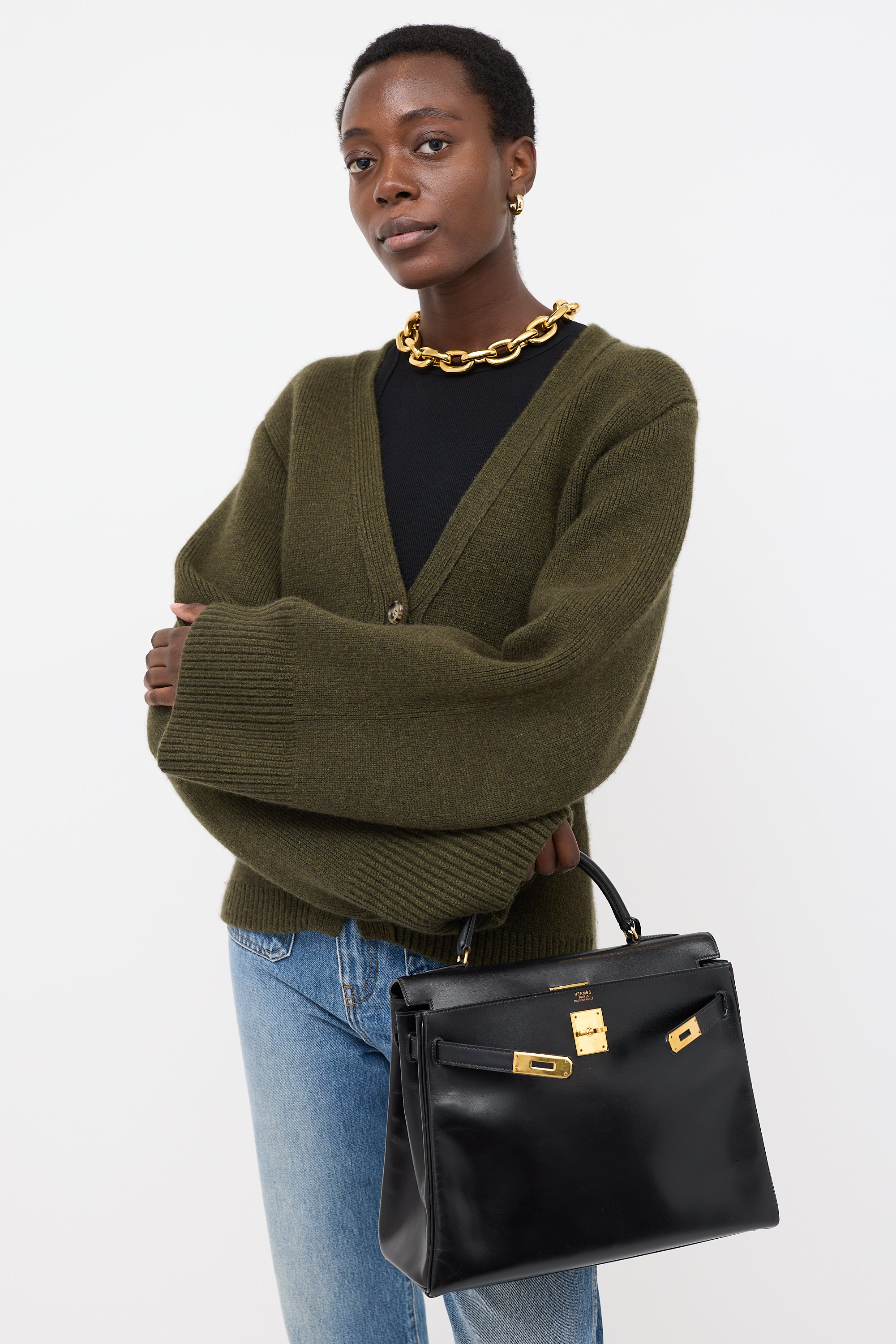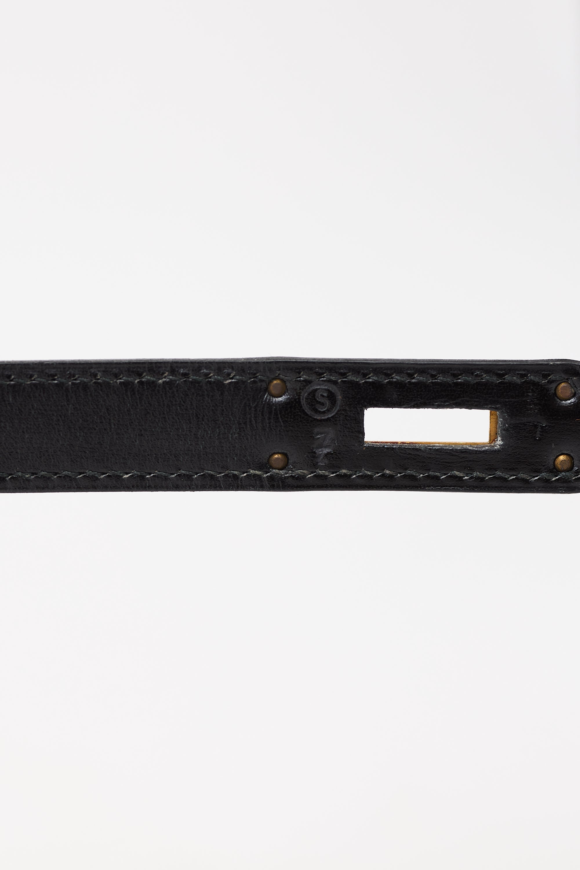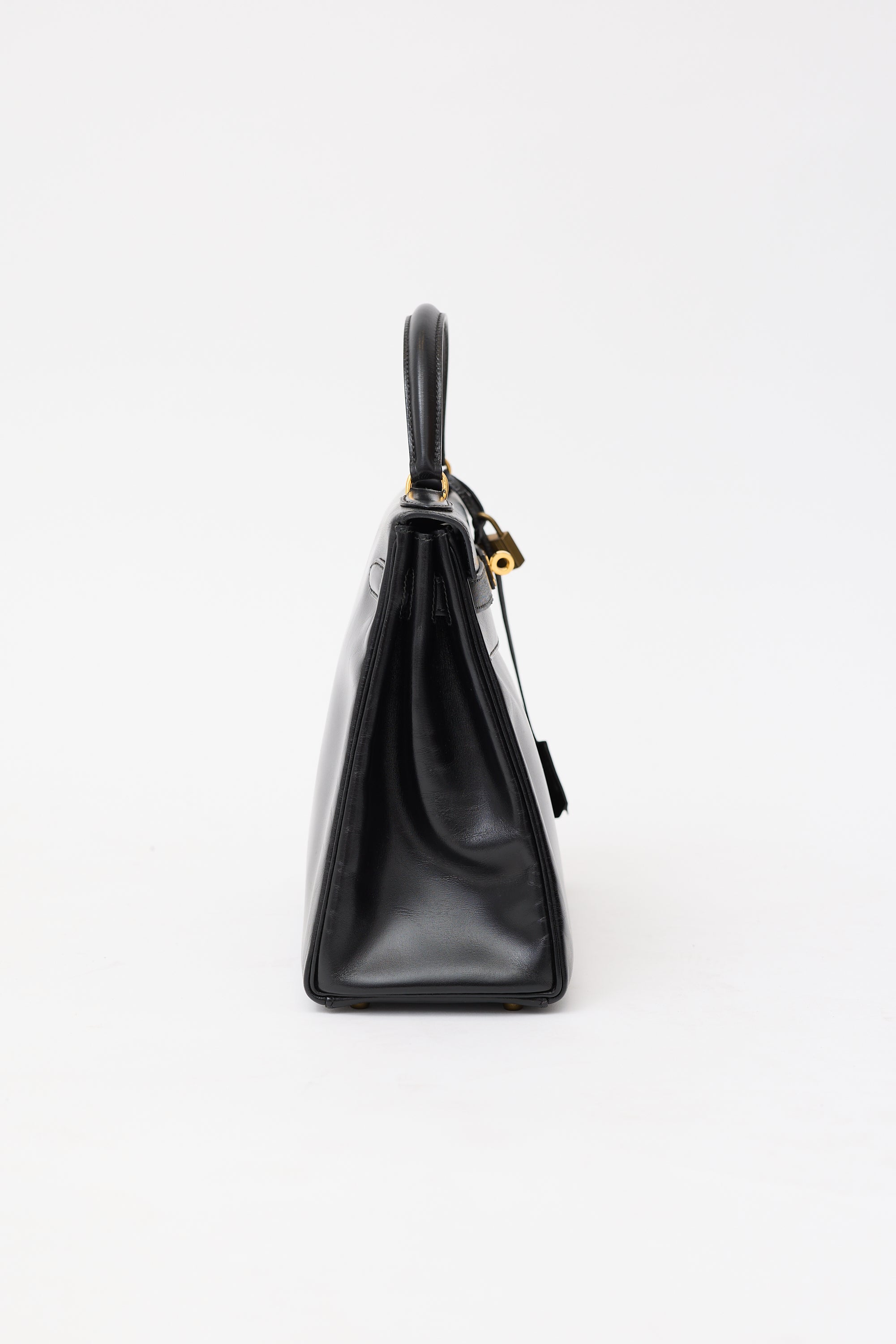 Pre-owned Hermès 1989 Kelly Retourne 32 bag in Noir Box leather featuring single rolled top handle, gold plated hardware, gold stamped logo under flap, side belt detail, signature twist lock closure, logo engraved plaque, four clou, detachable key and padlock clochette, and one main compartment with two slip pockets and one zip pocket.