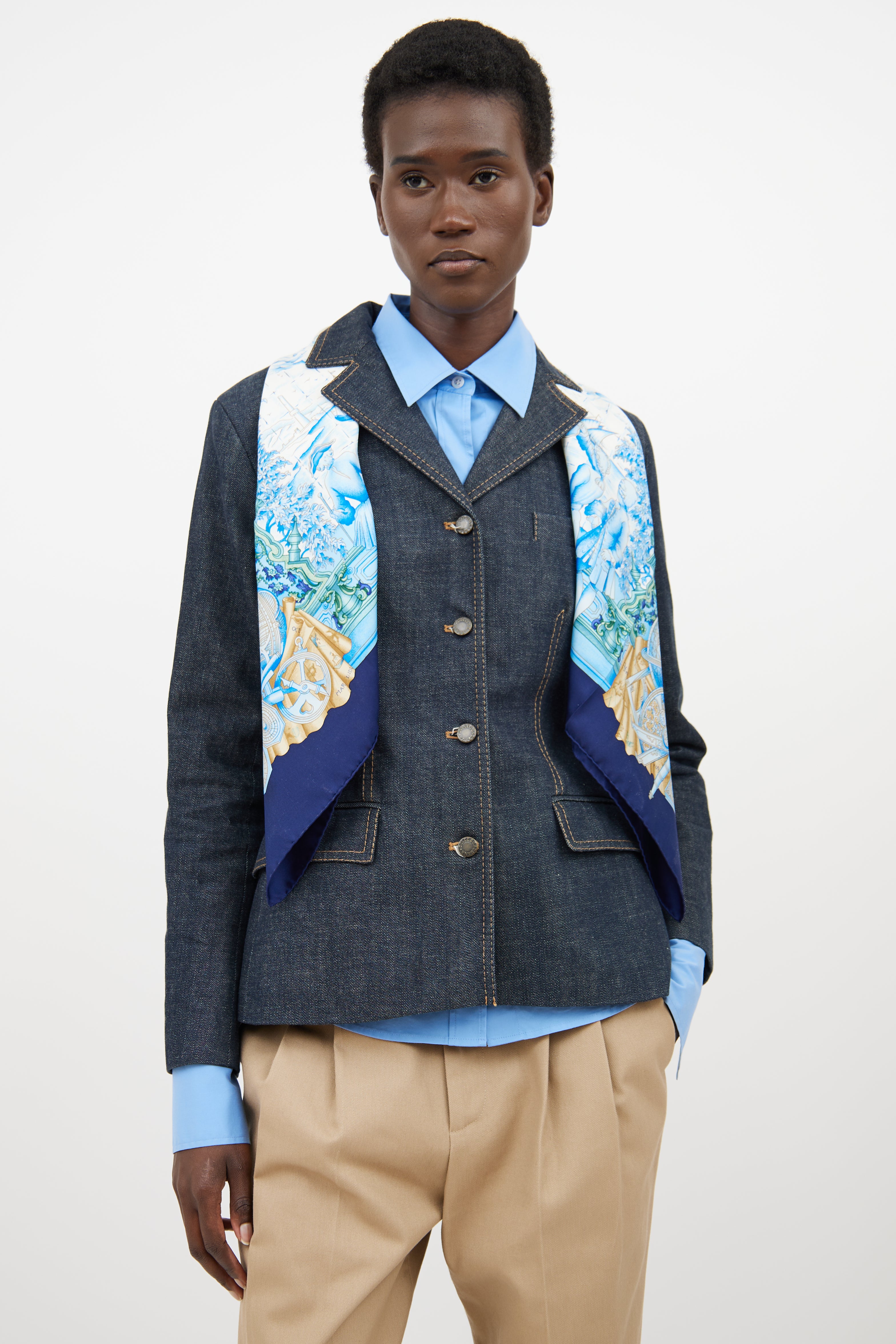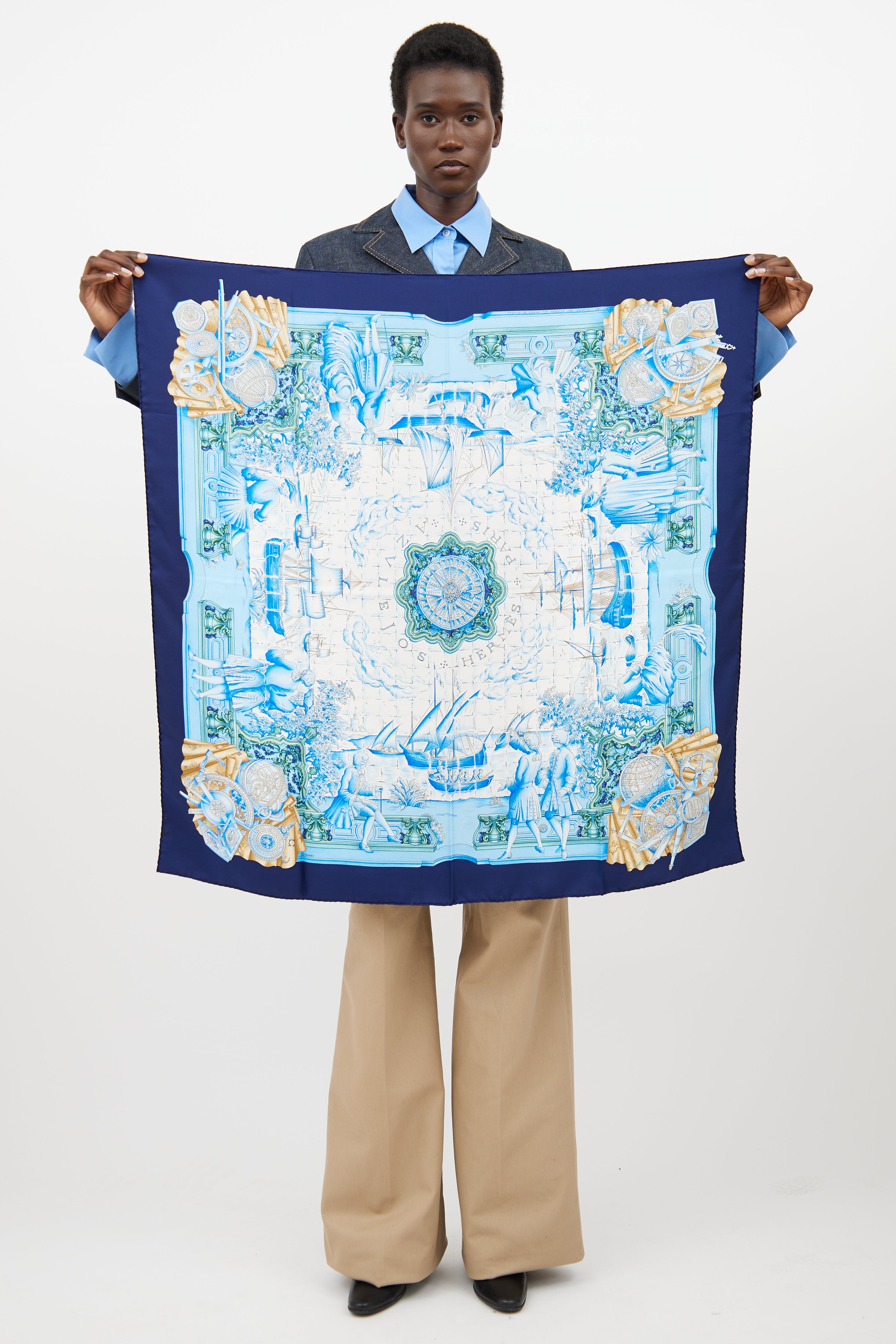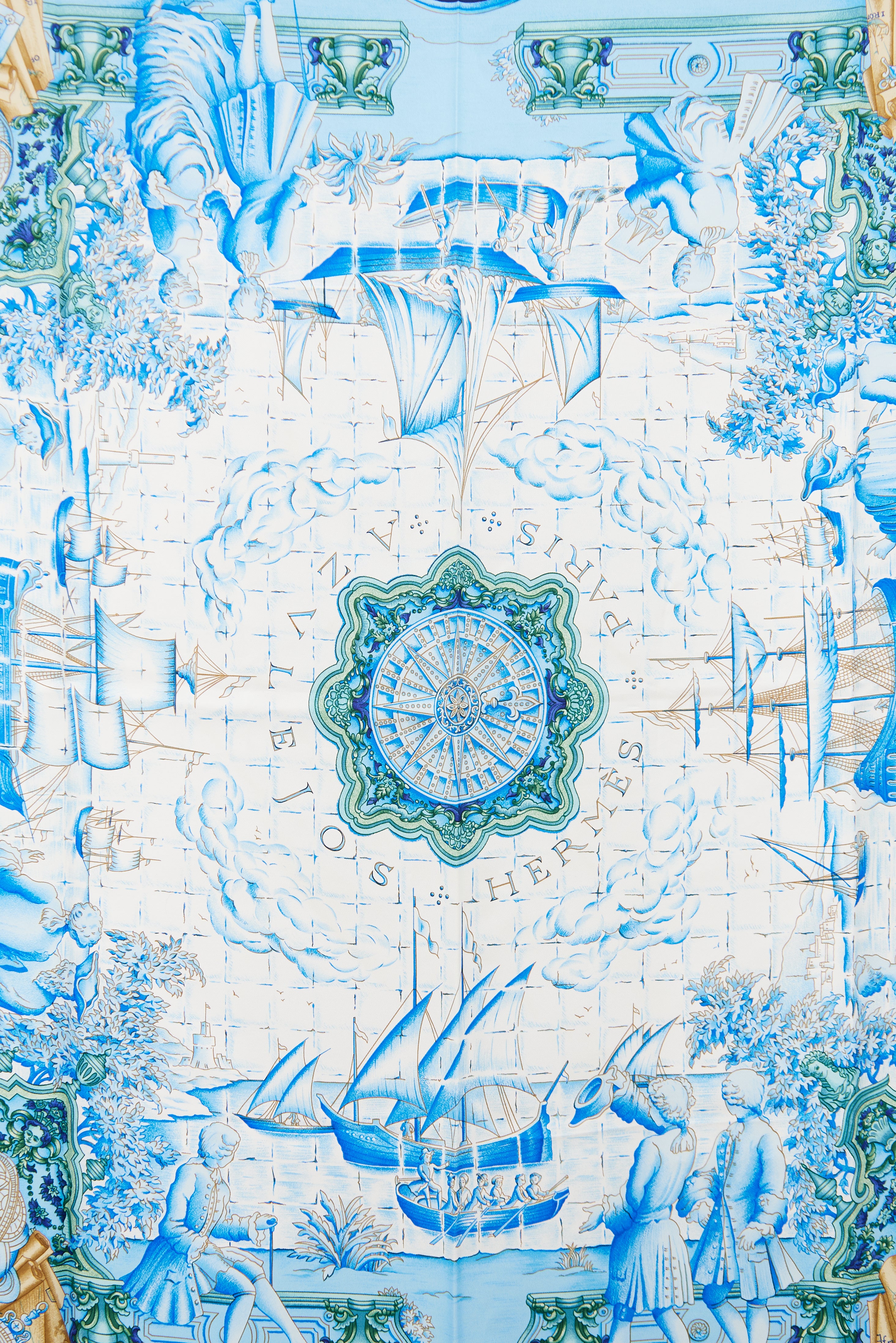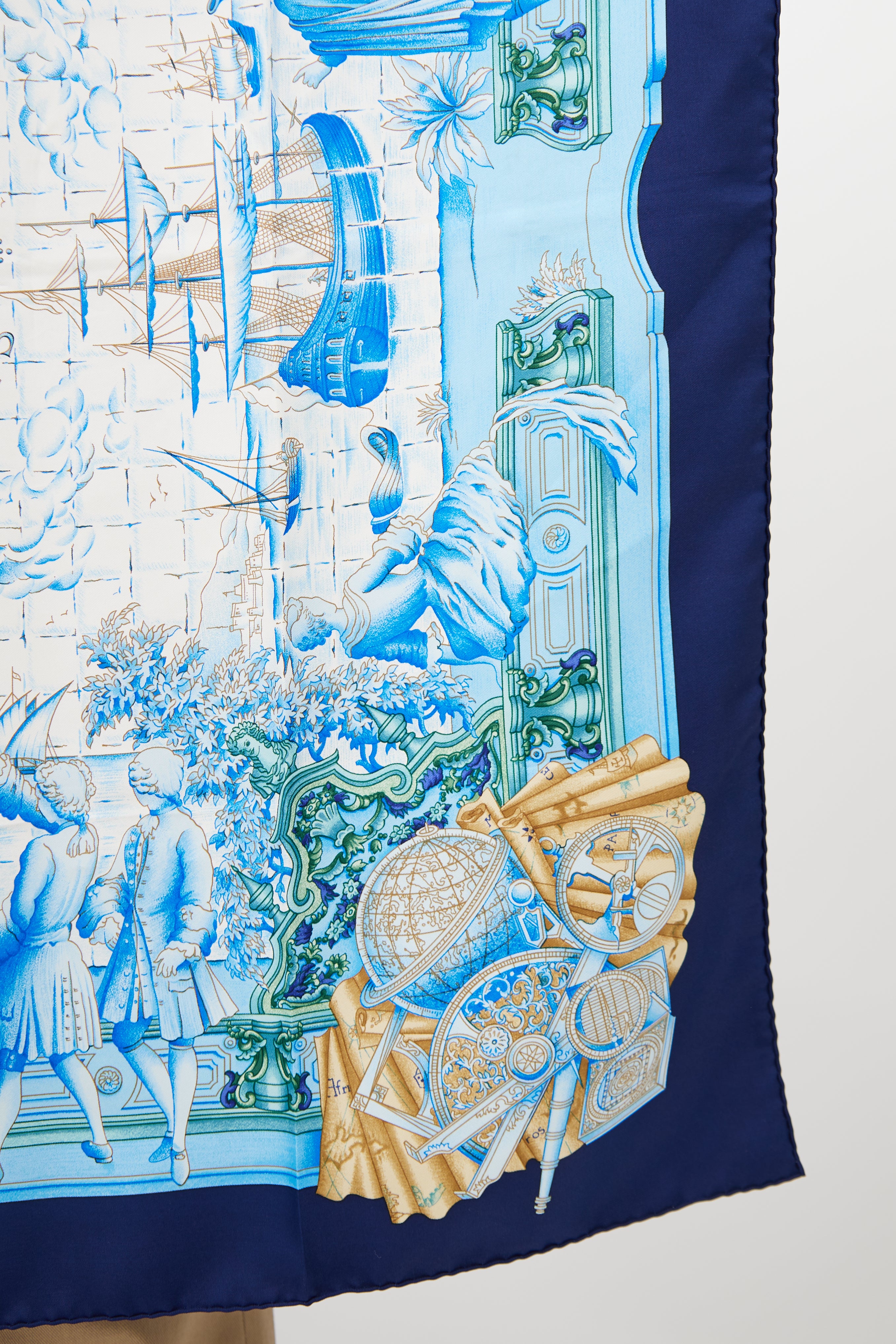 Pre-owned Hermès 1992 navy and multicolour silk scarf featuring Azulejos design by Catherine Baschet, logo print at corner, and hand rolled edges.