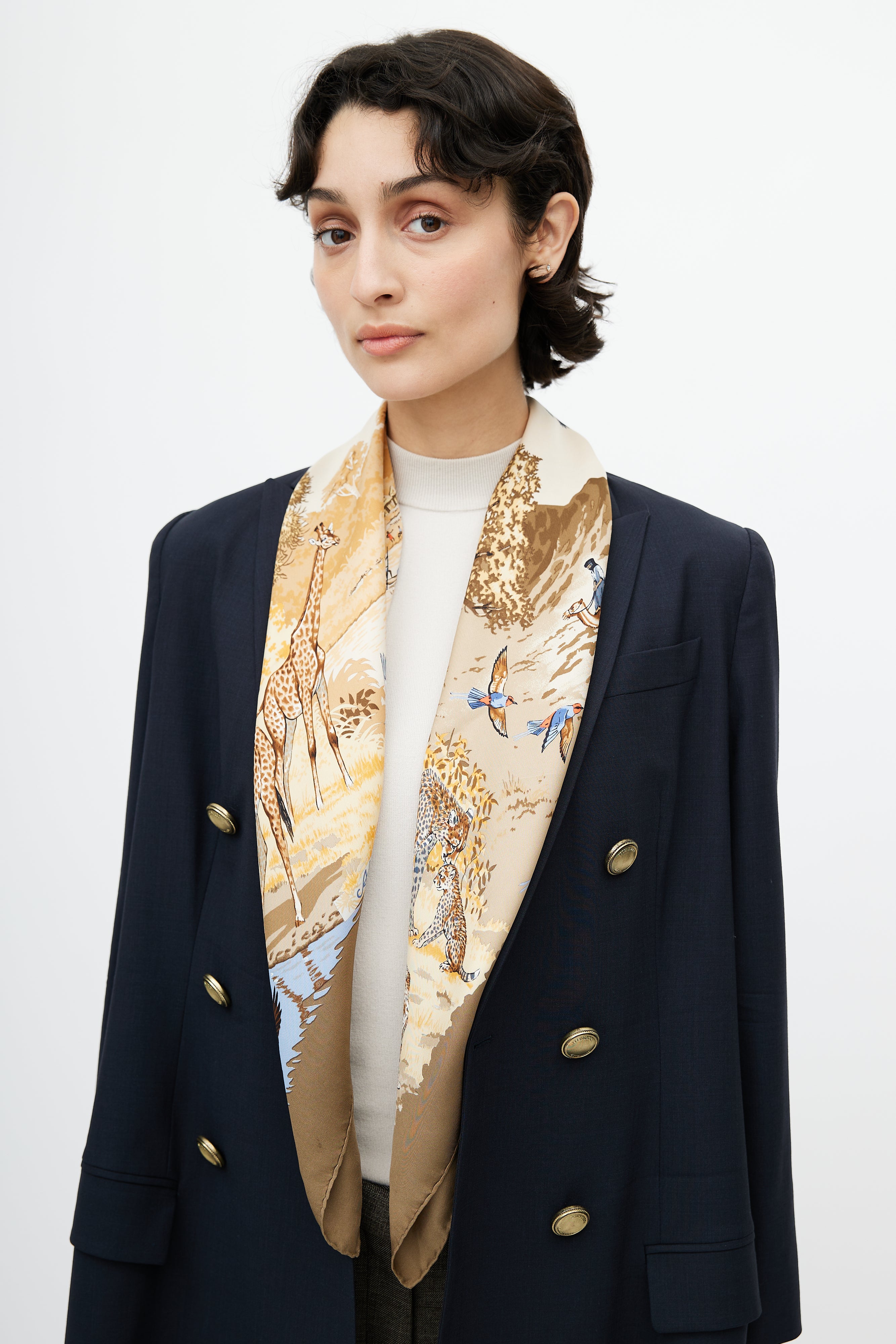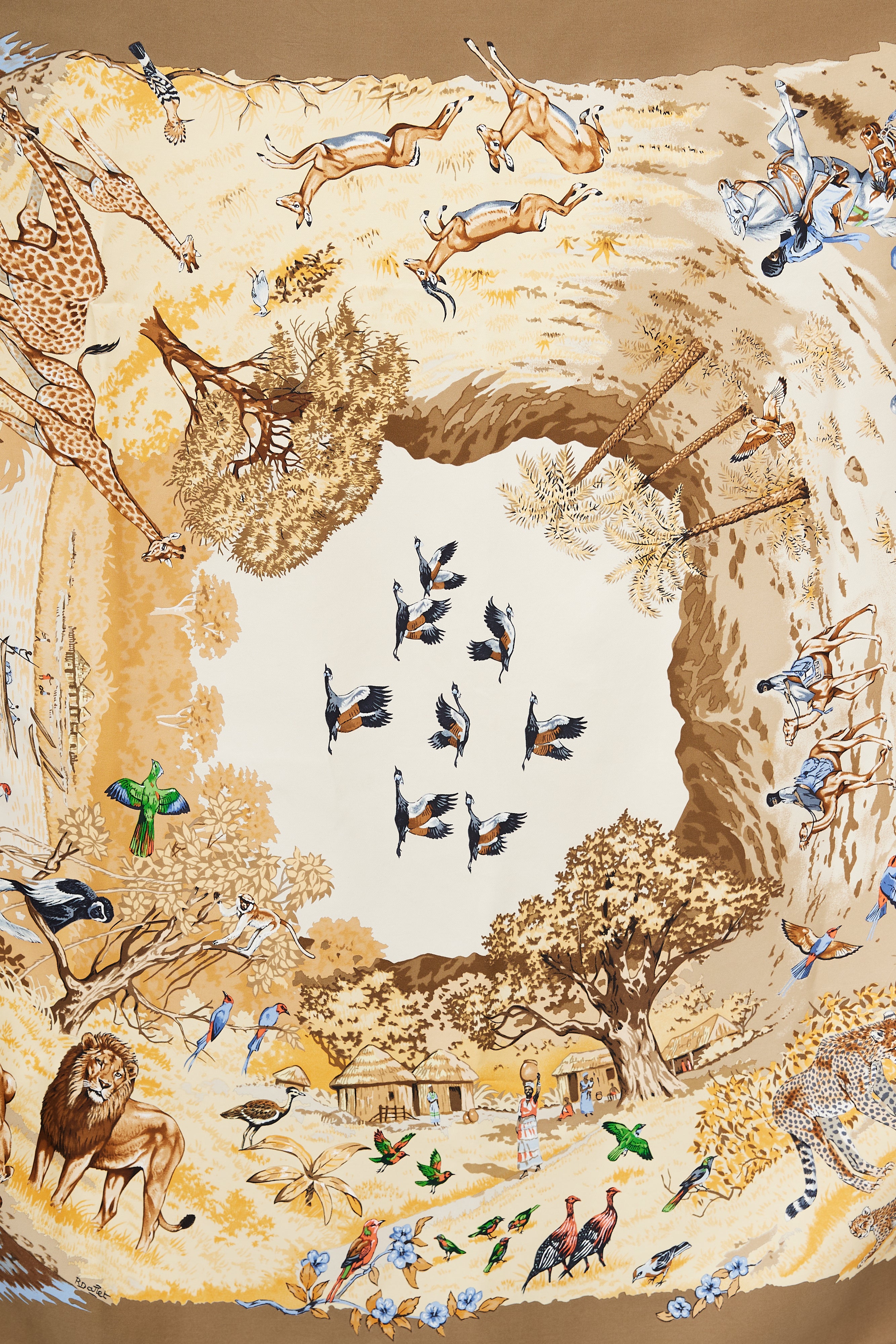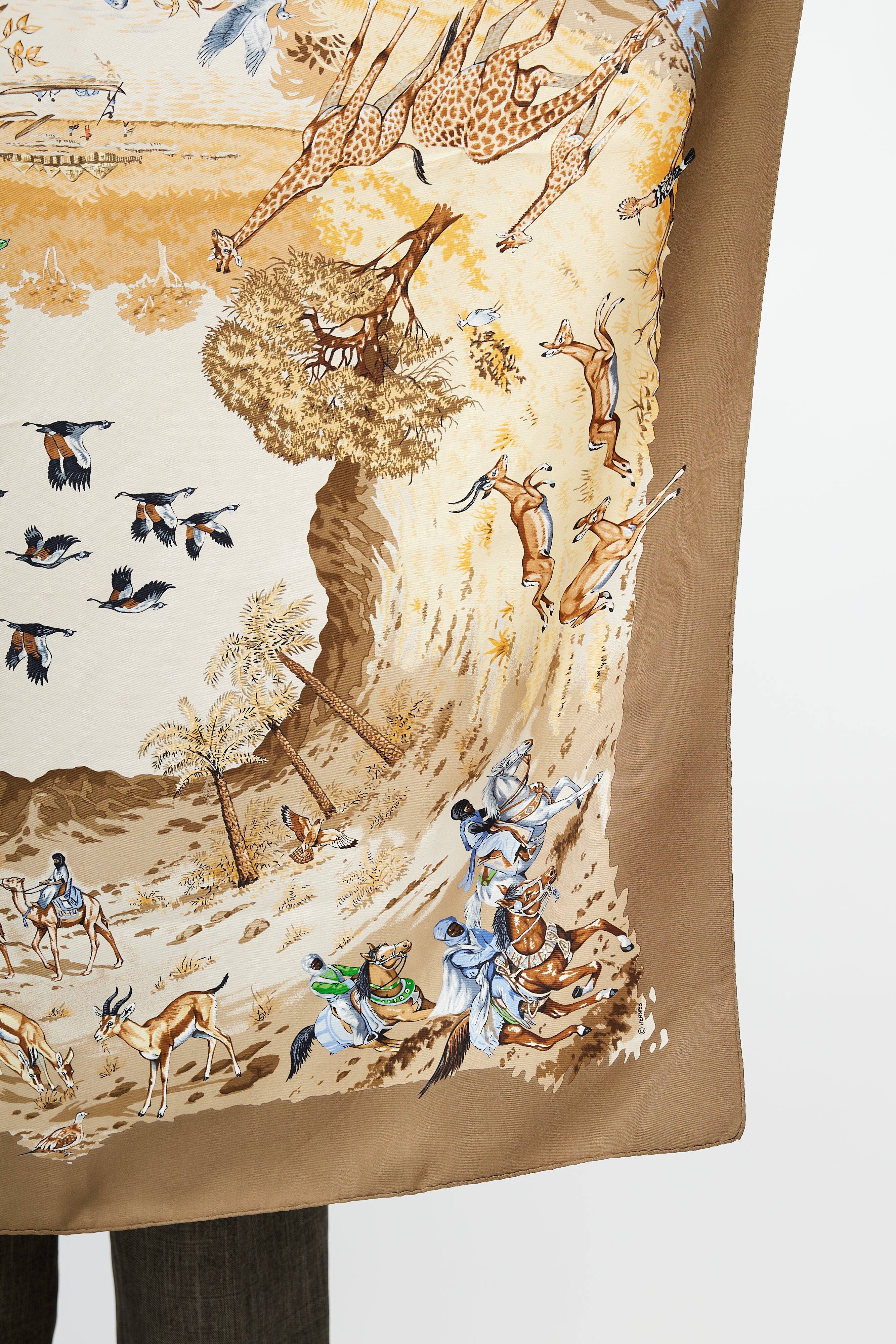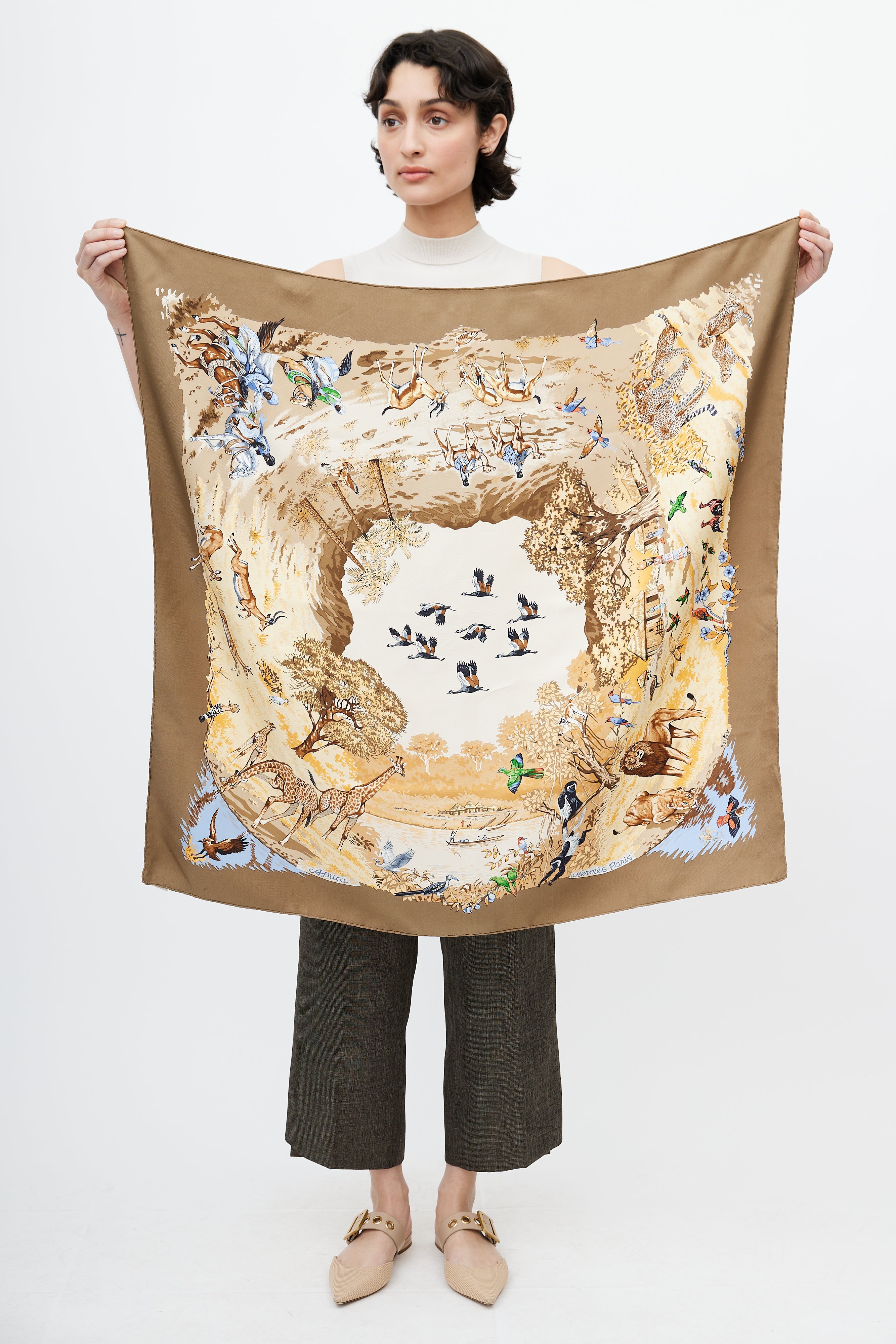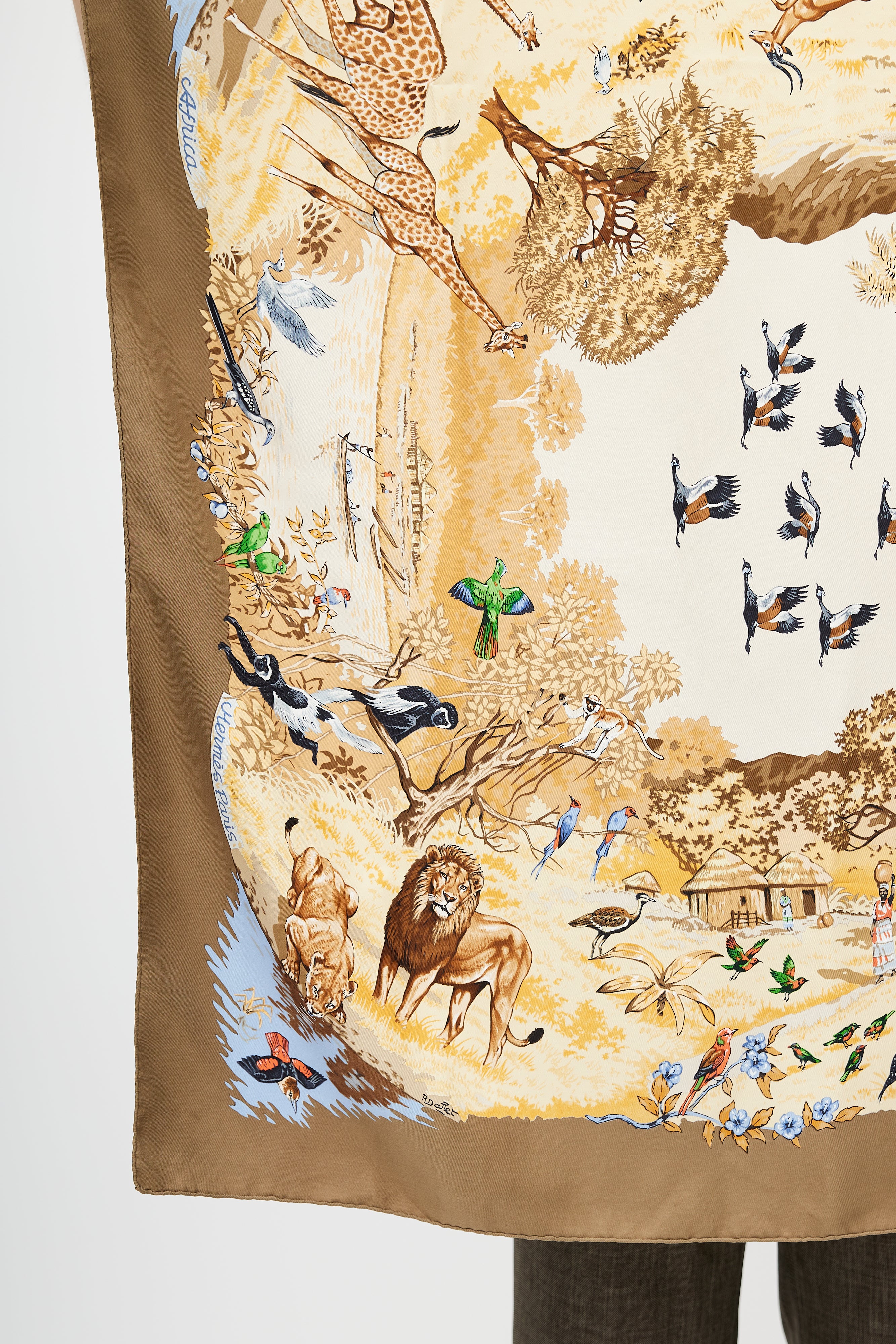 Pre-owned 1997 Hermès brown scarf featuring Africa print by Robert Dallet, multicolour animal motif, and brown hand rolled trim edges. Comes with original box.