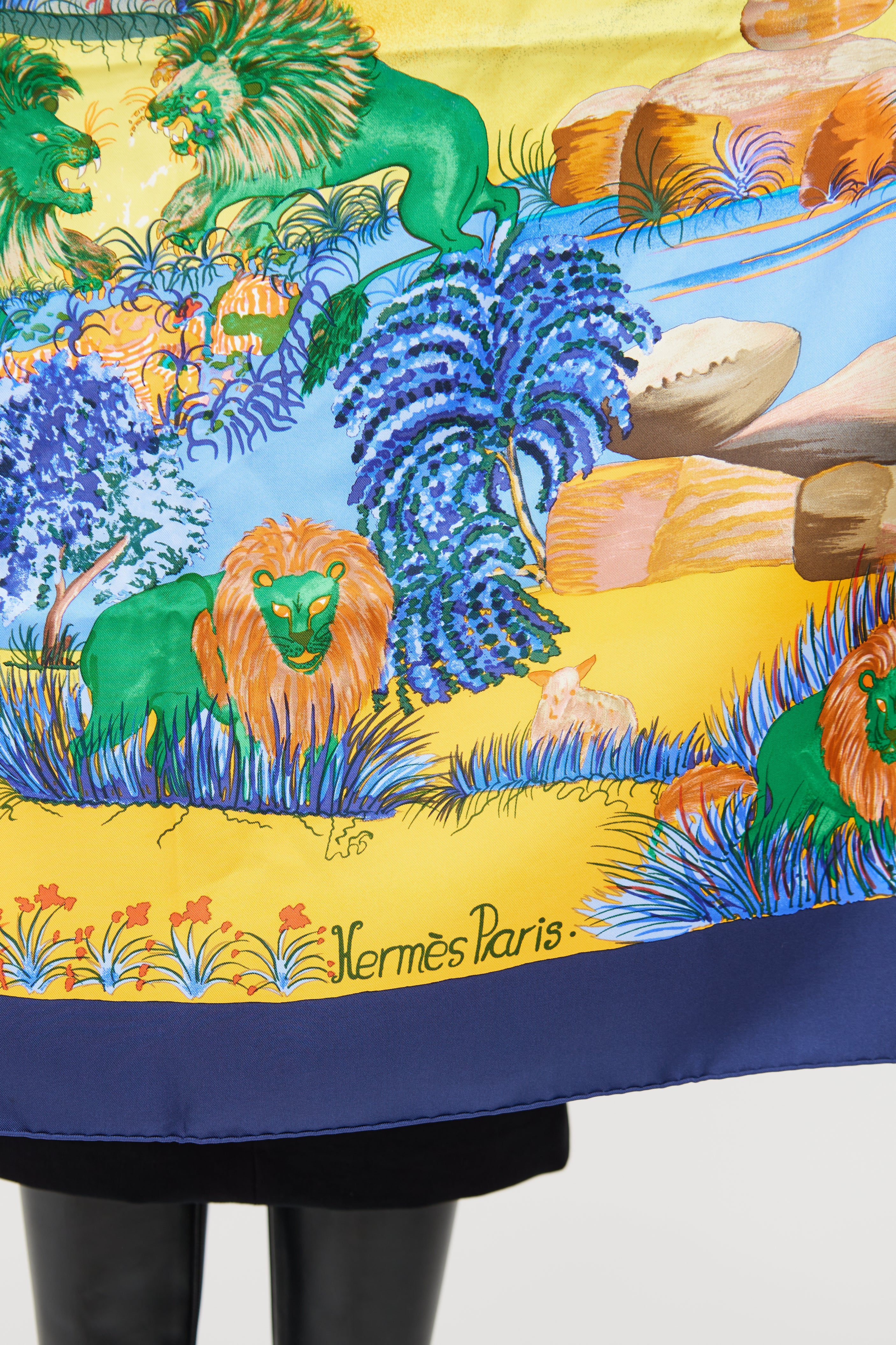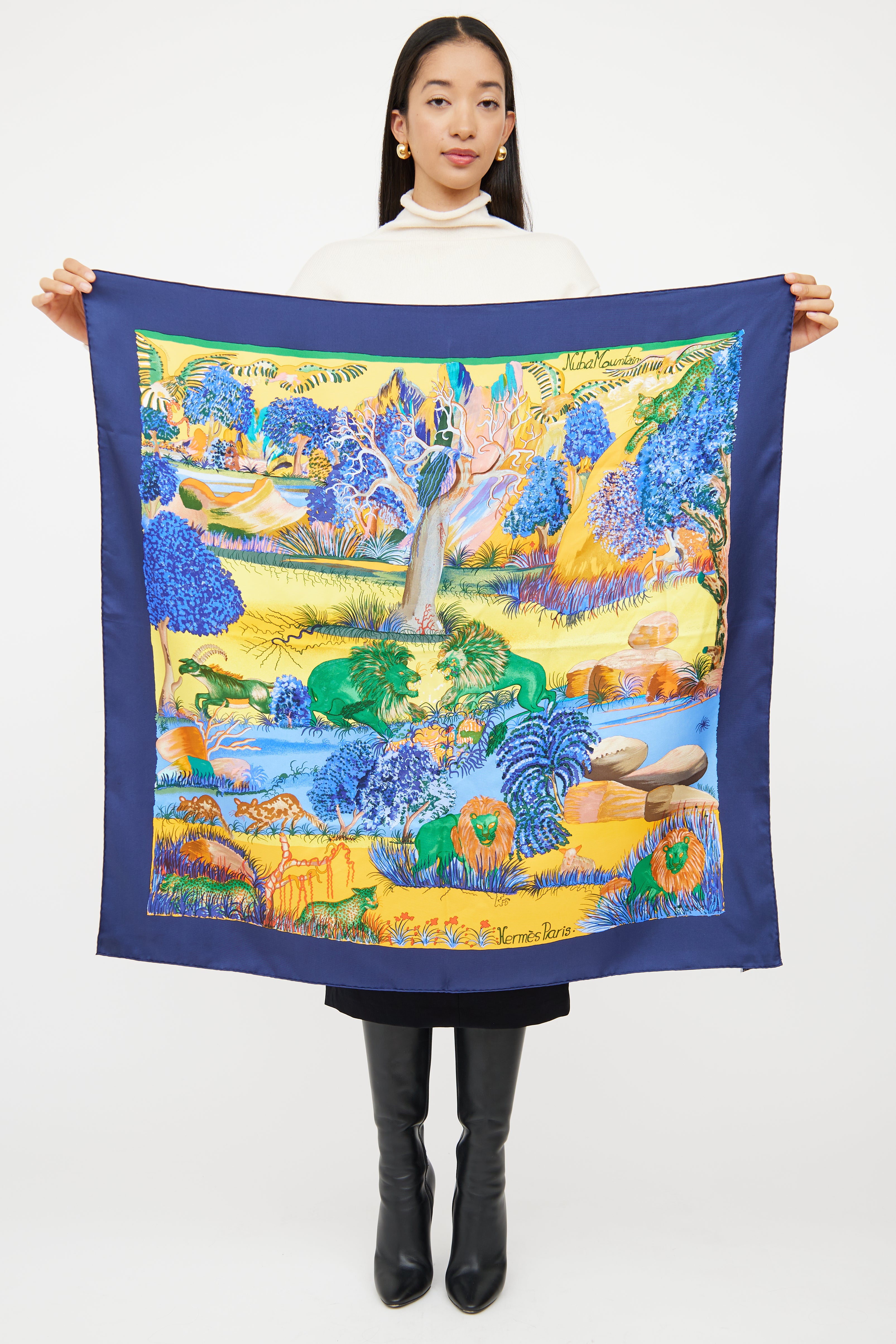 Pre-owned Hermès navy and multicolour silk scarf featuring Nuba Mountains illustration by Ibrahim Alami Kwumi Sefedin depicting landscape and animals of the Nuba mountains, logo at bottom and hand rolled edges.